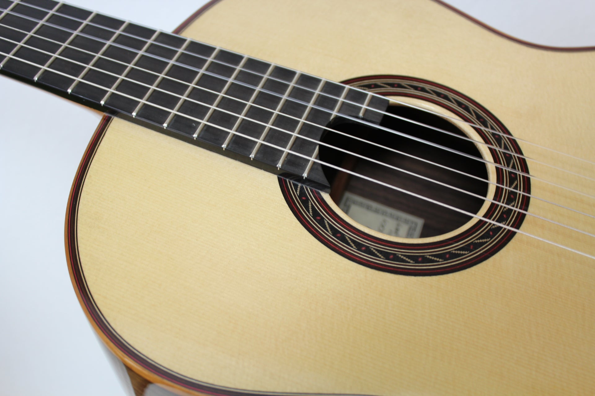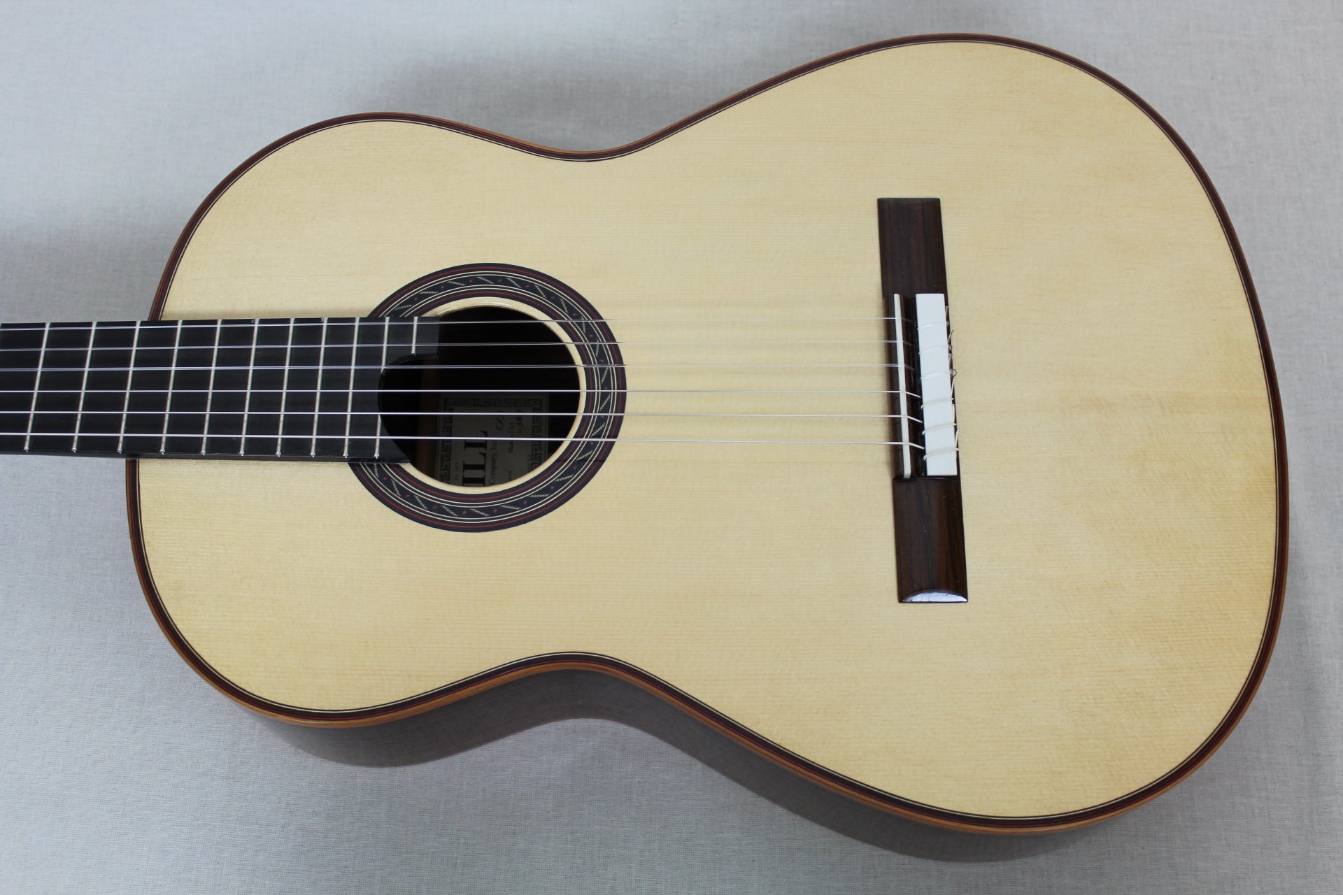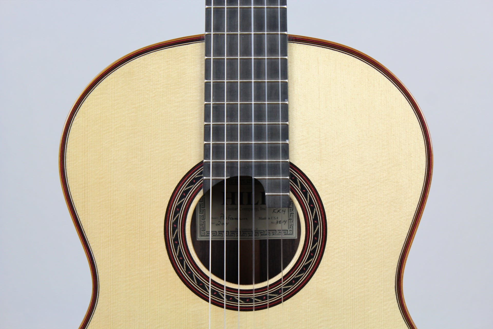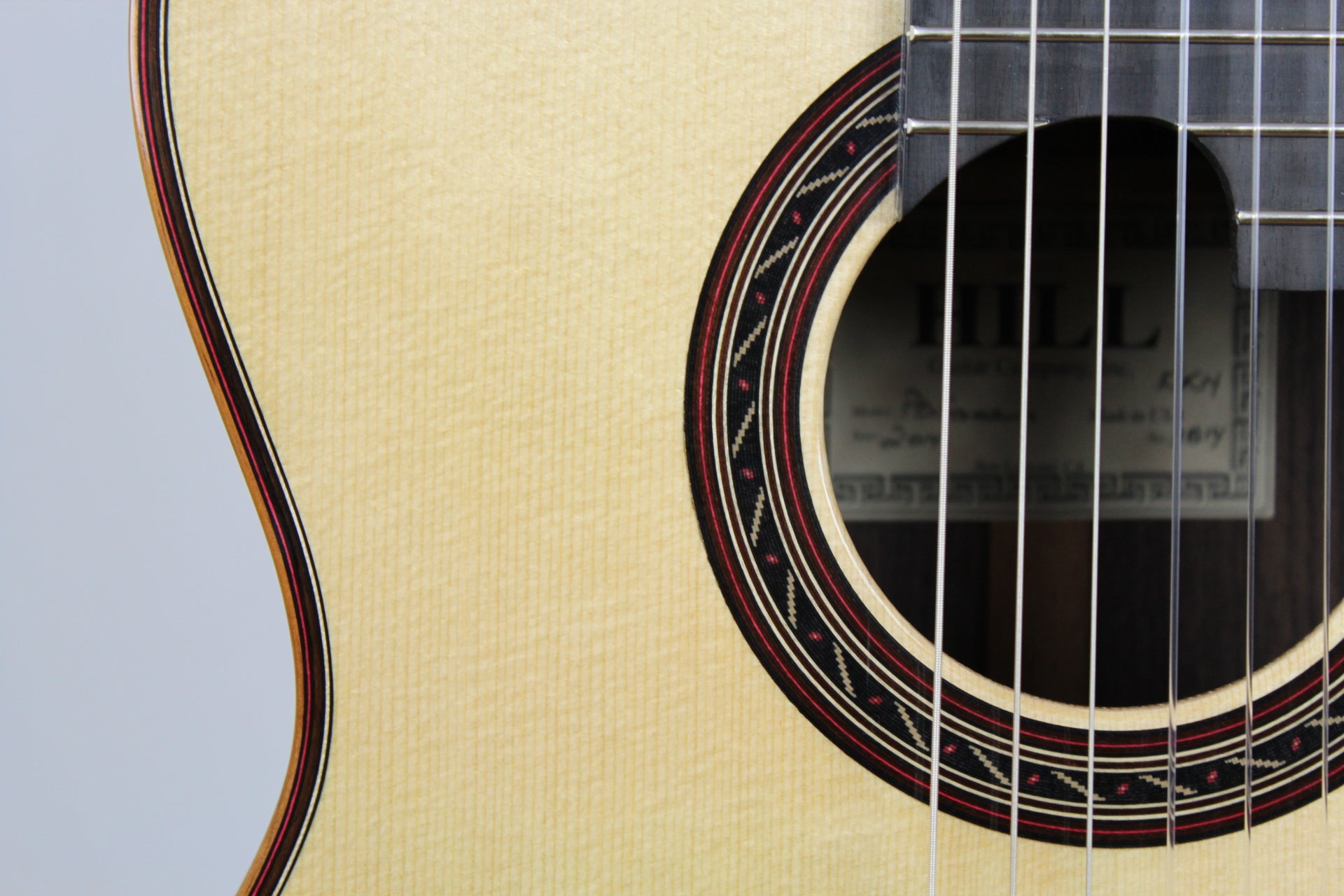As President of Hill Guitar Company, Inc., Kenny continues to develop the Hill Guitar line in Santa Cruz building fine classical guitars for the world market. This is the location where luthiers are making the entire range of Signature, and Performance model guitars. Kenny Hill has written many articles for various guitar publications, including Acoustic Guitar, Soundboard, and American Lutherie. This guitar is designed for the player desiring a nylon string instrument with easy left hand reach. It has a double top made of two very thin layers of spruce, Nomex and cedar. In this case the spruce is facing out and gives the sound its dominant character, while the inner layer flavours it.