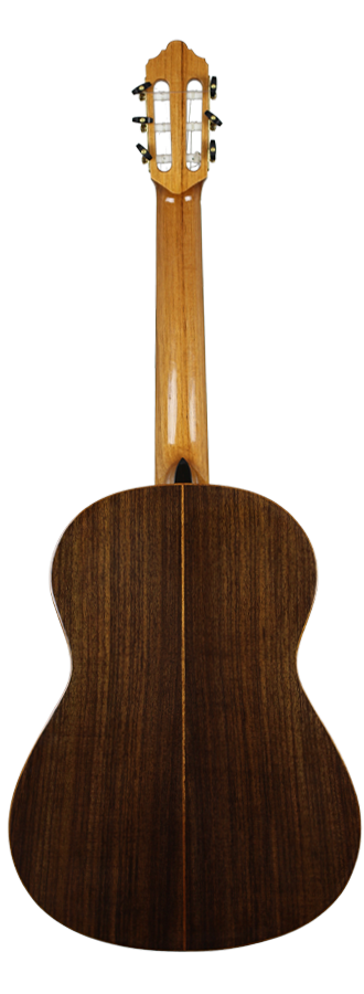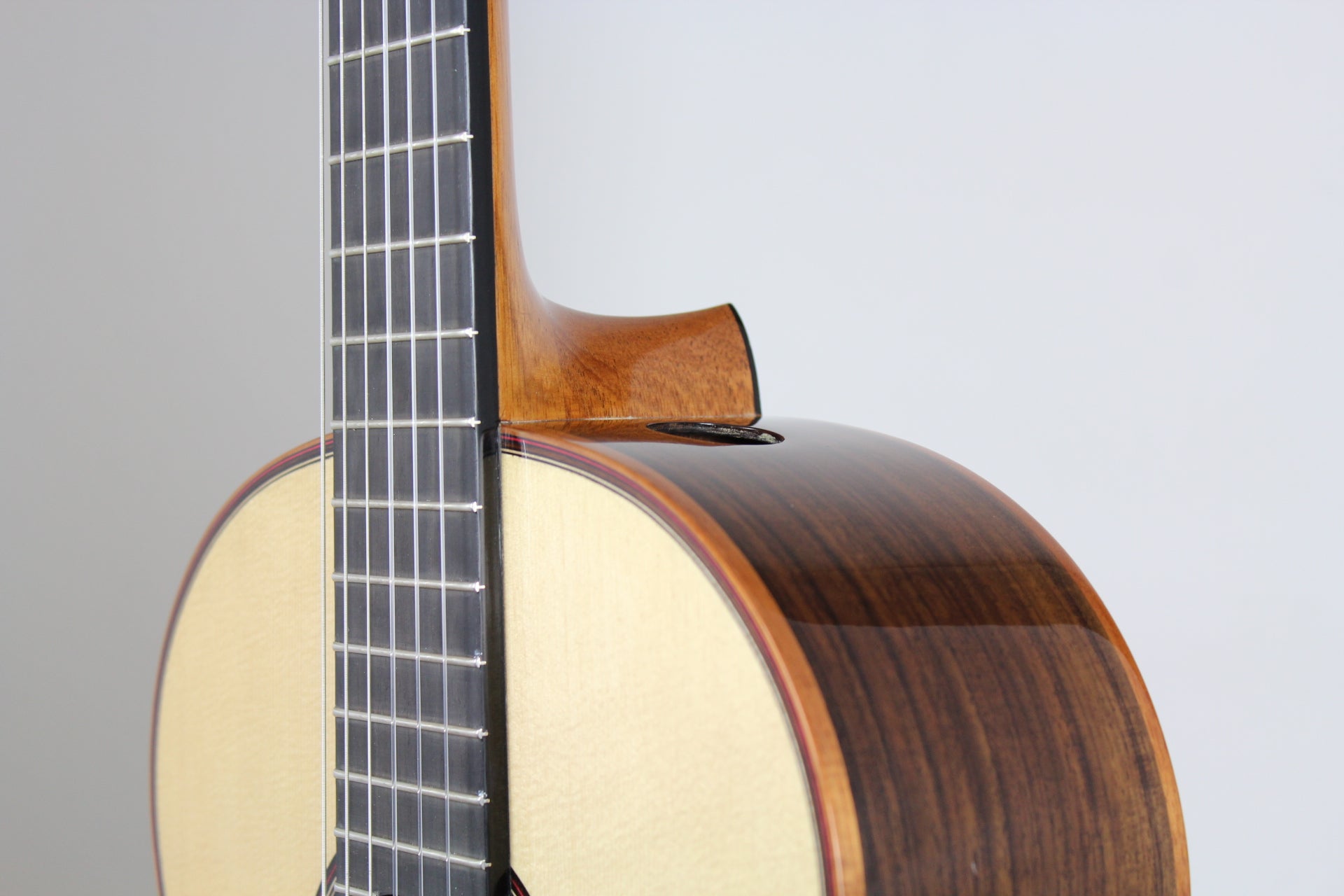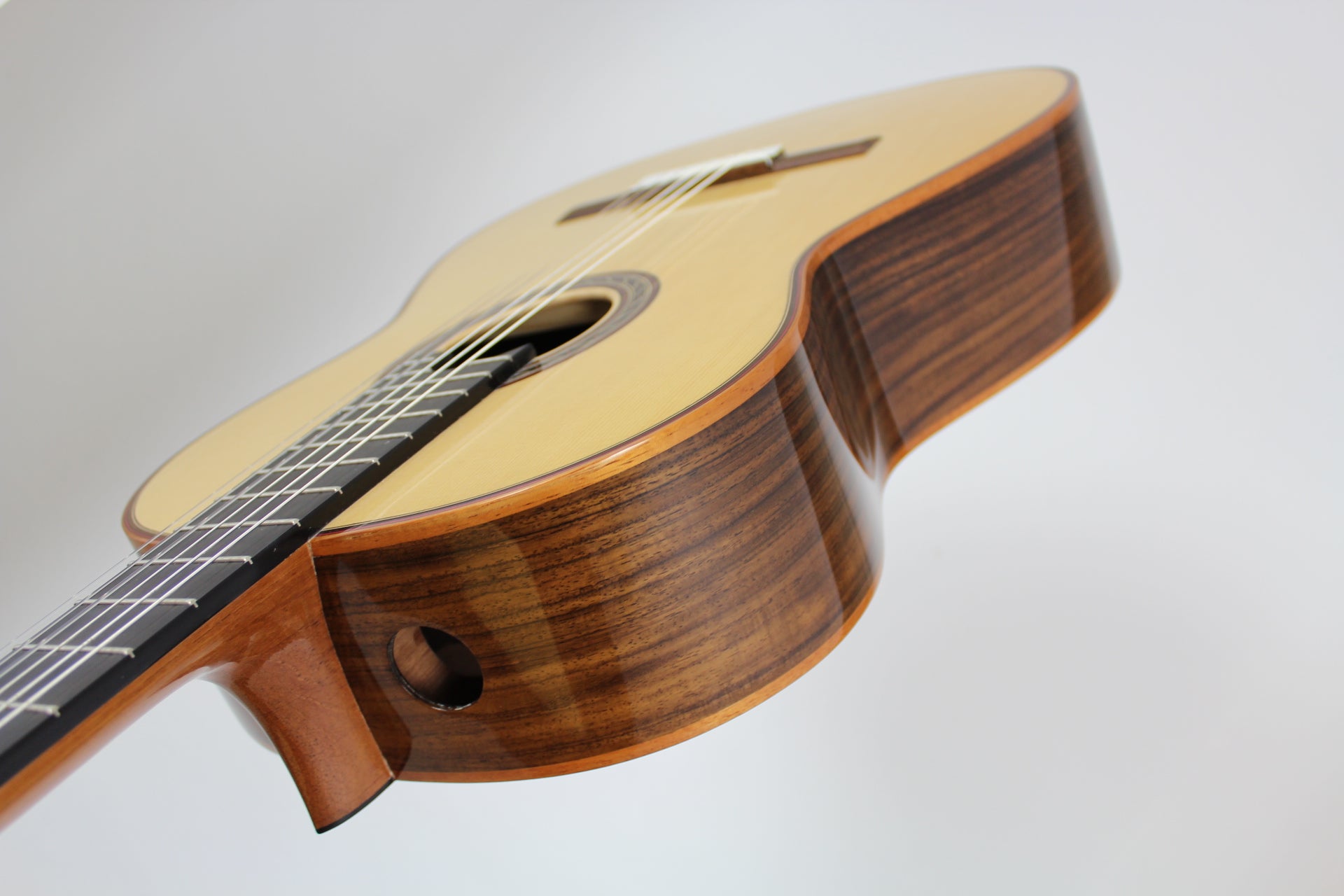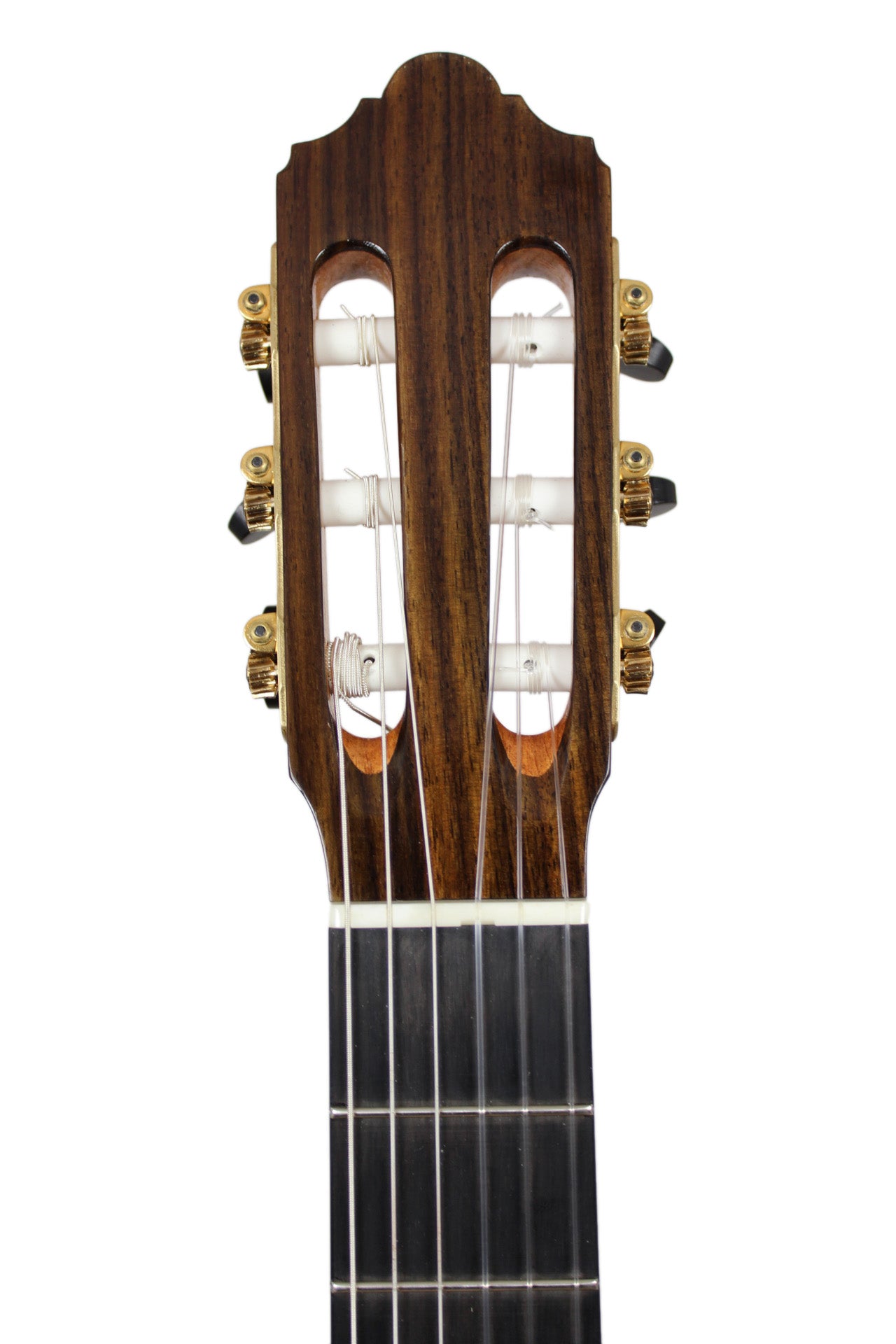 As President of Hill Guitar Company, Inc., Kenny continues to develop the Hill Guitar line in Santa Cruz building fine classical guitars for the world market. This is the location where luthiers are making the entire range of Signature, and Performance model guitars. Kenny Hill has written many articles for various guitar publications, including Acoustic Guitar, Soundboard, and American Lutherie. This guitar is designed for the player desiring a nylon string instrument with easy left hand reach. It has a double top made of two very thin layers of spruce, Nomex and cedar. In this case the spruce is facing out and gives the sound its dominant character, while the inner layer flavours it.