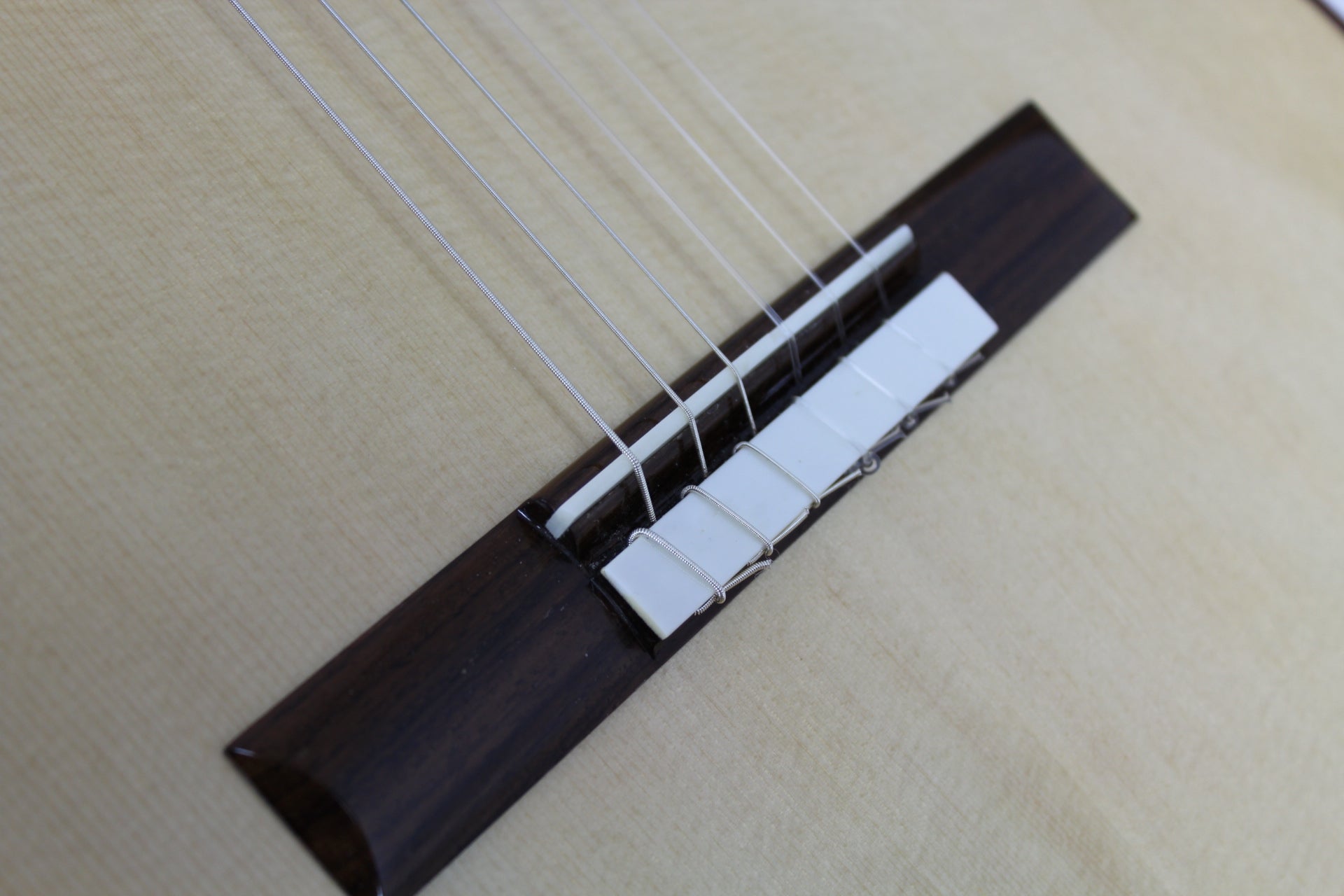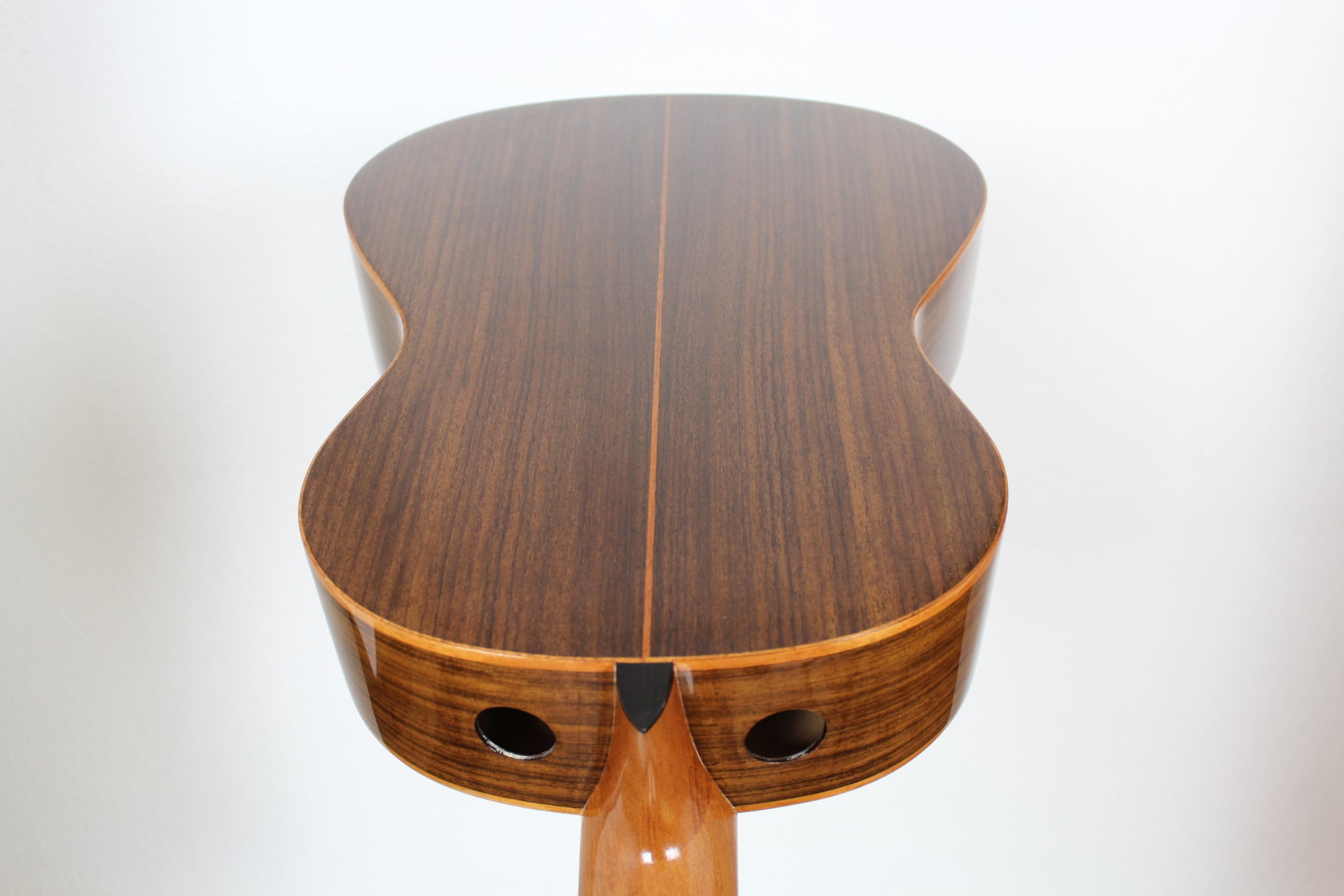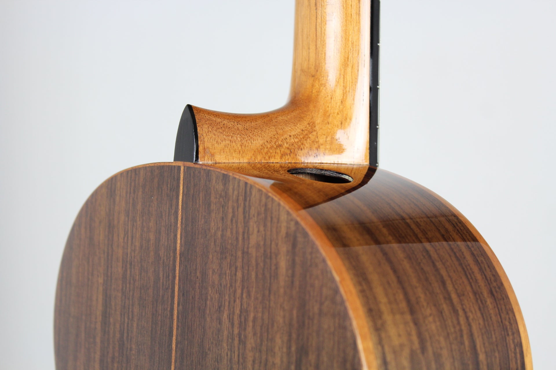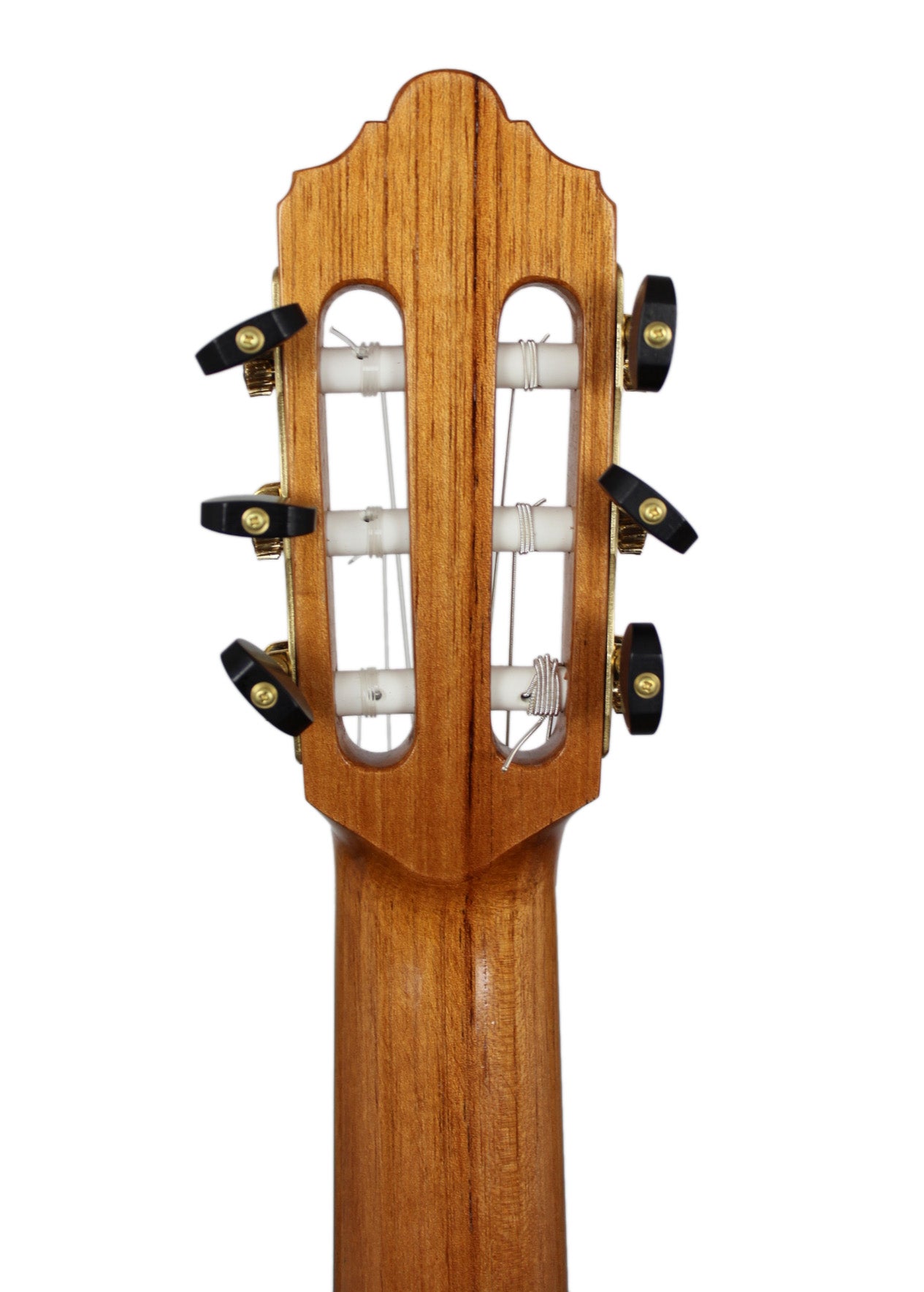 As President of Hill Guitar Company, Inc., Kenny continues to develop the Hill Guitar line in Santa Cruz building fine classical guitars for the world market. This is the location where luthiers are making the entire range of Signature, and Performance model guitars. Kenny Hill has written many articles for various guitar publications, including Acoustic Guitar, Soundboard, and American Lutherie. This guitar is designed for the player desiring a nylon string instrument with easy left hand reach. It has a double top made of two very thin layers of spruce, Nomex and cedar. In this case the spruce is facing out and gives the sound its dominant character, while the inner layer flavours it.