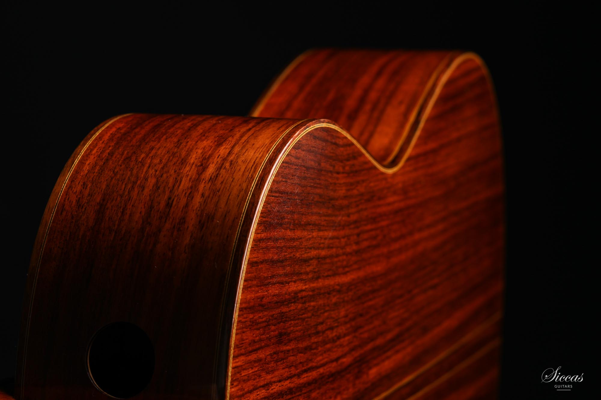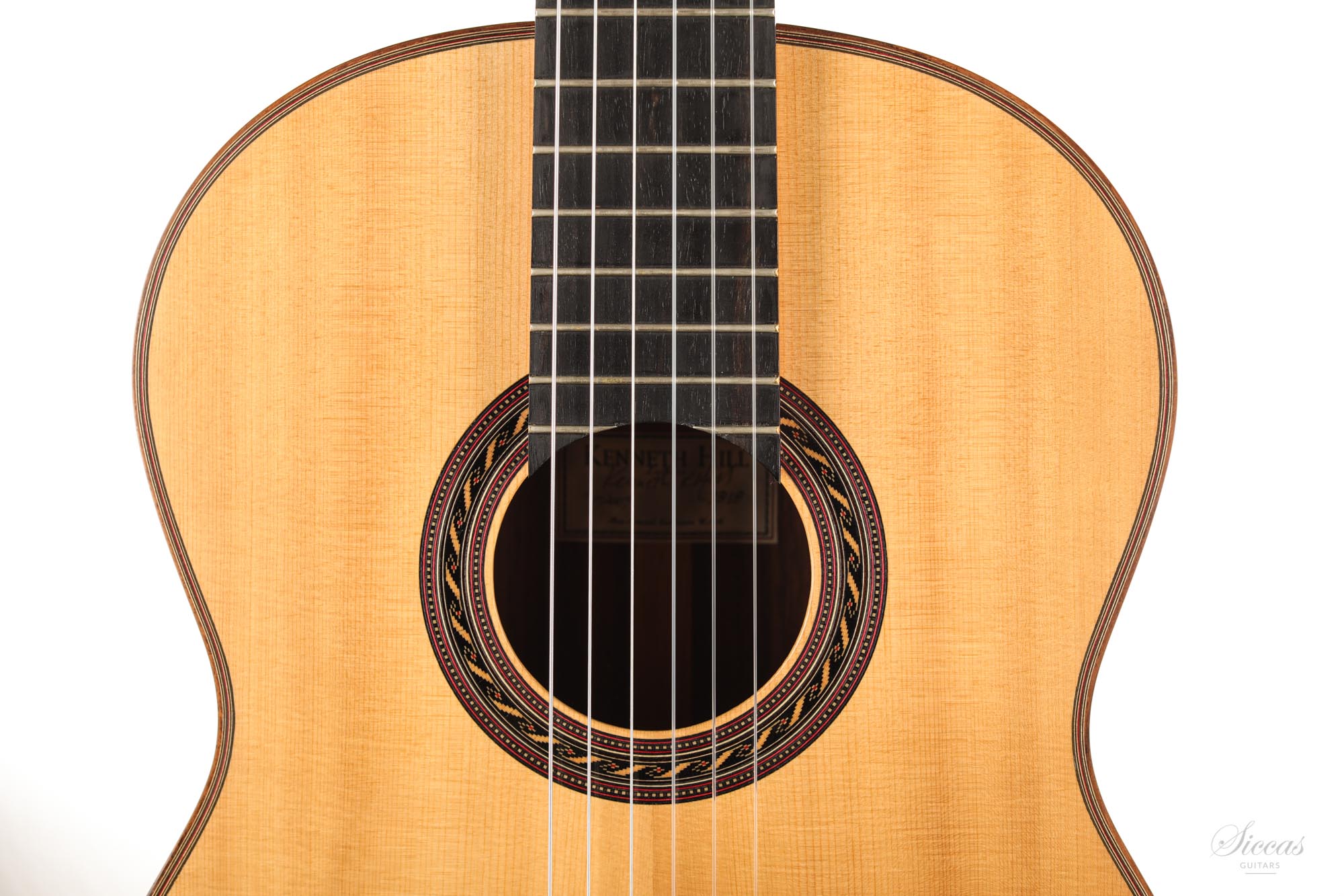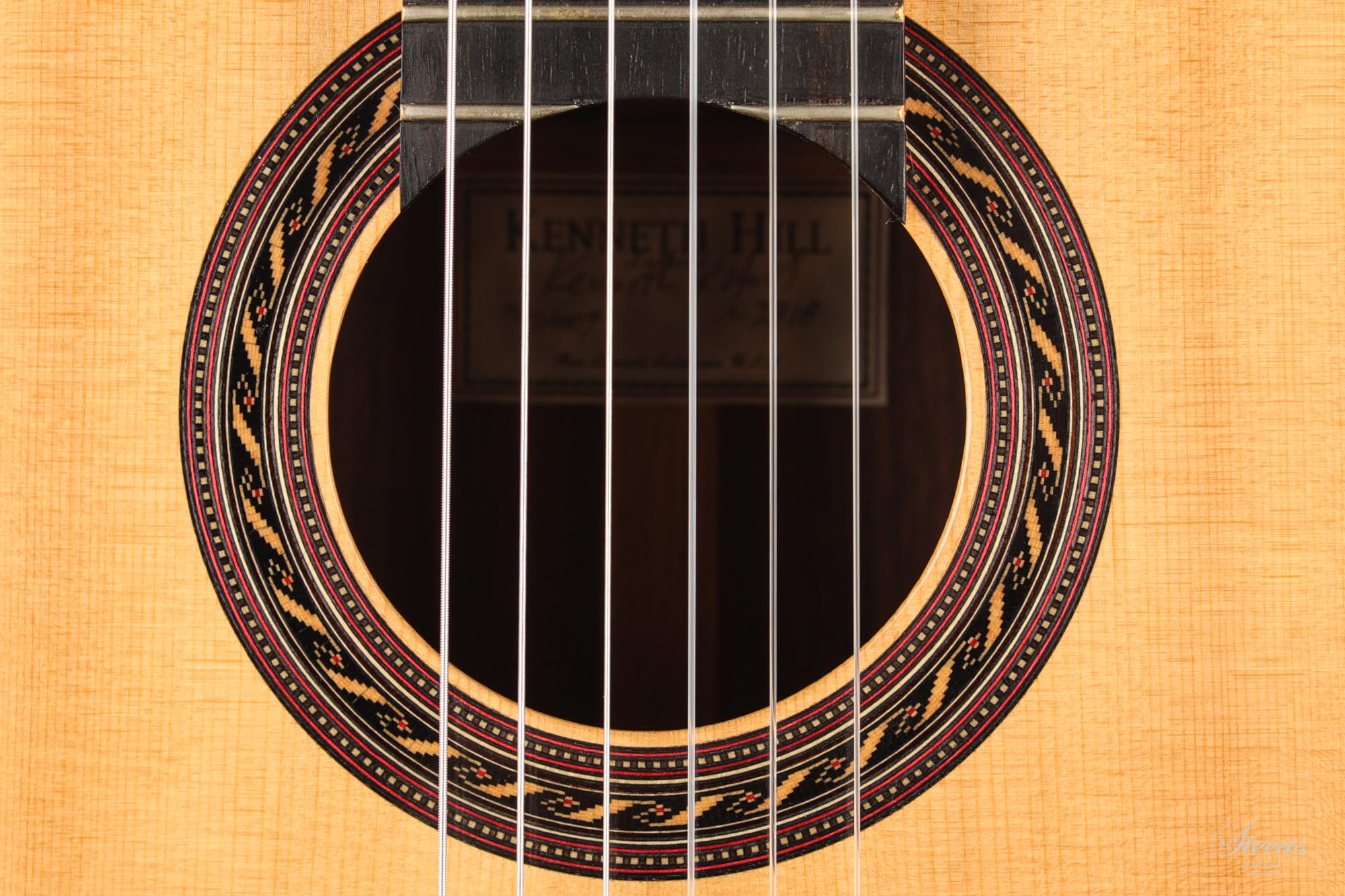 The Signature Series are Hill’s finest and most prestigious guitars, each one custom made to the highest standards of excellence, featuring a so-called “double top”, sandwich of Nomex between two very thin layers of spruce and cedar. In this case the spruce is facing out and gives the sound its dominant character, while the inner layer flavors it. The sides of this guitar are laminated with Cypress. Kenneth Hill uses spruce for the lattice bracing that can affect a very quick response and fast playing as well as of course power. The machine-heads are by Sloane.