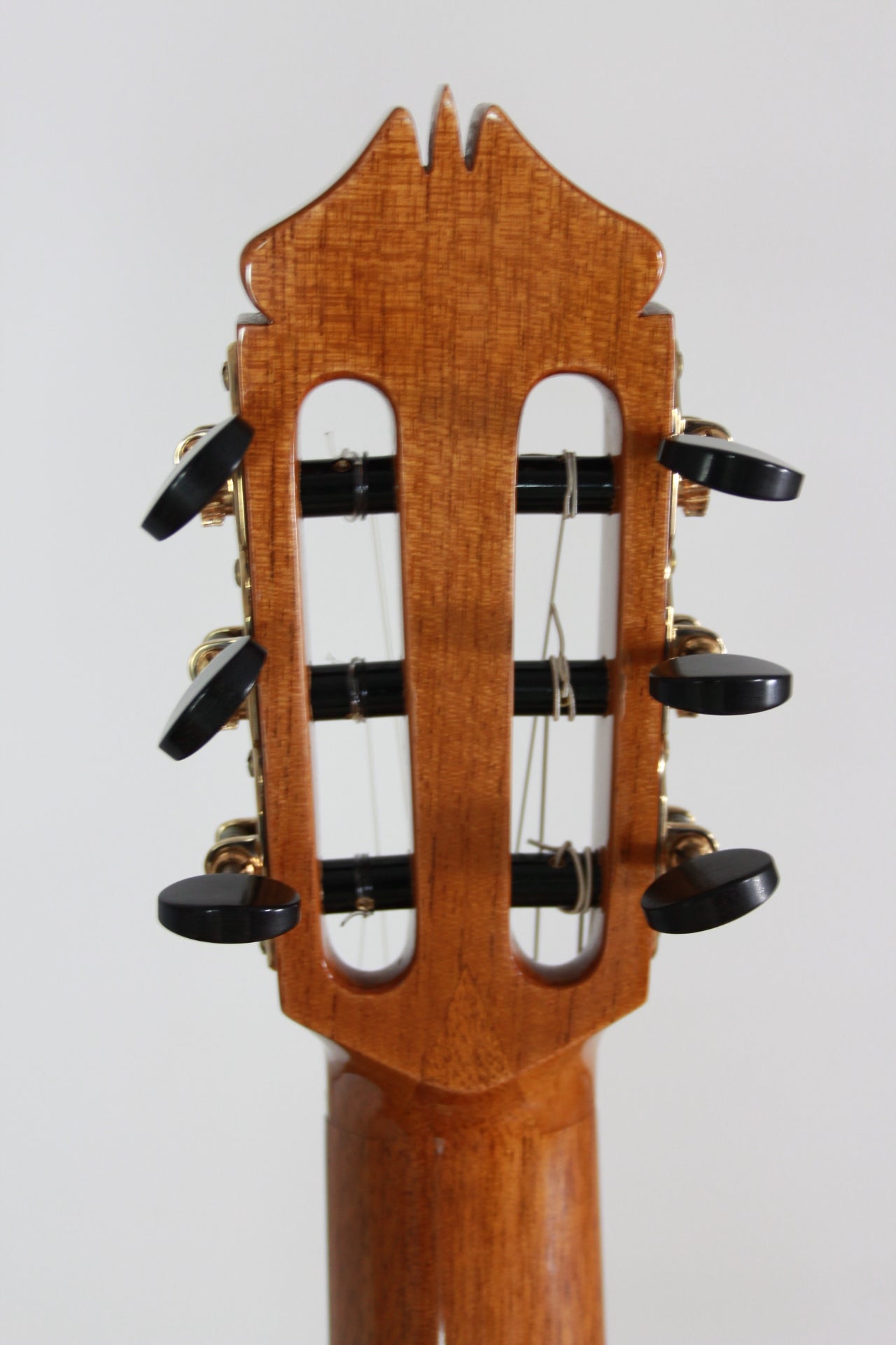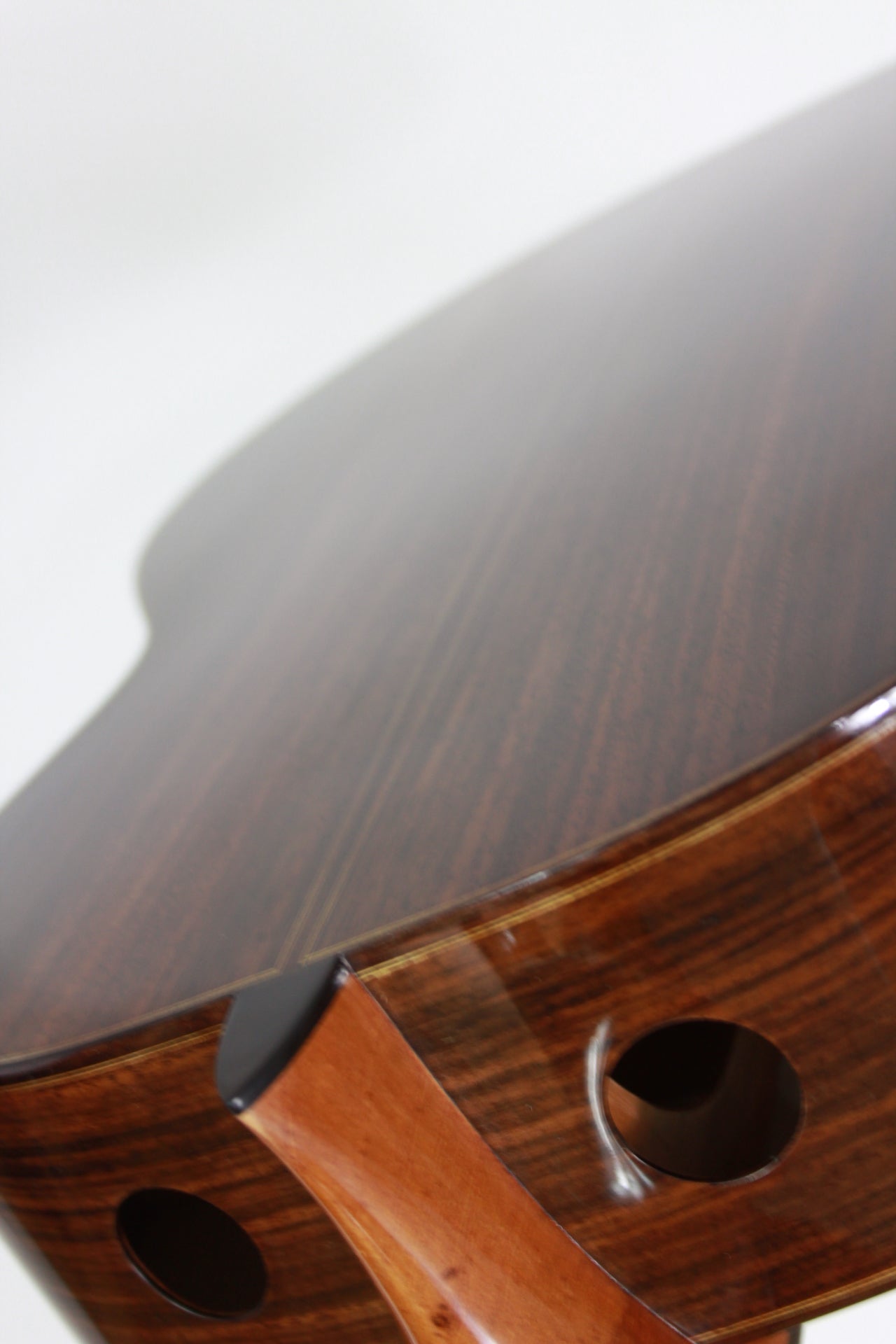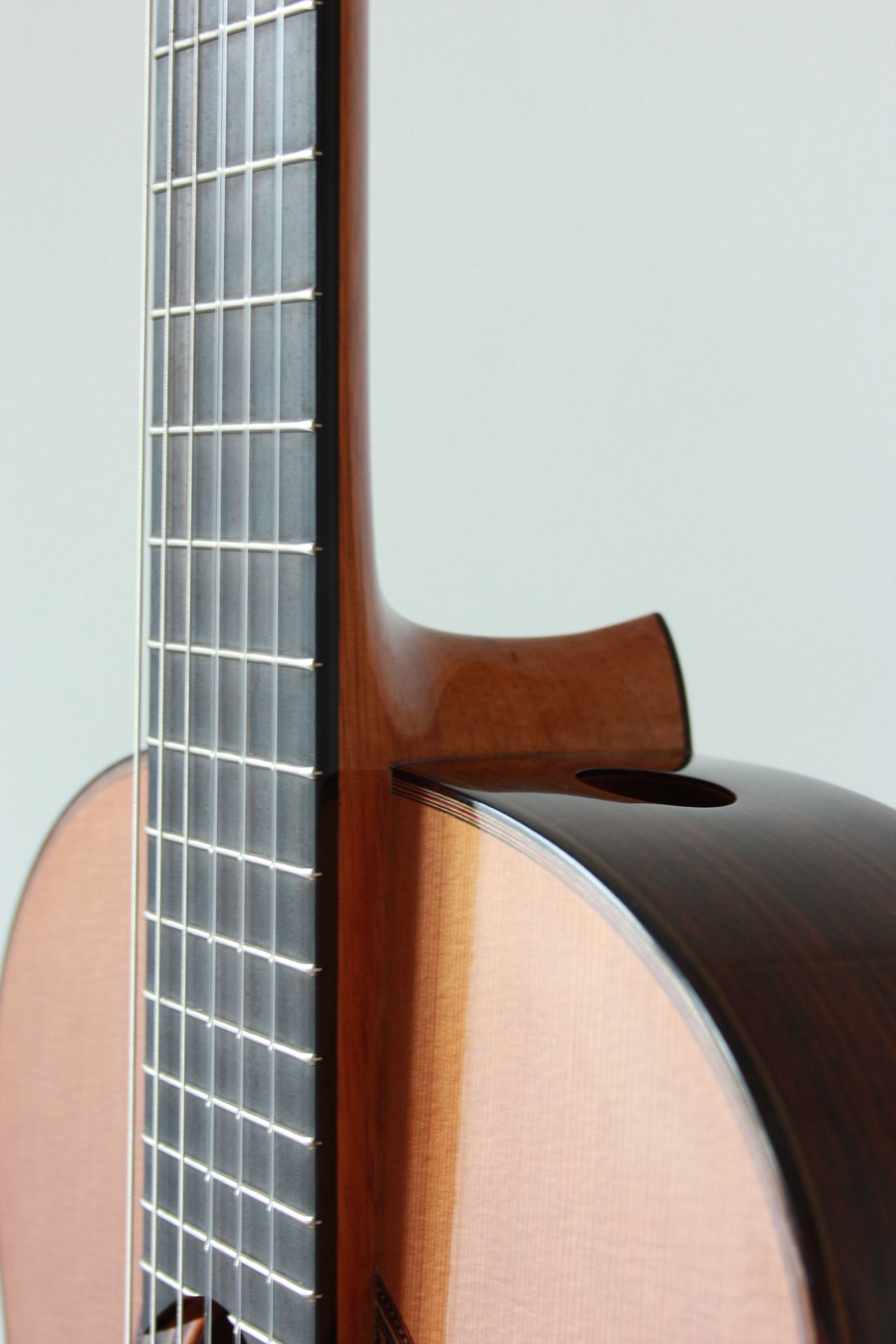 Kenny Hill is one of the most accomplished, experienced and versatile classical guitar makers in the world today. He is recognized as a fine maker, player, teacher and innovator. He has worked as an individual luthier, in small workshops as well as in large factory settings, to bring fine guitars to thousands of players of all levels around the world As President of Hill Guitar Company Inc., Kenny continues to develop the Hill Guitar line in Santa Cruz building fine classical guitars for the world market. This is the location where luthiers are making the entire range of Signature, and Performance model guitars. Kenny Hill has written many articles for various guitar magazines, including Acoustic Guitar, Soundboard, and American Lutherie. The Signature Series are Hill’s finest and most prestigious guitars, each one custom made to the highest standards of excellence, featuring a double top sandwich of Nomex between two very thin layers of spruce and cedar. In this case the cedar is facing out and gives the sound its dominant character, while the inner layer flavors it. The sides of this guitar are laminated with Cypress. Kenneth Hill uses a spruce and cedar mix for the lattice bracing that can affect a very quick response and fast playing as well as of course power. The machine-heads are by Sloane. The Signature Model is built with an elevated fingerboard which not only changes the way that strings pull on the board, giving a firm and positive attack, but it also makes playing in the upper register more comfortable. But also the shape of the neck and the thickness of the fingerboard make it easy to play. Another feature are the two soundports in the upper bout sides near the heel increasing air flow through the body which lets the soundboard move more freely. These holes not only increase the presence of the sound for the player but also add to the volume, clarity, openness and depth for the listener. The guitar has got wide dynamic range and a beautiful color palette.