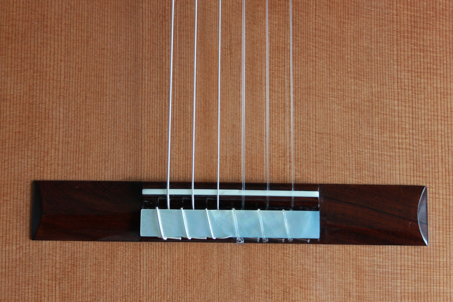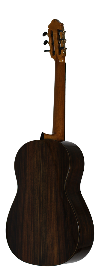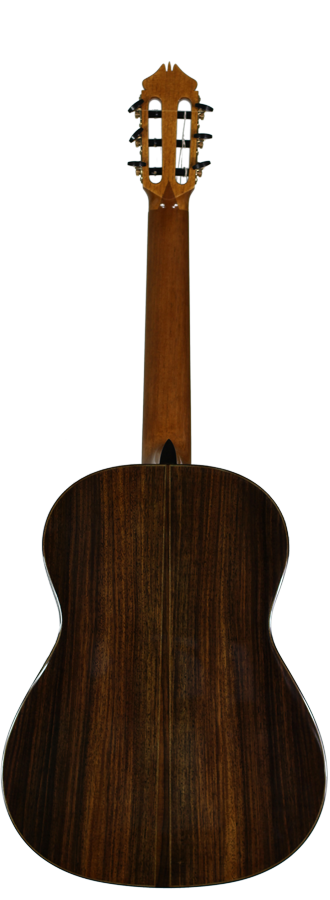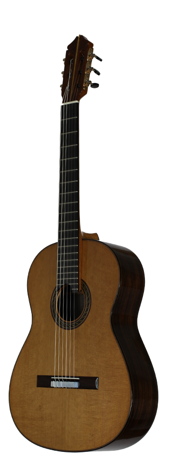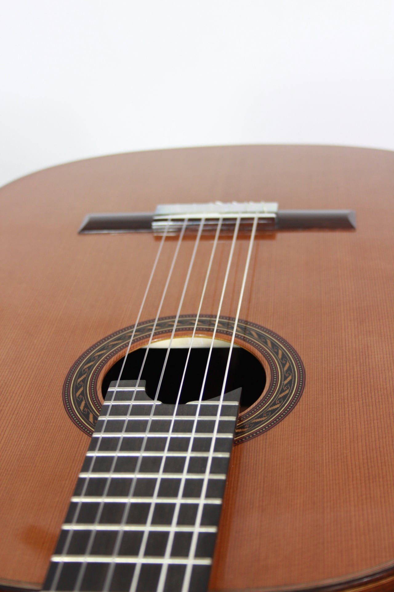 Kenny Hill is one of the most accomplished, experienced and versatile classical guitar makers in the world today. He is recognized as a fine maker, player, teacher and innovator. He has worked as an individual luthier, in small workshops as well as in large factory settings, to bring fine guitars to thousands of players of all levels around the world As President of Hill Guitar Company Inc., Kenny continues to develop the Hill Guitar line in Santa Cruz building fine classical guitars for the world market. This is the location where luthiers are making the entire range of Signature, and Performance model guitars. Kenny Hill has written many articles for various guitar magazines, including Acoustic Guitar, Soundboard, and American Lutherie. The Signature Series are Hill’s finest and most prestigious guitars, each one custom made to the highest standards of excellence, featuring a double top sandwich of Nomex between two very thin layers of spruce and cedar. In this case the cedar is facing out and gives the sound its dominant character, while the inner layer flavors it. The sides of this guitar are laminated with Cypress. Kenneth Hill uses a spruce and cedar mix for the lattice bracing that can affect a very quick response and fast playing as well as of course power. The machine-heads are by Sloane. The Signature Model is built with an elevated fingerboard which not only changes the way that strings pull on the board, giving a firm and positive attack, but it also makes playing in the upper register more comfortable. But also the shape of the neck and the thickness of the fingerboard make it easy to play. Another feature are the two soundports in the upper bout sides near the heel increasing air flow through the body which lets the soundboard move more freely. These holes not only increase the presence of the sound for the player but also add to the volume, clarity, openness and depth for the listener. The guitar has got wide dynamic range and a beautiful color palette.