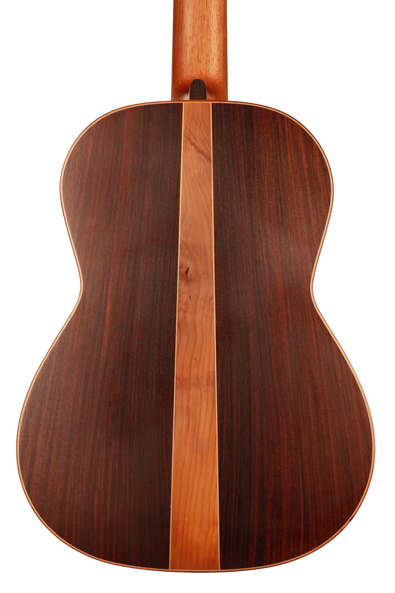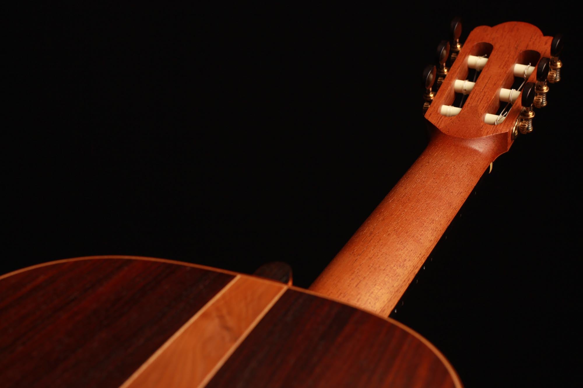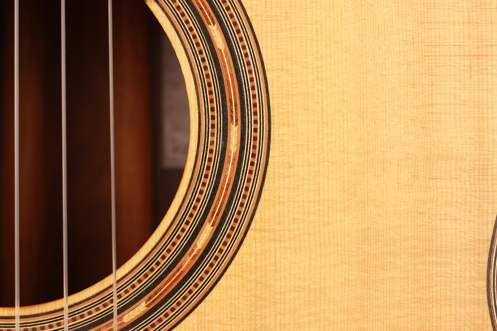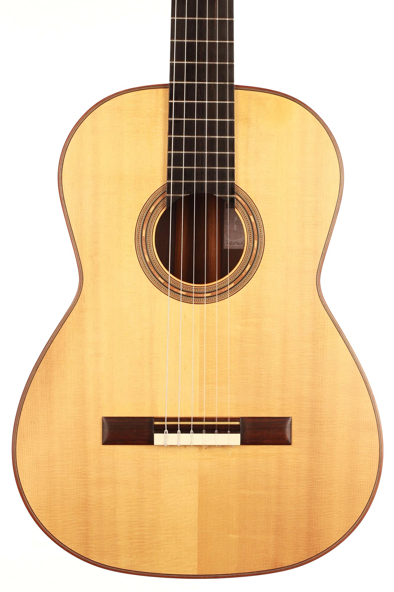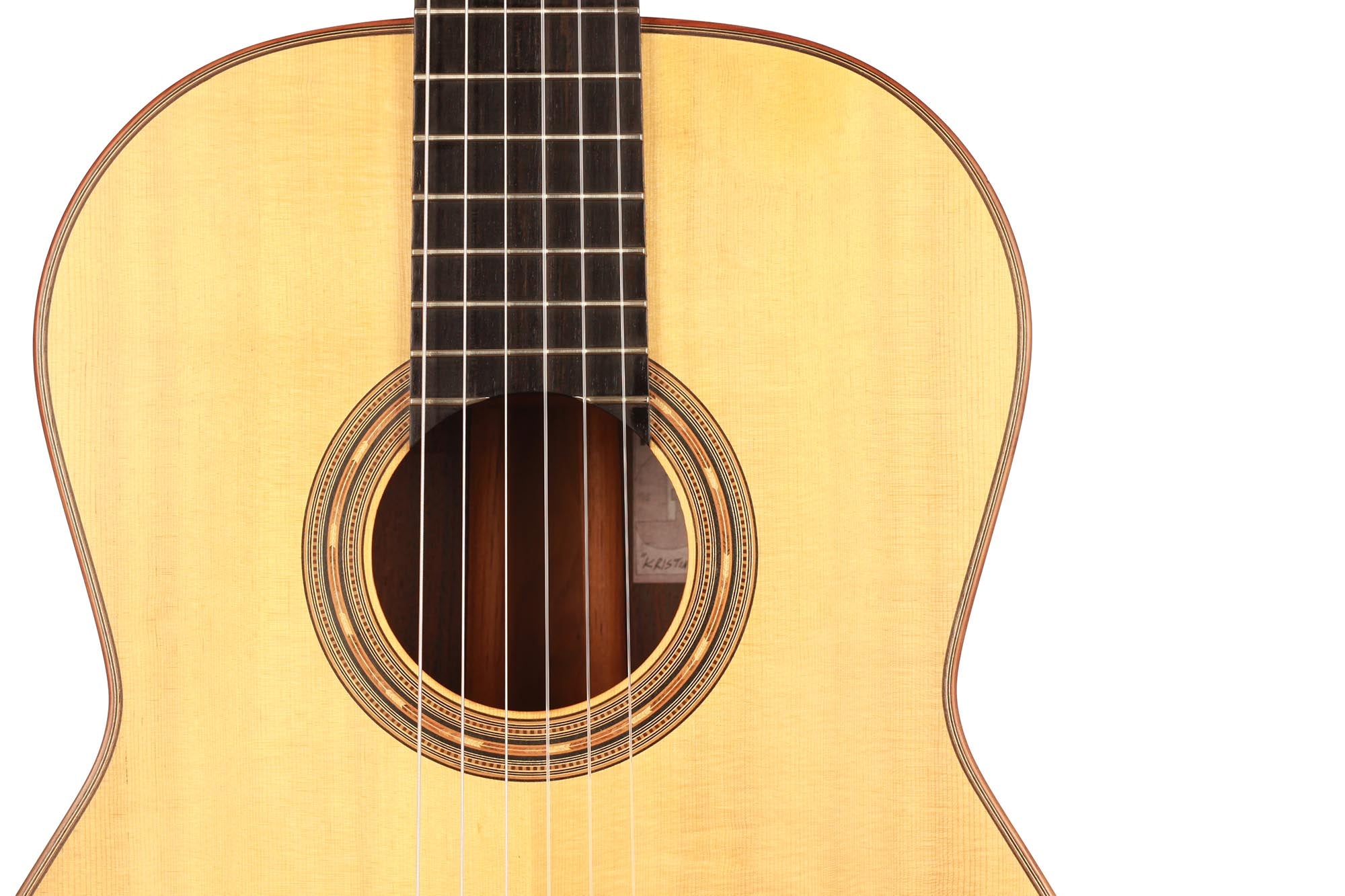 This fantastic 2011 Kevin Aram “Kristina” guitar has a strikingly beautiful and golden-honey coloured spruce top. This traditional seven-fan-bracing guitar in the Torres style is in very good condition with a perfect structural stability and only a few playing wears. It is thinly hard-waxed, which gives a natural elegance to the wood. The clear tone, the presence of fine harmonics, and a great reaction to the attack of the notes are remarkable. Also the pure crystalline timbre and excellent playability make it a perfect traditional concert guitar.