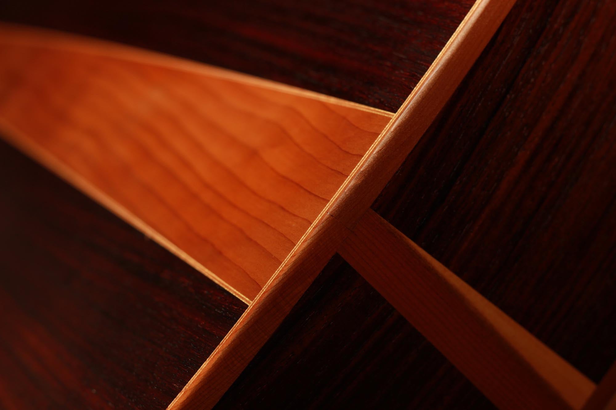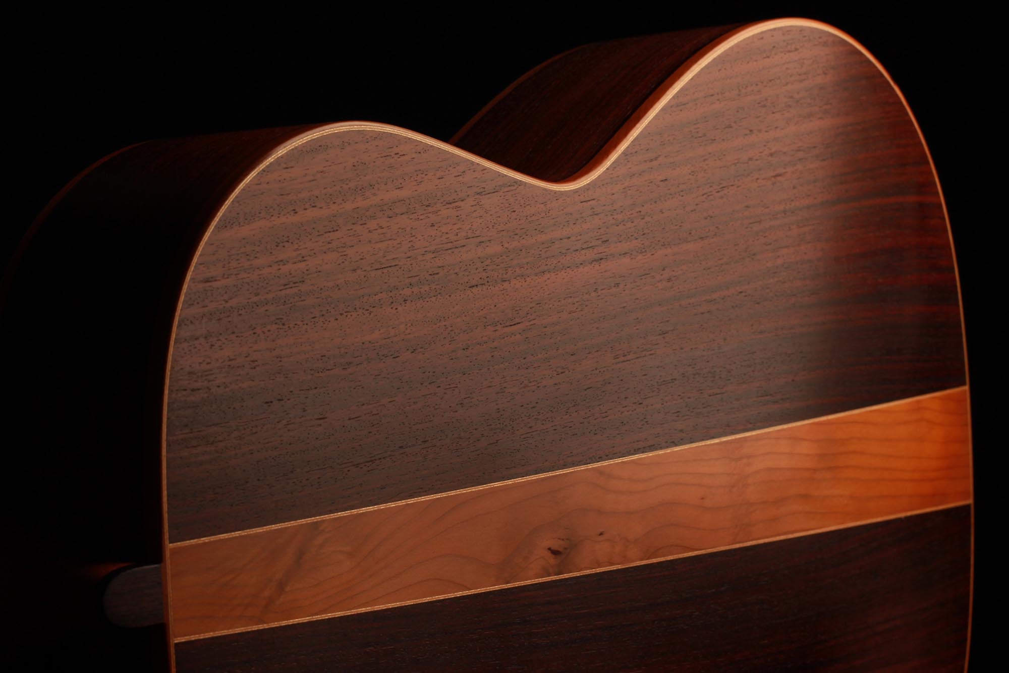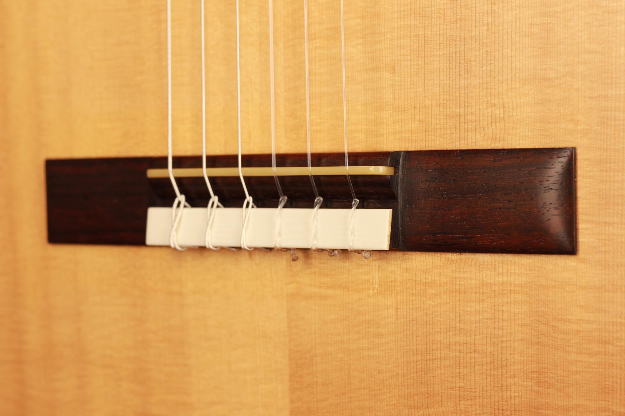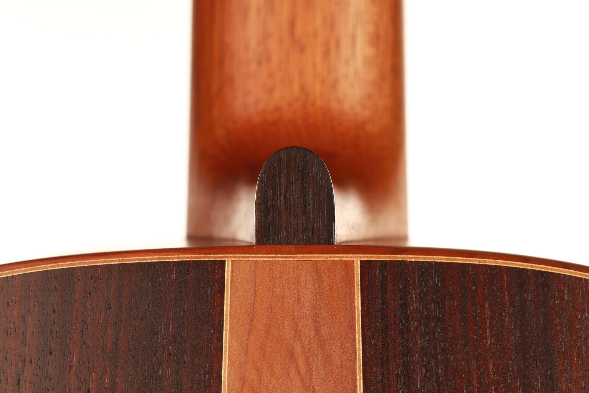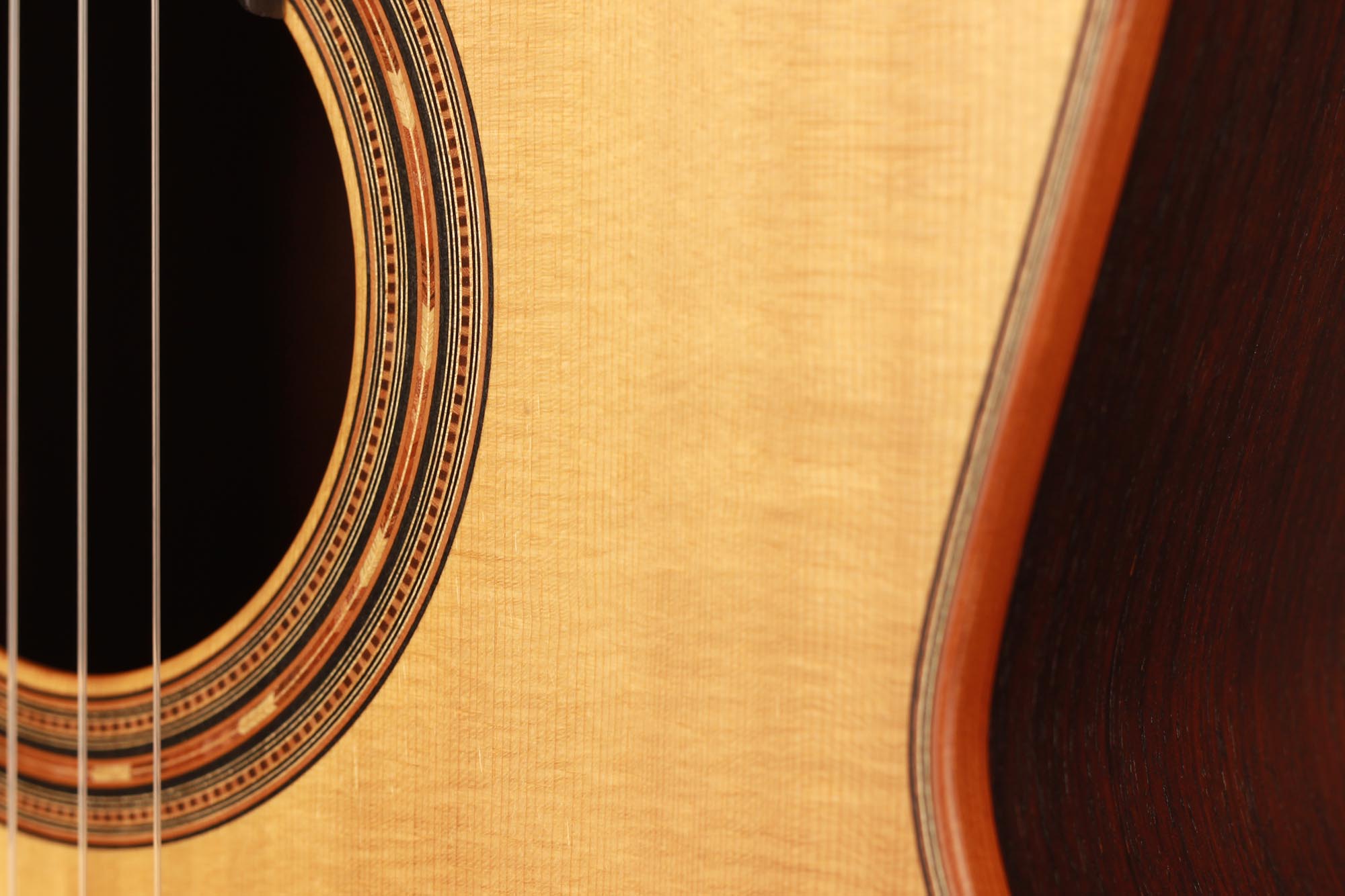 This fantastic 2011 Kevin Aram “Kristina” guitar has a strikingly beautiful and golden-honey coloured spruce top. This traditional seven-fan-bracing guitar in the Torres style is in very good condition with a perfect structural stability and only a few playing wears. It is thinly hard-waxed, which gives a natural elegance to the wood. The clear tone, the presence of fine harmonics, and a great reaction to the attack of the notes are remarkable. Also the pure crystalline timbre and excellent playability make it a perfect traditional concert guitar.
