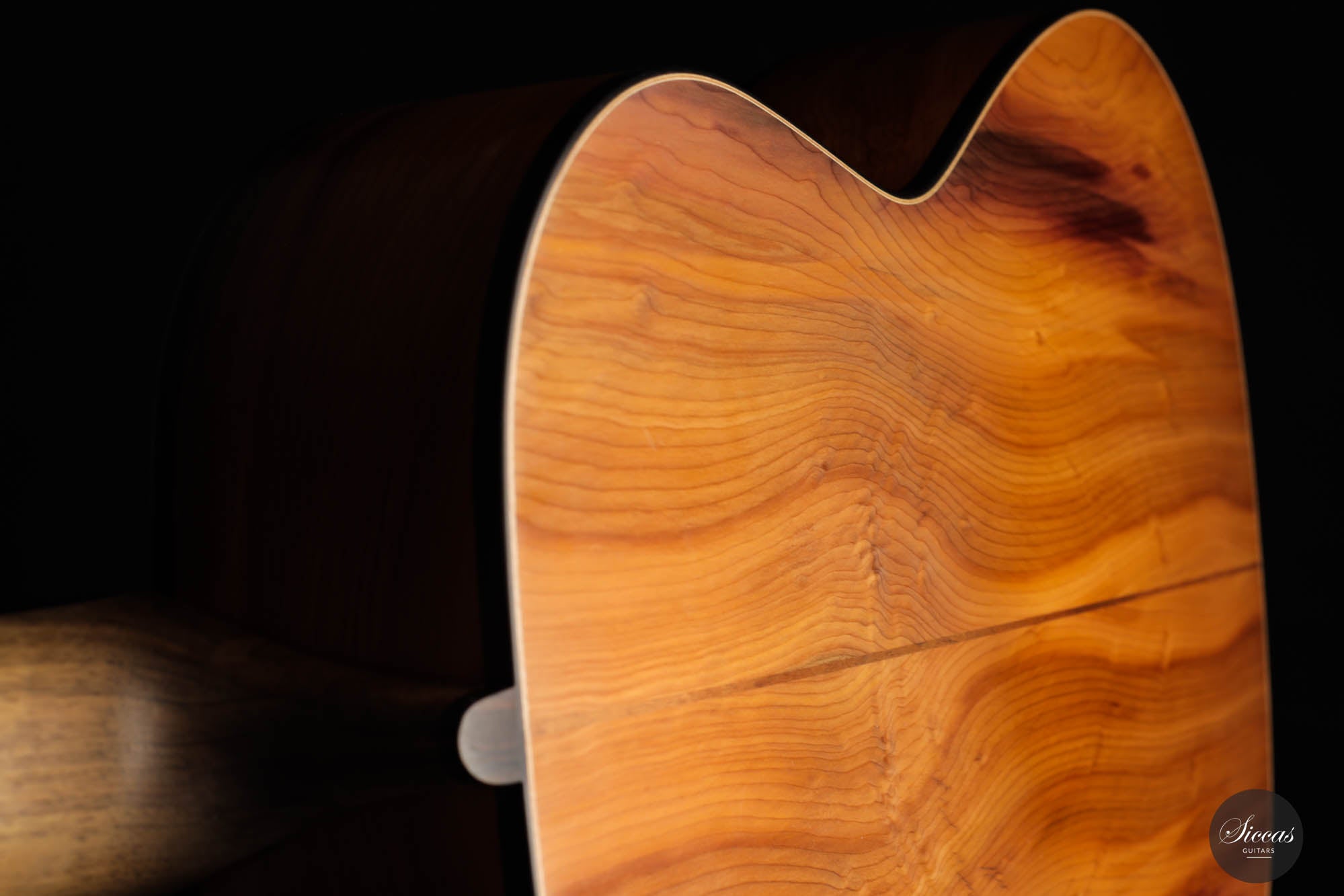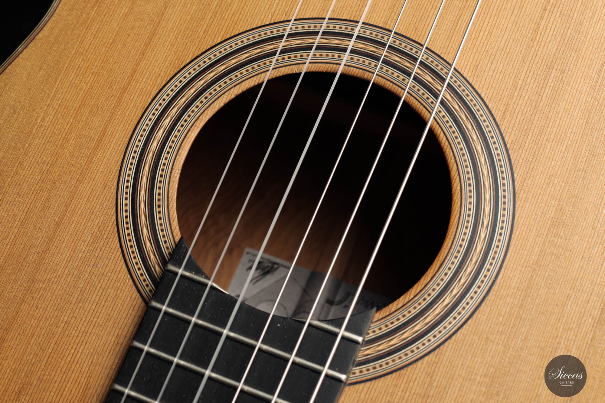 "Frankie" ist in ausgezeichnetem Zustand mit minimalen Gebrauchsspuren, was auf ihre gut erhaltene Qualität hinweist. Die Holzkombination ist eine einzigartige Mischung aus englischer Eibe für Boden und Zargen und einer Zederndecke - alles trägt zu ihrem verfeinerten Klang und reizvollen Ästhetik bei. Trotz einiger Gebrauchsspuren und typischer Saitendellen hinter dem Steg, bleibt die Gitarre in einem hervorragenden Gesamtzustand. Als geniale Verschmelzung von Traditionellem und Modernem steht sie als Symbol für überlegene Handwerkskunst, Design und akustische Brillanz.
