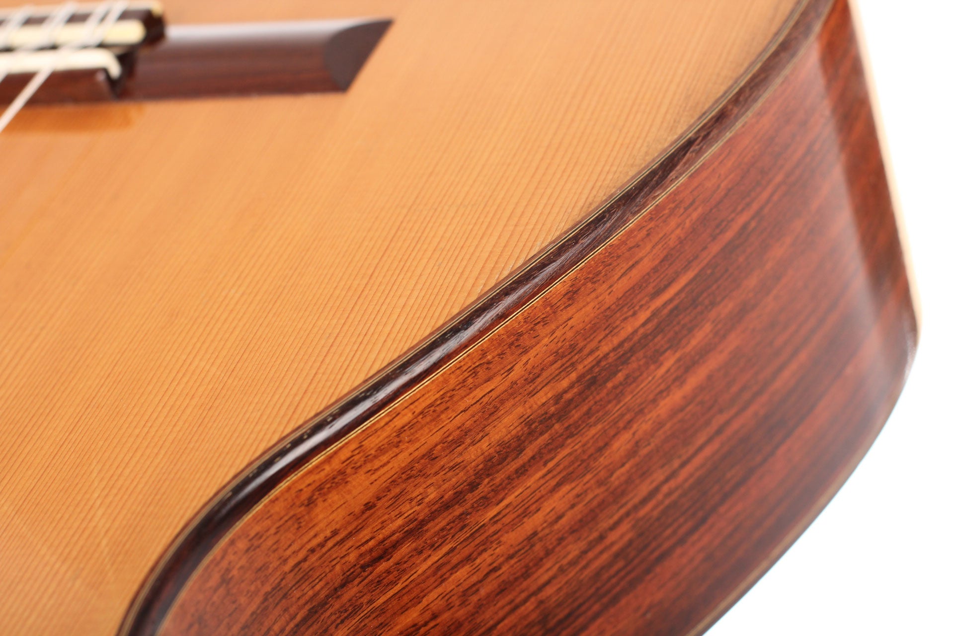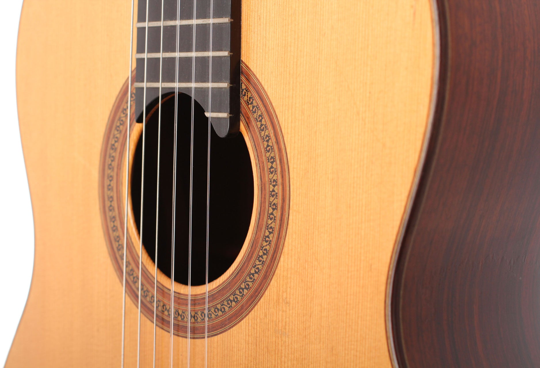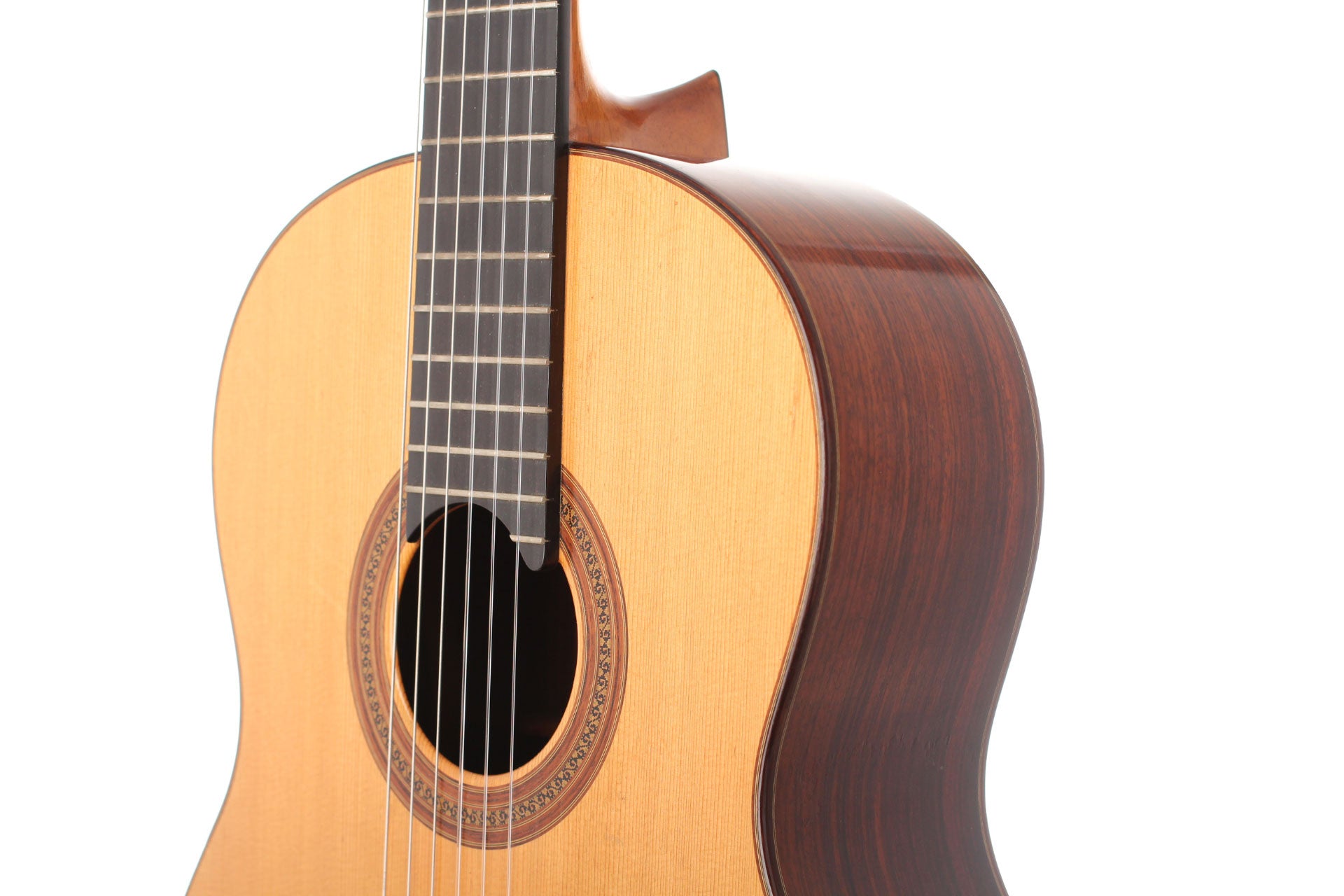 This classical guitar was built by Kolya Panhuyzen in 1991. The two-piece spruce top of this guitar is framed by beautiful dark and light purfling. The two-piece back and the sides are made of Indian Rosewood. The guitar is in very good condition and has only some minor traces on the back and the sides. The sound is typical for Panhuyzen guitars: Very balanced, superior sustain, impressive basses. The tuning machines are made by Sloane. Included is a hardshell case.