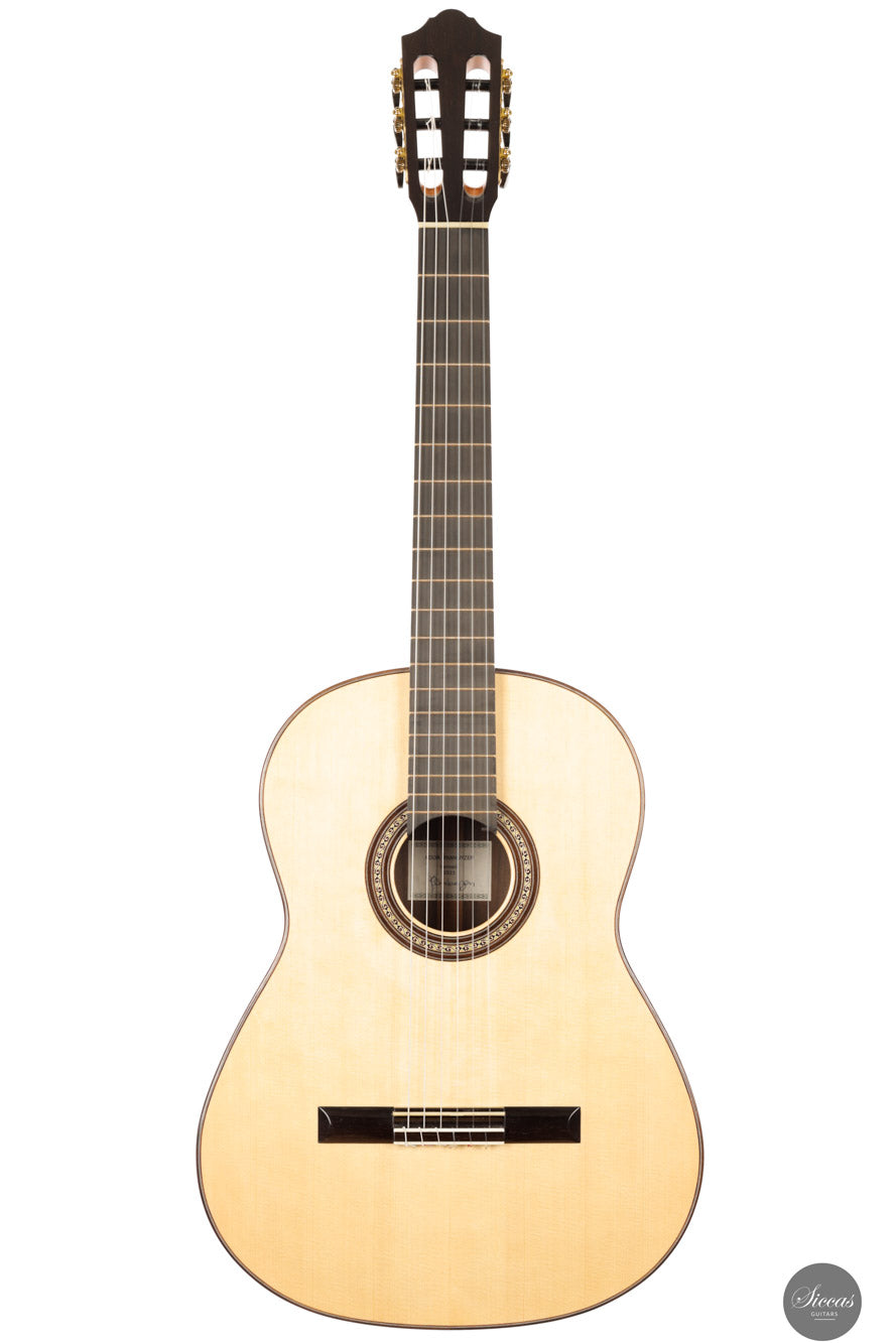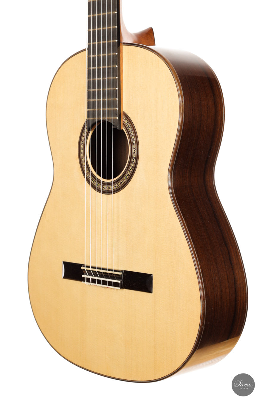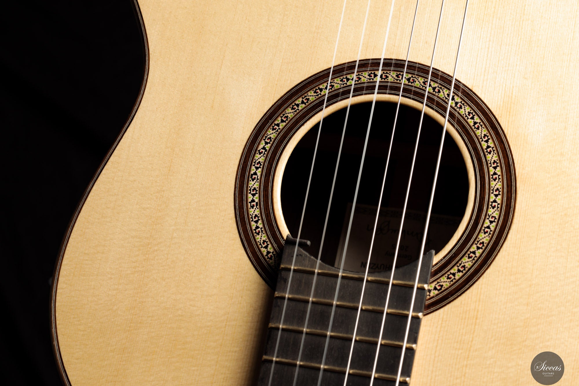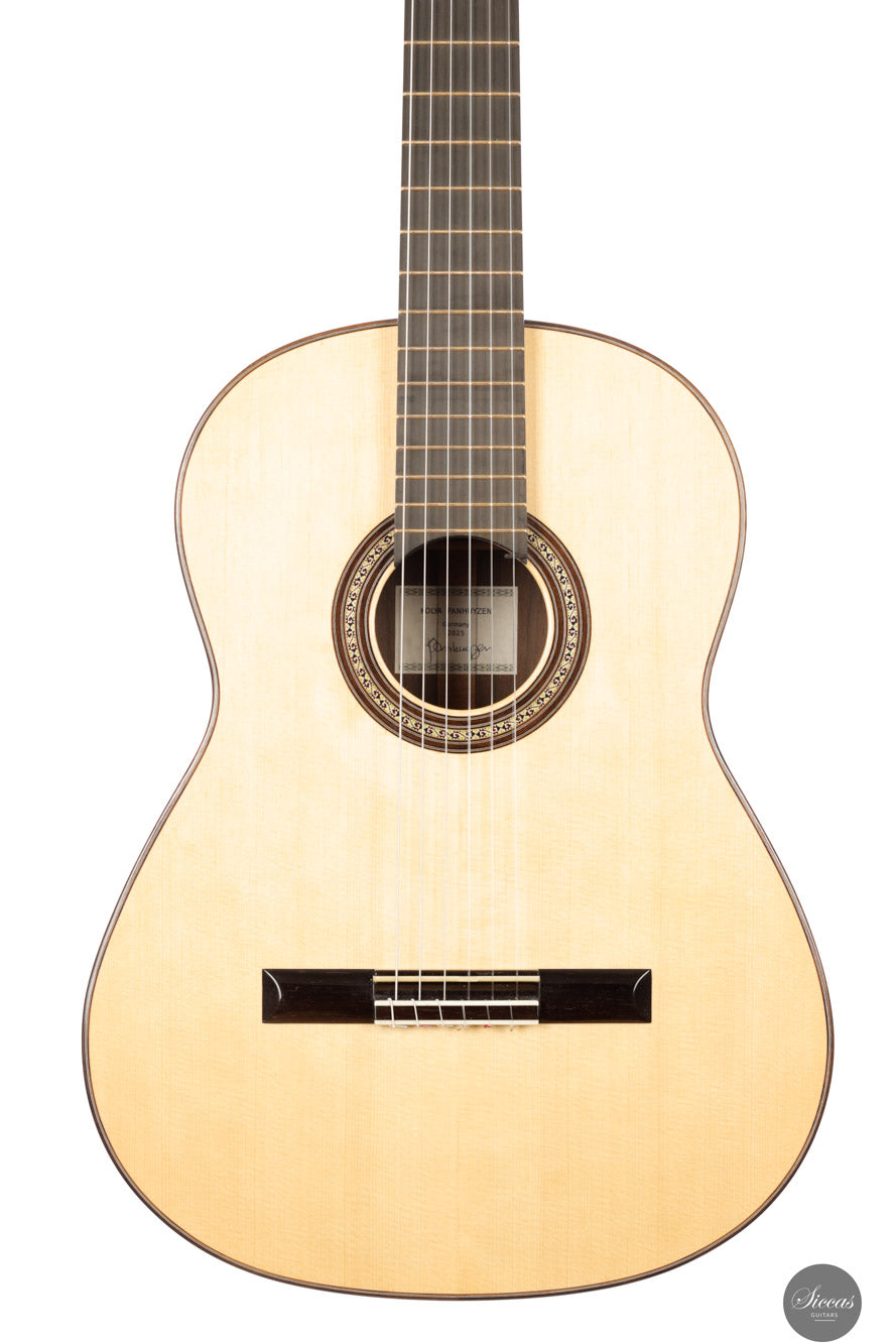 Dieses brandneue Konzertinstrument aus dem Jahr 2025 zeigt Kolya Panhuyzens konsequente Orientierung an einem modernen Konzertkonzept, das dennoch bewusst auf eine reine Holzkonstruktion setzt. Es handelt sich um eine Doubletop-Gitarre mit Fichtendecke und Boden und Zargen aus Madagaskar-Palisander. Auf zusätzliche Materialien wie Kohlefaser oder Nomex wird verzichtet, wodurch ein besonders natürlicher und organischer Klangcharakter entsteht.