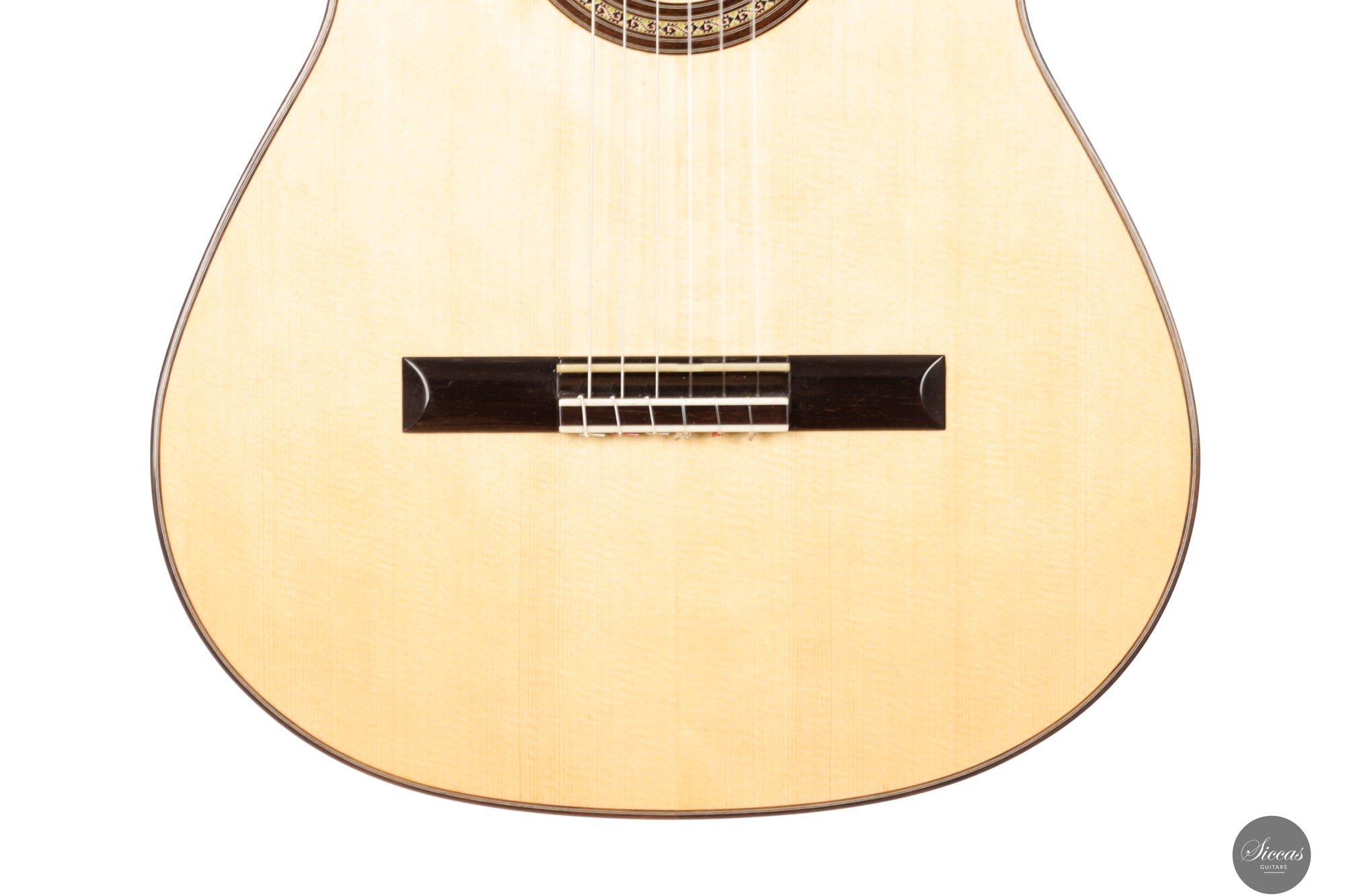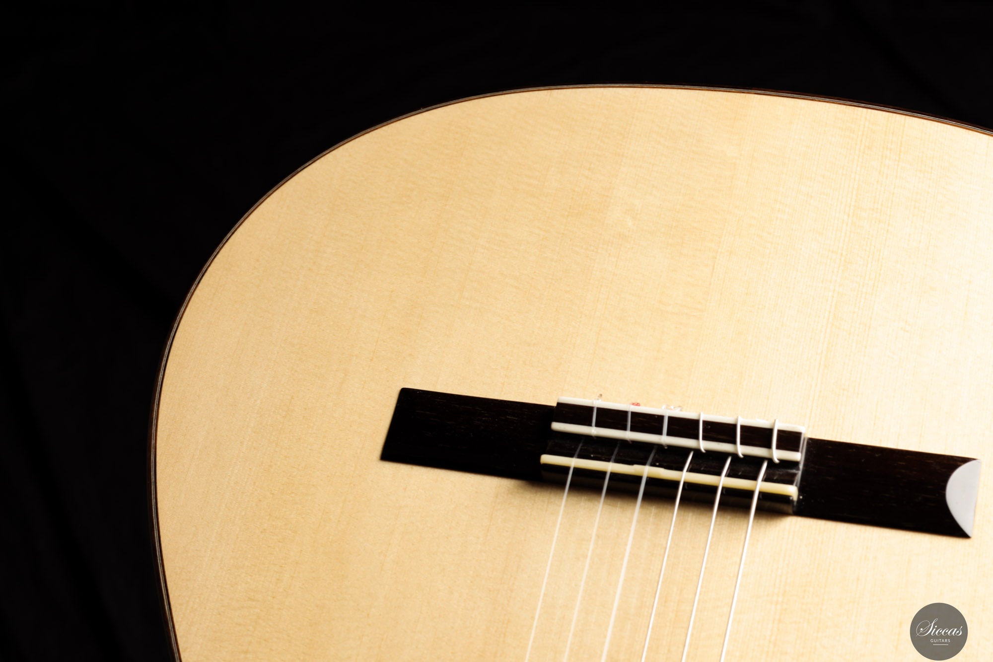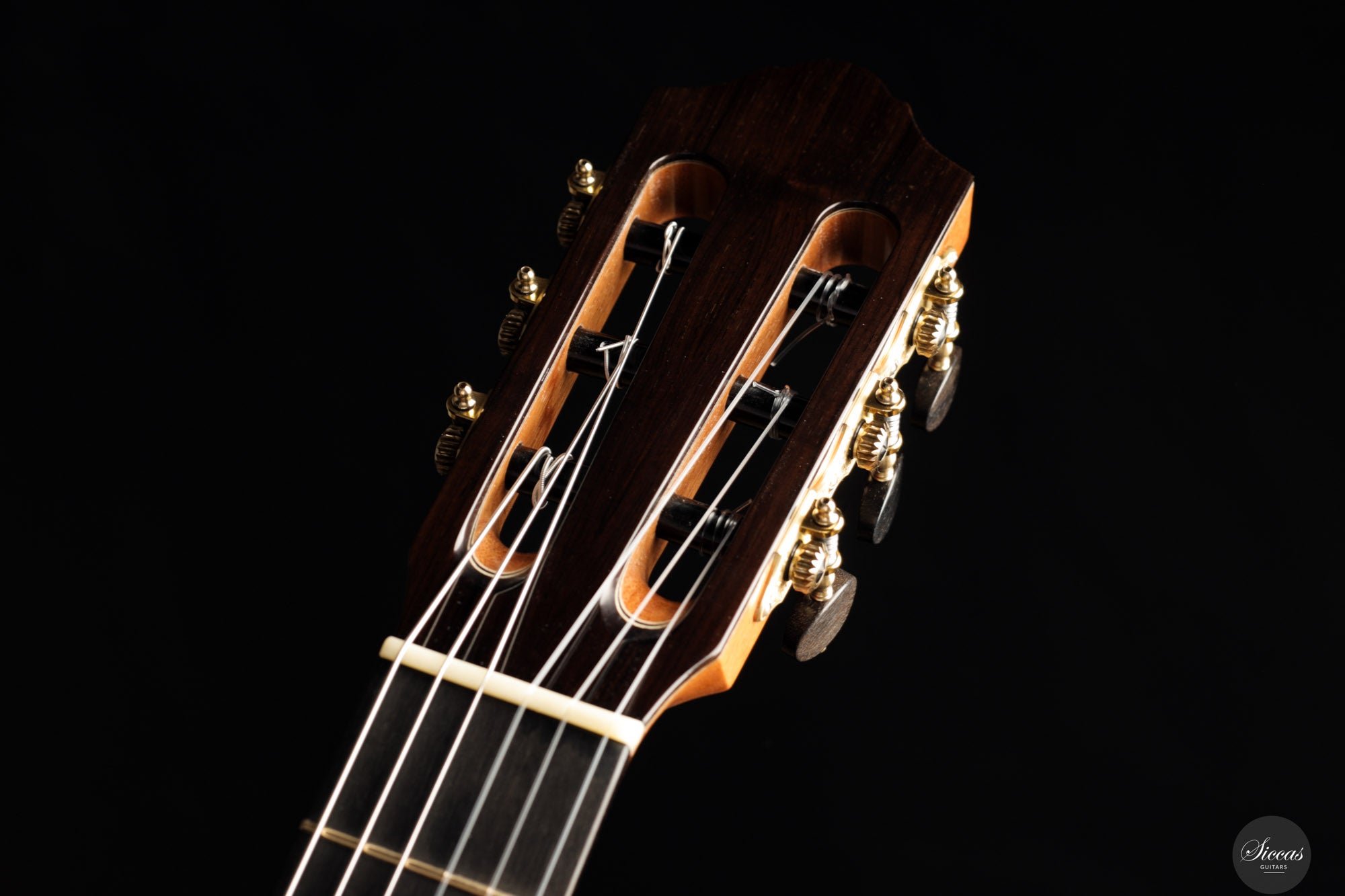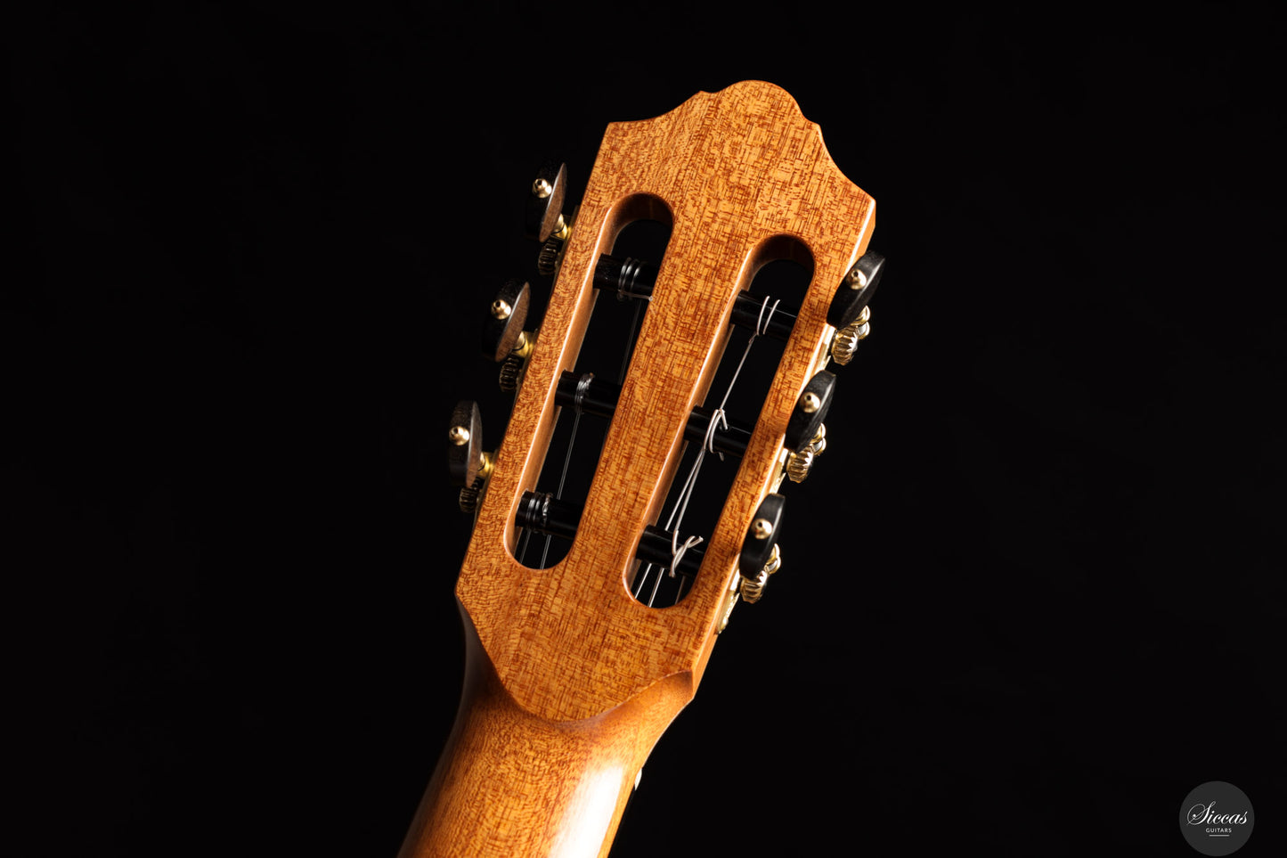Dieses brandneue Konzertinstrument aus dem Jahr 2025 zeigt Kolya Panhuyzens konsequente Orientierung an einem modernen Konzertkonzept, das dennoch bewusst auf eine reine Holzkonstruktion setzt. Es handelt sich um eine Doubletop-Gitarre mit Fichtendecke und Boden und Zargen aus Madagaskar-Palisander. Auf zusätzliche Materialien wie Kohlefaser oder Nomex wird verzichtet, wodurch ein besonders natürlicher und organischer Klangcharakter entsteht.