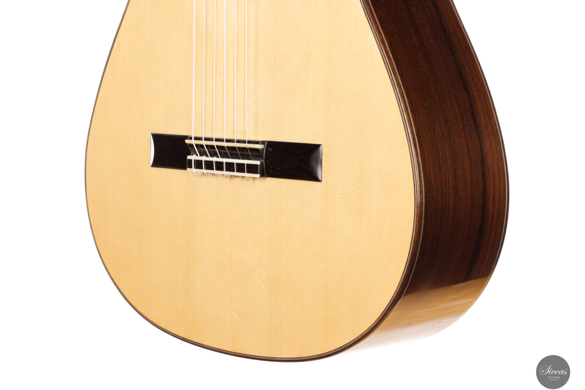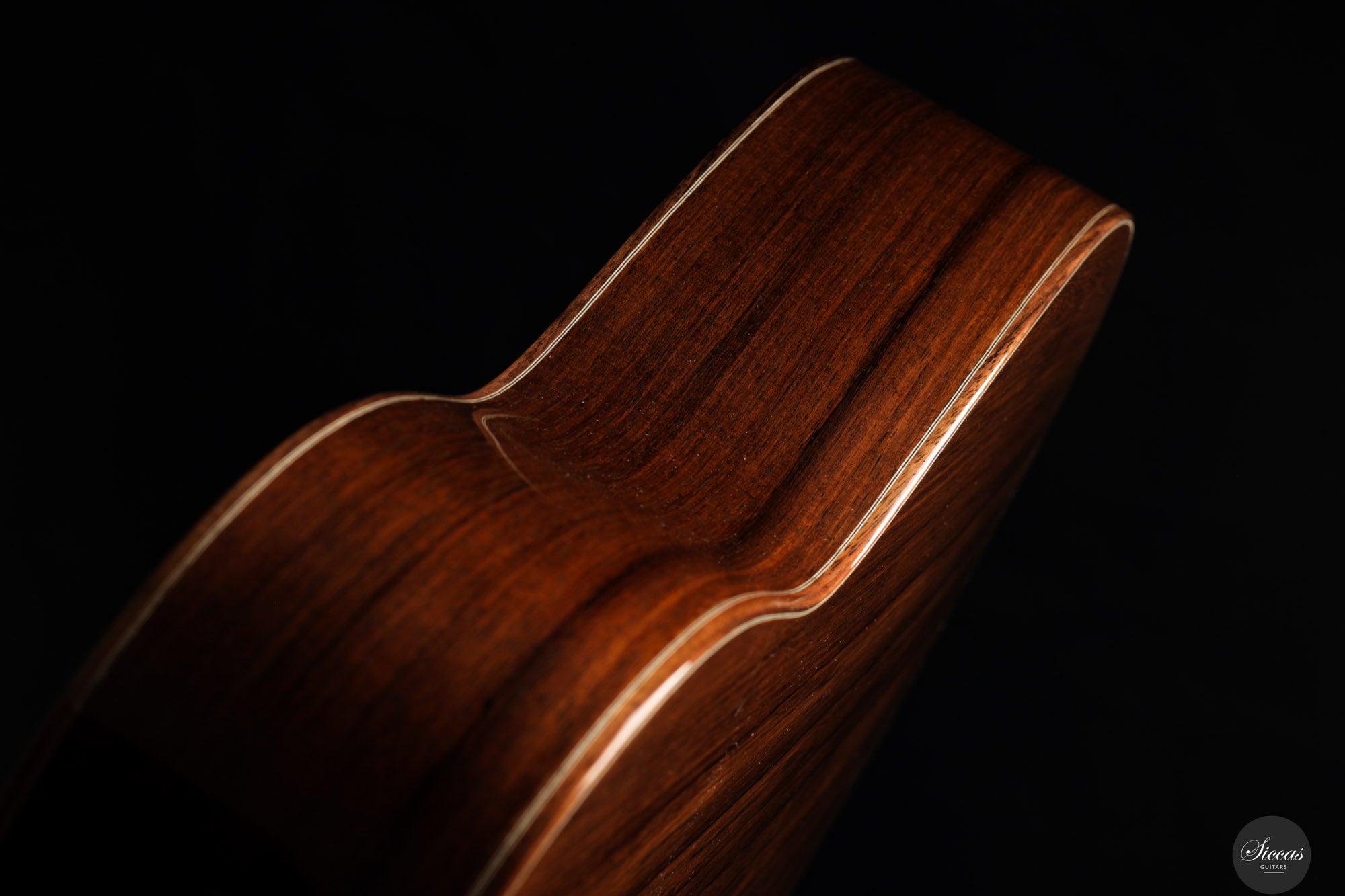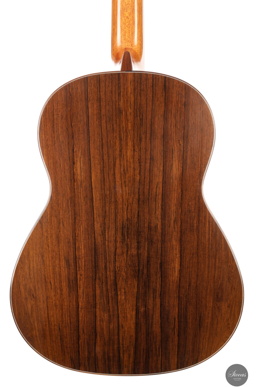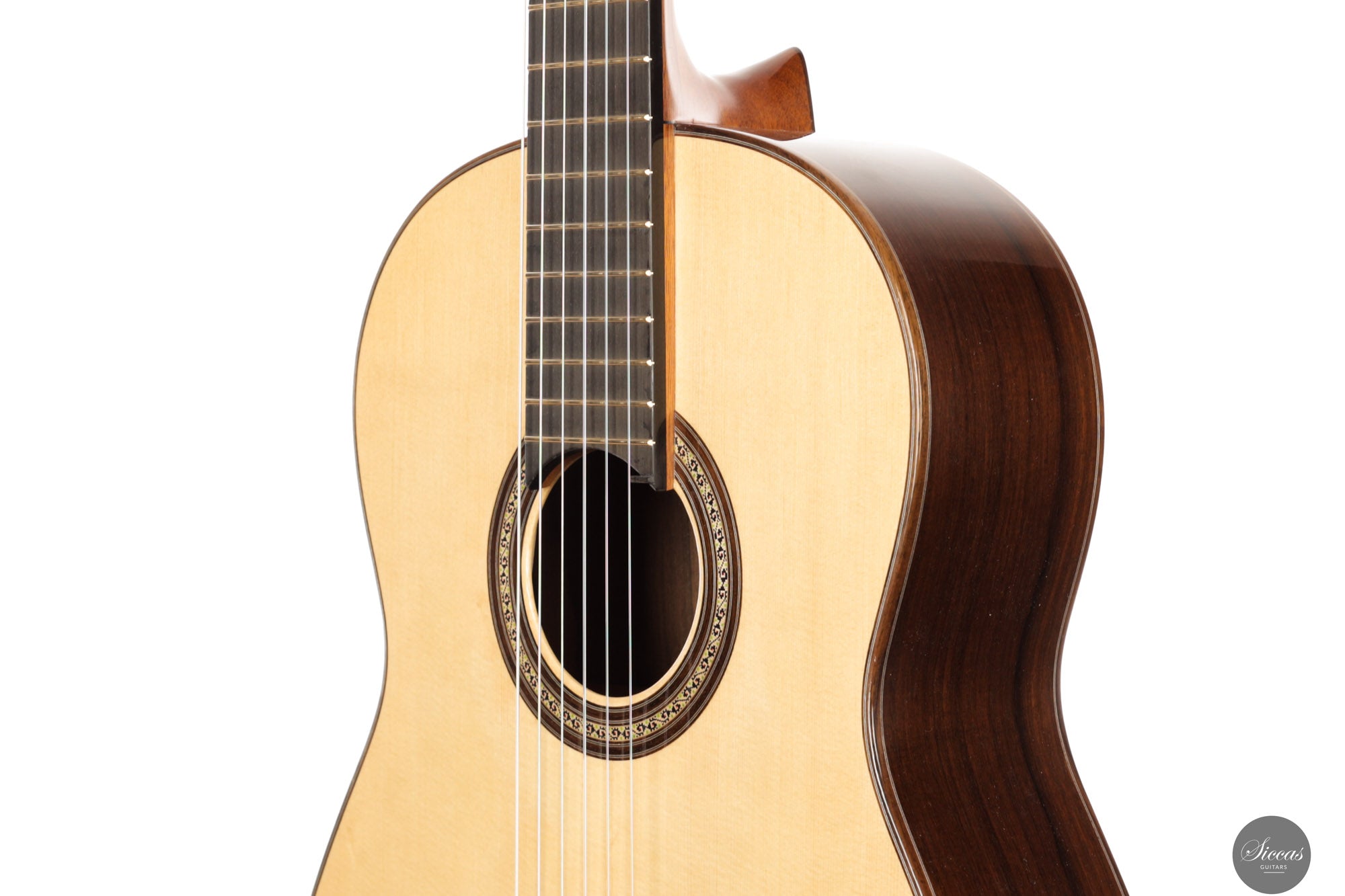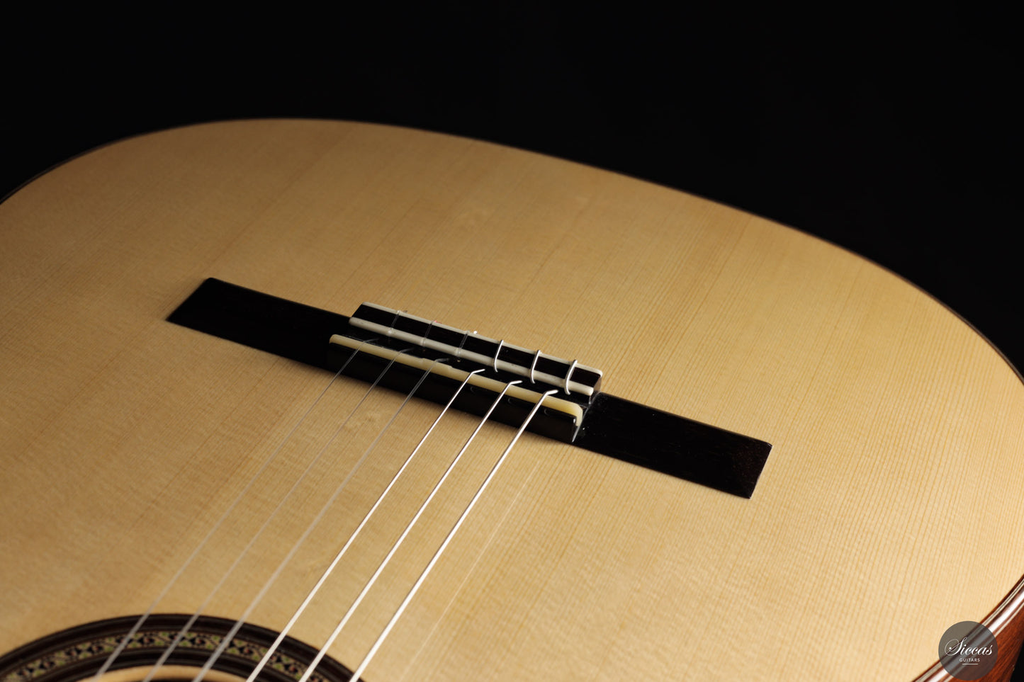 Dieses brandneue Konzertinstrument aus dem Jahr 2025 zeigt Kolya Panhuyzens konsequente Orientierung an einem modernen Konzertkonzept, das dennoch bewusst auf eine reine Holzkonstruktion setzt. Es handelt sich um eine Doubletop-Gitarre mit Fichtendecke und Boden und Zargen aus Madagaskar-Palisander. Auf zusätzliche Materialien wie Kohlefaser oder Nomex wird verzichtet, wodurch ein besonders natürlicher und organischer Klangcharakter entsteht.