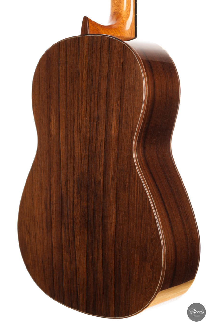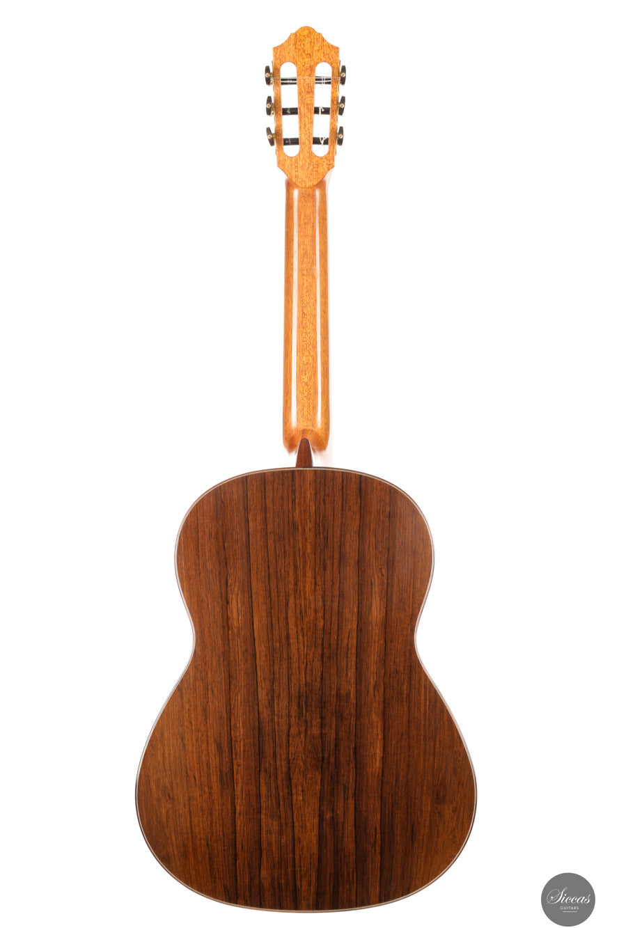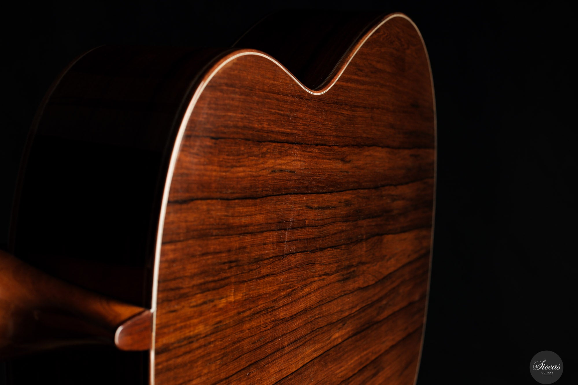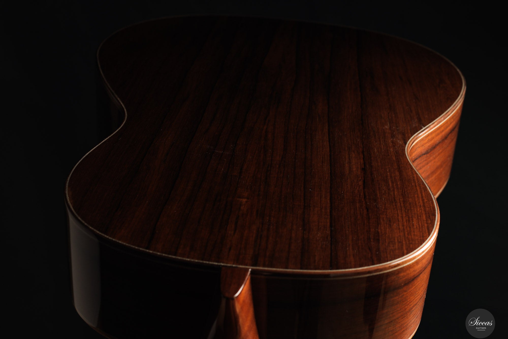 Dieses brandneue Konzertinstrument aus dem Jahr 2025 zeigt Kolya Panhuyzens konsequente Orientierung an einem modernen Konzertkonzept, das dennoch bewusst auf eine reine Holzkonstruktion setzt. Es handelt sich um eine Doubletop-Gitarre mit Fichtendecke und Boden und Zargen aus Madagaskar-Palisander. Auf zusätzliche Materialien wie Kohlefaser oder Nomex wird verzichtet, wodurch ein besonders natürlicher und organischer Klangcharakter entsteht.
