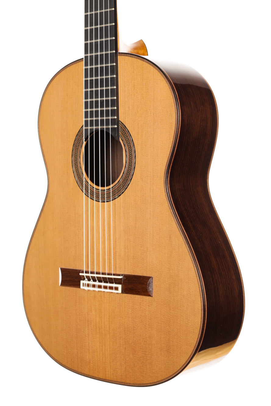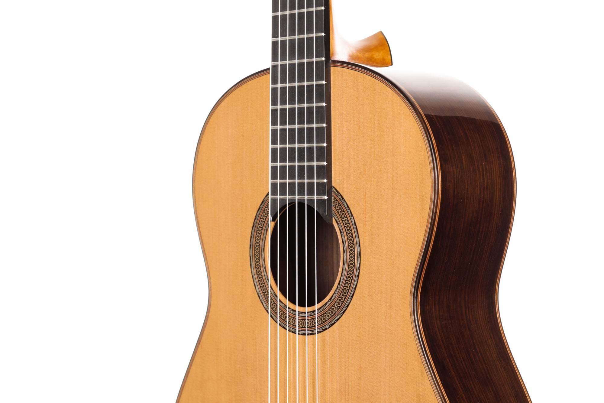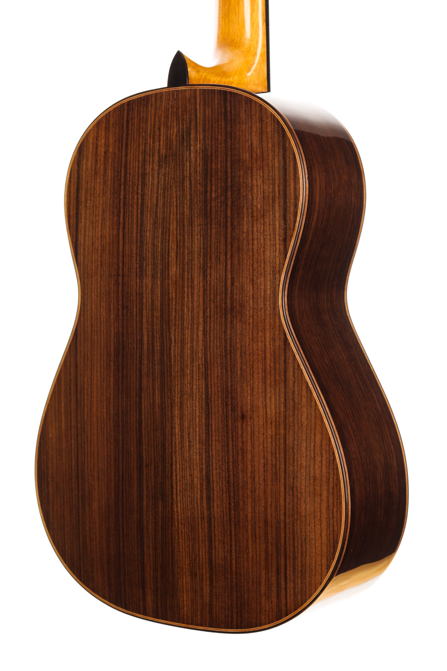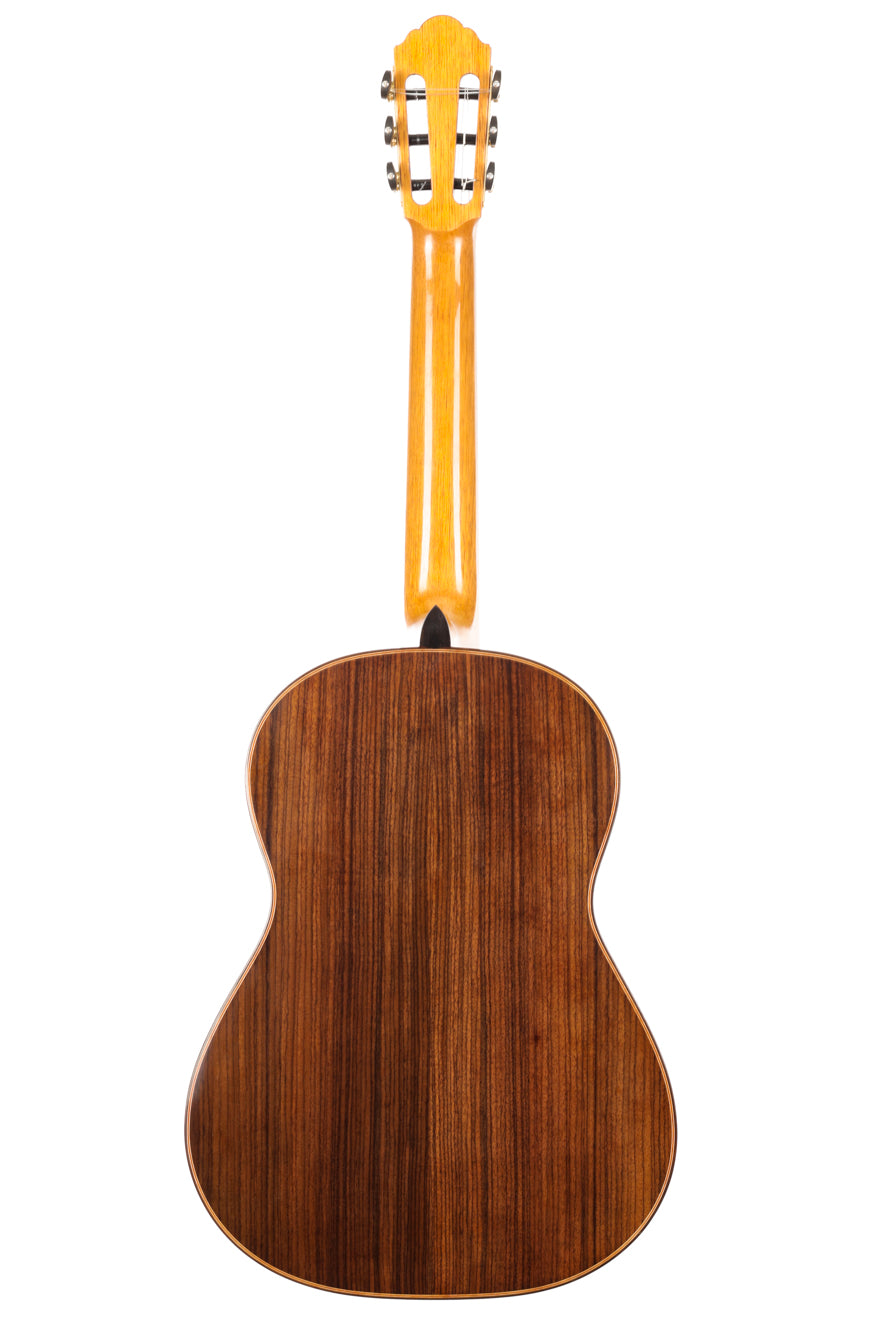 Dieses Konzertmodell aus dem Jahr 2025 kombiniert eine Zederndecke mit einer Lattice-Konstruktion und Boden sowie Zargen aus indischem Palisander. Bei dieser Version wird die Zederndecke mit Fichtenverbalkung ergänzt, was eine schnelle und sensible Ansprache ermöglicht und gleichzeitig Wärme und Tiefe erhält. Mit einer Eigenresonanz zwischen E und F und einem Gewicht von 1410 Gramm überzeugt das Instrument durch lebendigen Tonansatz, klare Tragfähigkeit und hervorragende Projektion. Die kürzere Mensur von 640 mm und eine Sattelbreite von 52 mm sorgen für ein komfortables Spielgefühl und erleichtern das Greifen in weiten Lagen. Ausgestattet mit Mechaniken von Kris Barnett und einer Schellackpolitur bietet die Gitarre eine elegante Optik und traditionelle Anmutung. Klanglich begeistert sie mit klar definierten Bässen, die in perfekter Harmonie mit den süßen, mühelos singenden Diskantseiten stehen, und entfaltet so eine ausgewogene und inspirierende Konzertstimme.Regelmäßige Pflege verlängert die Lebensdauer des Instruments