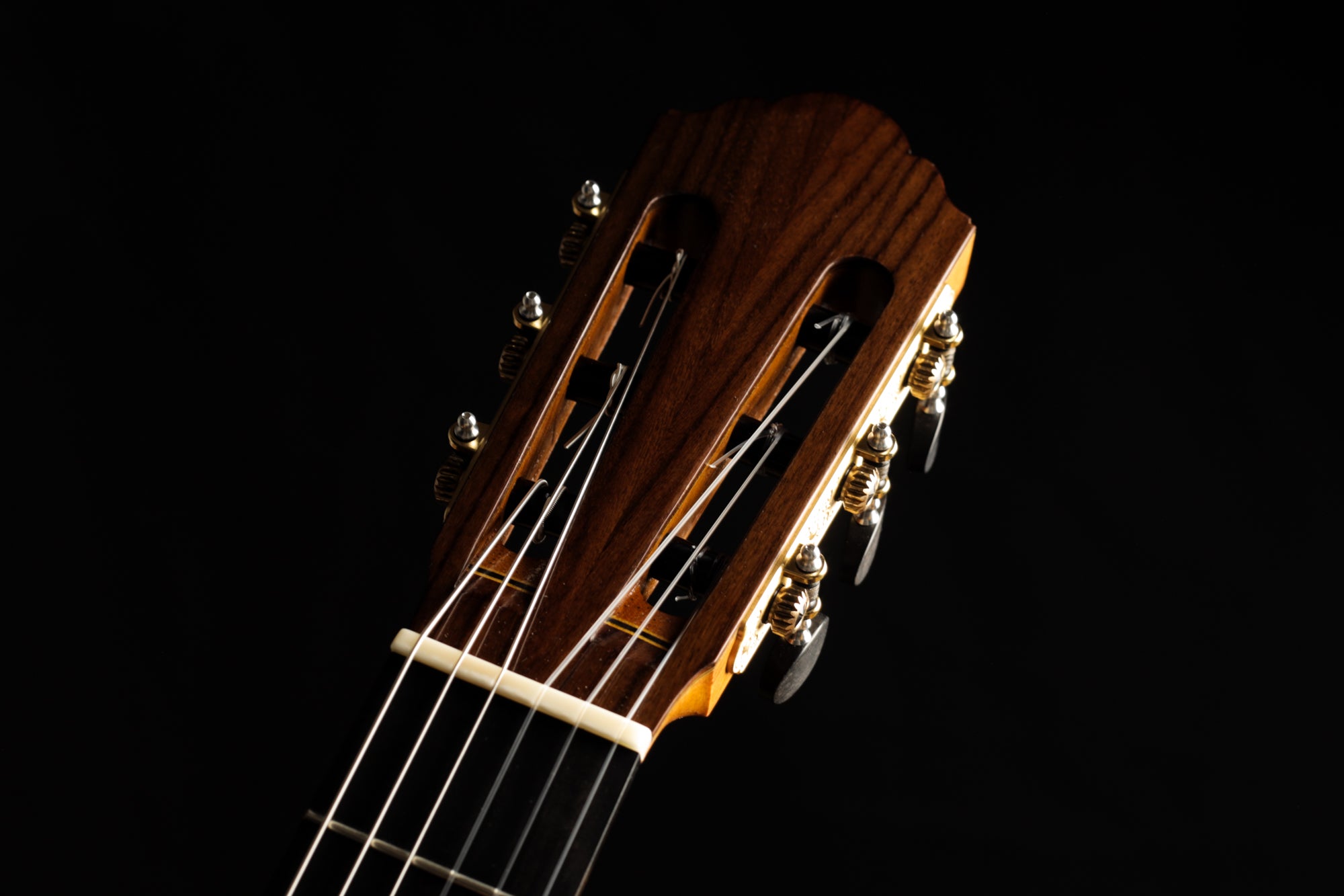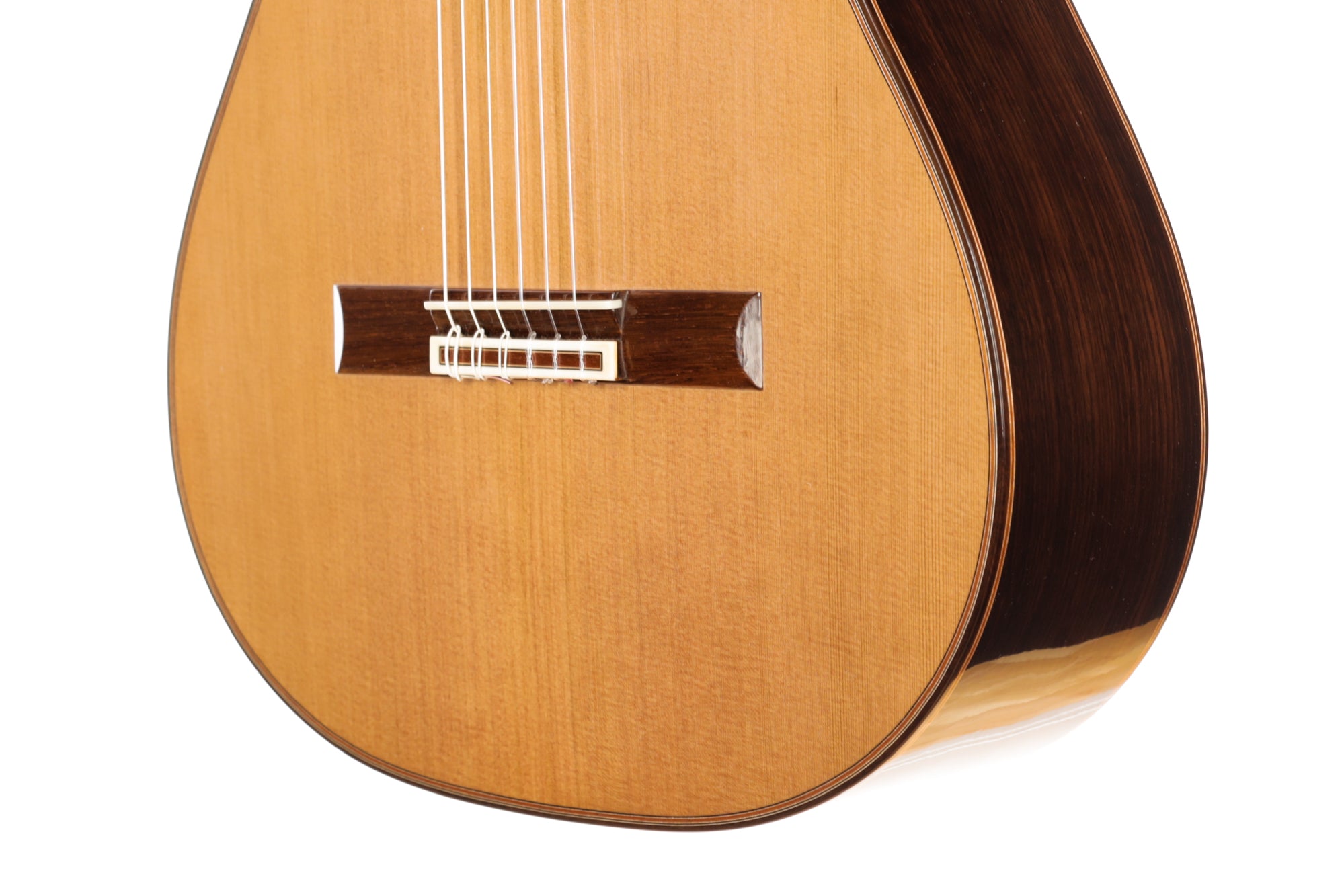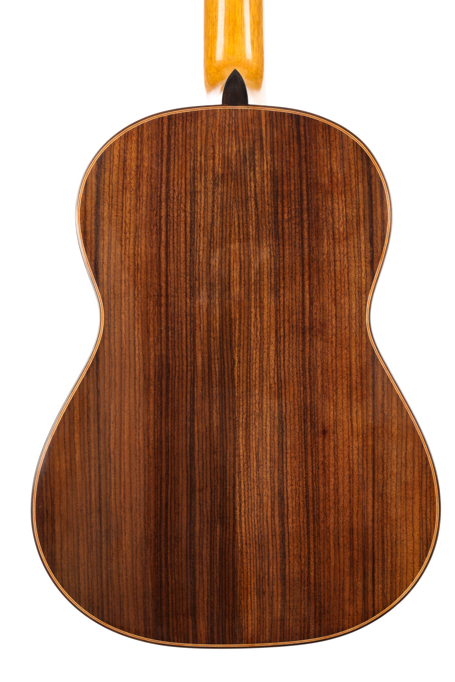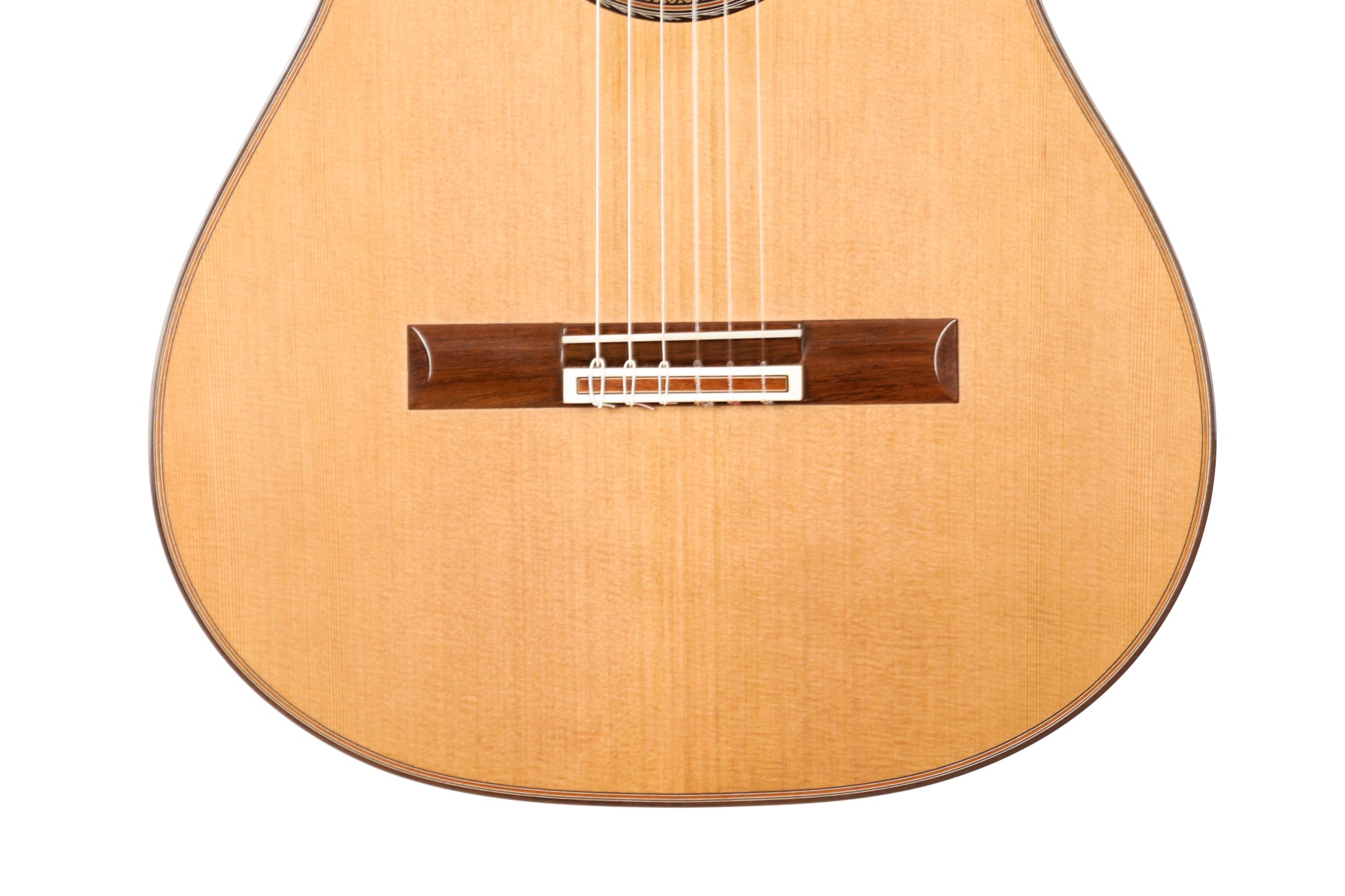 Dieses Konzertmodell aus dem Jahr 2025 kombiniert eine Zederndecke mit einer Lattice-Konstruktion und Boden sowie Zargen aus indischem Palisander. Bei dieser Version wird die Zederndecke mit Fichtenverbalkung ergänzt, was eine schnelle und sensible Ansprache ermöglicht und gleichzeitig Wärme und Tiefe erhält. Mit einer Eigenresonanz zwischen E und F und einem Gewicht von 1410 Gramm überzeugt das Instrument durch lebendigen Tonansatz, klare Tragfähigkeit und hervorragende Projektion. Die kürzere Mensur von 640 mm und eine Sattelbreite von 52 mm sorgen für ein komfortables Spielgefühl und erleichtern das Greifen in weiten Lagen. Ausgestattet mit Mechaniken von Kris Barnett und einer Schellackpolitur bietet die Gitarre eine elegante Optik und traditionelle Anmutung. Klanglich begeistert sie mit klar definierten Bässen, die in perfekter Harmonie mit den süßen, mühelos singenden Diskantseiten stehen, und entfaltet so eine ausgewogene und inspirierende Konzertstimme.Regelmäßige Pflege verlängert die Lebensdauer des Instruments