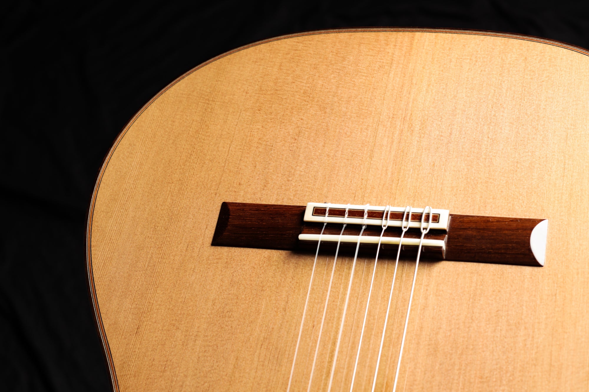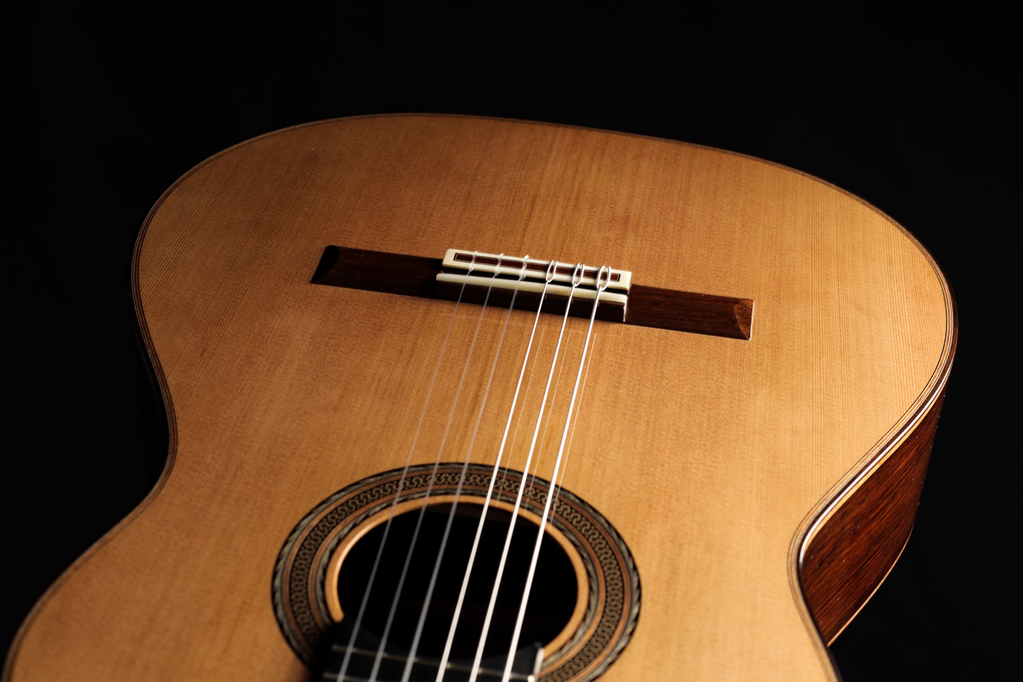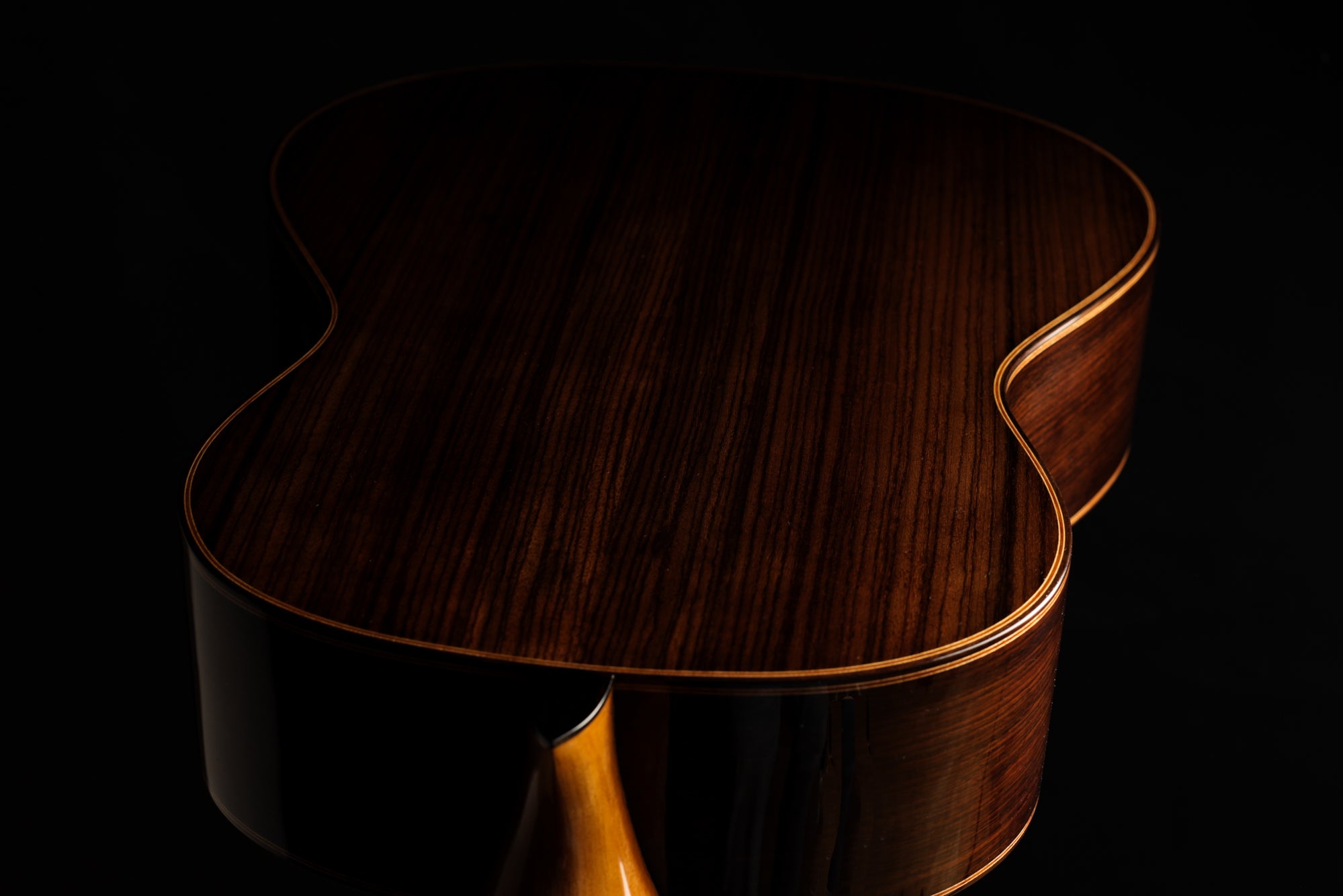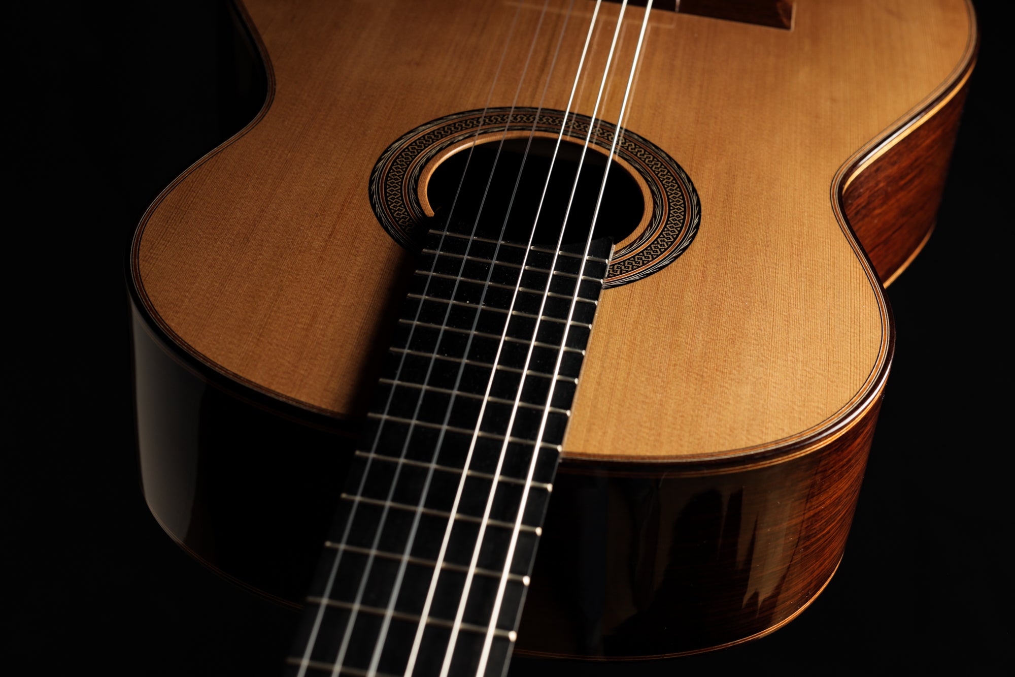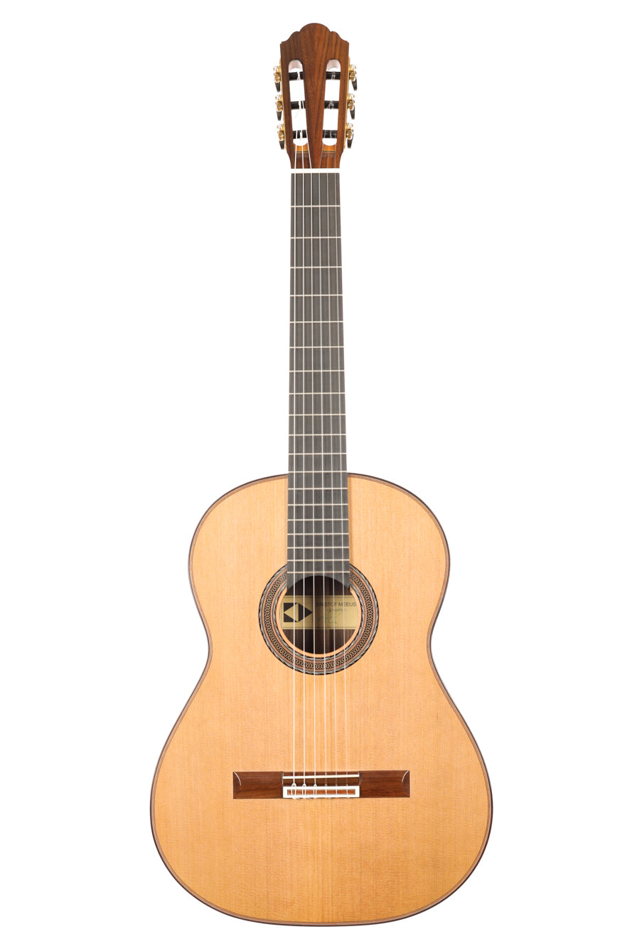 Dieses Konzertmodell aus dem Jahr 2025 kombiniert eine Zederndecke mit einer Lattice-Konstruktion und Boden sowie Zargen aus indischem Palisander. Bei dieser Version wird die Zederndecke mit Fichtenverbalkung ergänzt, was eine schnelle und sensible Ansprache ermöglicht und gleichzeitig Wärme und Tiefe erhält. Mit einer Eigenresonanz zwischen E und F und einem Gewicht von 1410 Gramm überzeugt das Instrument durch lebendigen Tonansatz, klare Tragfähigkeit und hervorragende Projektion. Die kürzere Mensur von 640 mm und eine Sattelbreite von 52 mm sorgen für ein komfortables Spielgefühl und erleichtern das Greifen in weiten Lagen. Ausgestattet mit Mechaniken von Kris Barnett und einer Schellackpolitur bietet die Gitarre eine elegante Optik und traditionelle Anmutung. Klanglich begeistert sie mit klar definierten Bässen, die in perfekter Harmonie mit den süßen, mühelos singenden Diskantseiten stehen, und entfaltet so eine ausgewogene und inspirierende Konzertstimme.Regelmäßige Pflege verlängert die Lebensdauer des Instruments