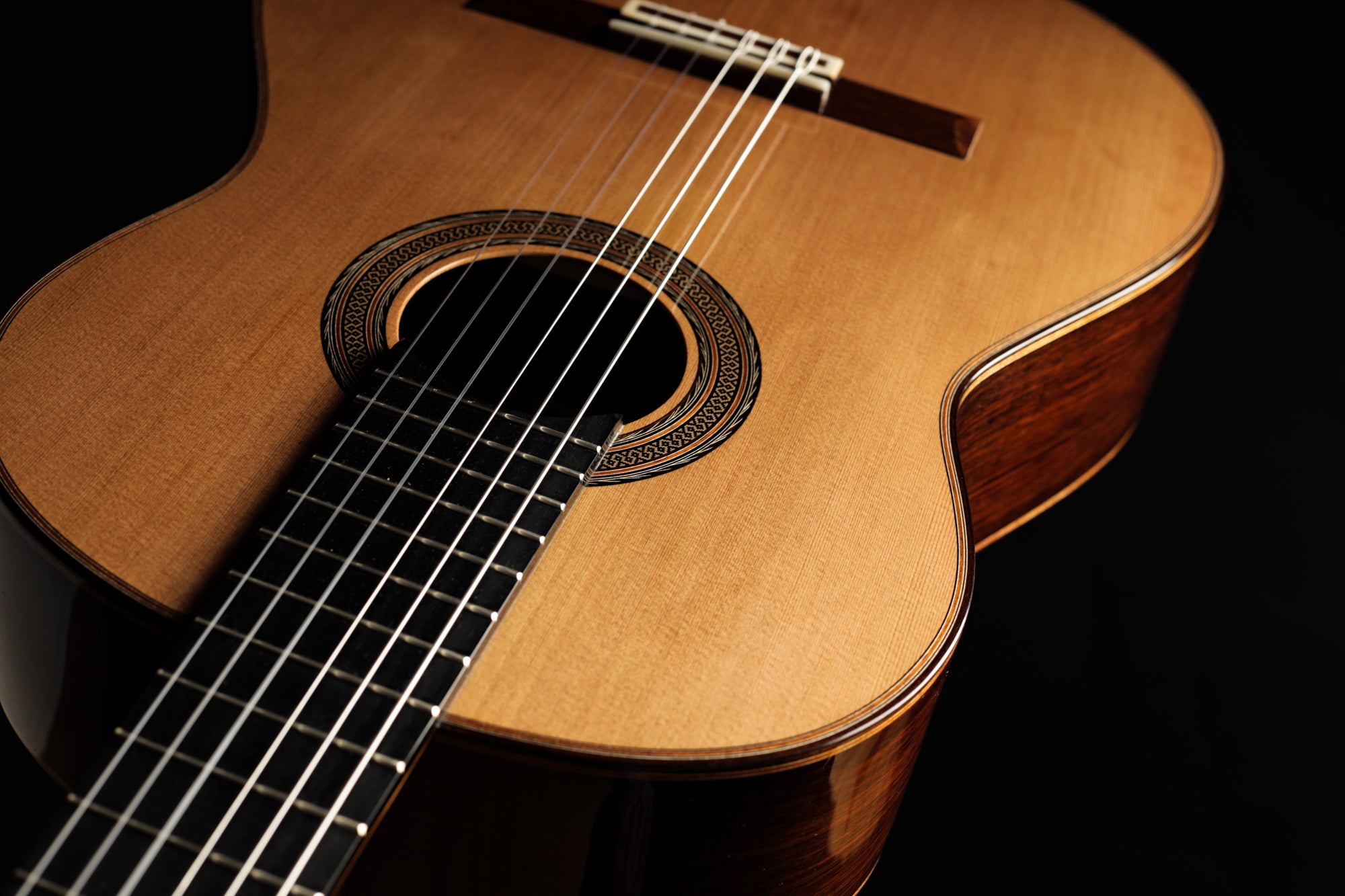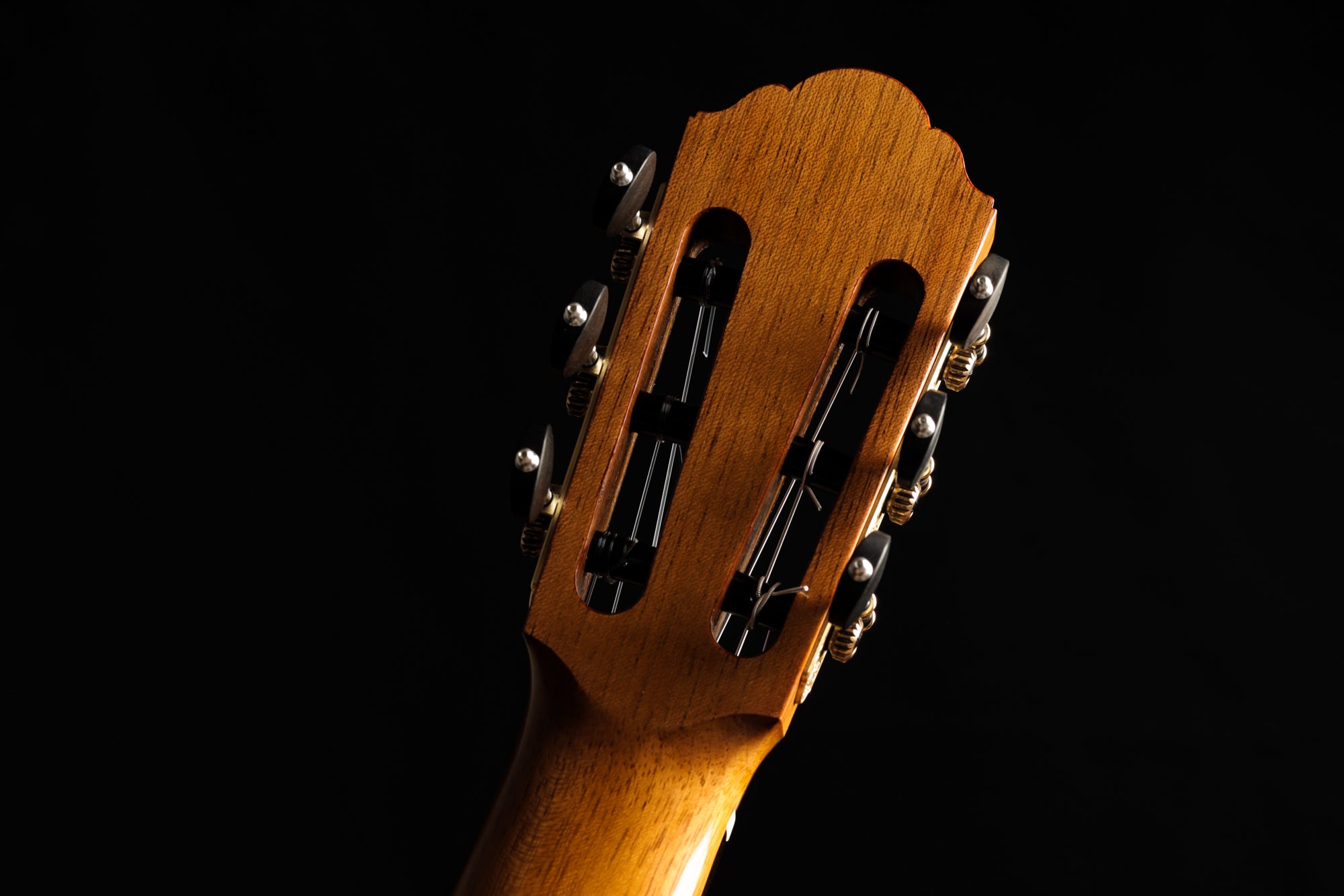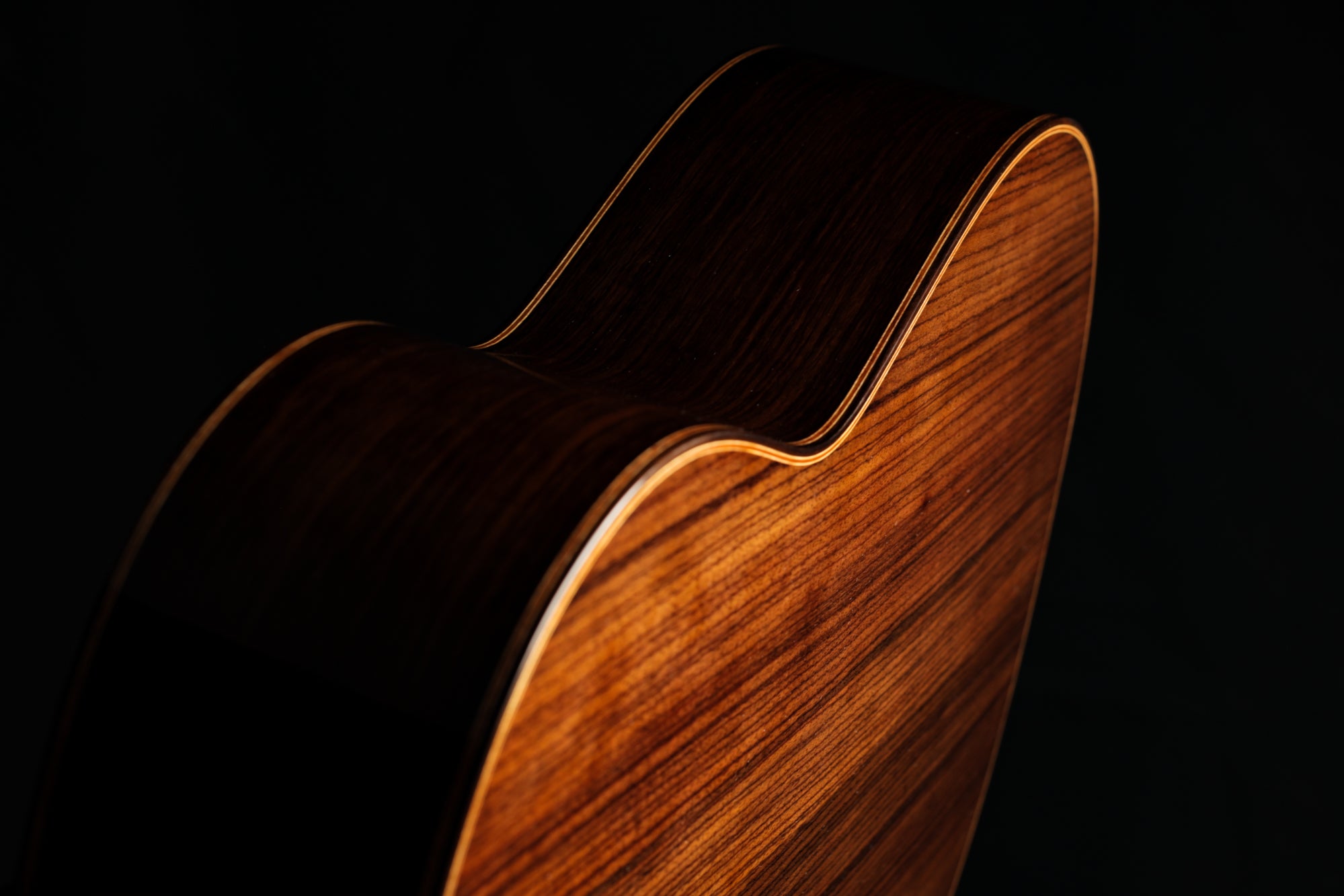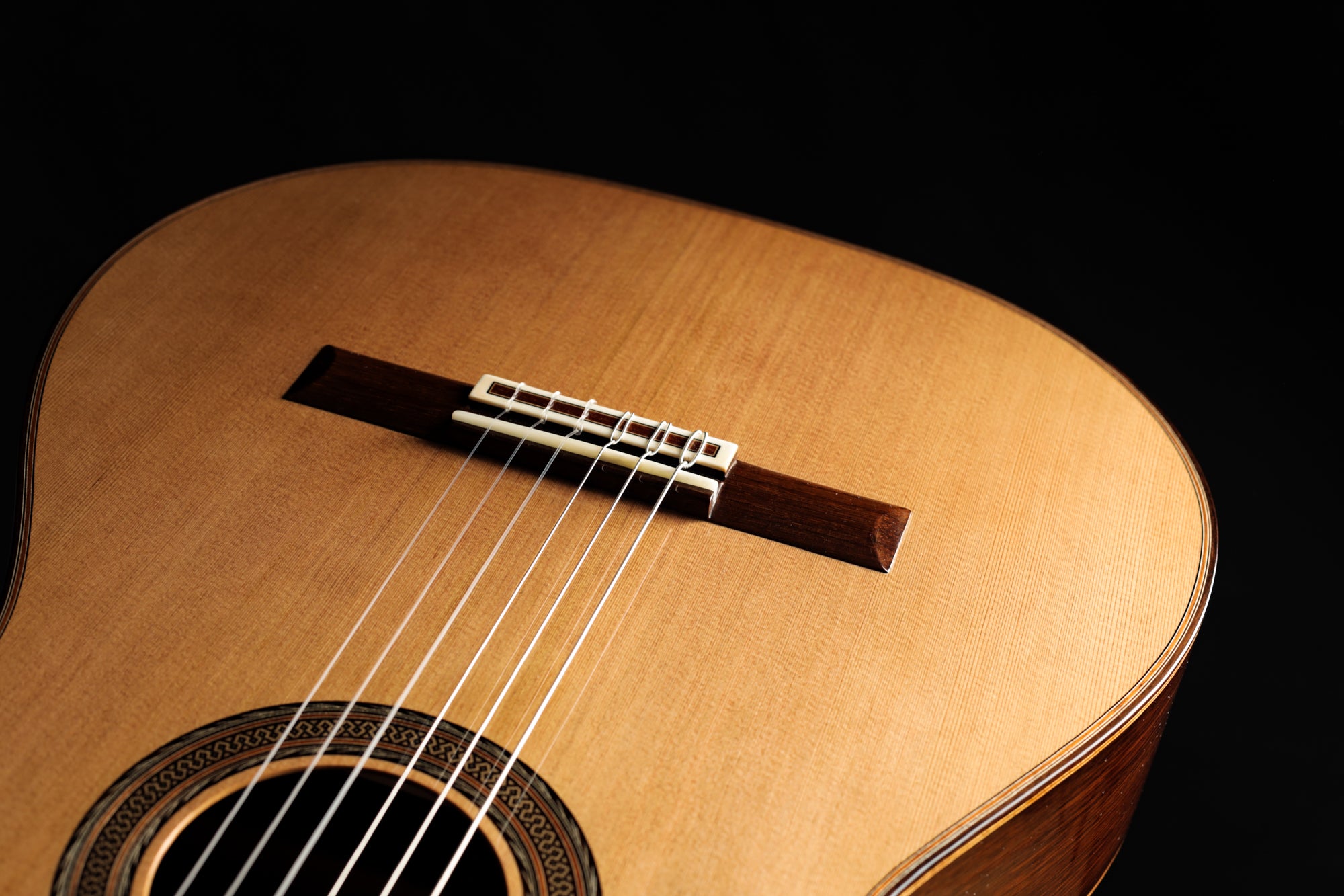 Dieses Konzertmodell aus dem Jahr 2025 kombiniert eine Zederndecke mit einer Lattice-Konstruktion und Boden sowie Zargen aus indischem Palisander. Bei dieser Version wird die Zederndecke mit Fichtenverbalkung ergänzt, was eine schnelle und sensible Ansprache ermöglicht und gleichzeitig Wärme und Tiefe erhält. Mit einer Eigenresonanz zwischen E und F und einem Gewicht von 1410 Gramm überzeugt das Instrument durch lebendigen Tonansatz, klare Tragfähigkeit und hervorragende Projektion. Die kürzere Mensur von 640 mm und eine Sattelbreite von 52 mm sorgen für ein komfortables Spielgefühl und erleichtern das Greifen in weiten Lagen. Ausgestattet mit Mechaniken von Kris Barnett und einer Schellackpolitur bietet die Gitarre eine elegante Optik und traditionelle Anmutung. Klanglich begeistert sie mit klar definierten Bässen, die in perfekter Harmonie mit den süßen, mühelos singenden Diskantseiten stehen, und entfaltet so eine ausgewogene und inspirierende Konzertstimme.Regelmäßige Pflege verlängert die Lebensdauer des Instruments