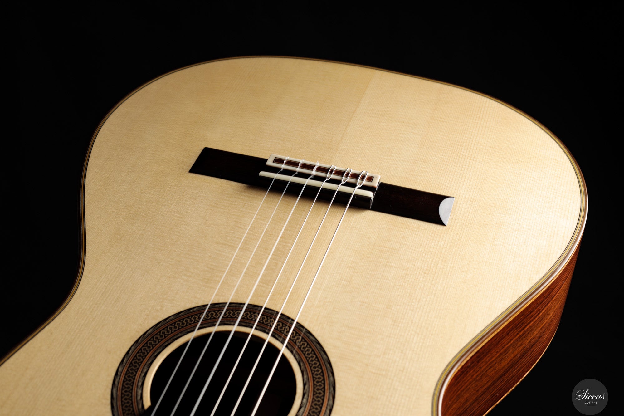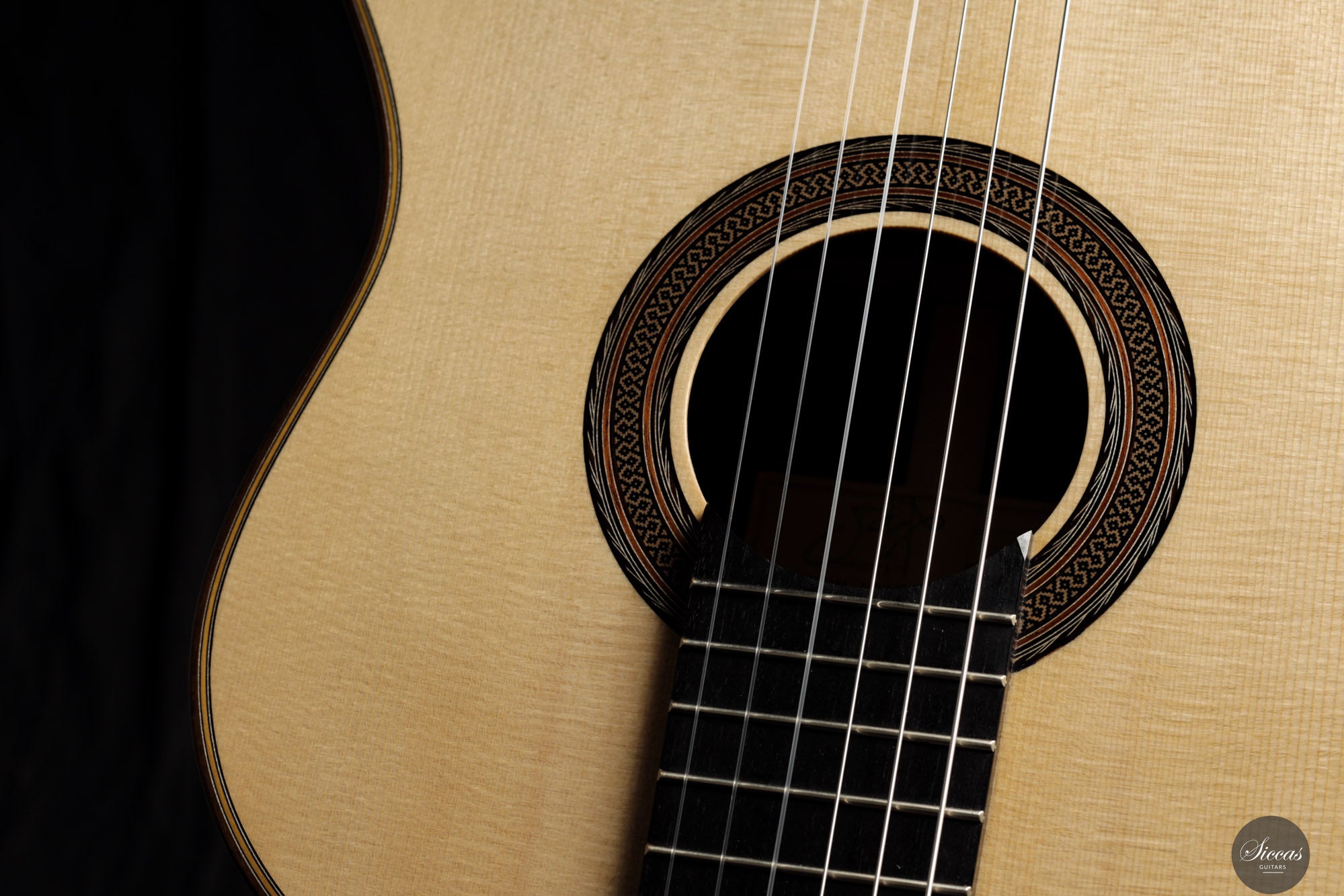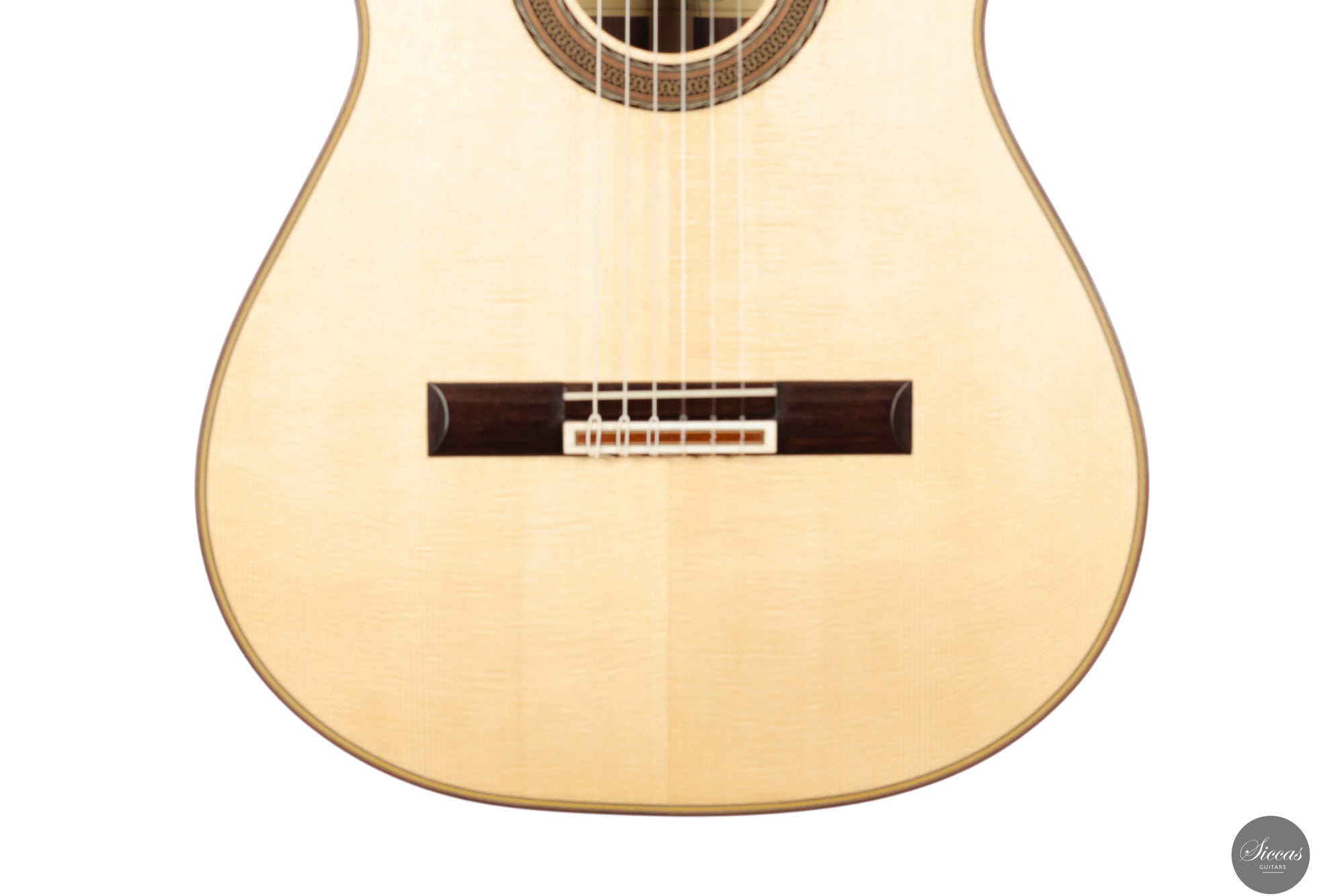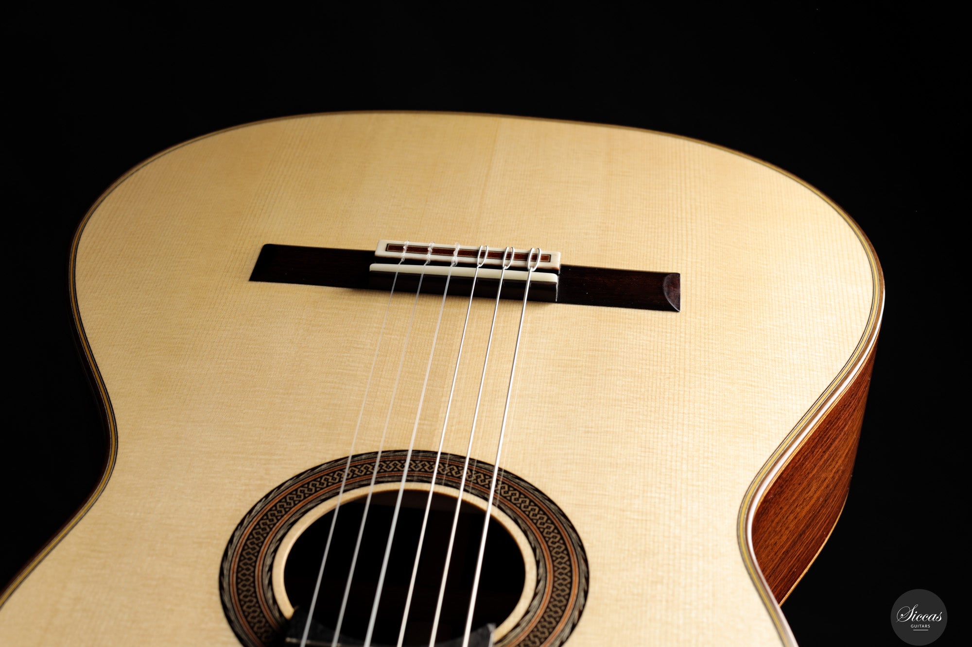 Diese 2025 entstandene Gitarre von Kristof Meeus verkörpert ein gereiftes, selbstbewusstes Verständnis traditioneller Bauweise. Mit einer Decke aus Fichte und Boden und Zargen aus indischem Palisander entwickelt sie einen offenen, präzise kontrollierten Klang. Besonders hervorzuheben ist das ausgewogene Zusammenspiel der Register: Der Bass entfaltet sich kraftvoll und tief, ohne die Präsenz der klaren, tragfähigen Diskantlage zu beeinträchtigen. Beide Register entwickeln sich frei und kompromisslos. Selbst bei sehr leiser Dynamik bleibt das Klangbild vollständig – mit Substanz und Farbigkeit im Pianissimo. Bei zunehmender Lautstärke reagiert das Instrument stabil und gleichmäßig, ohne einzelne Register zu überbetonen. So entsteht ein Klangbild, das ausdrucksstarkes Phrasieren und fein nuanciertes Spiel in allen Lagen unterstützt.