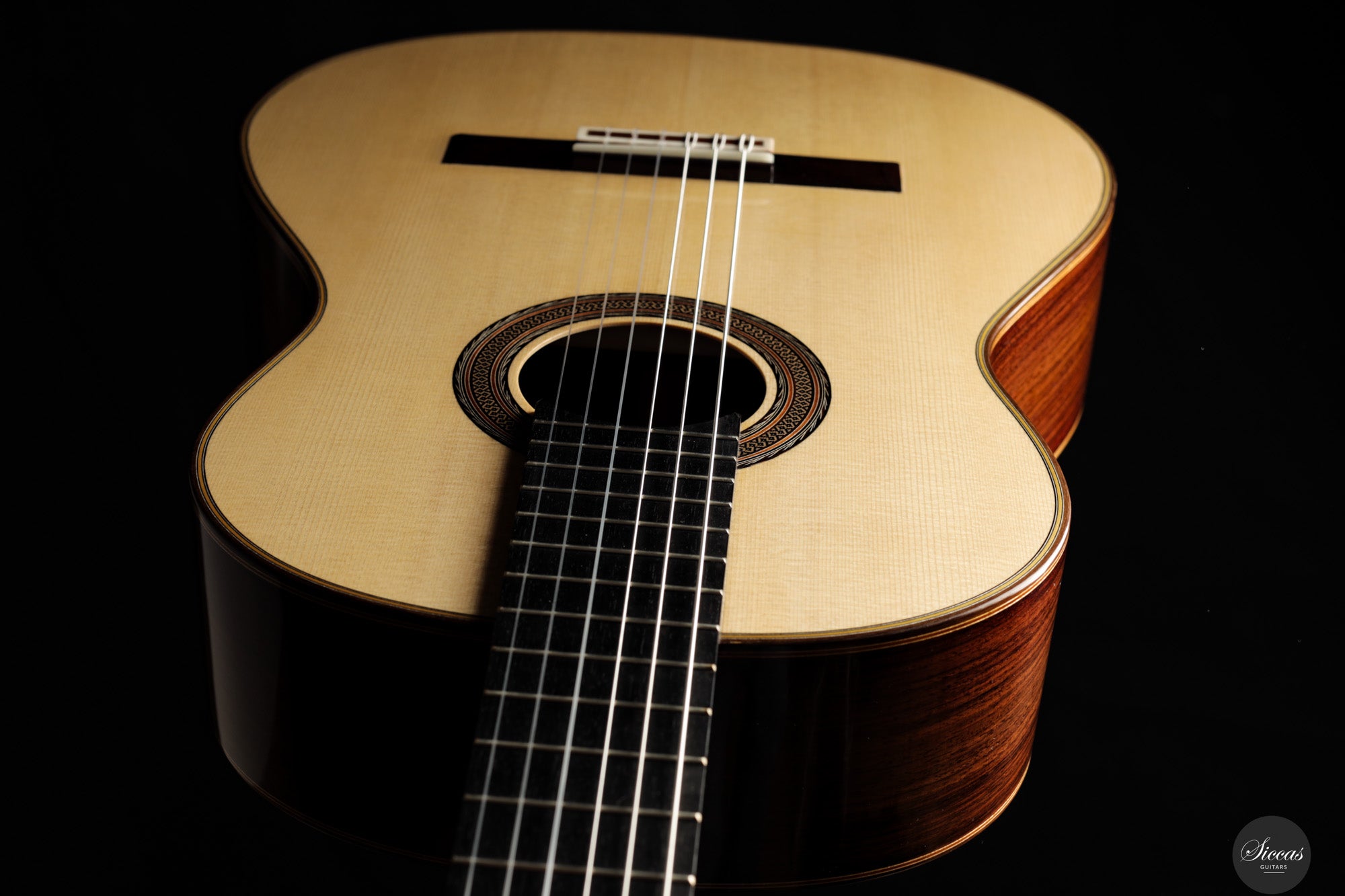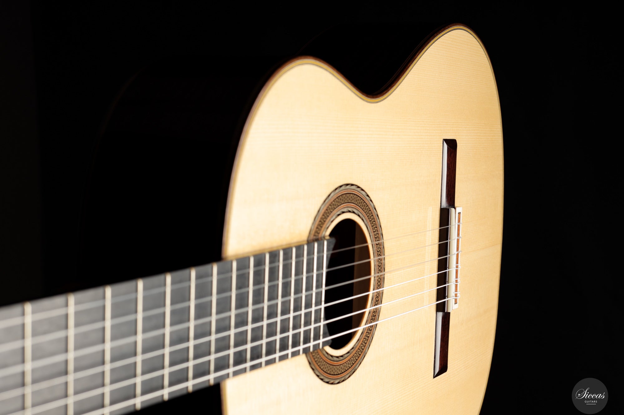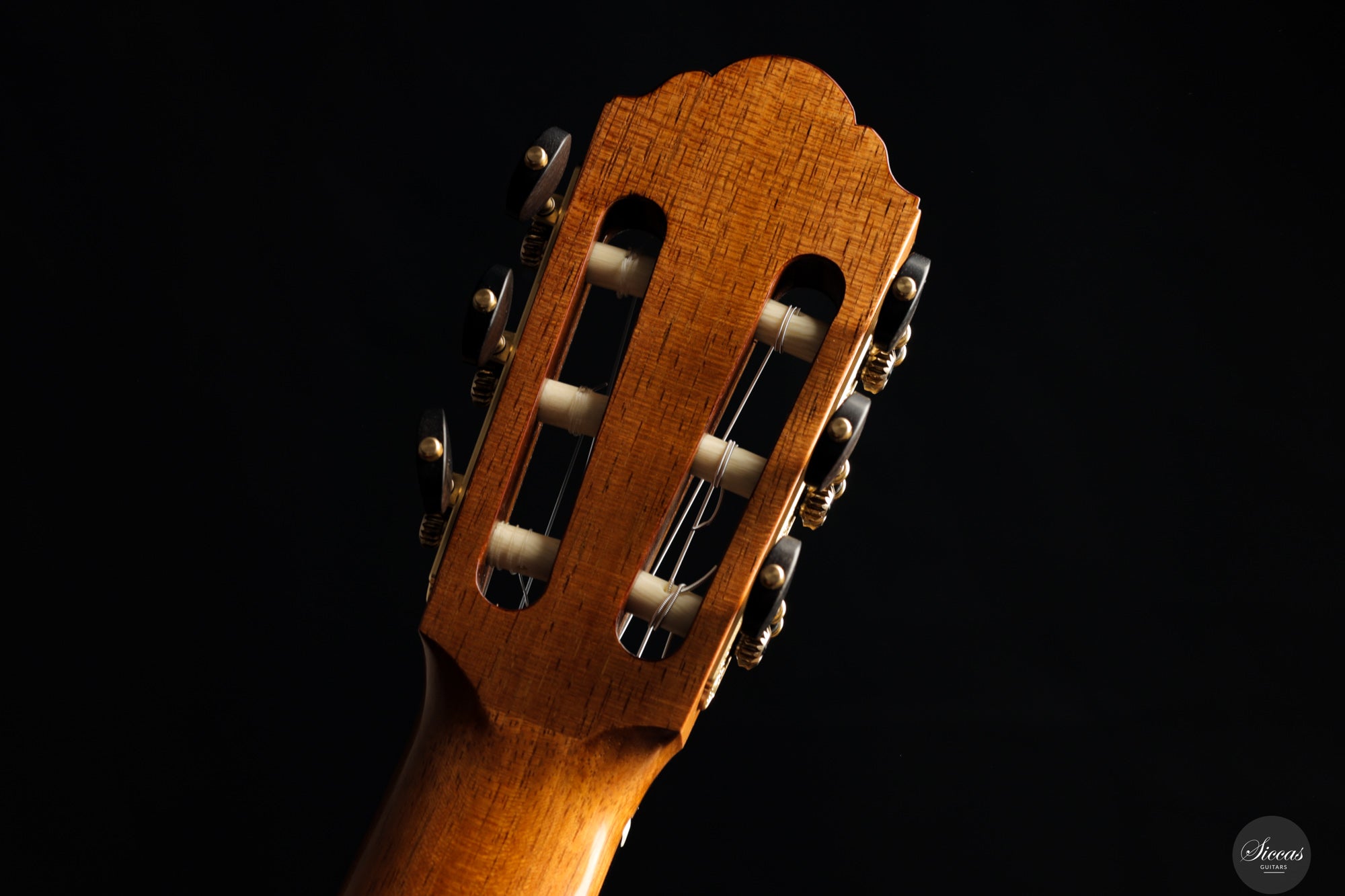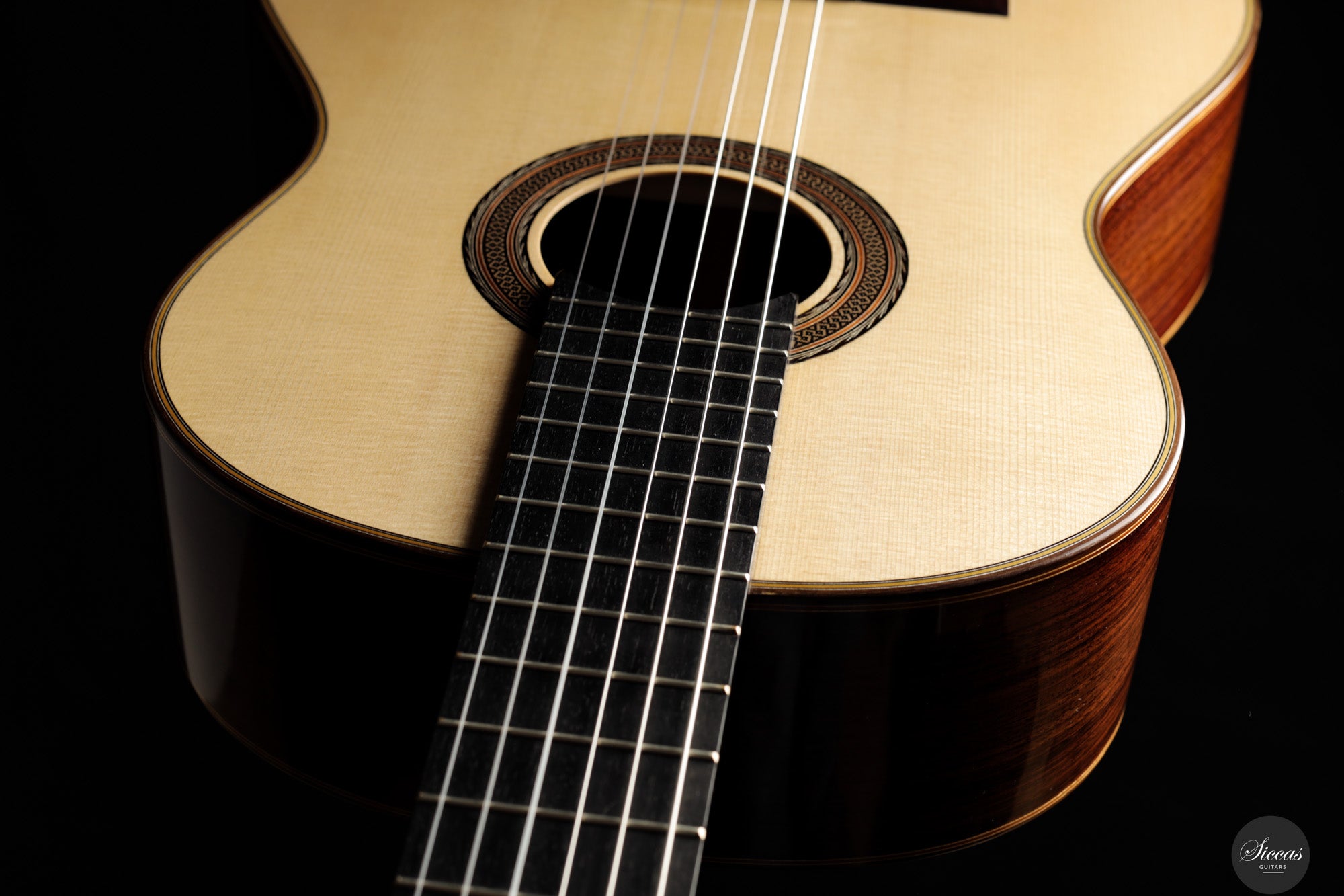 Diese 2025 entstandene Gitarre von Kristof Meeus verkörpert ein gereiftes, selbstbewusstes Verständnis traditioneller Bauweise. Mit einer Decke aus Fichte und Boden und Zargen aus indischem Palisander entwickelt sie einen offenen, präzise kontrollierten Klang. Besonders hervorzuheben ist das ausgewogene Zusammenspiel der Register: Der Bass entfaltet sich kraftvoll und tief, ohne die Präsenz der klaren, tragfähigen Diskantlage zu beeinträchtigen. Beide Register entwickeln sich frei und kompromisslos. Selbst bei sehr leiser Dynamik bleibt das Klangbild vollständig – mit Substanz und Farbigkeit im Pianissimo. Bei zunehmender Lautstärke reagiert das Instrument stabil und gleichmäßig, ohne einzelne Register zu überbetonen. So entsteht ein Klangbild, das ausdrucksstarkes Phrasieren und fein nuanciertes Spiel in allen Lagen unterstützt.