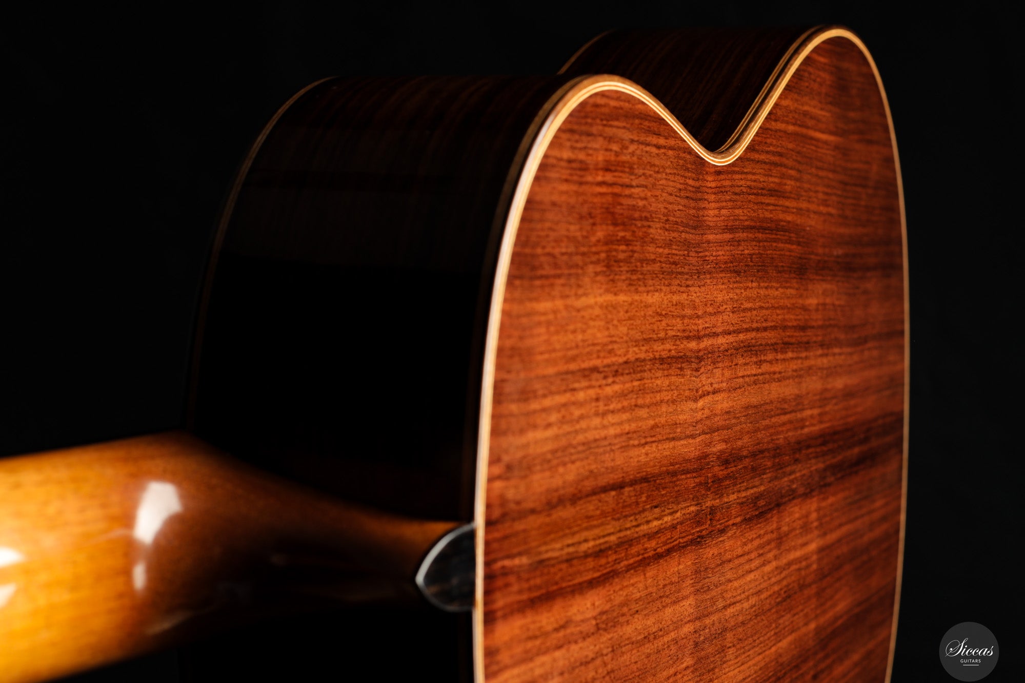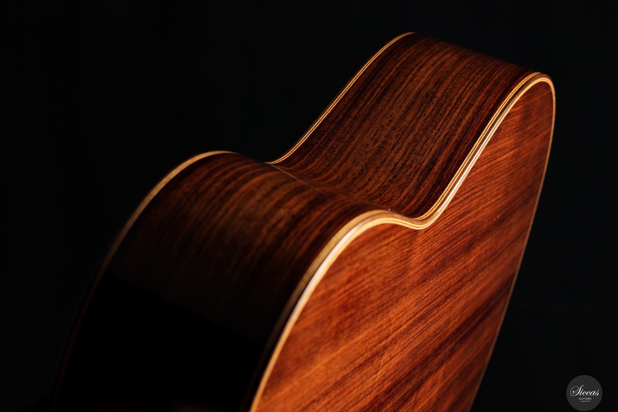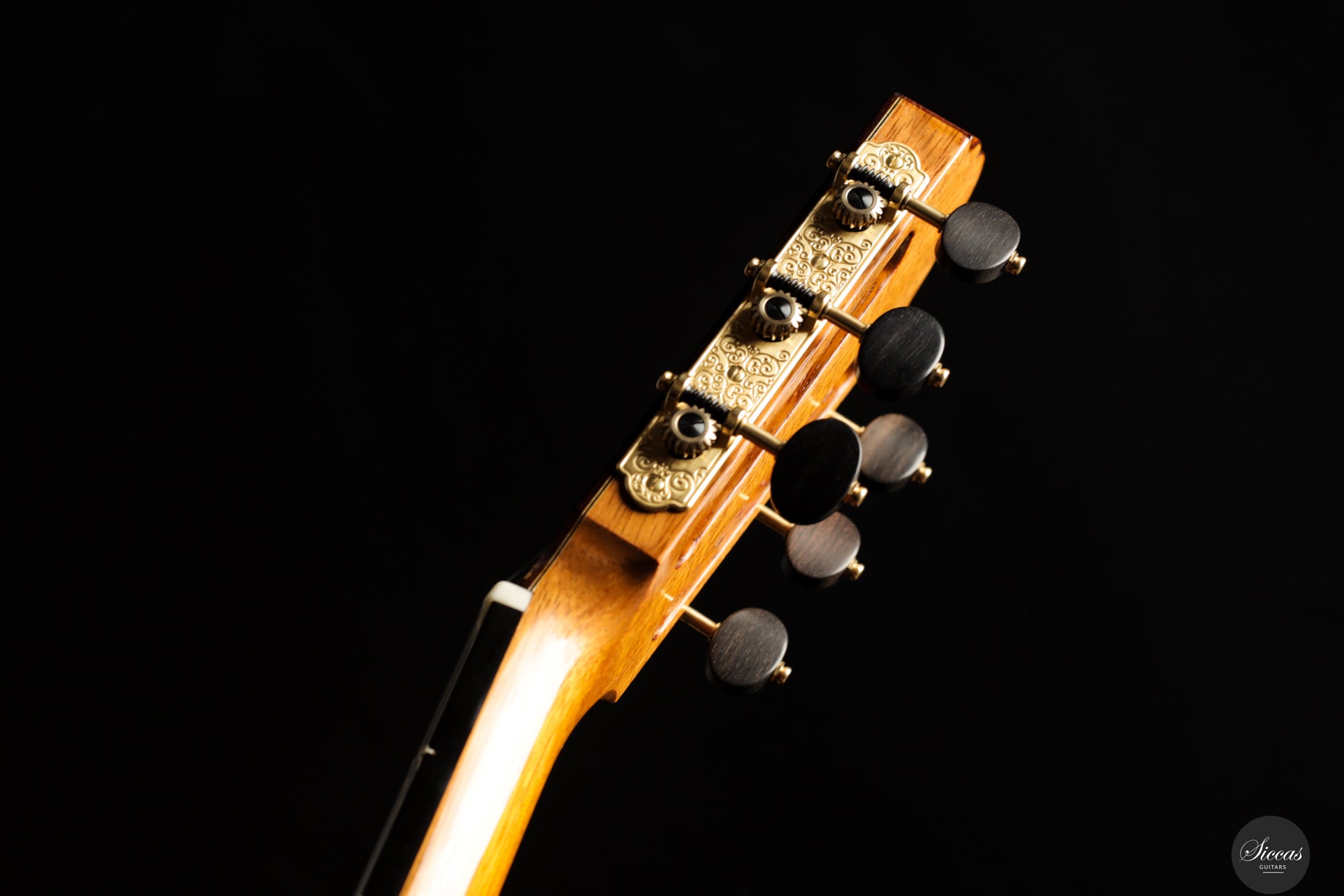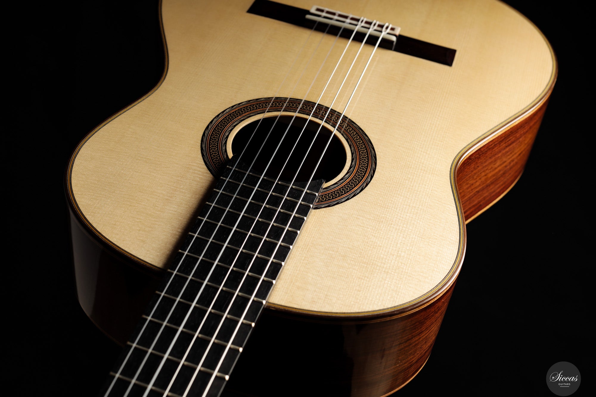 Diese 2025 entstandene Gitarre von Kristof Meeus verkörpert ein gereiftes, selbstbewusstes Verständnis traditioneller Bauweise. Mit einer Decke aus Fichte und Boden und Zargen aus indischem Palisander entwickelt sie einen offenen, präzise kontrollierten Klang. Besonders hervorzuheben ist das ausgewogene Zusammenspiel der Register: Der Bass entfaltet sich kraftvoll und tief, ohne die Präsenz der klaren, tragfähigen Diskantlage zu beeinträchtigen. Beide Register entwickeln sich frei und kompromisslos. Selbst bei sehr leiser Dynamik bleibt das Klangbild vollständig – mit Substanz und Farbigkeit im Pianissimo. Bei zunehmender Lautstärke reagiert das Instrument stabil und gleichmäßig, ohne einzelne Register zu überbetonen. So entsteht ein Klangbild, das ausdrucksstarkes Phrasieren und fein nuanciertes Spiel in allen Lagen unterstützt.
