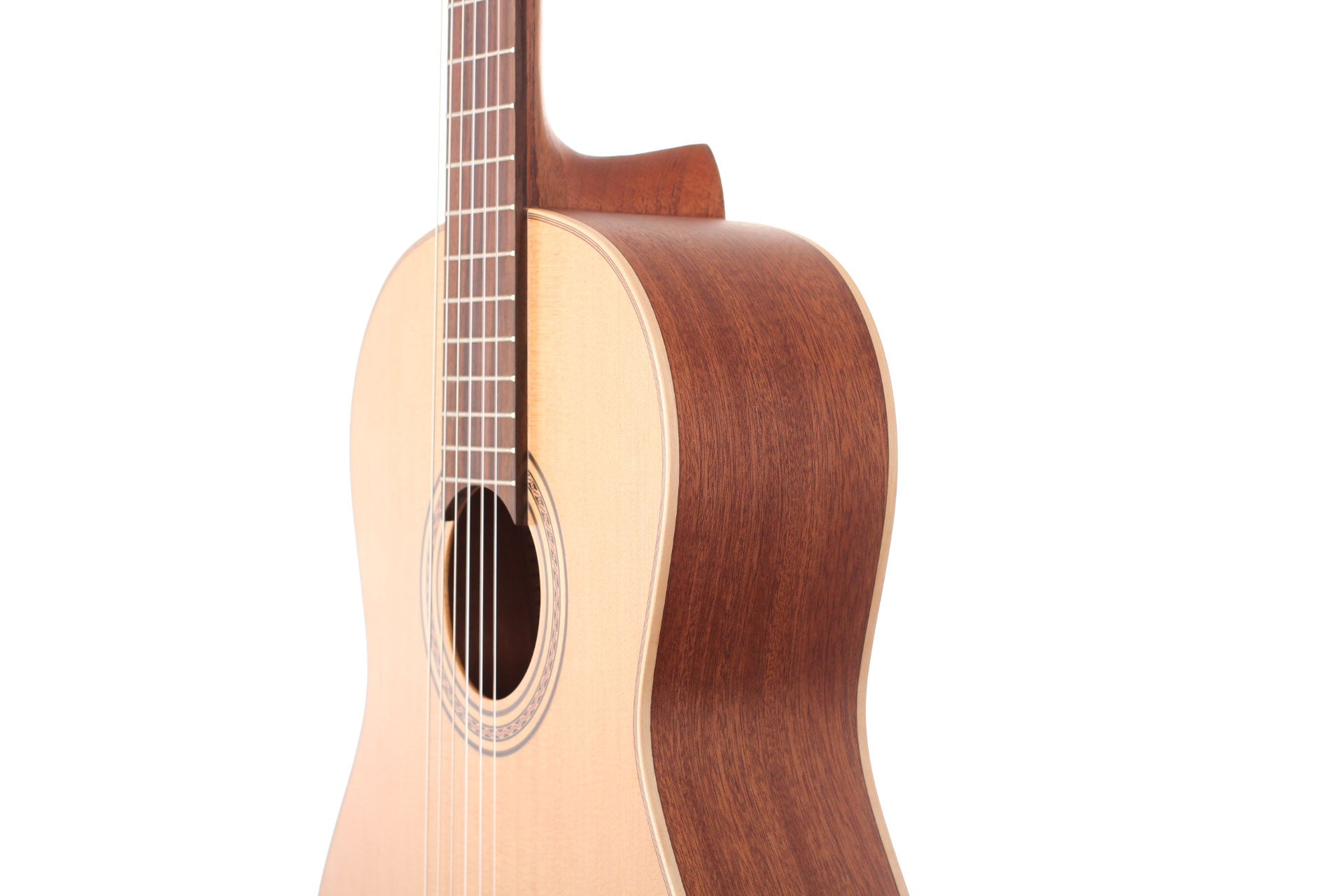 The Rubi CM model is in our opinion one of the best starter models. The sound is clear and brilliant and at the same time very powerful. The workmanship is great and contributes to a long life of this guitar. The top is made of solid cedar, back and sides are made of mahogany.