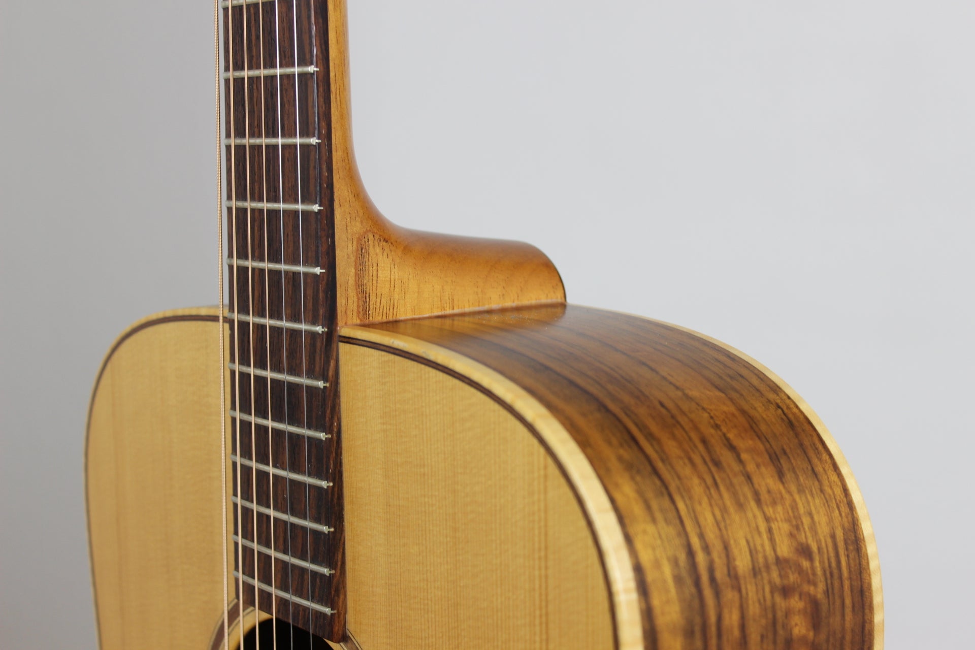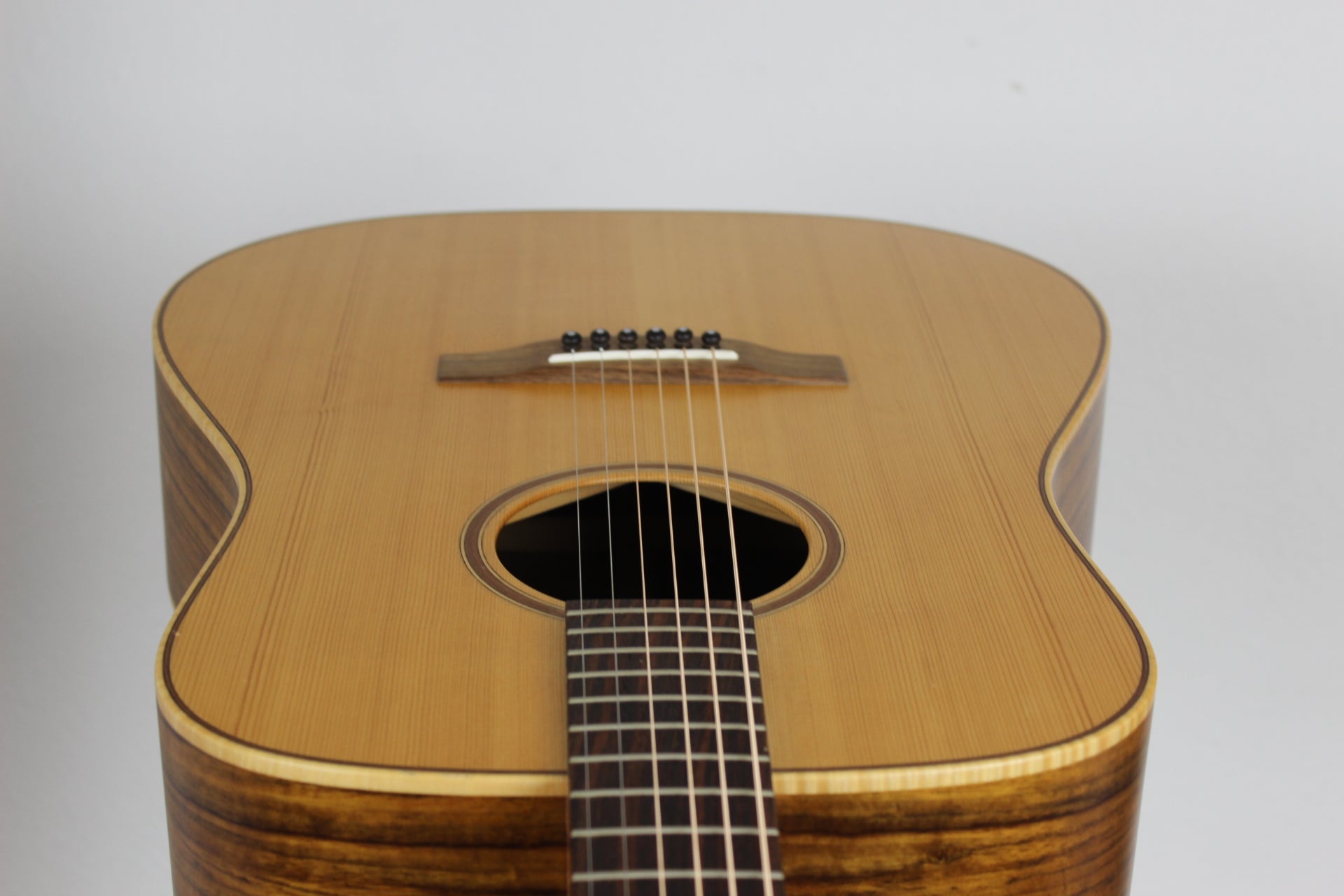 Lakewood Guitars besteht seit 1986 und hat sich seitdem zu einem namenhaften Hersteller von Steelstring-Gitarren etabliert. Die Instrumente des in Gießen ansässigen Unternehmens werden ausschließlich in Deuschland gebaut und stehen für höchsten Anspruch und Qualität. So zählen Lakewood Gitarren zu den besten in Deutschland produzierten Westerngitarren, die weltweit exportiert und von bekannten Gitarristen wie Ritchie Blackmore und Dave Matthews gespielt werden. Dieses Dreadnought-Modell ist aus dem Jahr 1991 und in einem hervorragenden Zustand. Das Deckenholz besteht aus AAA Fichte und Boden und Zargen aus Ovangkol. Der Mahagonihals mit der runden D-Form liegt sehr angenehm in der Hand. Die Gitarre hat einen klaren, hellen Klang und durch ihre Dreadnought-Form auch die nötige Tiefe und satte Bässe.