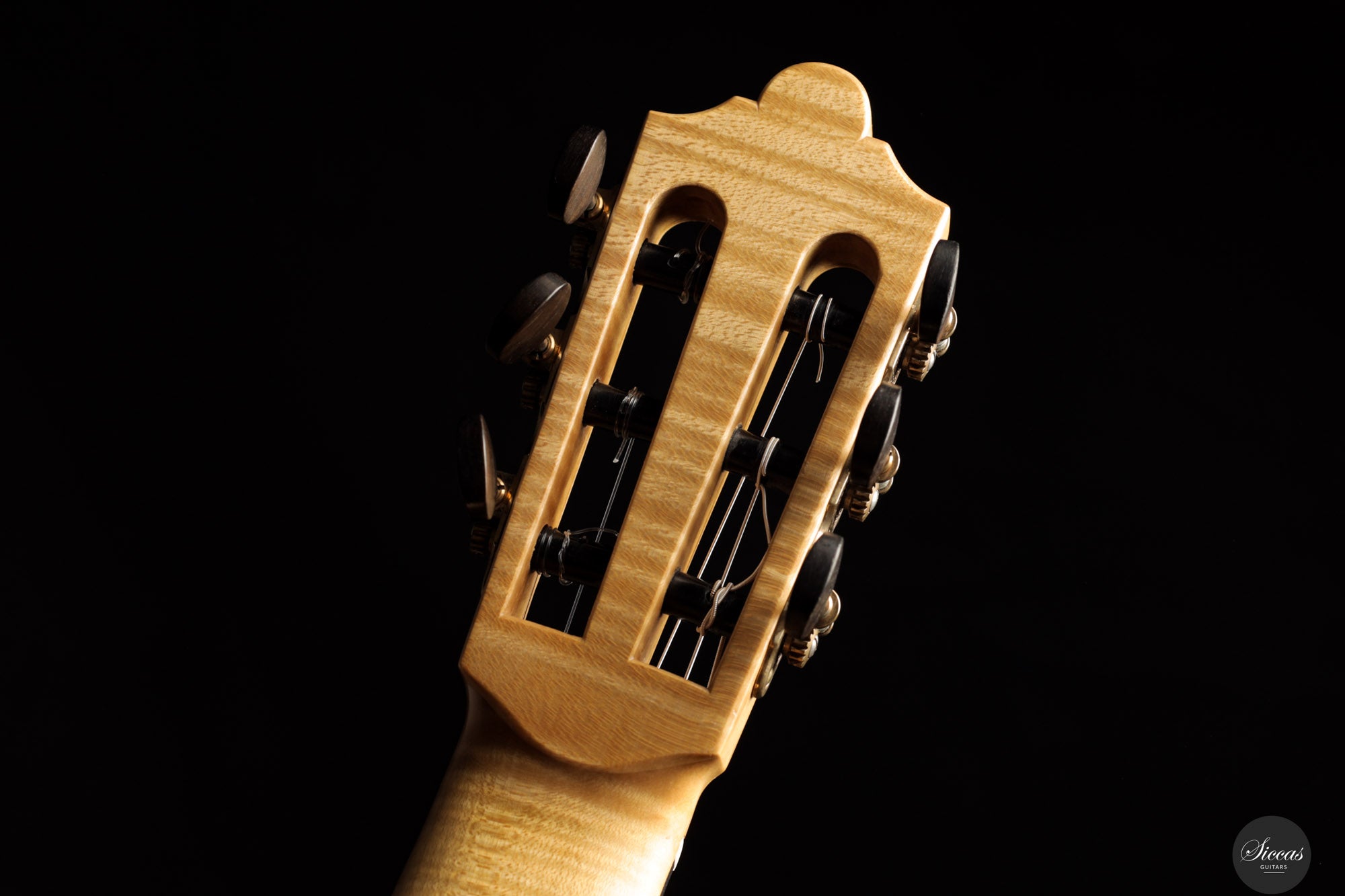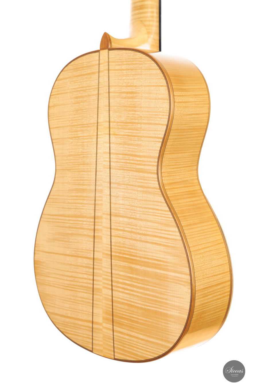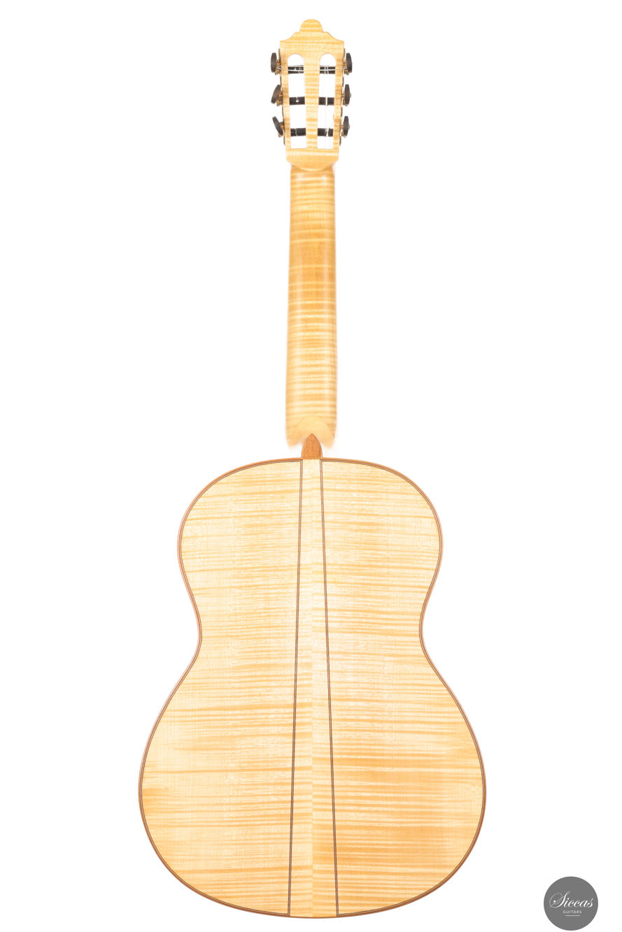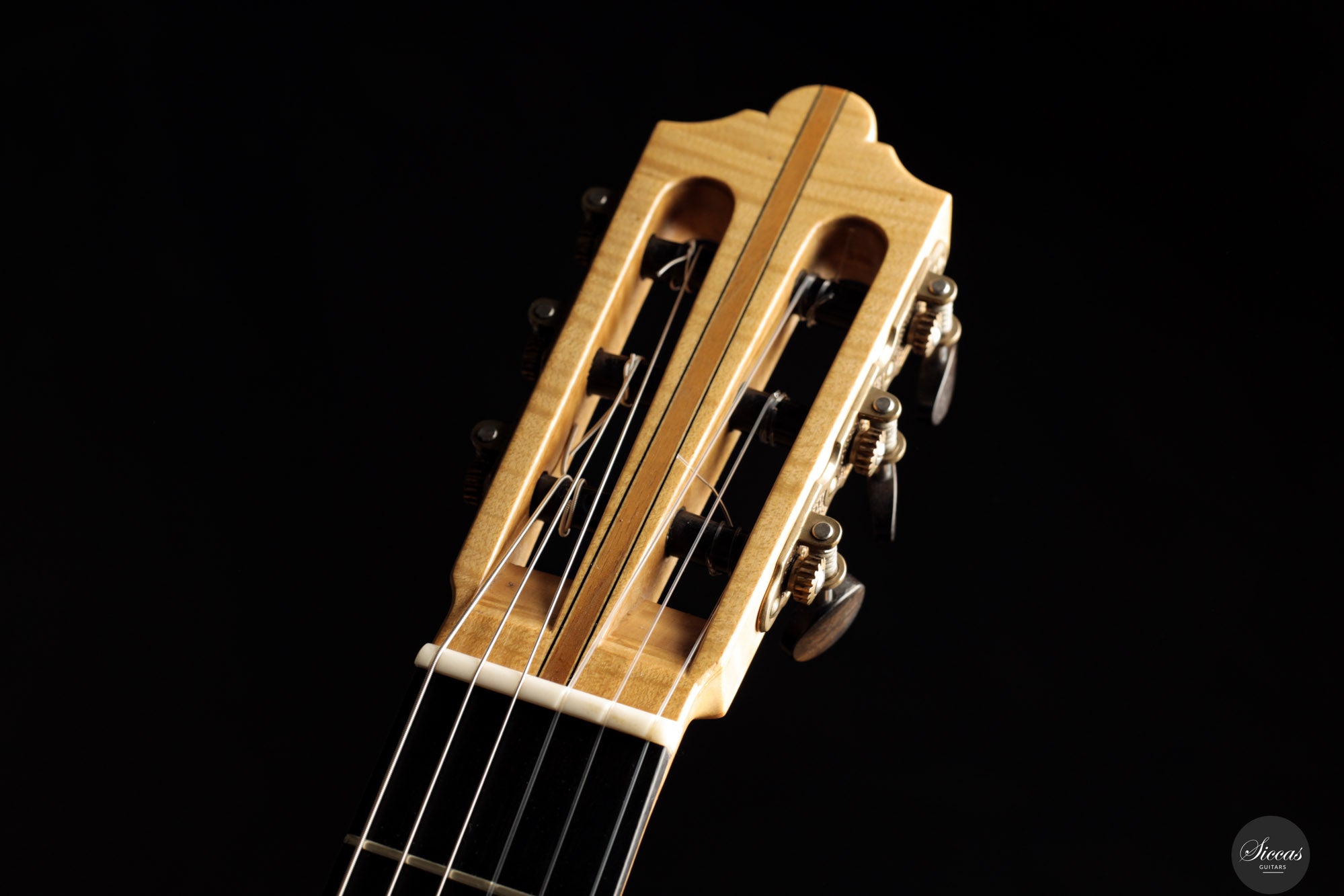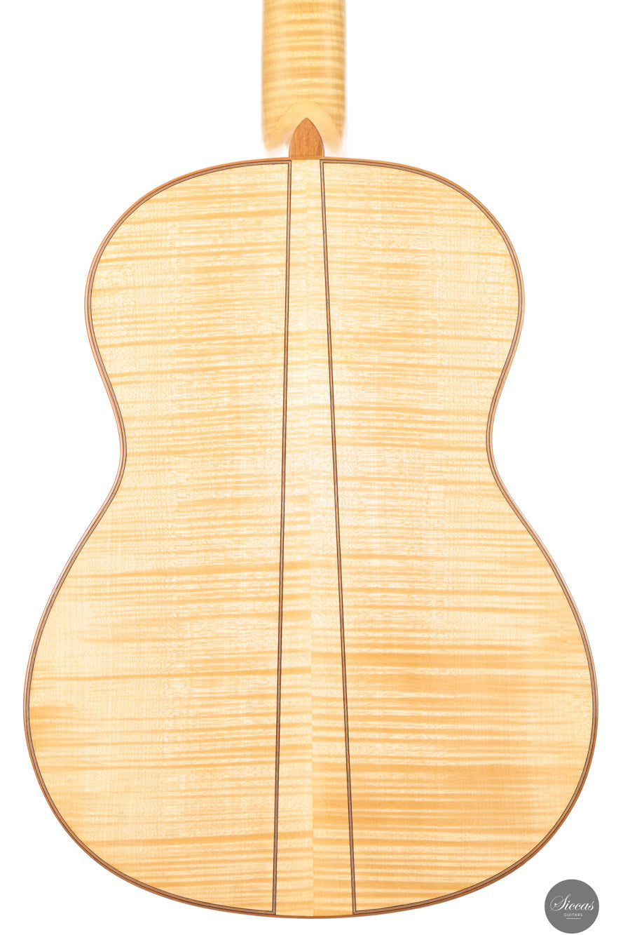 Über den Gitarrenbauer: Leo Sprenger aus Mittenwald entstammte einer Familie mit einer langen und bedeutenden Tradition im Instrumentenbau. Zunächst als Schreiner ausgebildet, studierte er später an der Staatlichen Fachschule für Geigenbau in Mittenwald. Dort verband er sein fundiertes Wissen im Holzhandwerk mit dem Erbe seiner Familie und fertigte Gitarren, Kontrabässe und andere Zupf- und Streichinstrumente auf höchstem Niveau. Als Meister im Zupfinstrumentenbau war er sowohl als aktiver Gitarrenbauer als auch als Lehrer tätig und gab sein Wissen an die nächste Generation weiter. Seine Gitarren werden für ihre präzise Bauweise, klangliche Raffinesse und die tiefe handwerkliche Verwurzelung in der Mittenwalder Tradition geschätzt. Dieses Erbe setzte er bis zu seinem Tod im Jahr 2019 fort. Über die Gitarre: Diese Konzertgitarre wurde 2004 gebaut und besitzt eine Fichtendecke sowie Boden und Zargen aus geflammtem Ahorn. Sie beeindruckt sowohl optisch als auch klanglich durch ihren besonderen Charakter. Der Klang ist holzig, rund und resonant, mit ausgezeichnetem Sustain, das sich gleichmäßig über alle Register entfaltet. Trotz ihrer leichten Bauweise bietet die Gitarre eine volle und ausgewogene Projektion, spricht leicht an und reagiert sensibel auf feinste Nuancen des Anschlags. Das Halsprofil sorgt für hohen Spielkomfort und macht die Gitarre besonders angenehm für Akkordspiel und längere Spielphasen. Mit ihrer eleganten Schellackpolitur und Sloane-Mechaniken vereint sie ästhetische Raffinesse mit höchster Funktionalität. Zustand: Das Instrument befindet sich in ausgezeichnetem Zustand ohne Risse oder strukturelle Beeinträchtigungen. Oberfläche und Konstruktion sind sehr gut erhalten. Geliefert wird die Gitarre in einem Softshell-Koffer.