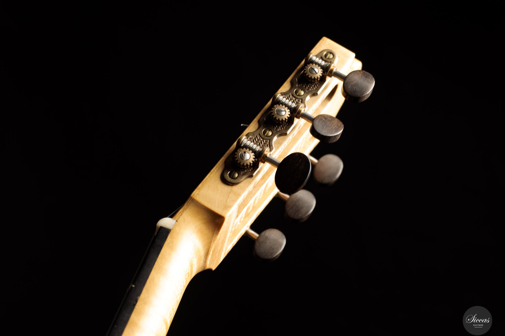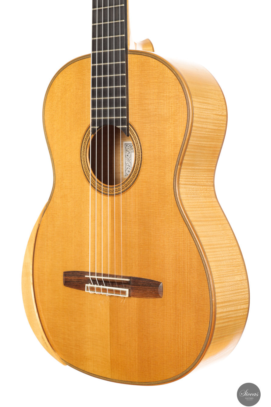 Die Leo Sprenger Konzertgitarre von 2004 vereint die Mittenwalder Tradition mit handwerklicher Präzision und eigenständigem Charakter. Mit Fichtendecke und geflammtem Ahorn für Boden und Zargen entfaltet sie einen holzigen, runden Ton mit klarer Resonanz und gleichmäßigem Sustain über alle Register. Ihre leichte Bauweise sorgt für schnelle Ansprache und sensible Reaktion, wodurch sie feinste Nuancen im Spiel aufnimmt und zugleich eine volle Projektion bietet. Das komfortable Halsprofil macht sie besonders angenehm für Akkordspiel und längere Spielphasen. Elegante Details wie die Schellackpolitur und hochwertige Sloane-Mechaniken unterstreichen die ästhetische Qualität dieses Instruments, das sich in ausgezeichnetem Zustand präsentiert.