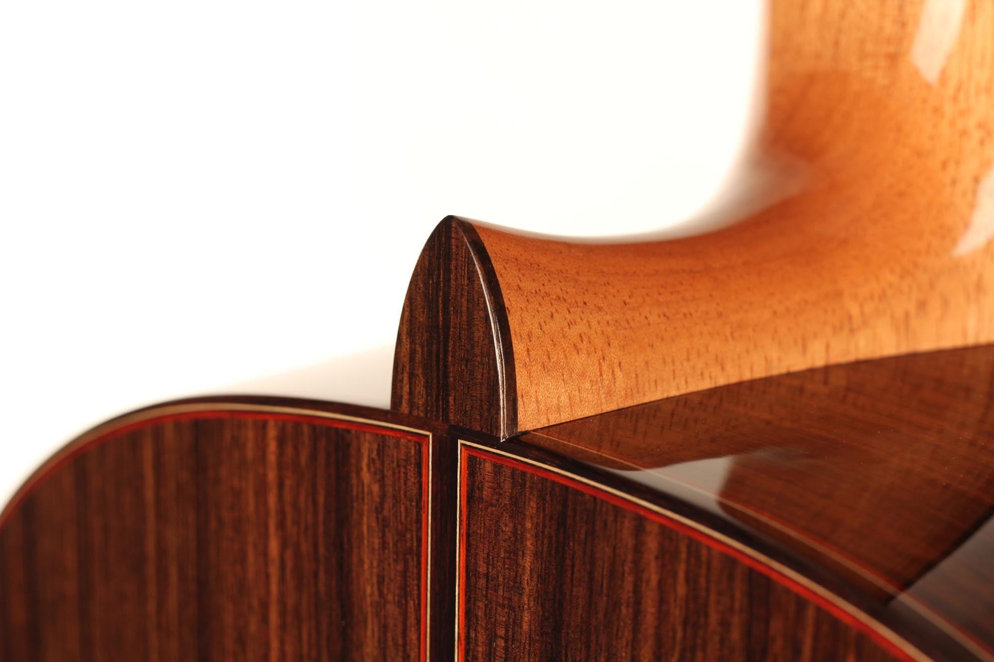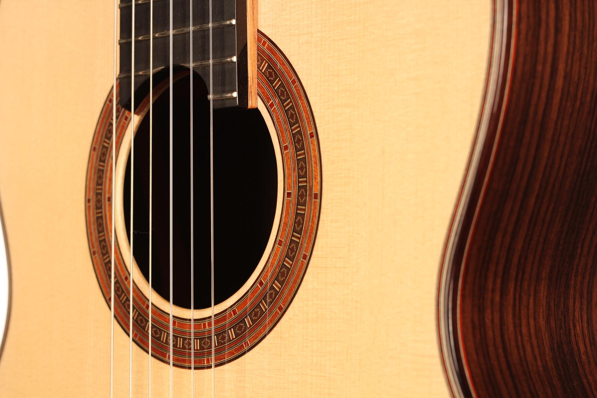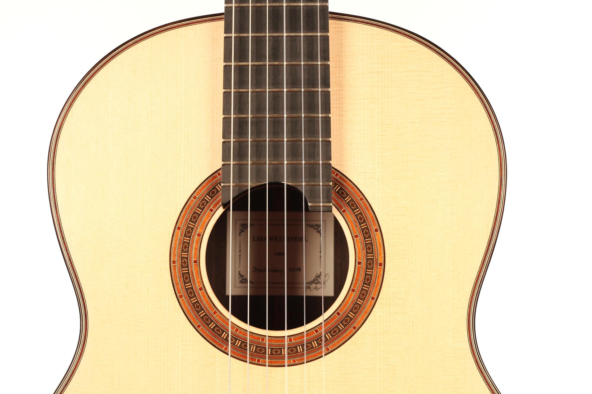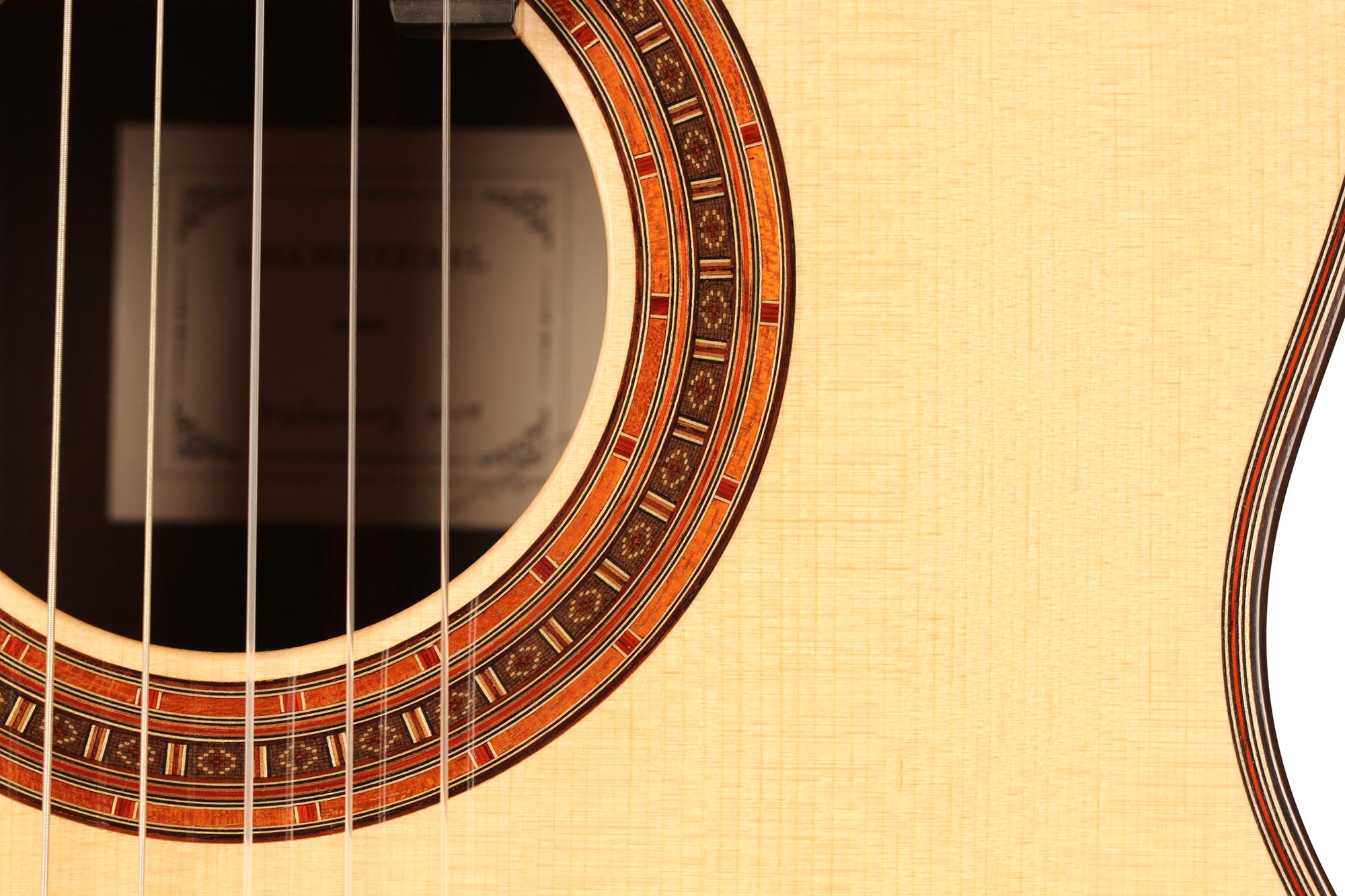Of course, she let the accumulated experience flow into this wonderful guitar. She uses finest alpine spruce for the top and Indian rosewood for back and sides. The German V-joint, the rosette specially made for this guitar and the French shellac polish express the special emphasis that Lisa puts on craftsmanship at the highest level. The playability and feel are fantastic, and the slightly raised fretboard makes playing in higher registers very comfortable.