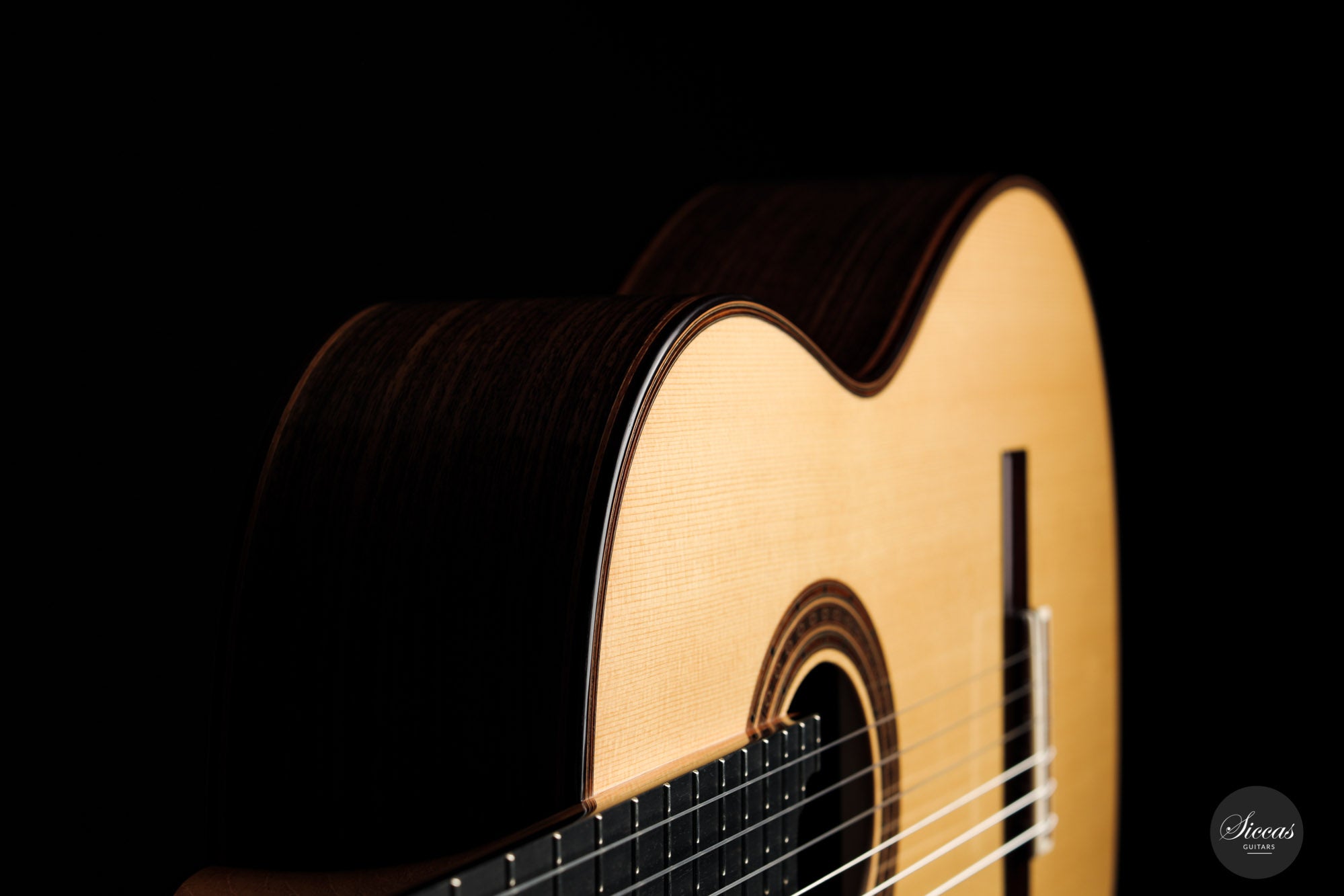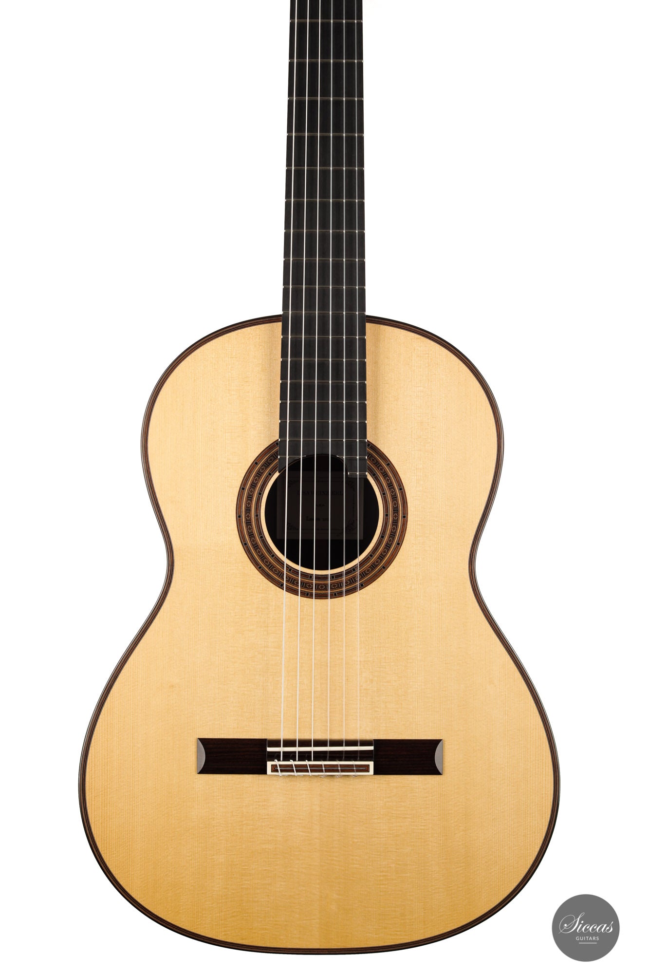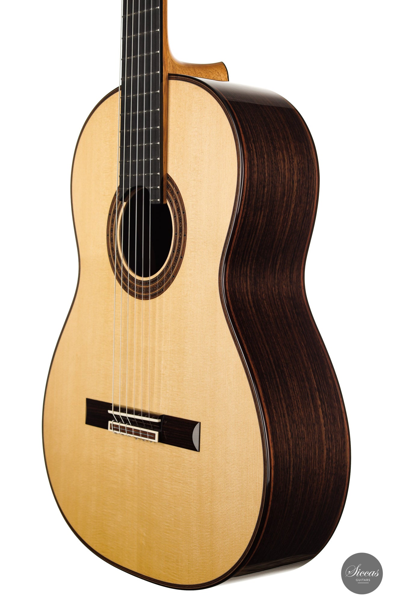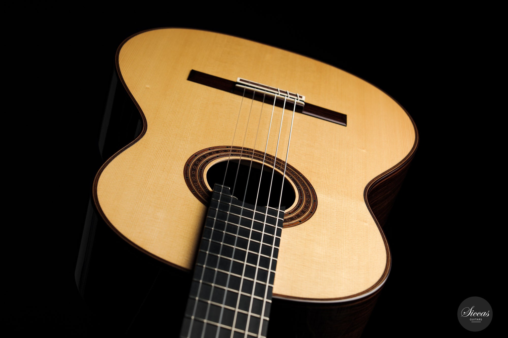 There are some guitars that truly are special and this is one of those. The craftsmanship is of the absolute highest level that we get to see here at Siccas guitars, Lisa only builds a small number of guitars per year, because she spends a lot of time to perfect the entire building process. The gorgeously crafted rosette shows some vibrant matching colors, the most splendid purflings, and a neck that is super comfortable. When playing on the instrument, one can immediately feel its responsiveness and the fine attack, a very lyrical sustain, and a deep bass response. Looking further into the design, the guitar is built with double sides that make the structural integrity more firm. Using this technique allows the luthier to build lighter, thus creating a complex tone with a lot of core. This guitar suits the musician that wants perfection delivered with a lush, sweet, and singing tone.