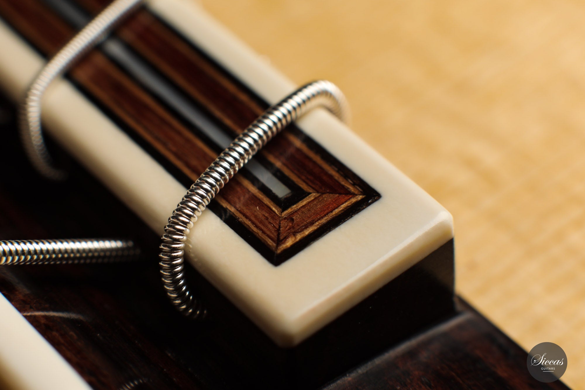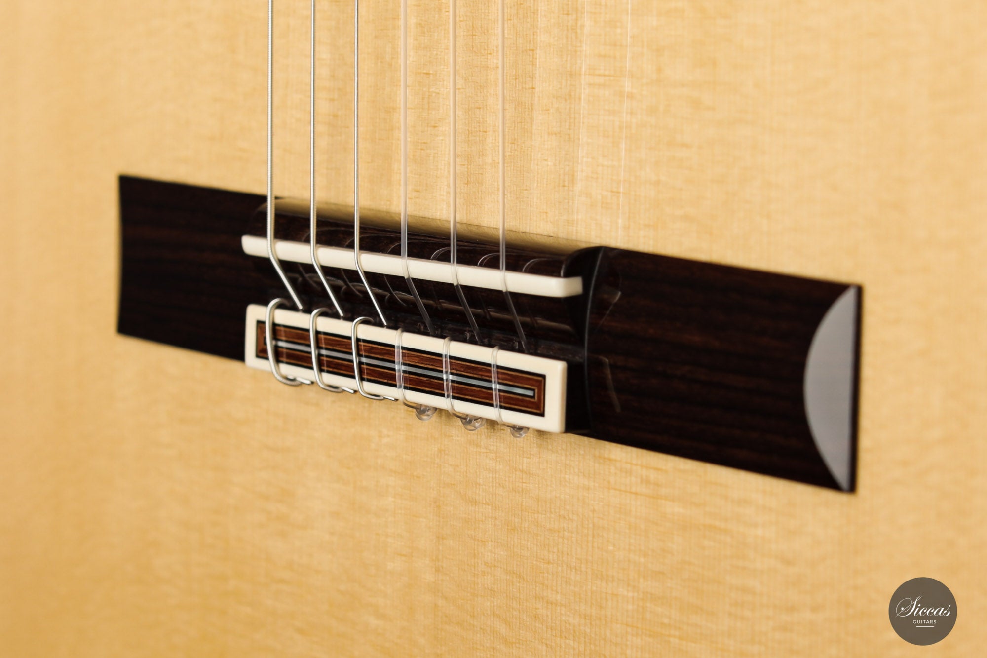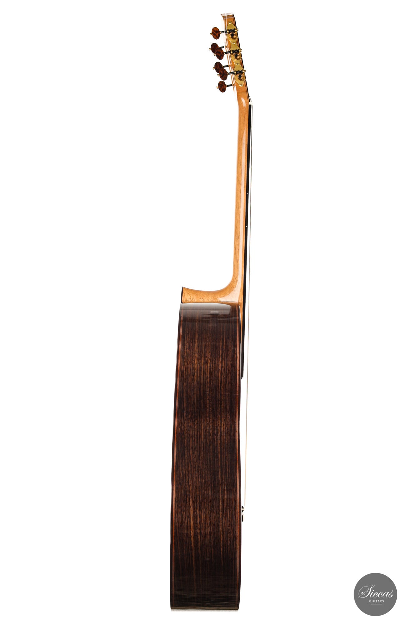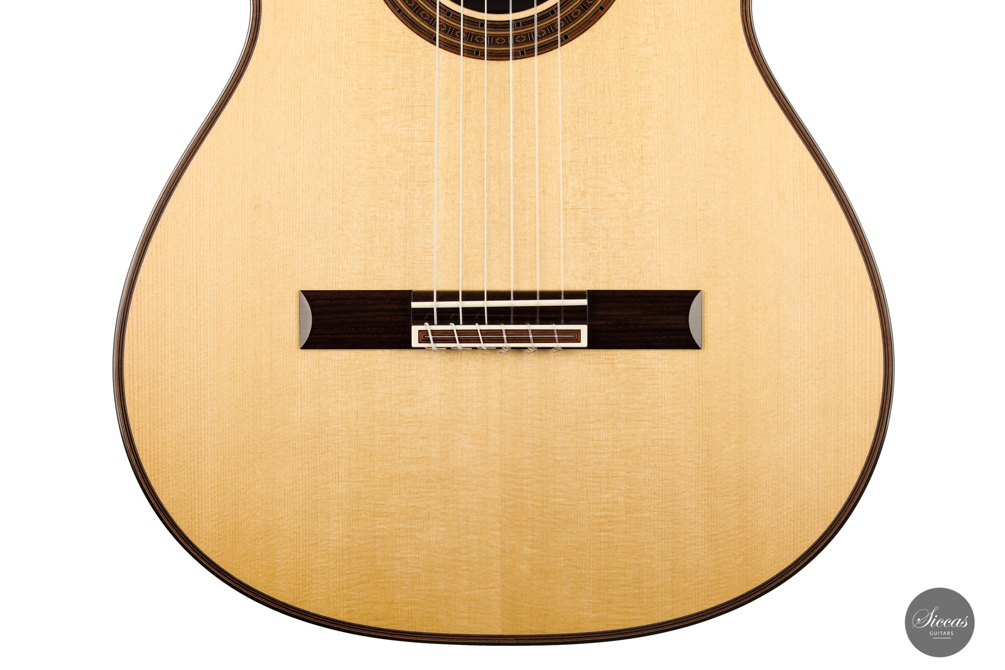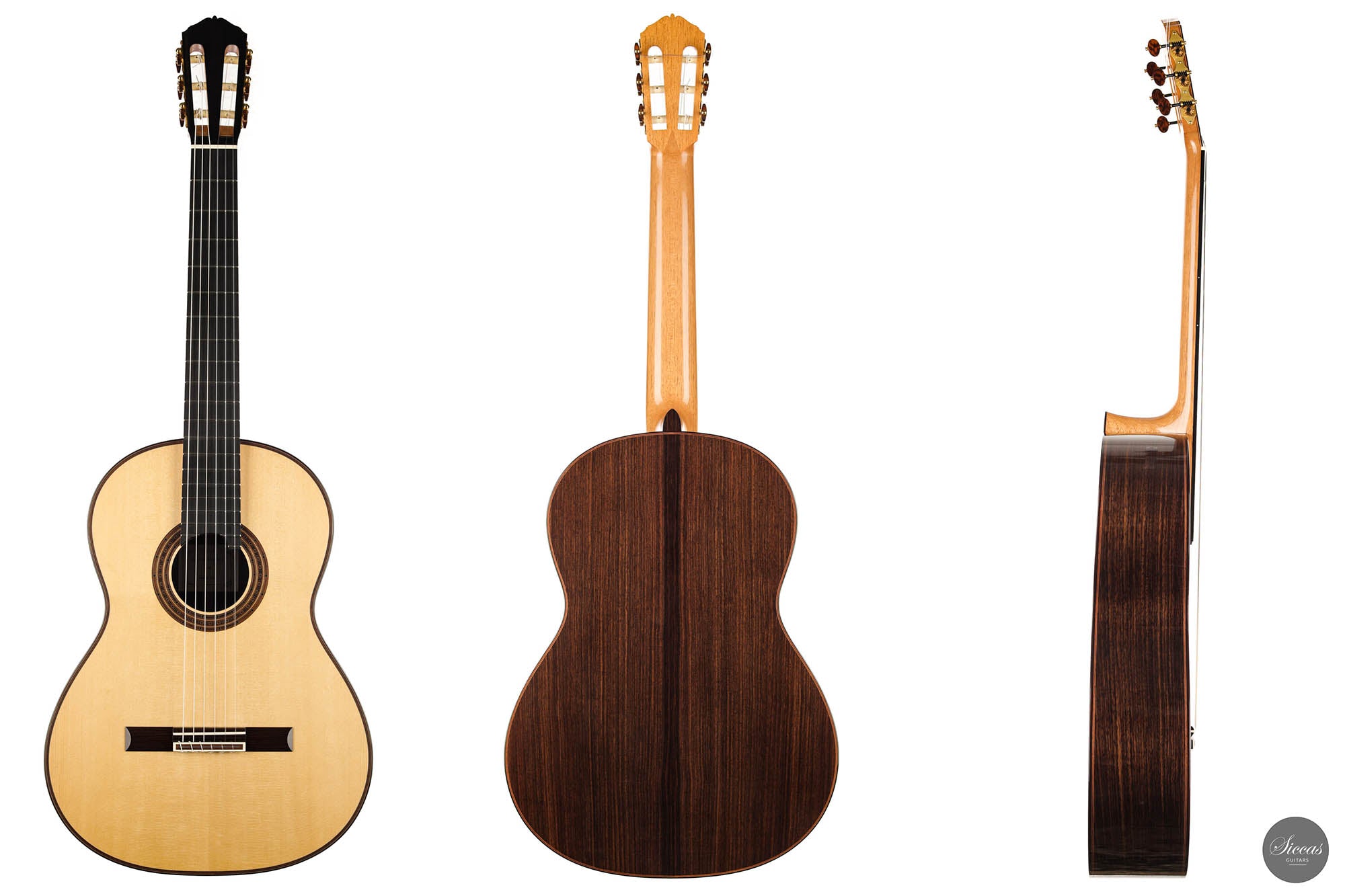 There are some guitars that truly are special and this is one of those. The craftsmanship is of the absolute highest level that we get to see here at Siccas guitars, Lisa only builds a small number of guitars per year, because she spends a lot of time to perfect the entire building process. The gorgeously crafted rosette shows some vibrant matching colors, the most splendid purflings, and a neck that is super comfortable. When playing on the instrument, one can immediately feel its responsiveness and the fine attack, a very lyrical sustain, and a deep bass response. Looking further into the design, the guitar is built with double sides that make the structural integrity more firm. Using this technique allows the luthier to build lighter, thus creating a complex tone with a lot of core. This guitar suits the musician that wants perfection delivered with a lush, sweet, and singing tone.
