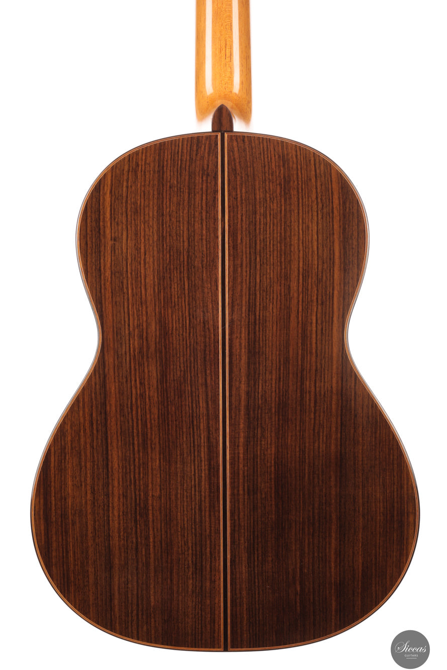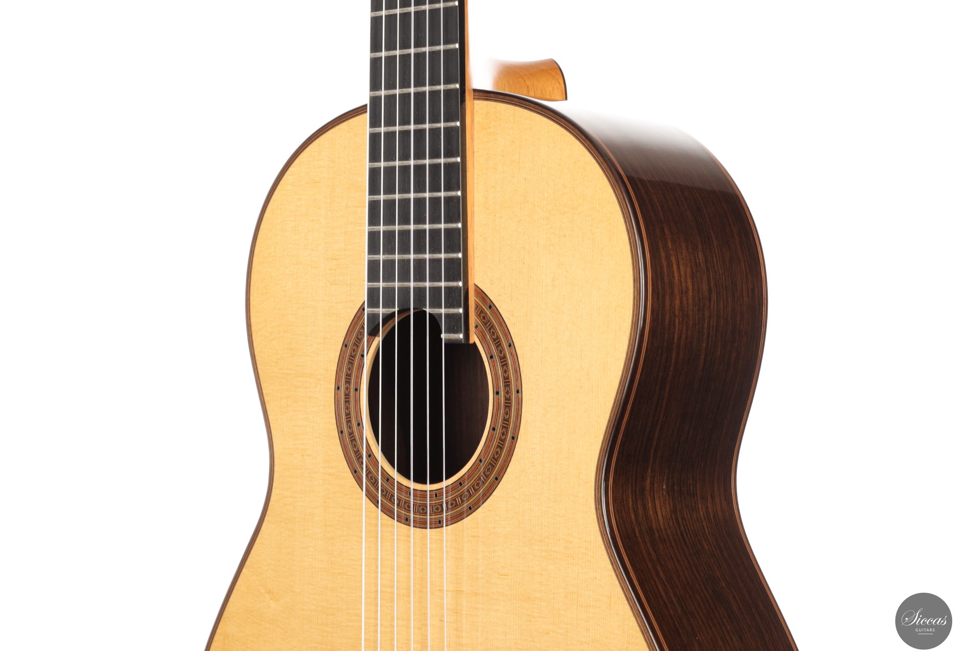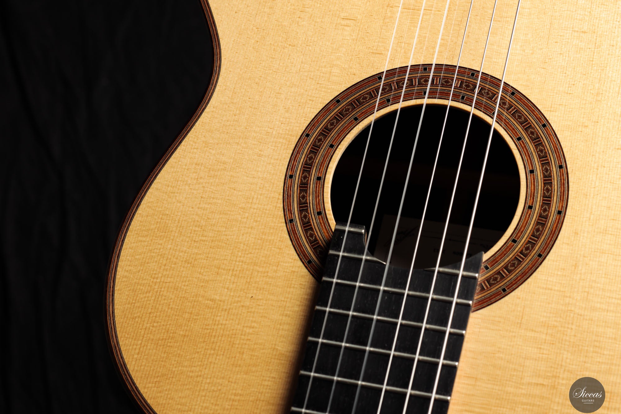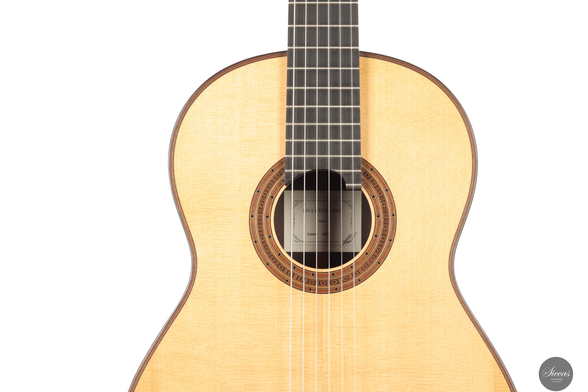 Diese Konzertgitarre wurde im Jahr 2022 gebaut und stellt ein besonders ausgereiftes Beispiel von Lisa Weinzierls traditionell konstruierten Instrumenten dar. Mit einer Fichtendecke sowie Boden und Zargen aus indischem Palisander erreicht sie eine klangliche Tiefe und Projektion, die häufig eher mit modernen Baukonzepten in Verbindung gebracht wird, dabei jedoch klar in der klassischen Tradition verankert bleibt.