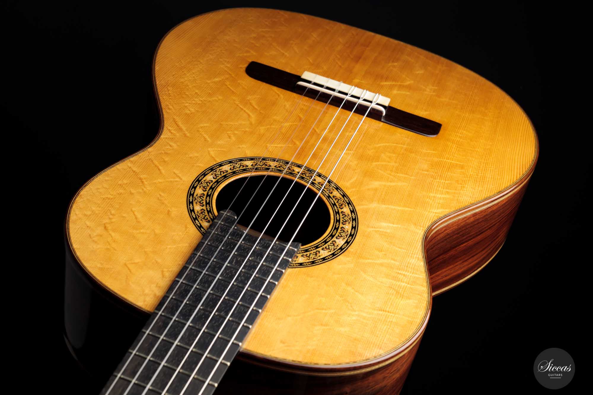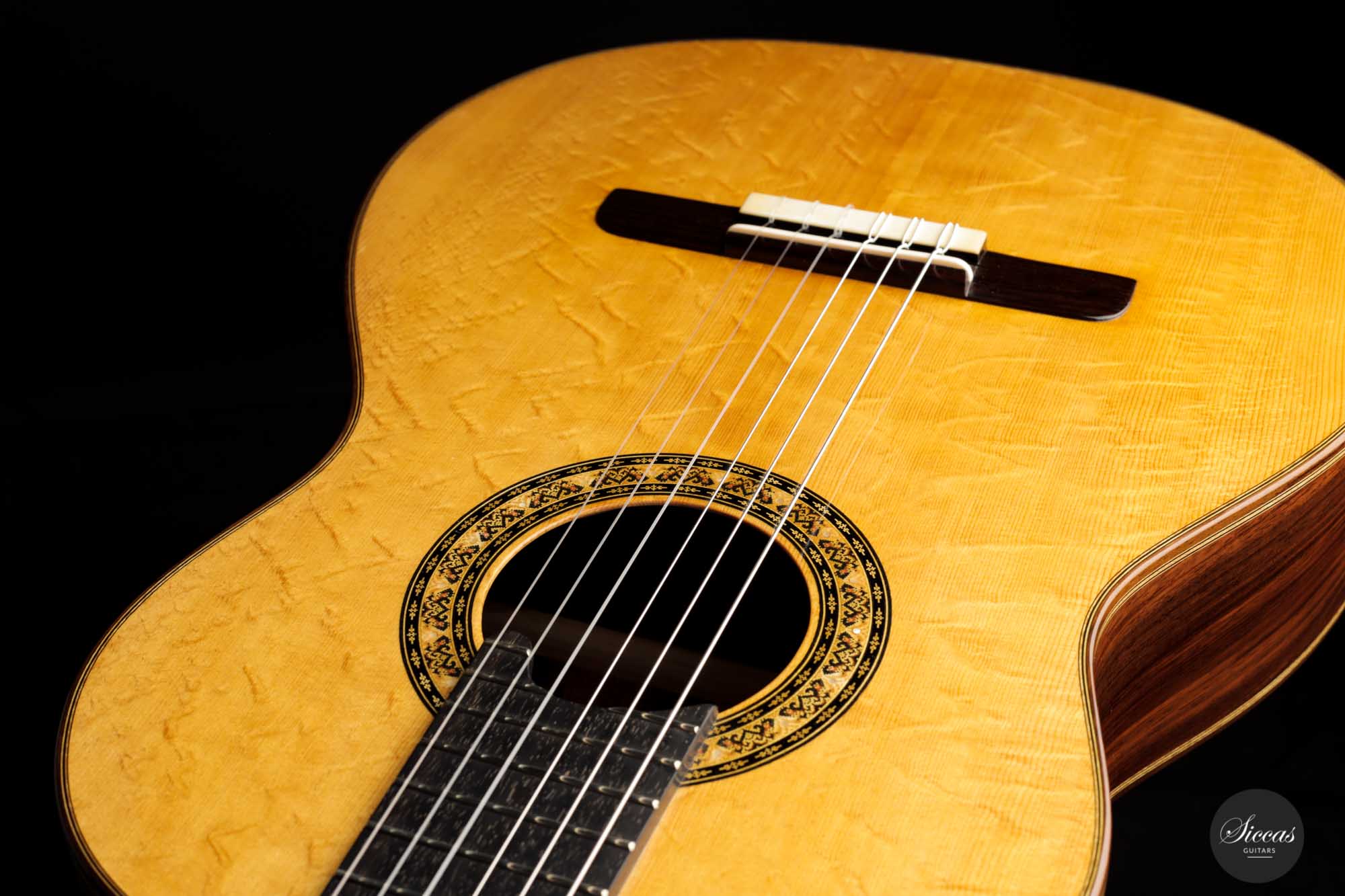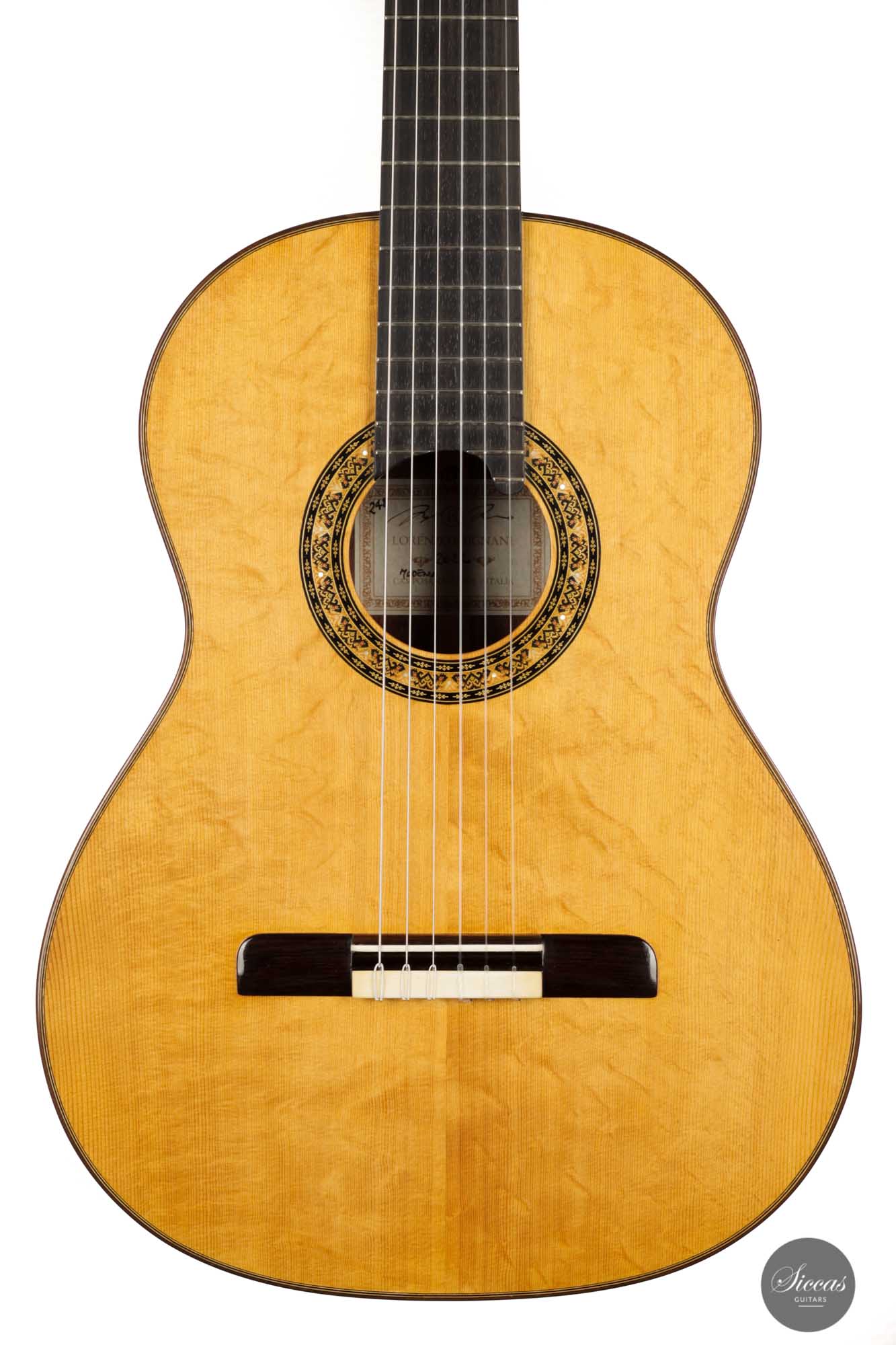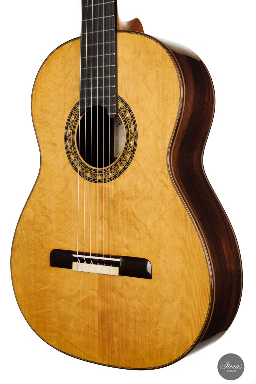 The sound exhibits a great overall balance, with deep and rich basses. It is well attuned to the richness of tone color but does not compromise the tonal vigor and lightness of playing. The treble sings beautifully and overall, the character of this Italian masterpiece is reminiscent of guitars from days long gone, which may be in no small part due to Lorenzo Frignani’s large collection of antique guitars; a unique sonic universe full of inspiration for a knowledgeable master luthier of his class.