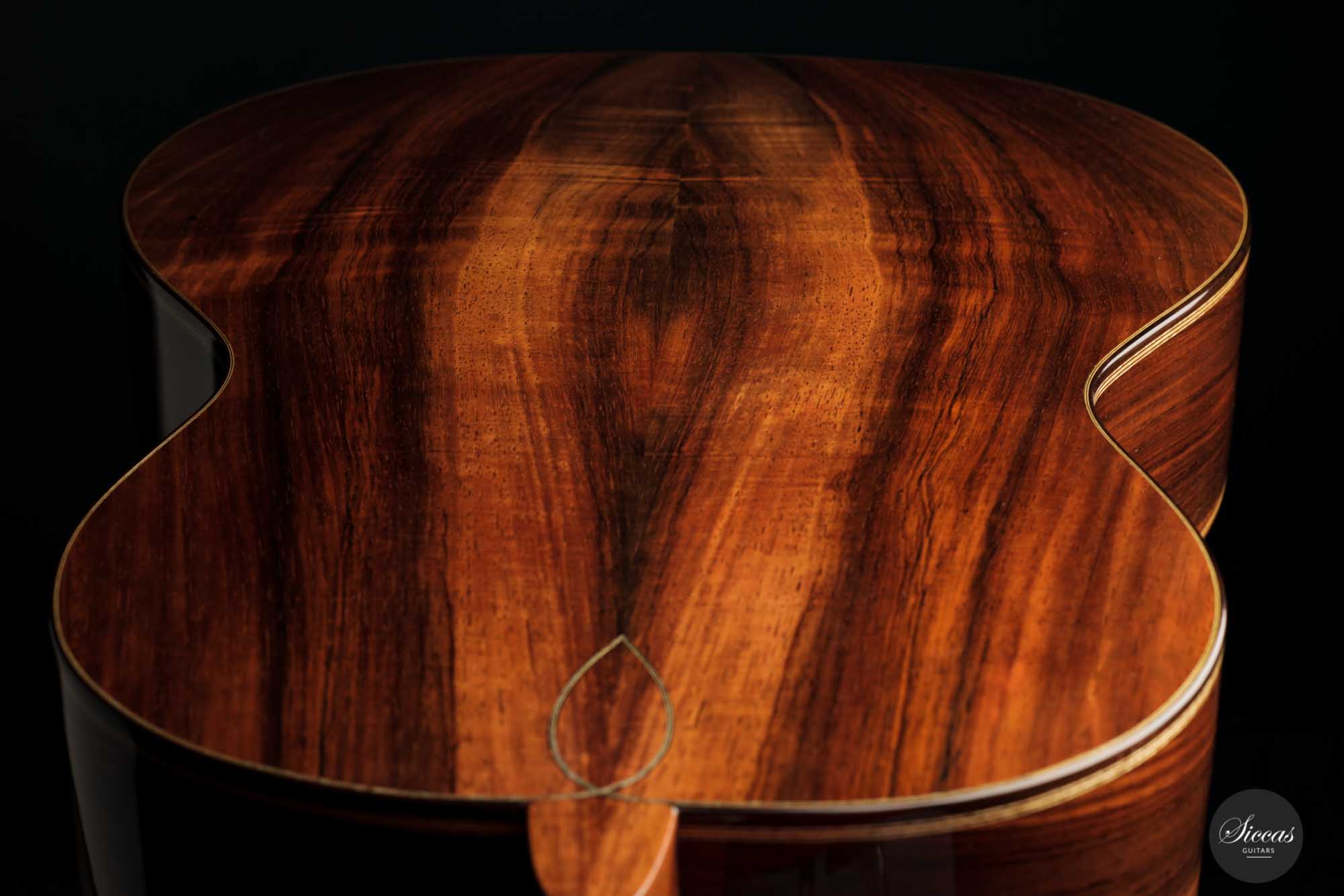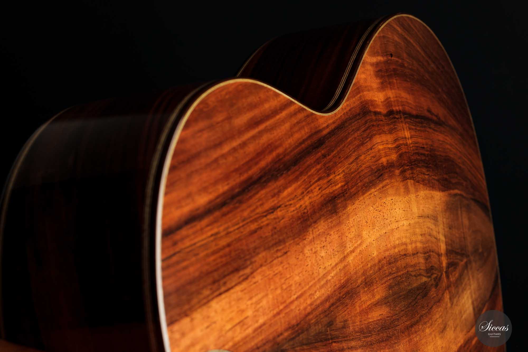 What a guitar! Now, how often does one see a bear-claw spruce top like this? It is of exceptional quality and gives this guitar a particular value and unique look. Moreover, the Indian rosewood set used for back and sides is so distinctive through its color and figuration. It is simply beautiful and, given the quality, colour and grain, could just as easily be Brazilian rosewood.