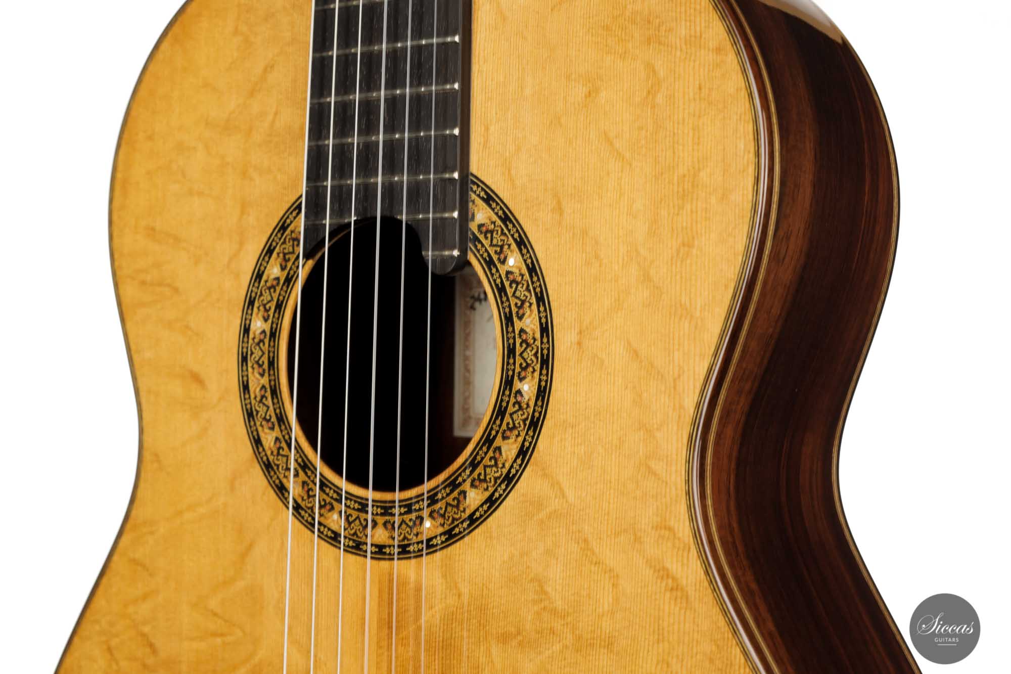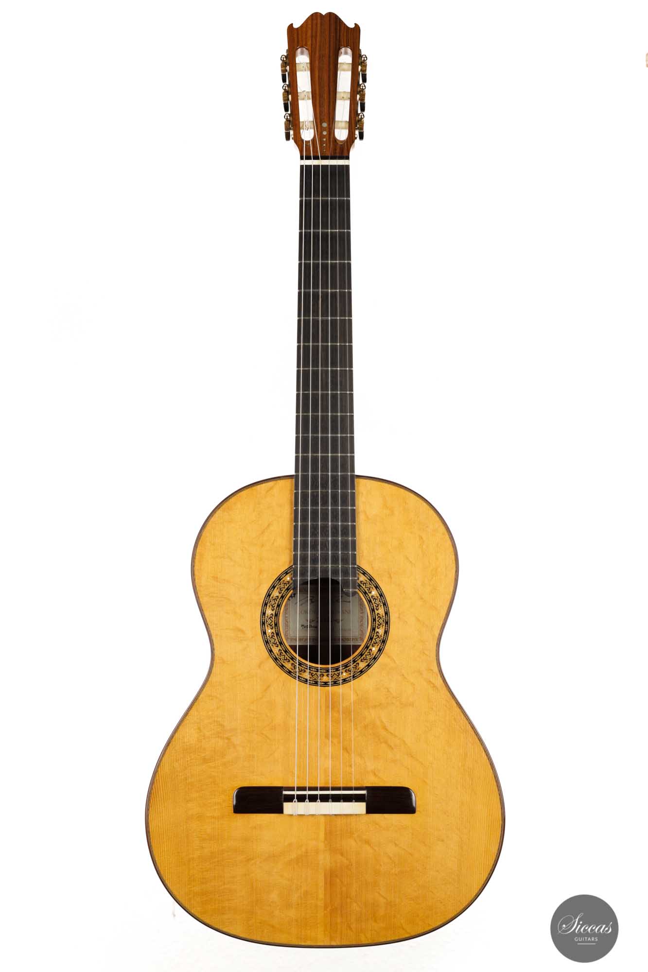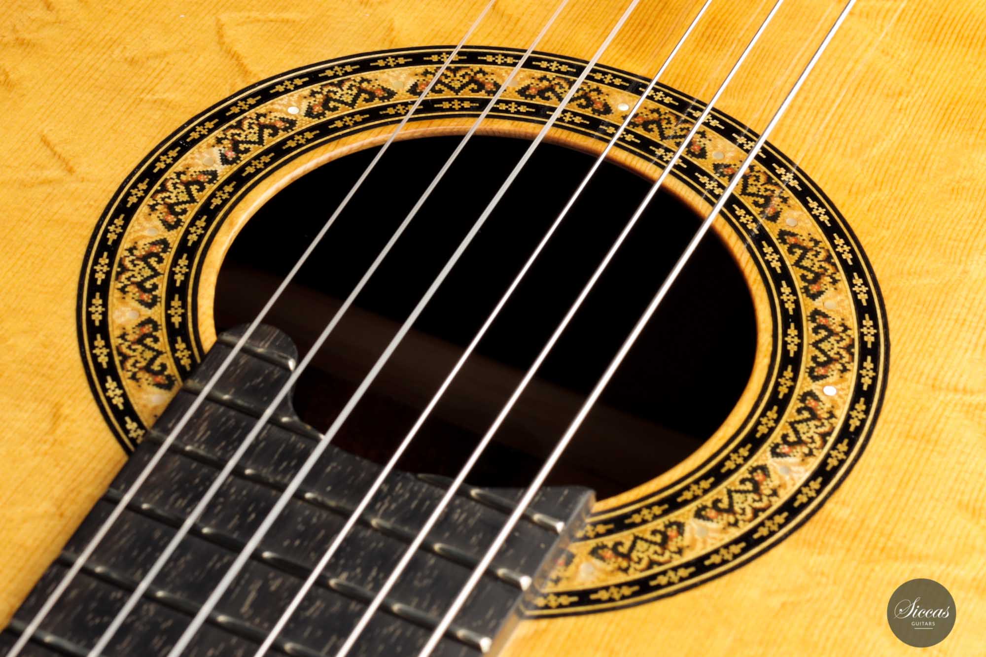 Lorenzo Frignani found inspiration for this wonderful instrument number 248 in the guitars of David Rubio. Using Rubio’s plantilla and ideal of sound, he adapted the internal construction and opted for a traditional “x-bracing”, the hallmark of Lorenzo Frignani’s guitars. Finally, the mother of pearl dots in the rosette and headstock and the many refined marquetry details make this instrument a true gem.