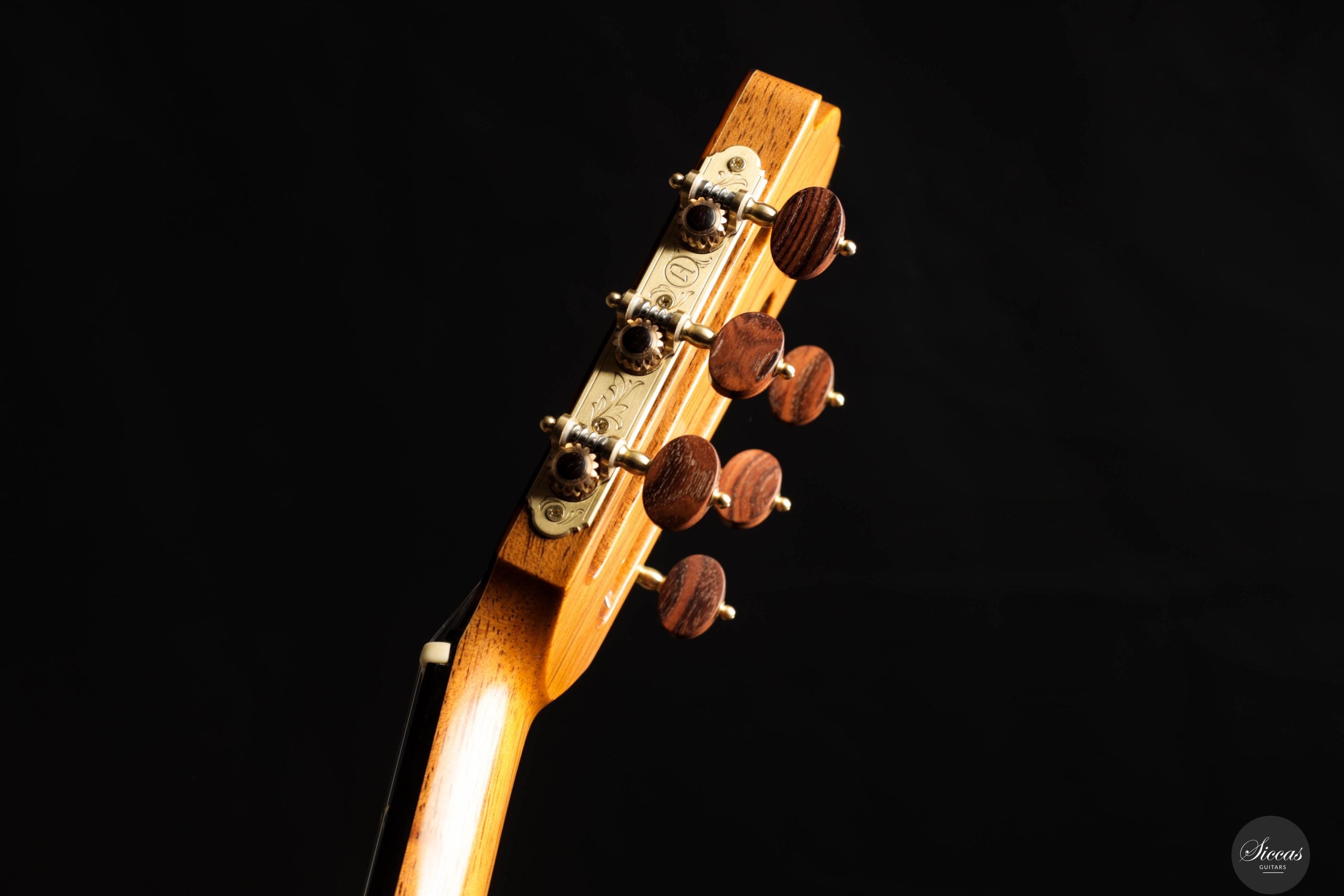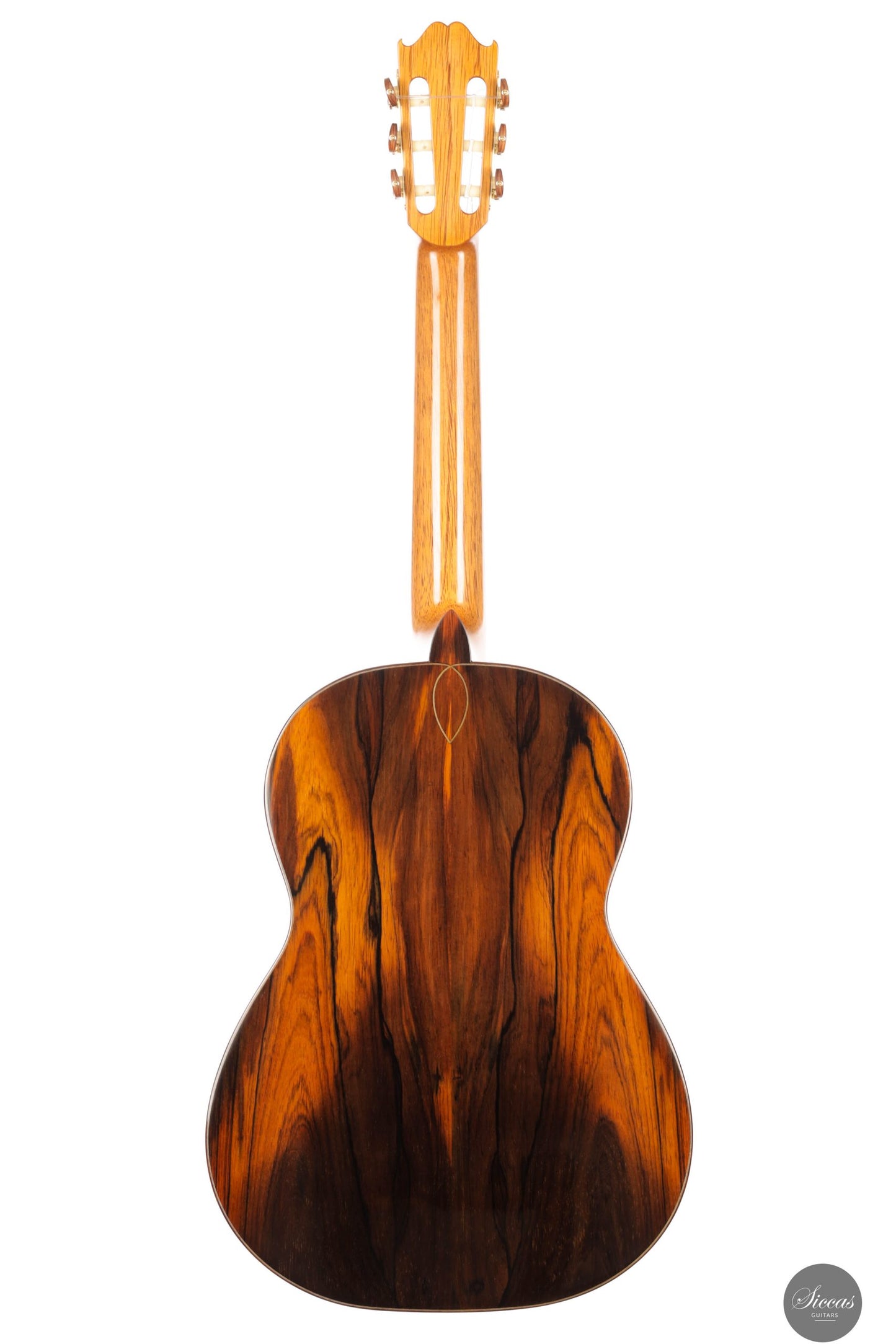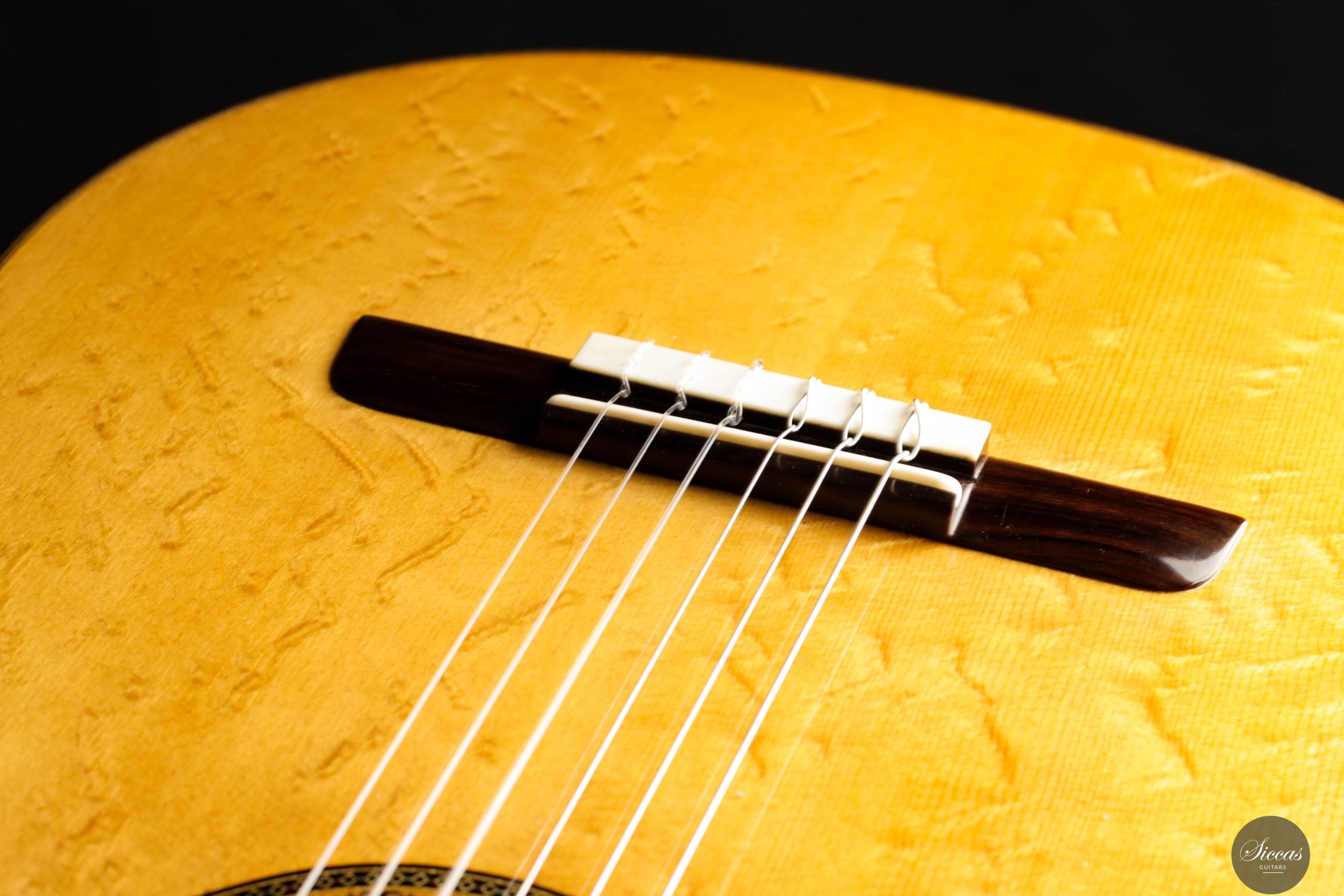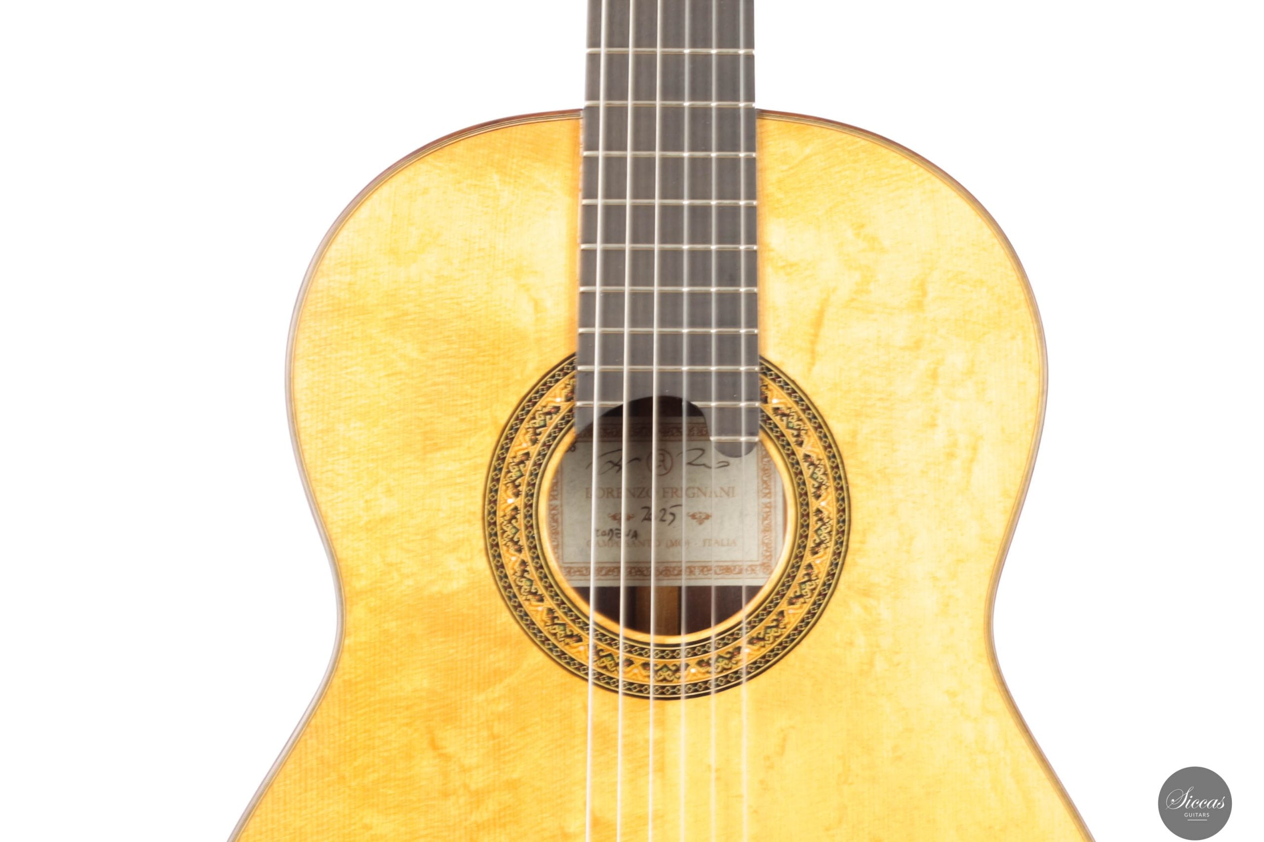 Diese Gitarre ist ein bemerkenswertes Beispiel für Lorenzo Frignanis Können, Tradition und Innovation zu vereinen. Die Fichtendecke, die mit den gleichen Techniken wie bei Streichinstrumenten gealtert wurde, verleiht der Gitarre nicht nur optische Wärme, sondern spielt auch eine entscheidende Rolle für ihre klangliche Komplexität. Inspiriert von David Rubios ikonischen Klangvorstellungen und seiner Plantilla, integriert Frignani ein X-Bracing-Design, das Rubios Vermächtnis ehrt und gleichzeitig die Resonanz und Projektion der Gitarre verbessert. Das Ergebnis ist ein Instrument mit einer einzigartigen Stimme, das eine hervorragende Trennung der Töne bietet und dennoch rund und warm bleibt. Jede Tonlage glänzt mit intensiven Farben, und die hohe Ansprache auf Artikulation eröffnet dem Spieler unendliche Ausdrucksmöglichkeiten. Diese Gitarre ist ein eindrucksvolles Zeugnis für Frignanis Fertigkeiten und sein tiefes Verständnis für akustische Exzellenz.
