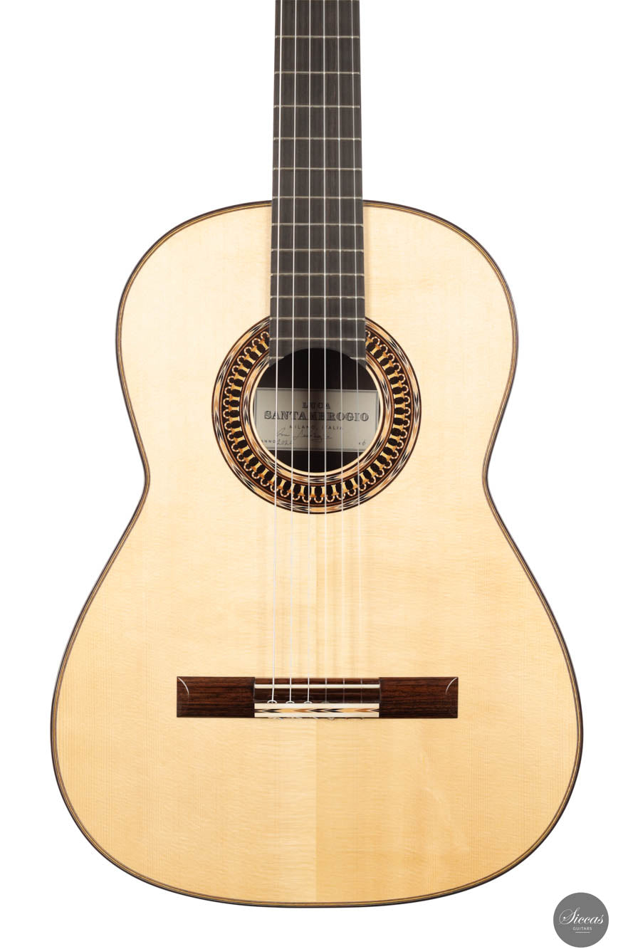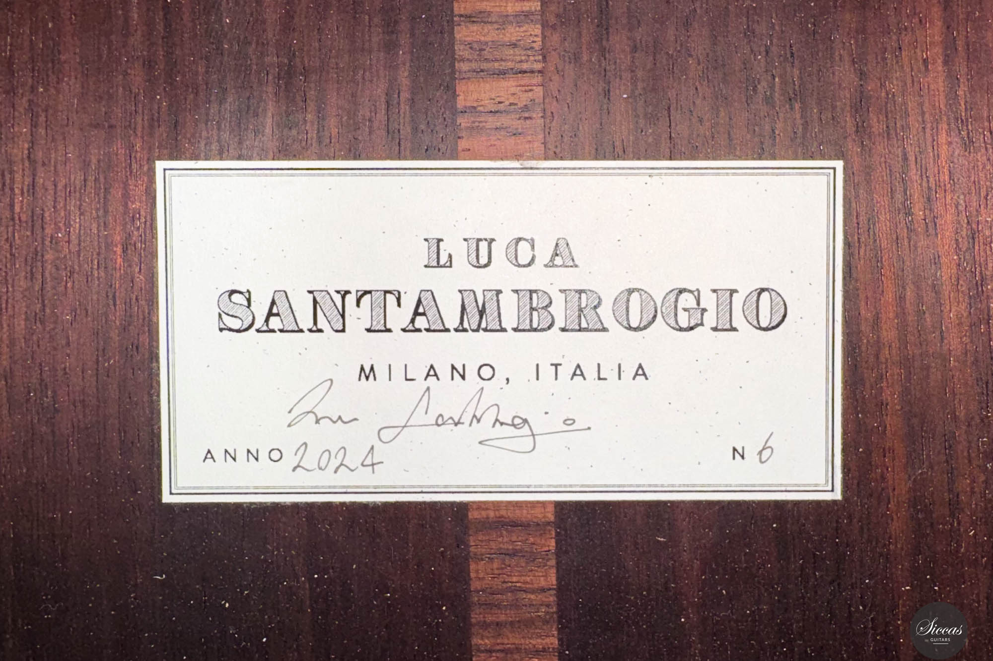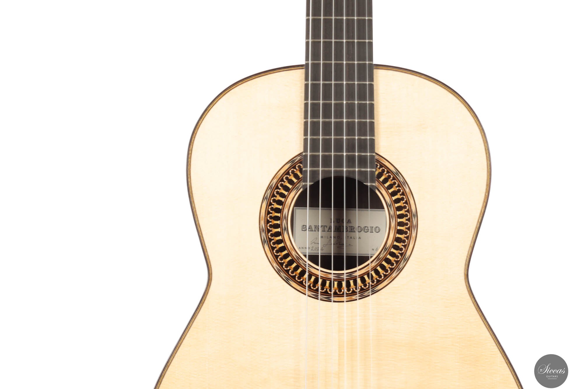 Luca Santambrogio, geboren 1995 in Desio, einer kleinen Stadt in der Region Brianza in Norditalien, wuchs inmitten einer Kultur der Handwerkskunst auf, inspiriert von der dortigen renommierten Möbelindustrie. Nach einem Studium des Industriedesigns entschied er sich, seiner Leidenschaft für den Gitarrenbau nachzugehen, und schrieb sich an der Civica Scuola di Liuteria di Milano ein, die er 2022 abschloss. Während seiner Ausbildung lernte er unter der Anleitung des Meistergitarrenbauers Roberto De Miranda und entwickelte eine tiefe Leidenschaft für klassische Gitarren sowie für traditionelle spanische Bauweisen. Nach seinem Abschluss vertiefte Luca seine Fähigkeiten unter der Anleitung von Marco Bortolozzo in Mailand, wo er sein Augenmerk auf Leichtigkeit, Klangforschung und Detailgenauigkeit legte – Prinzipien, die heute seinen Stil prägen. Heute arbeitet er in Mailand und lässt sich von den großen spanischen Meistern wie Antonio de Torres und José Luis Romanillos inspirieren.