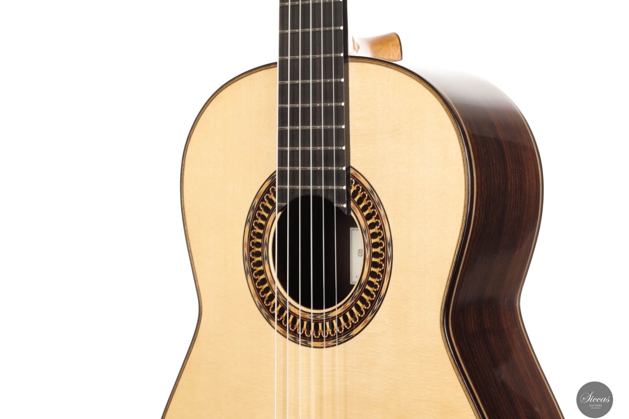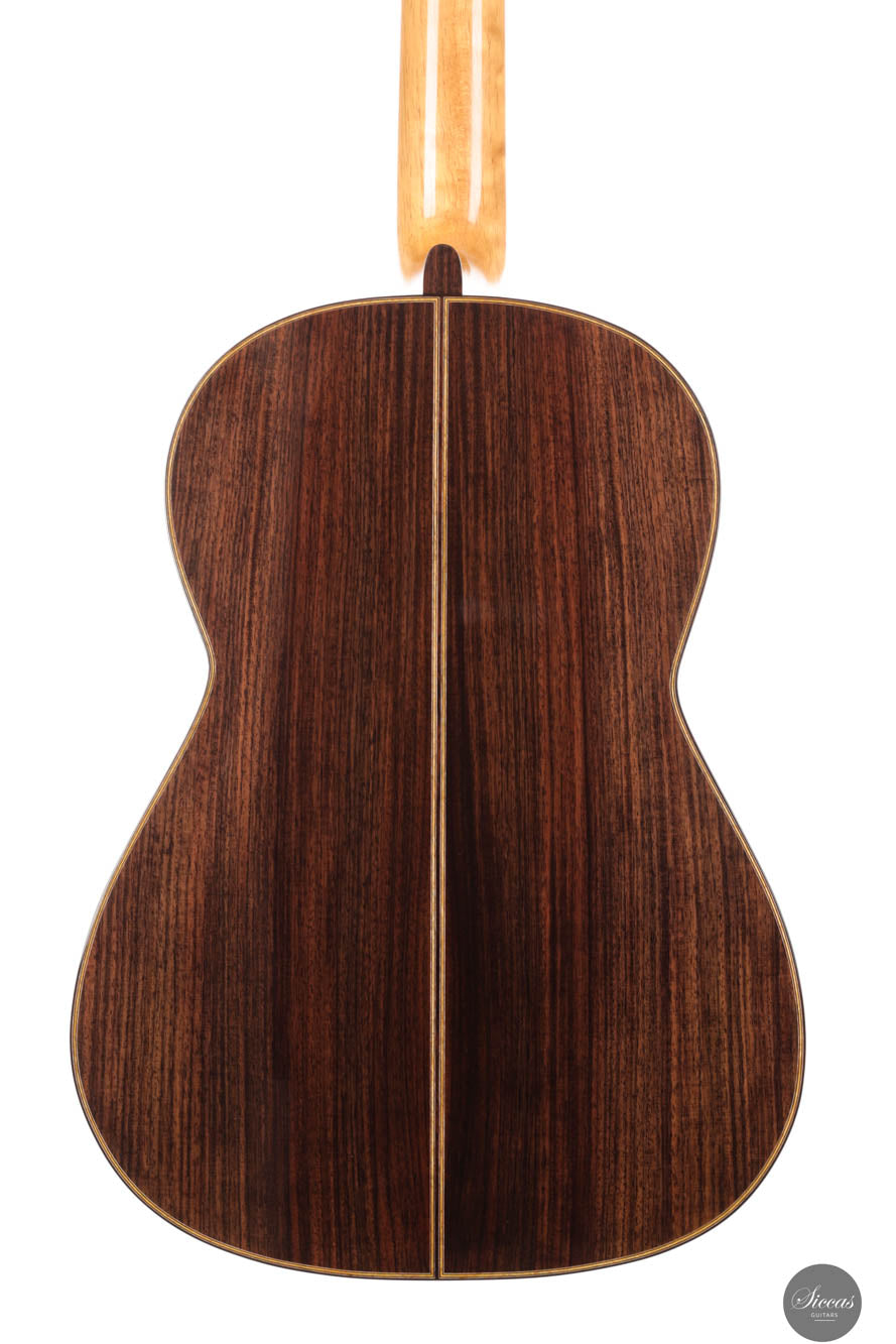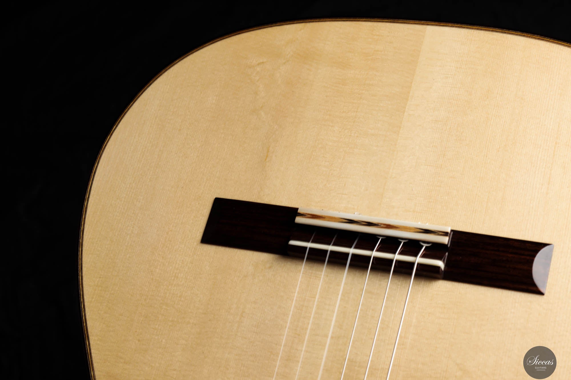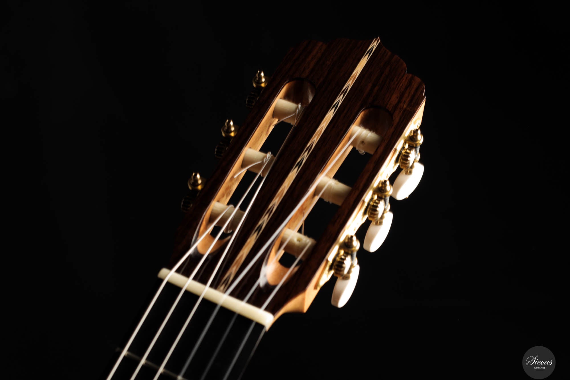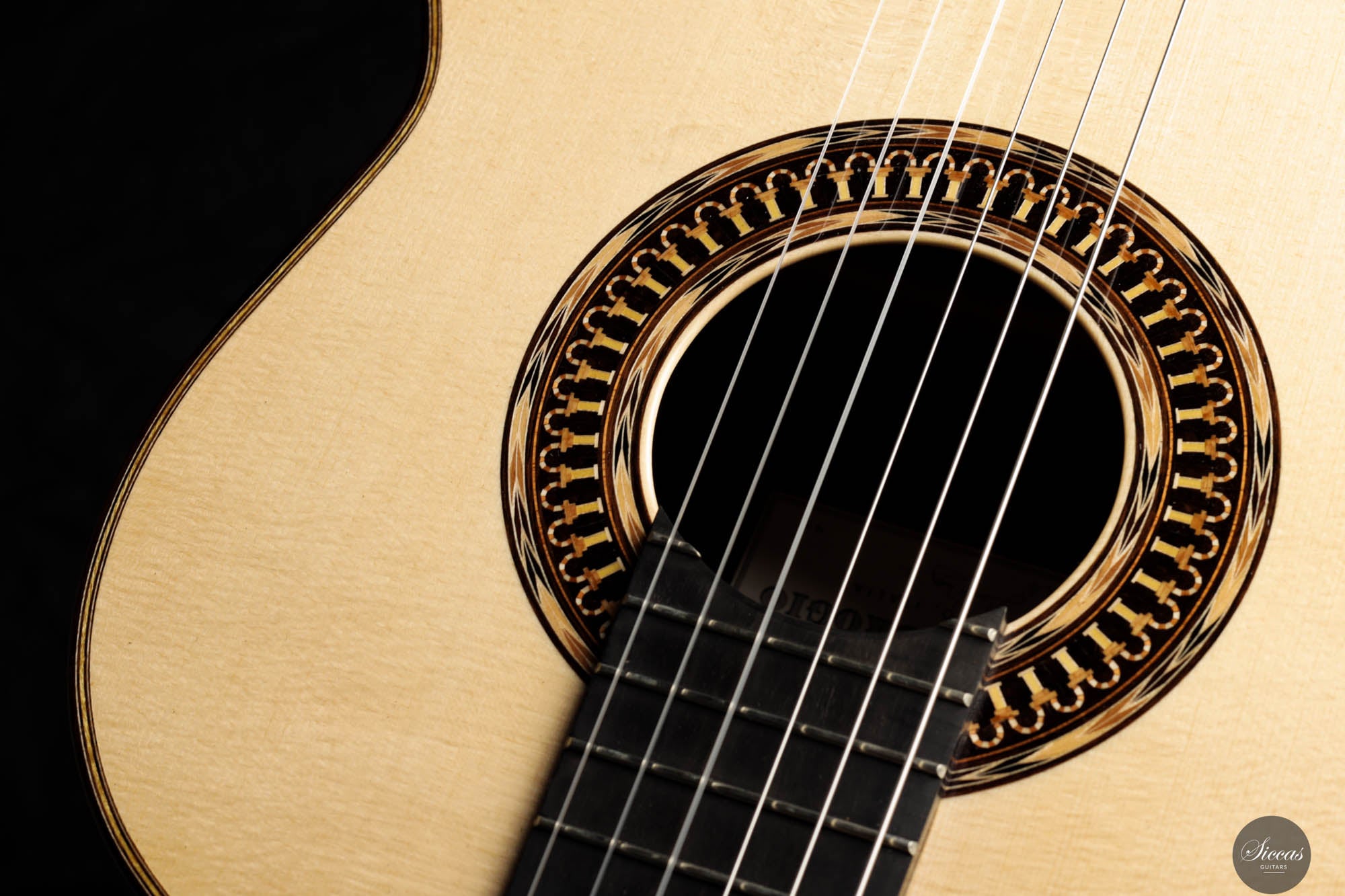 Lucas Romanillos-Modell ist eine Hommage an das Werk des legendären Gitarrenbauers José Luis Romanillos und vereint exzellenten Klang, elegante Ästhetik und meisterhafte Handwerkskunst. Die Gitarre verfügt über eine Decke aus italienischer Alpenfichte aus dem Val di Fiemme, bekannt für ihre Leichtigkeit und Steifigkeit, die dem Instrument einen warmen, reichen und tiefen Klang verleiht. Boden, Zargen, Kopfplatte und Steg bestehen aus hochwertigem indischen Palisander, ergänzt durch ein Griffbrett aus afrikanischem Ebenholz auf einem Hals aus spanischem Zedernholz. Charakteristische Merkmale sind die „Kolonnaden“-Rosette im Stil von Romanillos, inspiriert von der Architektur der Moschee von Cordoba, sowie die markante V-Verbindung zwischen Hals und Kopfplatte. Für die Verzierungen verwendet Luca ausschließlich natürliche Holzfarben und verzichtet bewusst auf gefärbte Furniere. Die Rosette enthält sieben verschiedene Holzarten, die ein filigranes Muster ergeben. Diese Gitarre beeindruckt mit einem resonanten Klang, wobei die E/F-Korpusresonanz die warmen Bässe betont, während die Höhen mit Klarheit und Brillanz projizieren. Lucas ganzheitlicher Ansatz stellt sicher, dass alle Teile des Instruments harmonisch schwingen und so eine ausgewogene und ausdrucksstarke Klangpalette erzeugen.