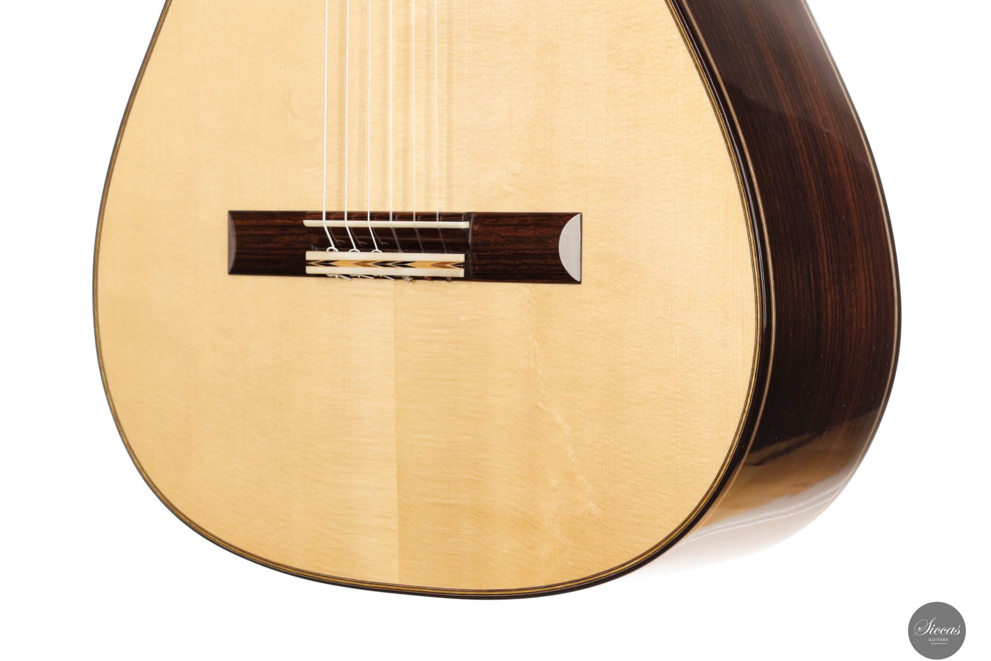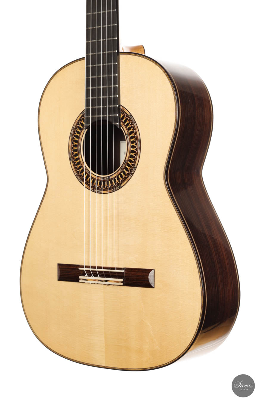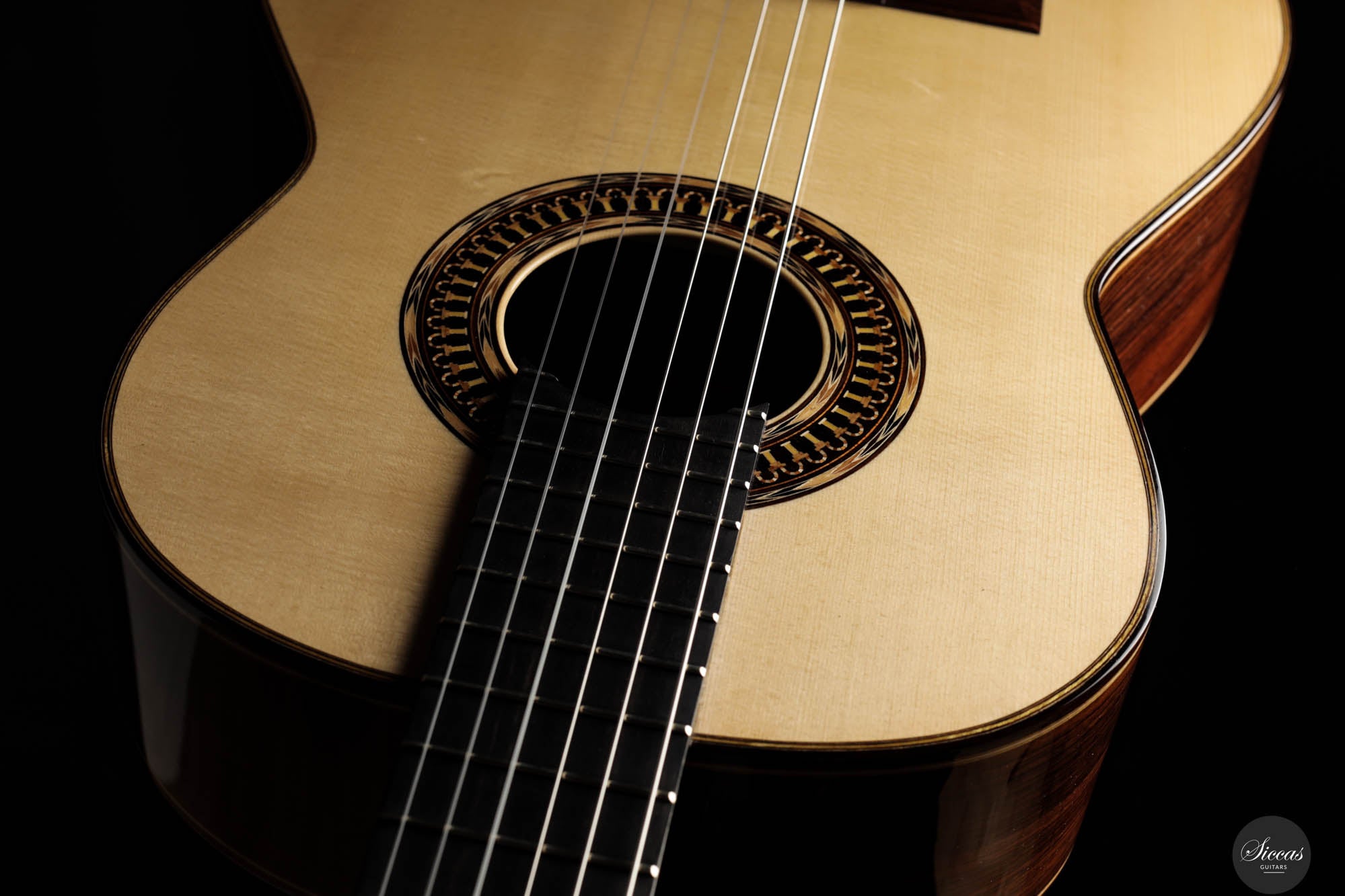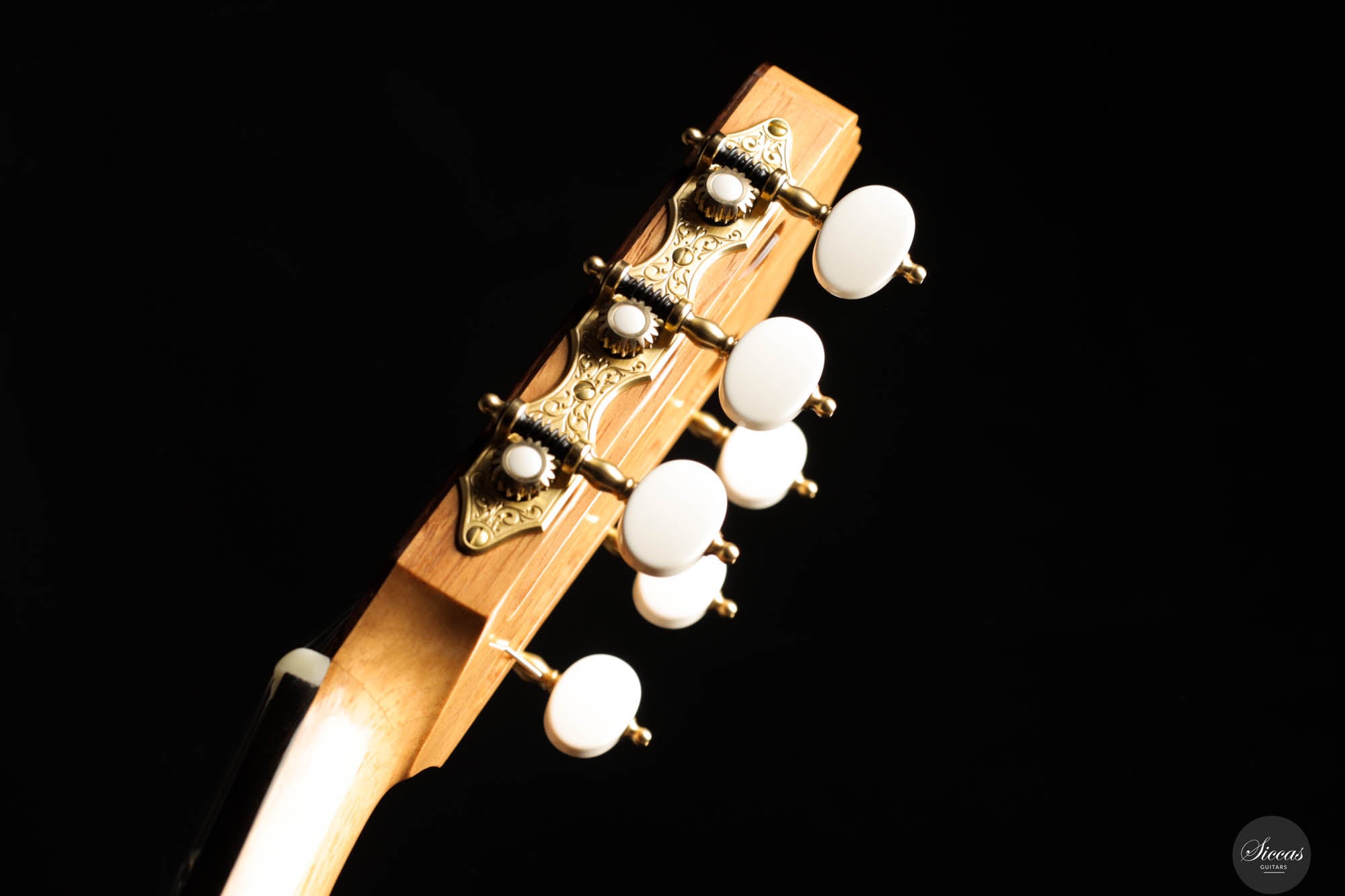 Lucas Romanillos-Modell ist eine Hommage an das Werk des legendären Gitarrenbauers José Luis Romanillos und vereint exzellenten Klang, elegante Ästhetik und meisterhafte Handwerkskunst. Die Gitarre verfügt über eine Decke aus italienischer Alpenfichte aus dem Val di Fiemme, bekannt für ihre Leichtigkeit und Steifigkeit, die dem Instrument einen warmen, reichen und tiefen Klang verleiht. Boden, Zargen, Kopfplatte und Steg bestehen aus hochwertigem indischen Palisander, ergänzt durch ein Griffbrett aus afrikanischem Ebenholz auf einem Hals aus spanischem Zedernholz. Charakteristische Merkmale sind die „Kolonnaden“-Rosette im Stil von Romanillos, inspiriert von der Architektur der Moschee von Cordoba, sowie die markante V-Verbindung zwischen Hals und Kopfplatte. Für die Verzierungen verwendet Luca ausschließlich natürliche Holzfarben und verzichtet bewusst auf gefärbte Furniere. Die Rosette enthält sieben verschiedene Holzarten, die ein filigranes Muster ergeben. Diese Gitarre beeindruckt mit einem resonanten Klang, wobei die E/F-Korpusresonanz die warmen Bässe betont, während die Höhen mit Klarheit und Brillanz projizieren. Lucas ganzheitlicher Ansatz stellt sicher, dass alle Teile des Instruments harmonisch schwingen und so eine ausgewogene und ausdrucksstarke Klangpalette erzeugen.