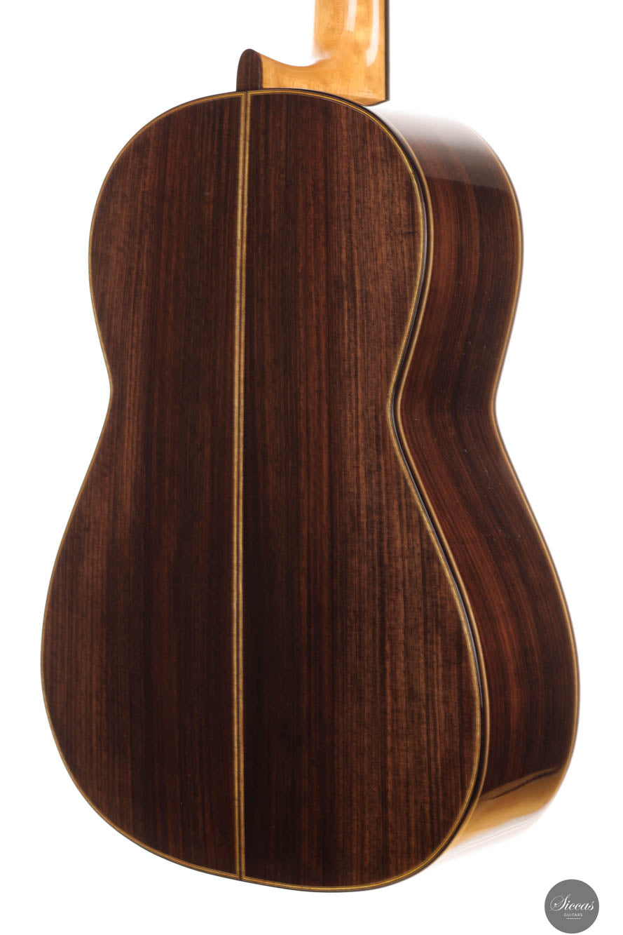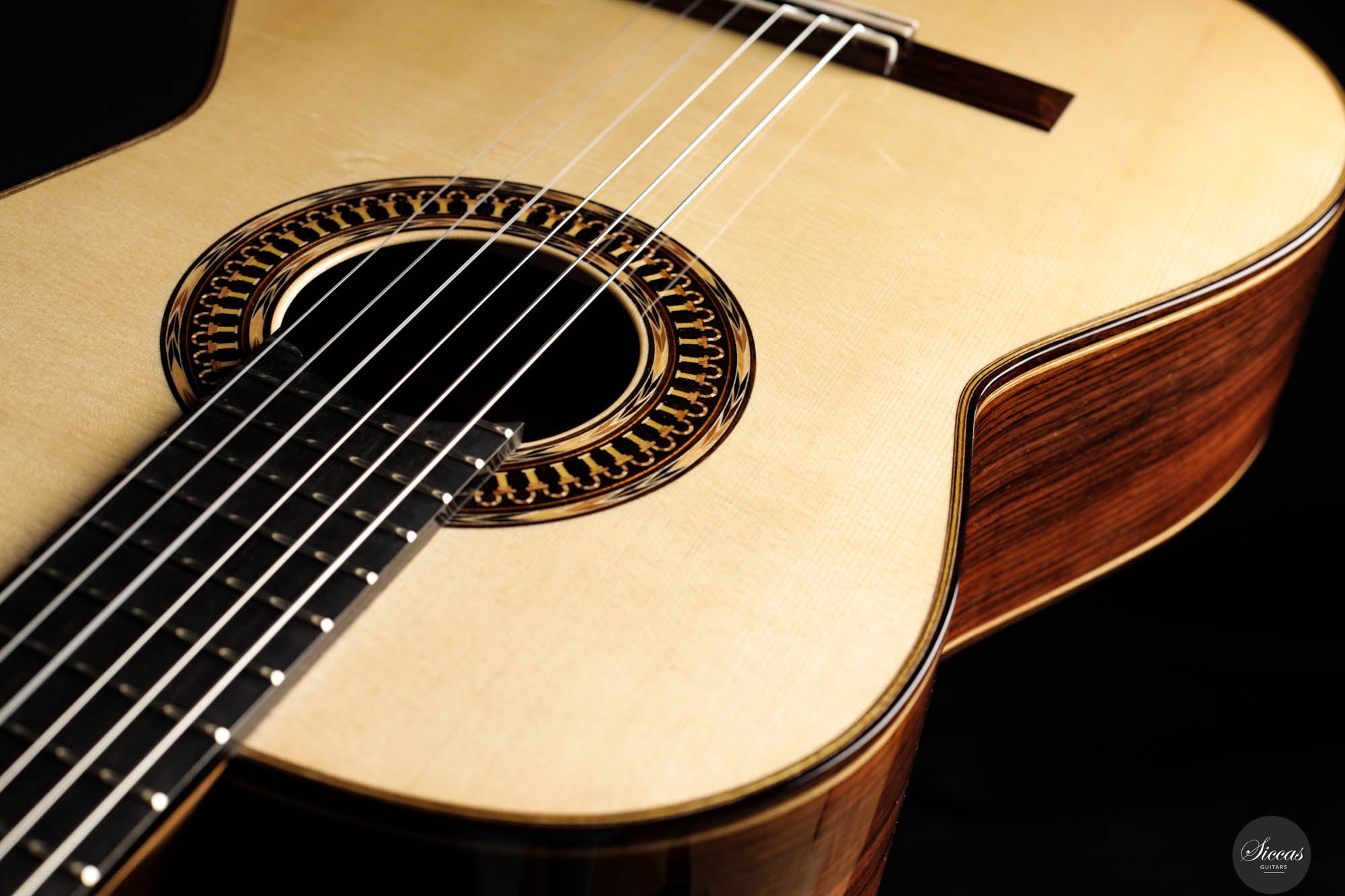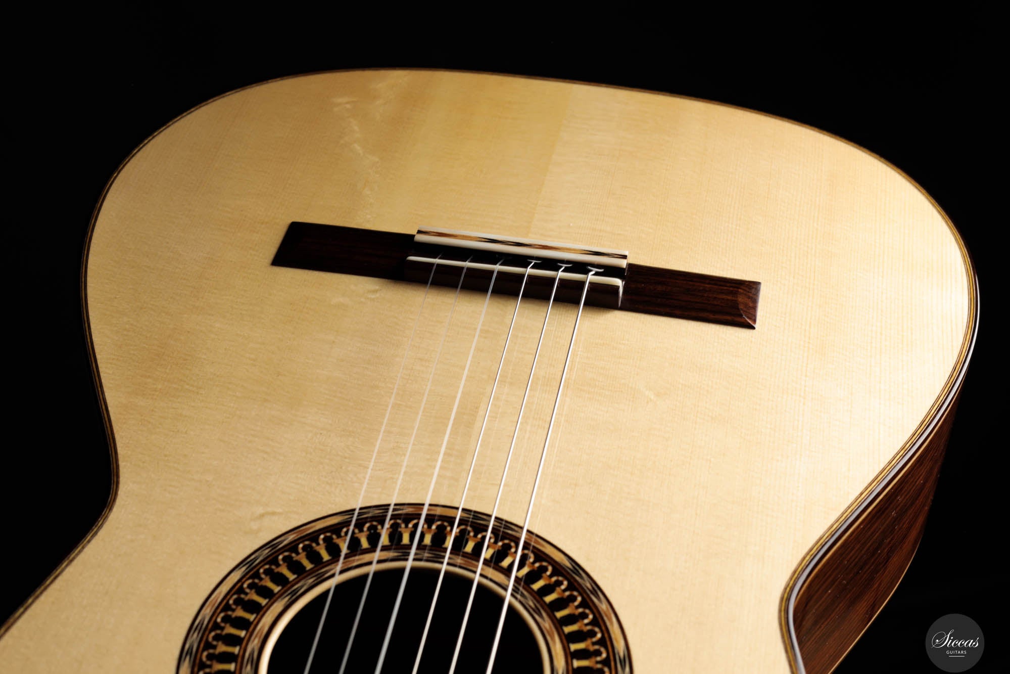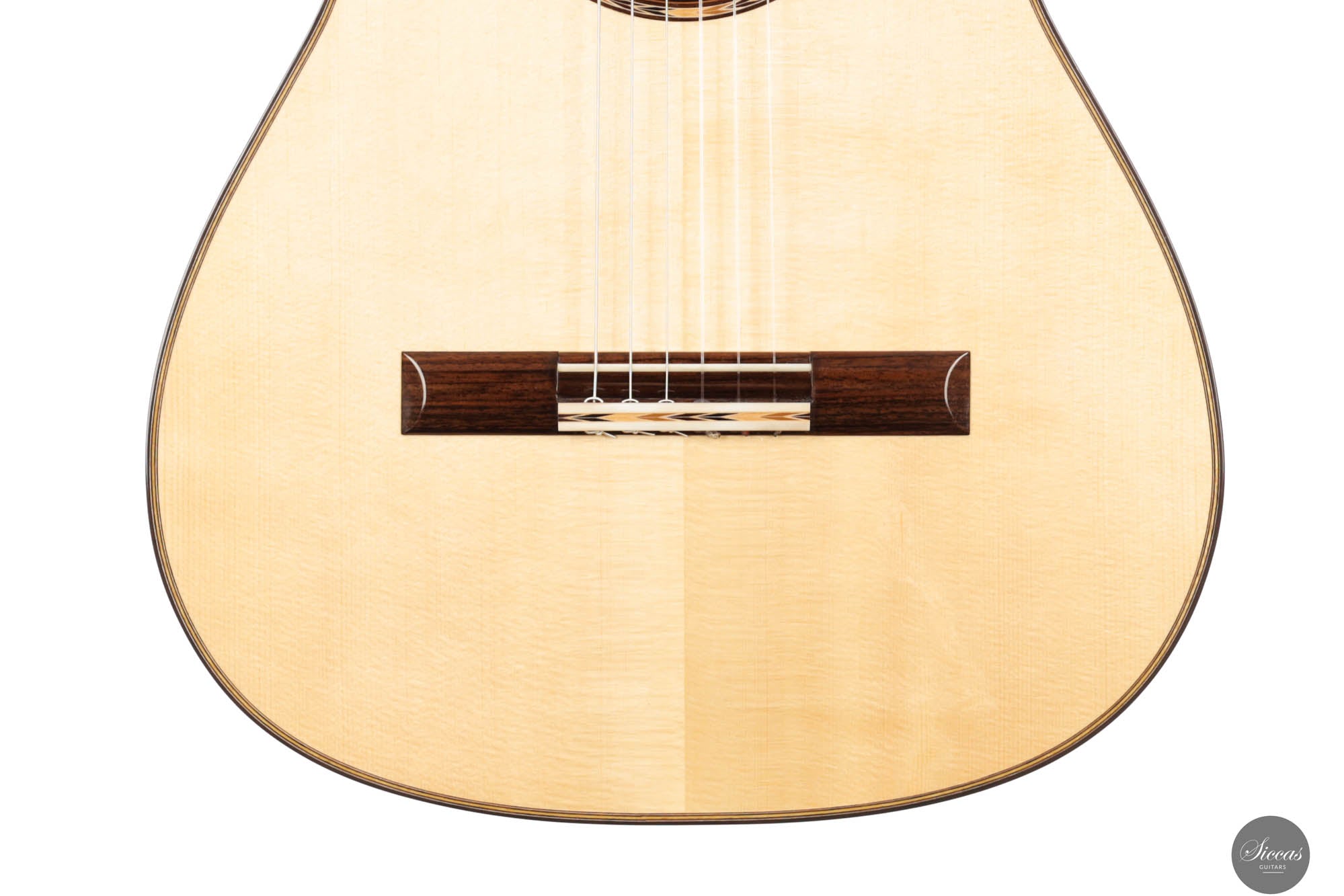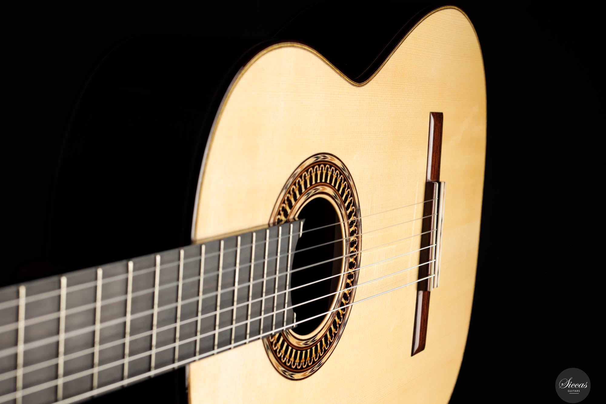 Lucas Romanillos-Modell ist eine Hommage an das Werk des legendären Gitarrenbauers José Luis Romanillos und vereint exzellenten Klang, elegante Ästhetik und meisterhafte Handwerkskunst. Die Gitarre verfügt über eine Decke aus italienischer Alpenfichte aus dem Val di Fiemme, bekannt für ihre Leichtigkeit und Steifigkeit, die dem Instrument einen warmen, reichen und tiefen Klang verleiht. Boden, Zargen, Kopfplatte und Steg bestehen aus hochwertigem indischen Palisander, ergänzt durch ein Griffbrett aus afrikanischem Ebenholz auf einem Hals aus spanischem Zedernholz. Charakteristische Merkmale sind die „Kolonnaden“-Rosette im Stil von Romanillos, inspiriert von der Architektur der Moschee von Cordoba, sowie die markante V-Verbindung zwischen Hals und Kopfplatte. Für die Verzierungen verwendet Luca ausschließlich natürliche Holzfarben und verzichtet bewusst auf gefärbte Furniere. Die Rosette enthält sieben verschiedene Holzarten, die ein filigranes Muster ergeben. Diese Gitarre beeindruckt mit einem resonanten Klang, wobei die E/F-Korpusresonanz die warmen Bässe betont, während die Höhen mit Klarheit und Brillanz projizieren. Lucas ganzheitlicher Ansatz stellt sicher, dass alle Teile des Instruments harmonisch schwingen und so eine ausgewogene und ausdrucksstarke Klangpalette erzeugen.