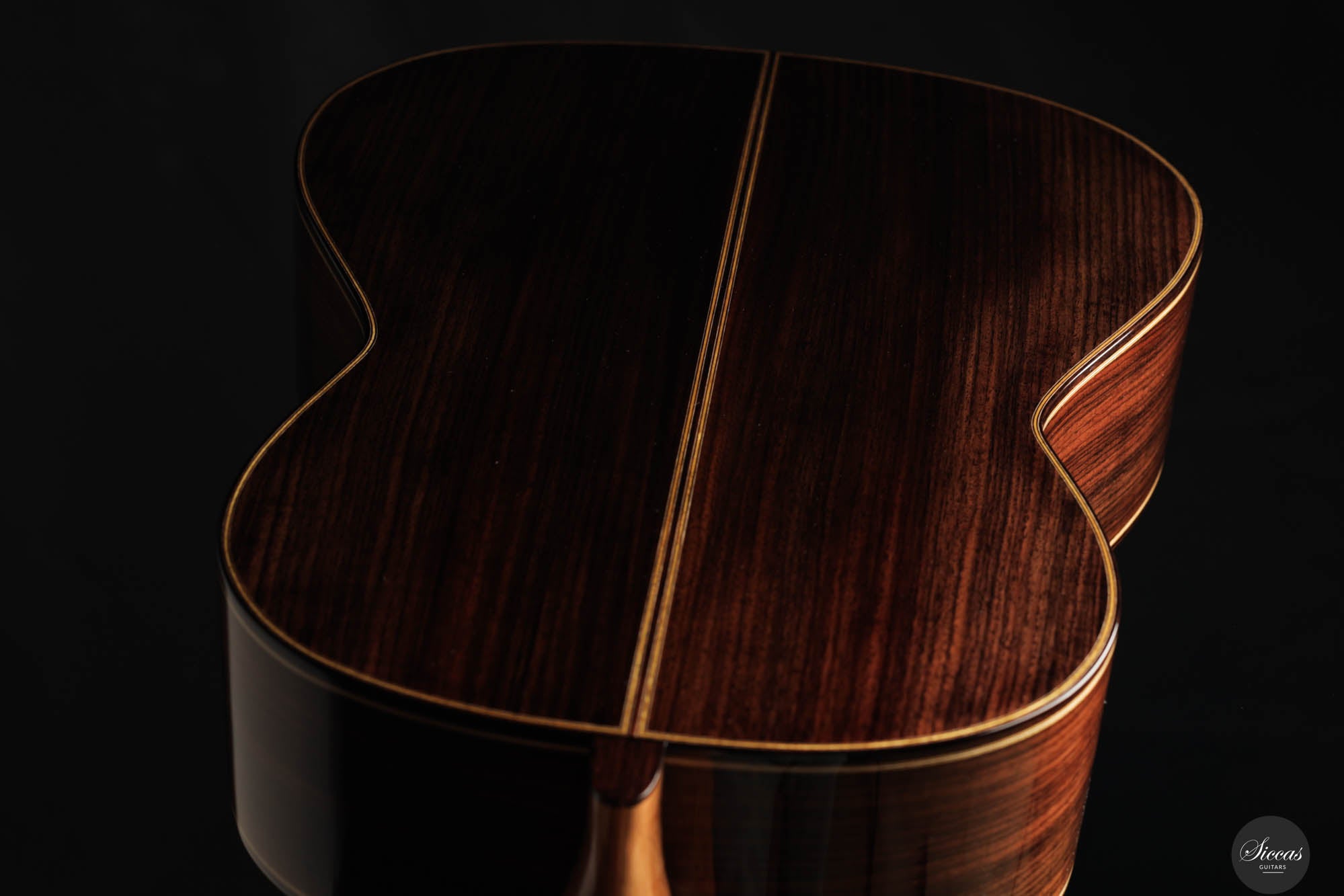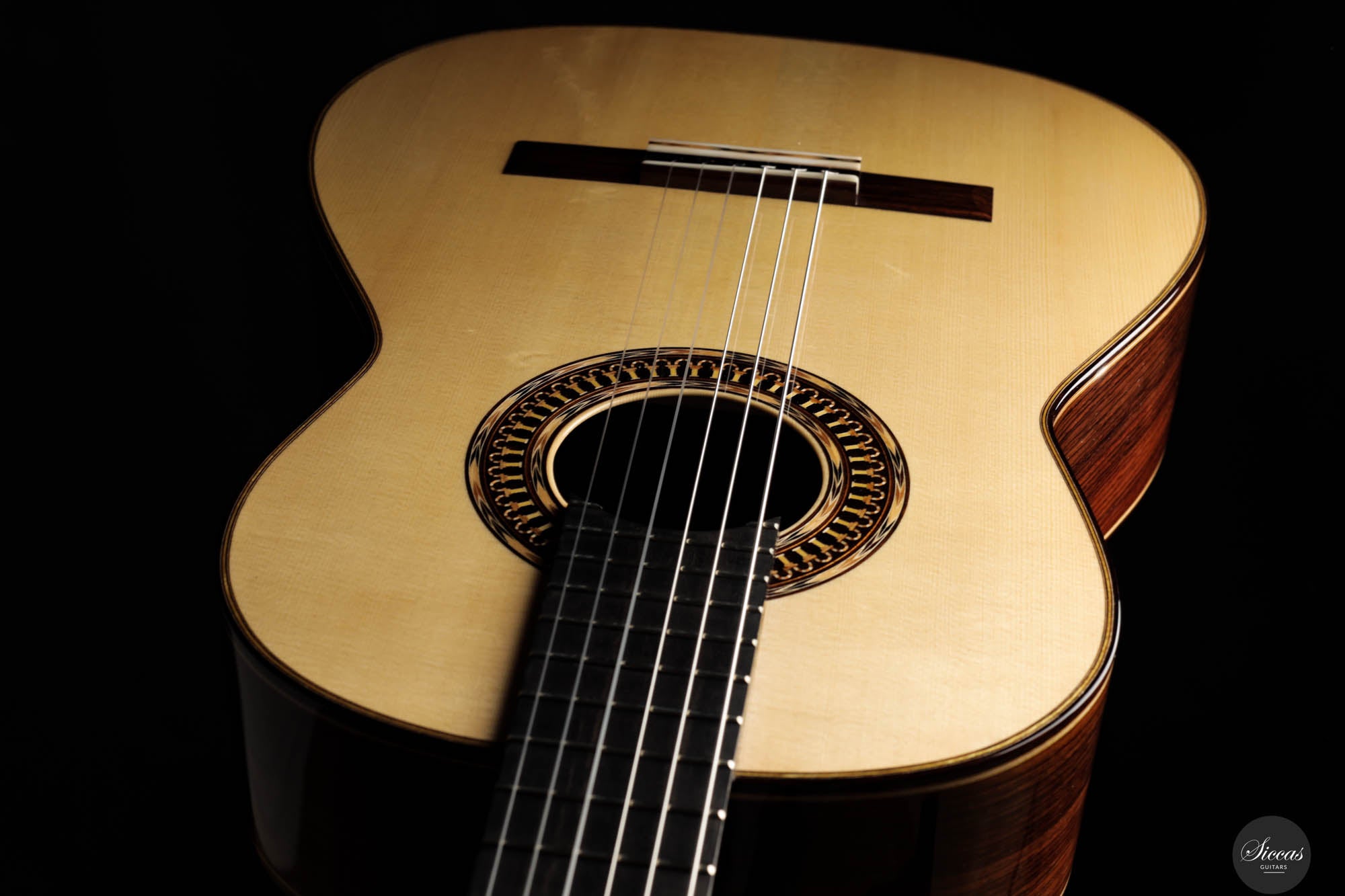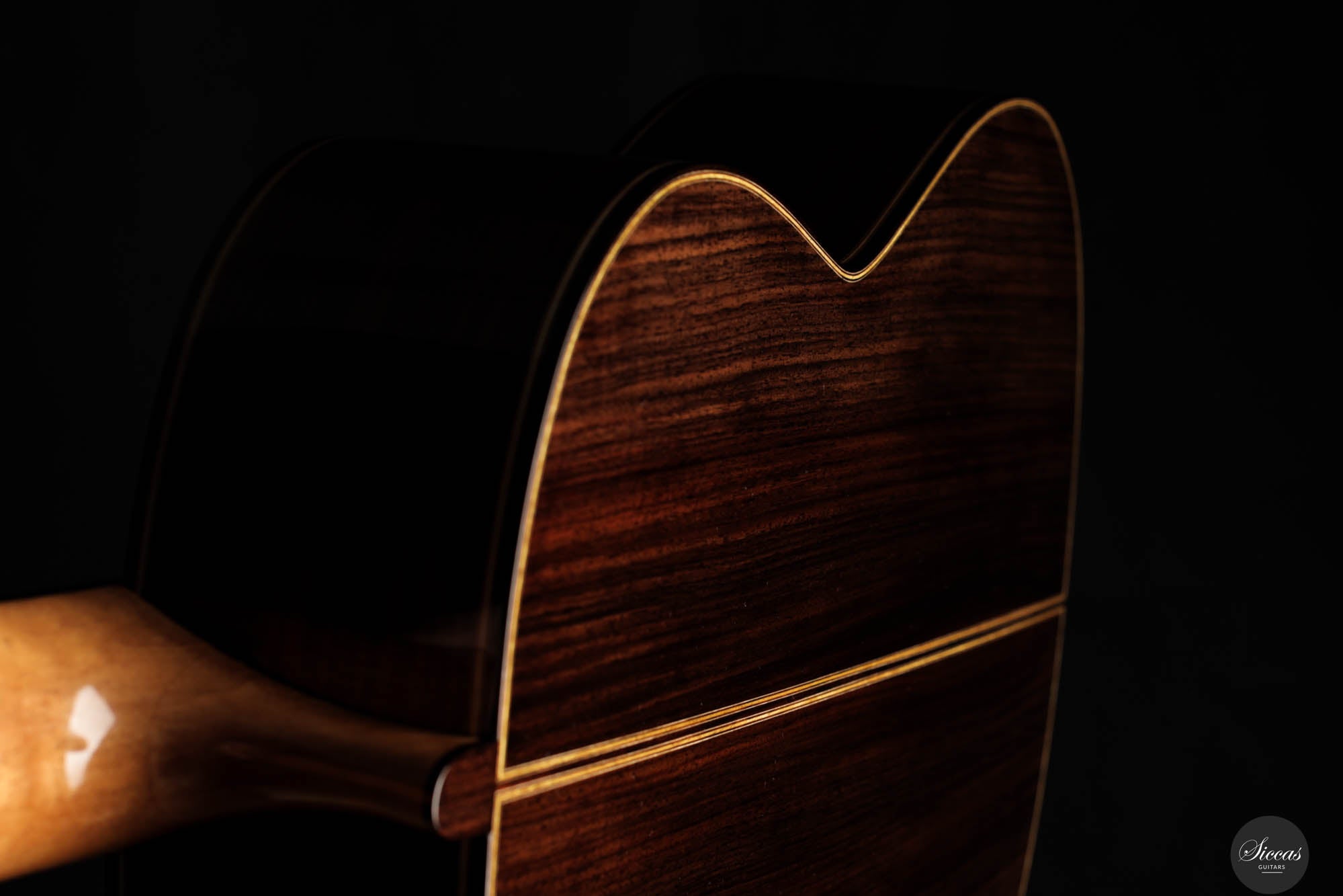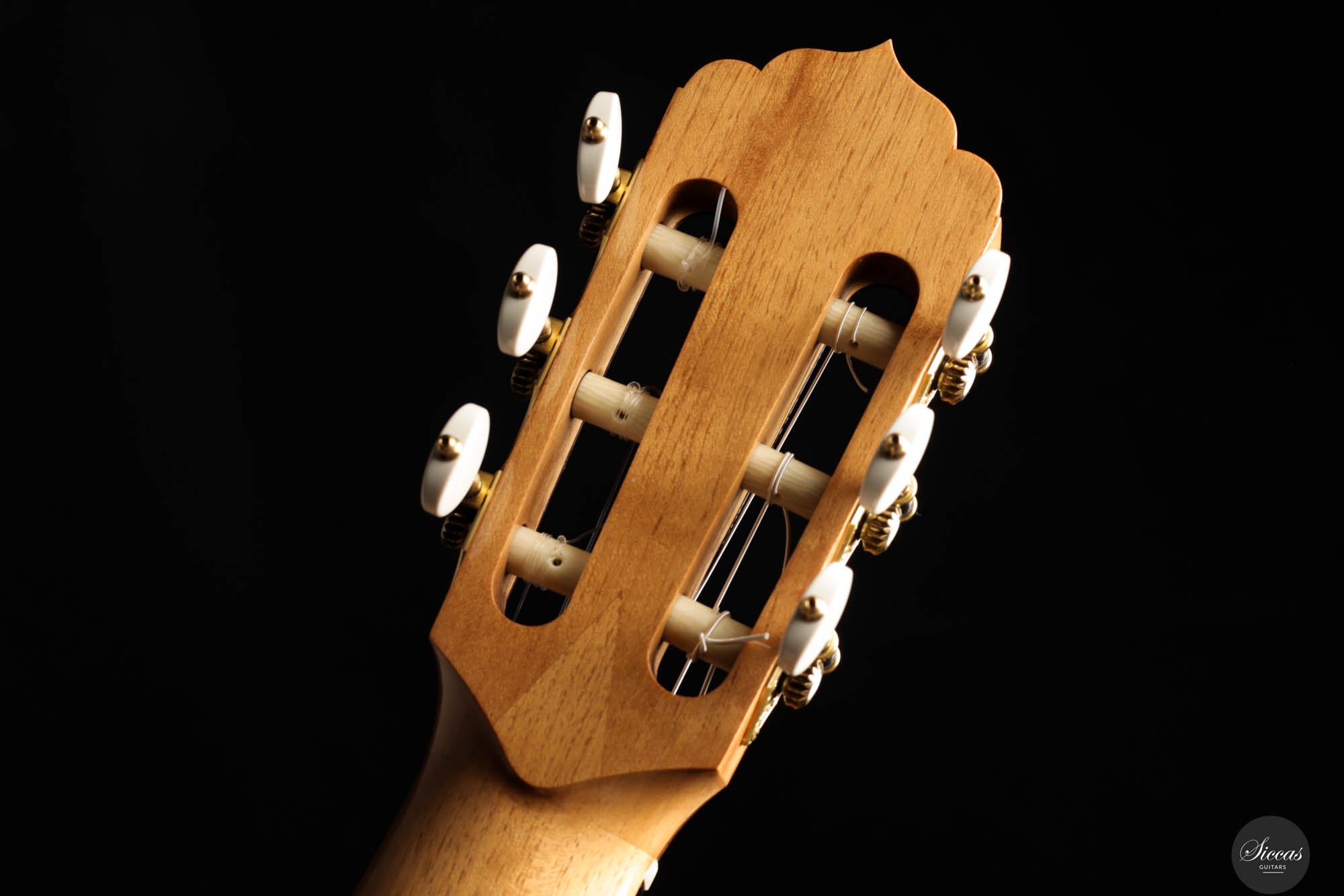 Lucas Romanillos-Modell ist eine Hommage an das Werk des legendären Gitarrenbauers José Luis Romanillos und vereint exzellenten Klang, elegante Ästhetik und meisterhafte Handwerkskunst. Die Gitarre verfügt über eine Decke aus italienischer Alpenfichte aus dem Val di Fiemme, bekannt für ihre Leichtigkeit und Steifigkeit, die dem Instrument einen warmen, reichen und tiefen Klang verleiht. Boden, Zargen, Kopfplatte und Steg bestehen aus hochwertigem indischen Palisander, ergänzt durch ein Griffbrett aus afrikanischem Ebenholz auf einem Hals aus spanischem Zedernholz. Charakteristische Merkmale sind die „Kolonnaden“-Rosette im Stil von Romanillos, inspiriert von der Architektur der Moschee von Cordoba, sowie die markante V-Verbindung zwischen Hals und Kopfplatte. Für die Verzierungen verwendet Luca ausschließlich natürliche Holzfarben und verzichtet bewusst auf gefärbte Furniere. Die Rosette enthält sieben verschiedene Holzarten, die ein filigranes Muster ergeben. Diese Gitarre beeindruckt mit einem resonanten Klang, wobei die E/F-Korpusresonanz die warmen Bässe betont, während die Höhen mit Klarheit und Brillanz projizieren. Lucas ganzheitlicher Ansatz stellt sicher, dass alle Teile des Instruments harmonisch schwingen und so eine ausgewogene und ausdrucksstarke Klangpalette erzeugen.