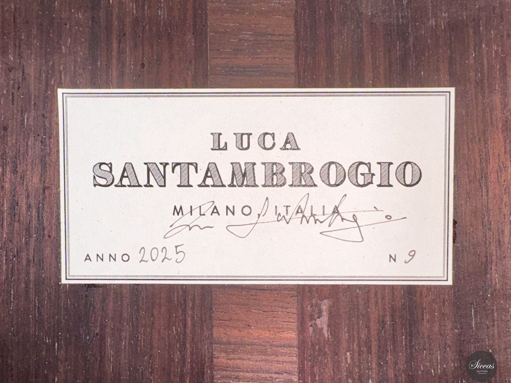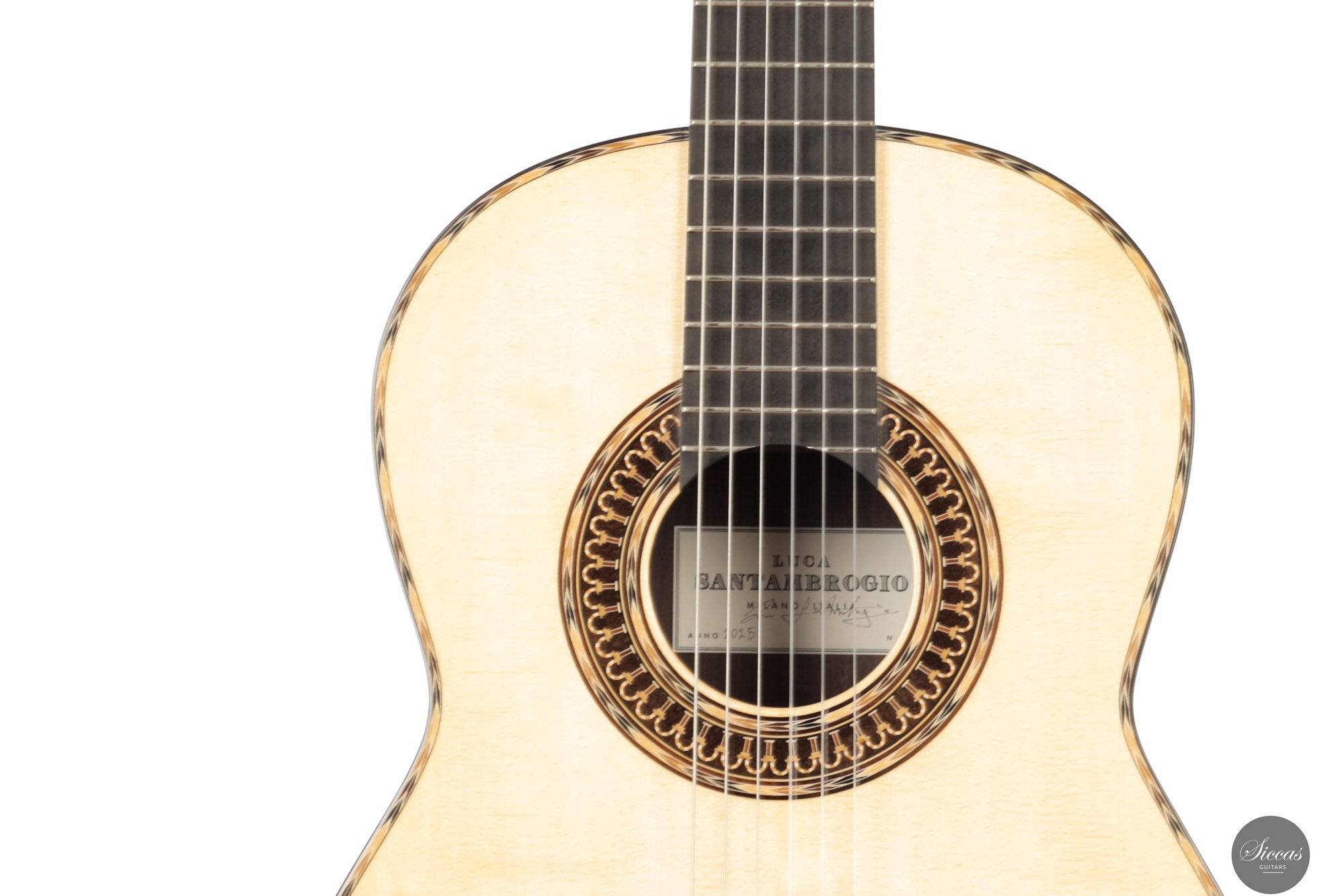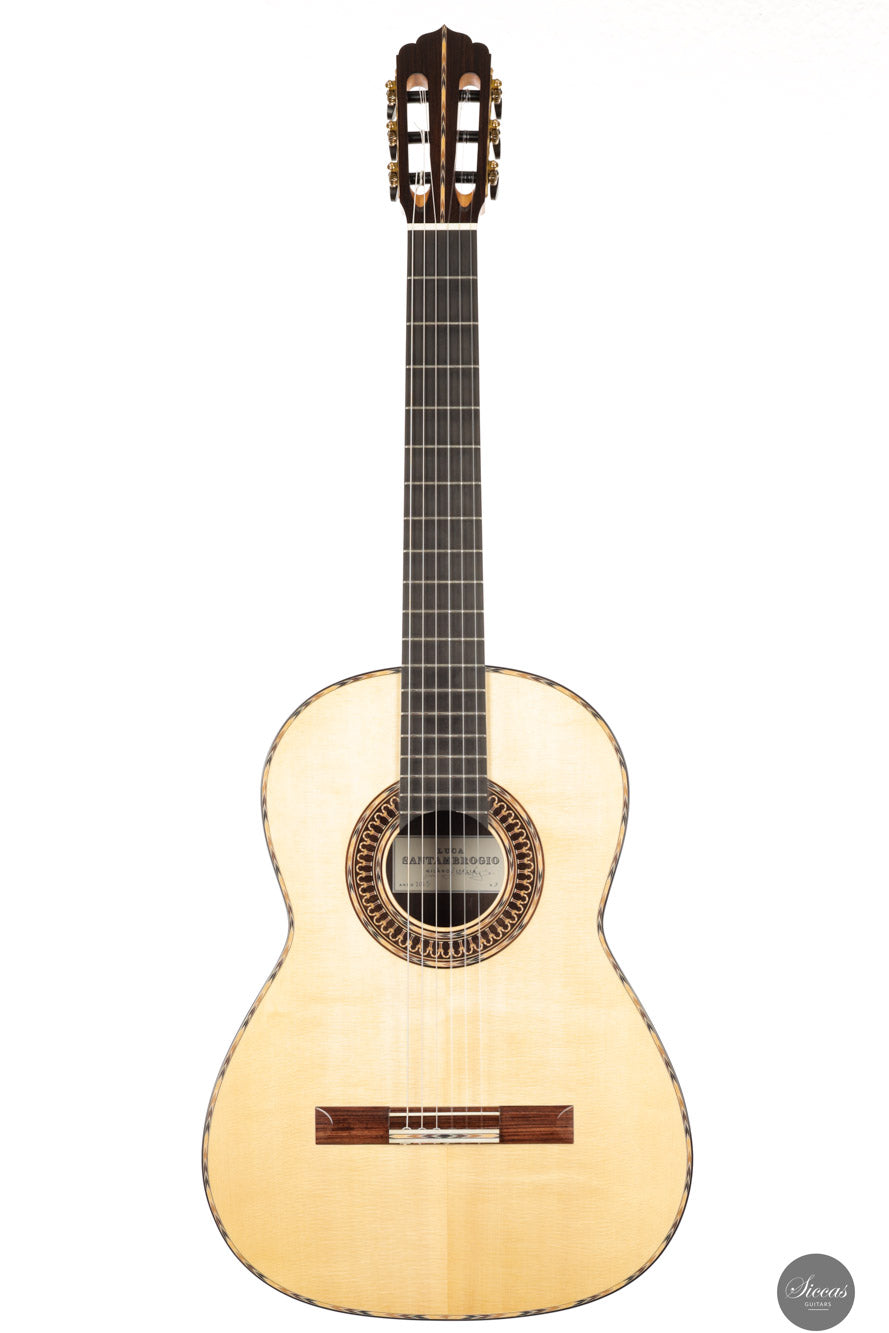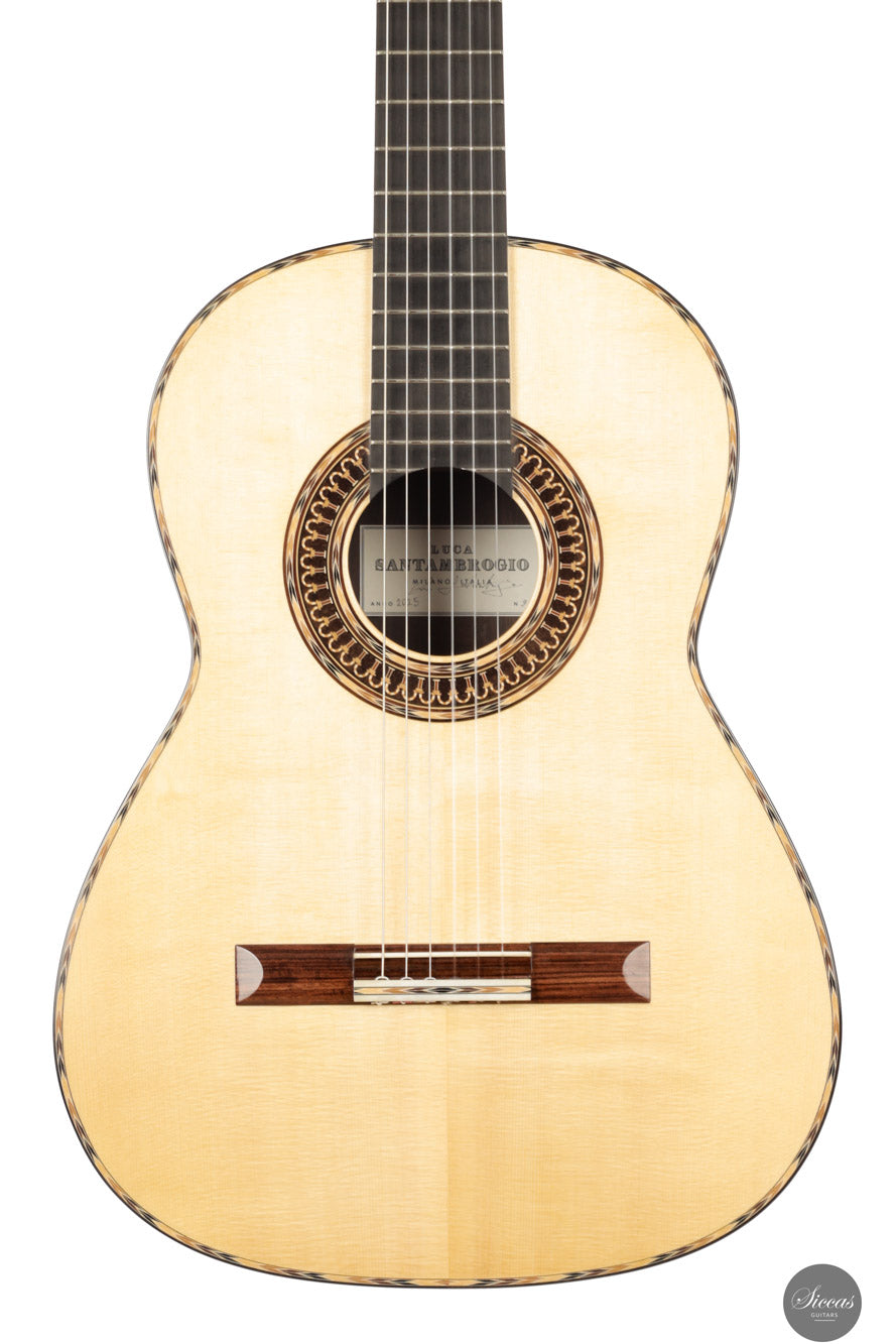 Luca Santambrogio wurde 1995 in Desio geboren, einer kleinen Stadt in der Region Brianza in Norditalien, die für ihre ausgeprägte Handwerkskultur bekannt ist. Nach seinem Abschluss in Industriedesign wandte er sich der Gitarrenbaukunst zu und studierte an der Civica Scuola di Liuteria di Milano, wo er 2022 seinen Abschluss machte. Während seiner Ausbildung arbeitete Luca unter der Anleitung des Meisterbauers Roberto De Miranda und entwickelte ein solides Fundament im klassischen Gitarrenbau sowie eine tiefe Wertschätzung für traditionelle spanische Bauweisen. Später verfeinerte er seine Fähigkeiten unter der Mentorschaft von Marco Bortolozzo in Mailand und konzentrierte sich dabei auf Klangqualität, strukturelle Leichtigkeit und ästhetische Sorgfalt. Heute baut er seine Gitarren in Mailand, inspiriert von spanischen Meistern wie Antonio de Torres und José Luis Romanillos.
