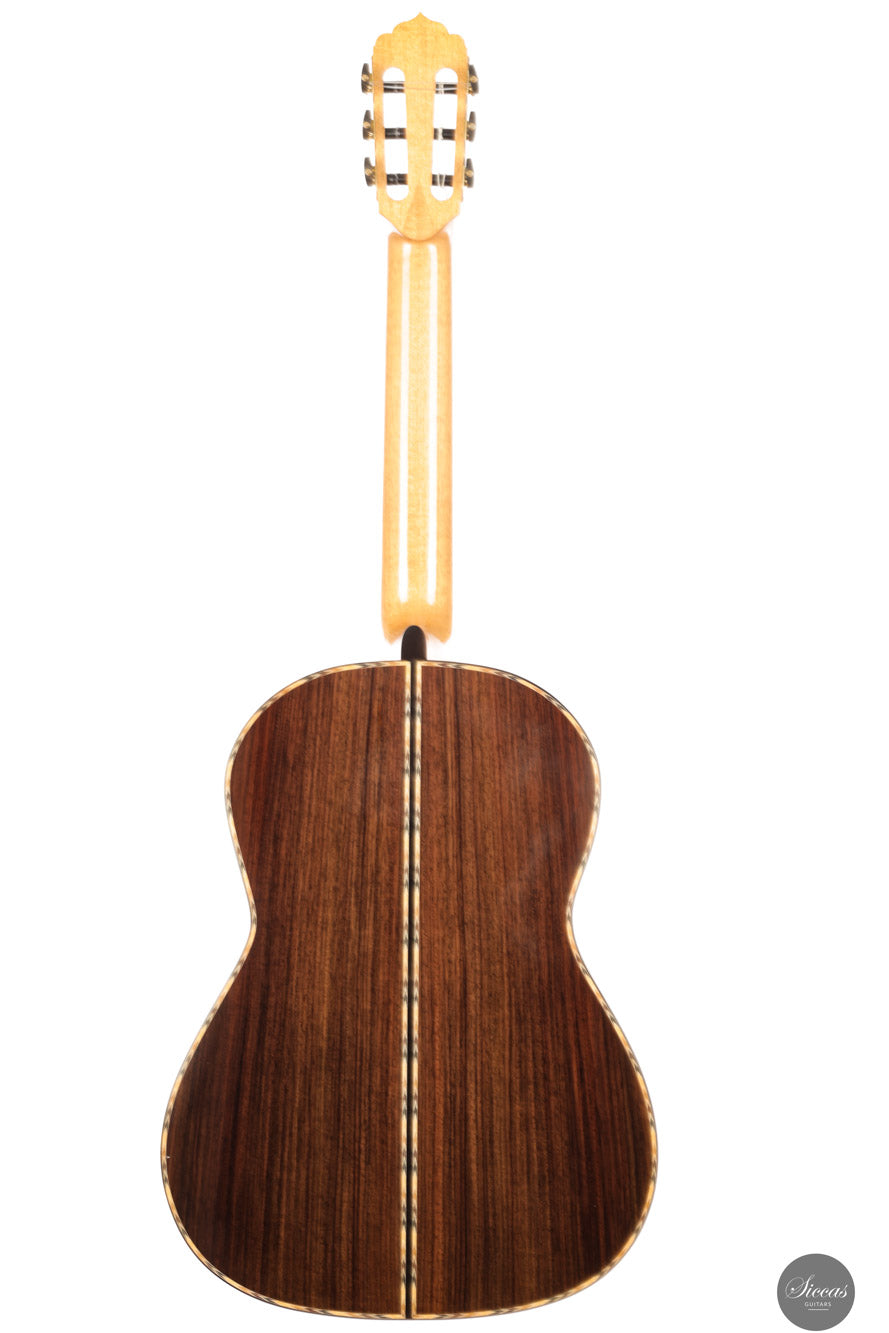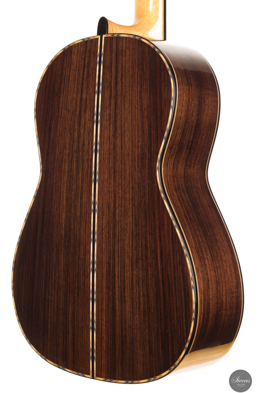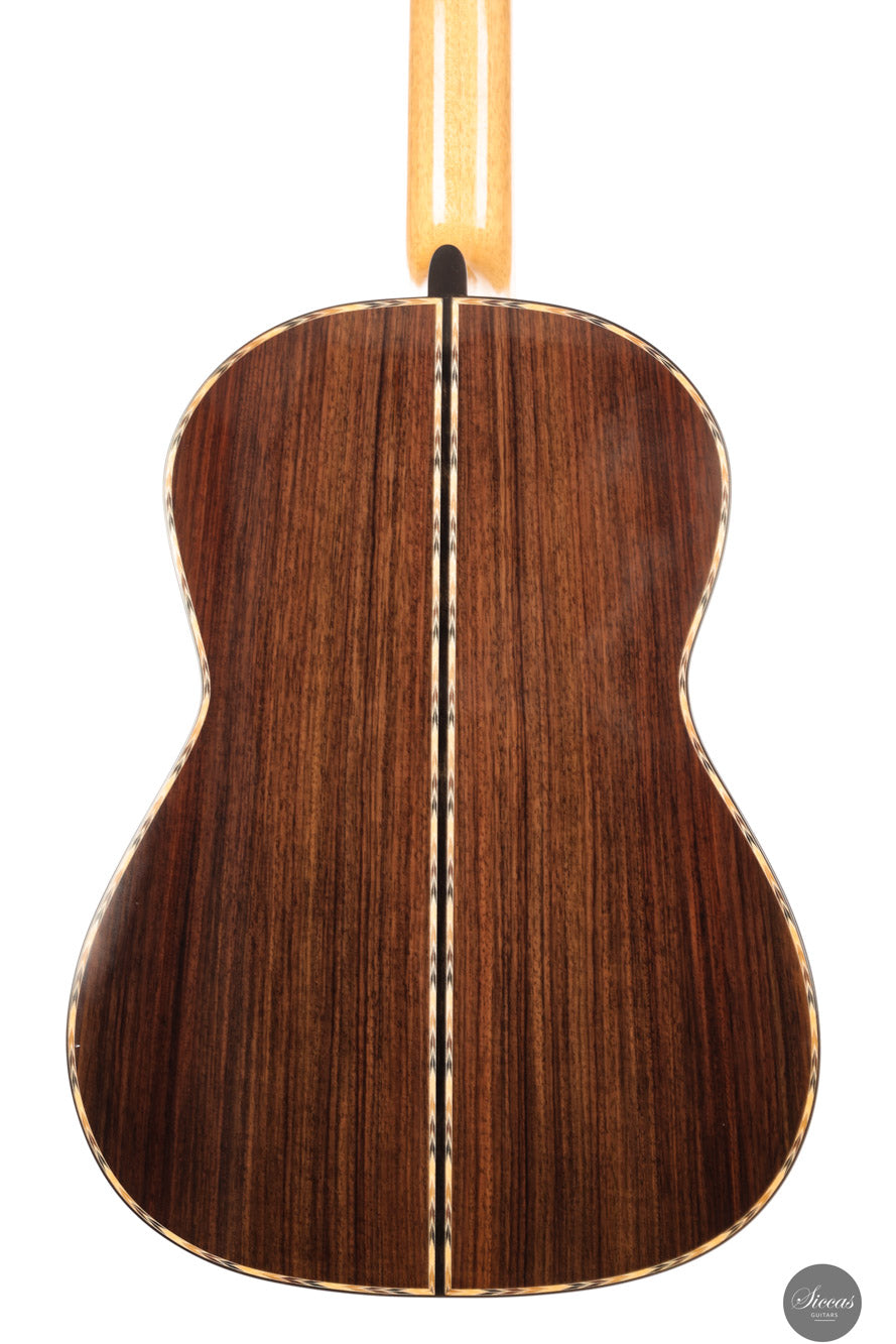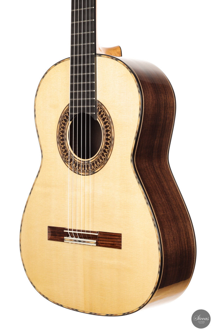 Diese Romanillos Modell Nr. 9 aus dem Jahr 2025 markiert einen bedeutenden Schritt in der künstlerischen und technischen Entwicklung von Luca Santambrogio. Die Gitarre verfügt über eine hochwertige italienische Fichtendecke aus dem Val di Fiemme sowie über einen wunderschön gemaserten Satz indischen Palisanders für Boden und Zargen. Der Hals besteht aus viertelgesägtem spanischem Zedernholz und ist mit einem traditionellen V-Falz mit der Kopfplatte verbunden. Griffbrett aus Ebenholz und Steg aus Madagascar-Palisander sorgen für strukturelle Stabilität und visuelle Harmonie.