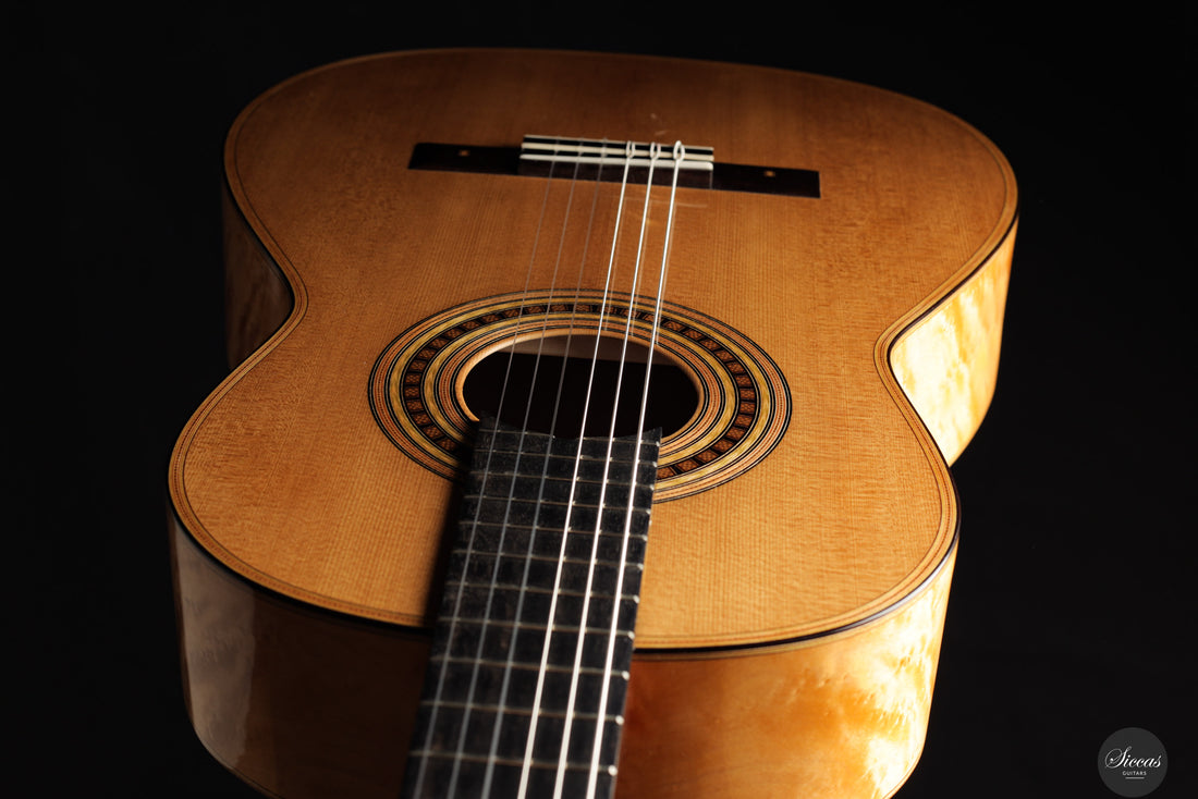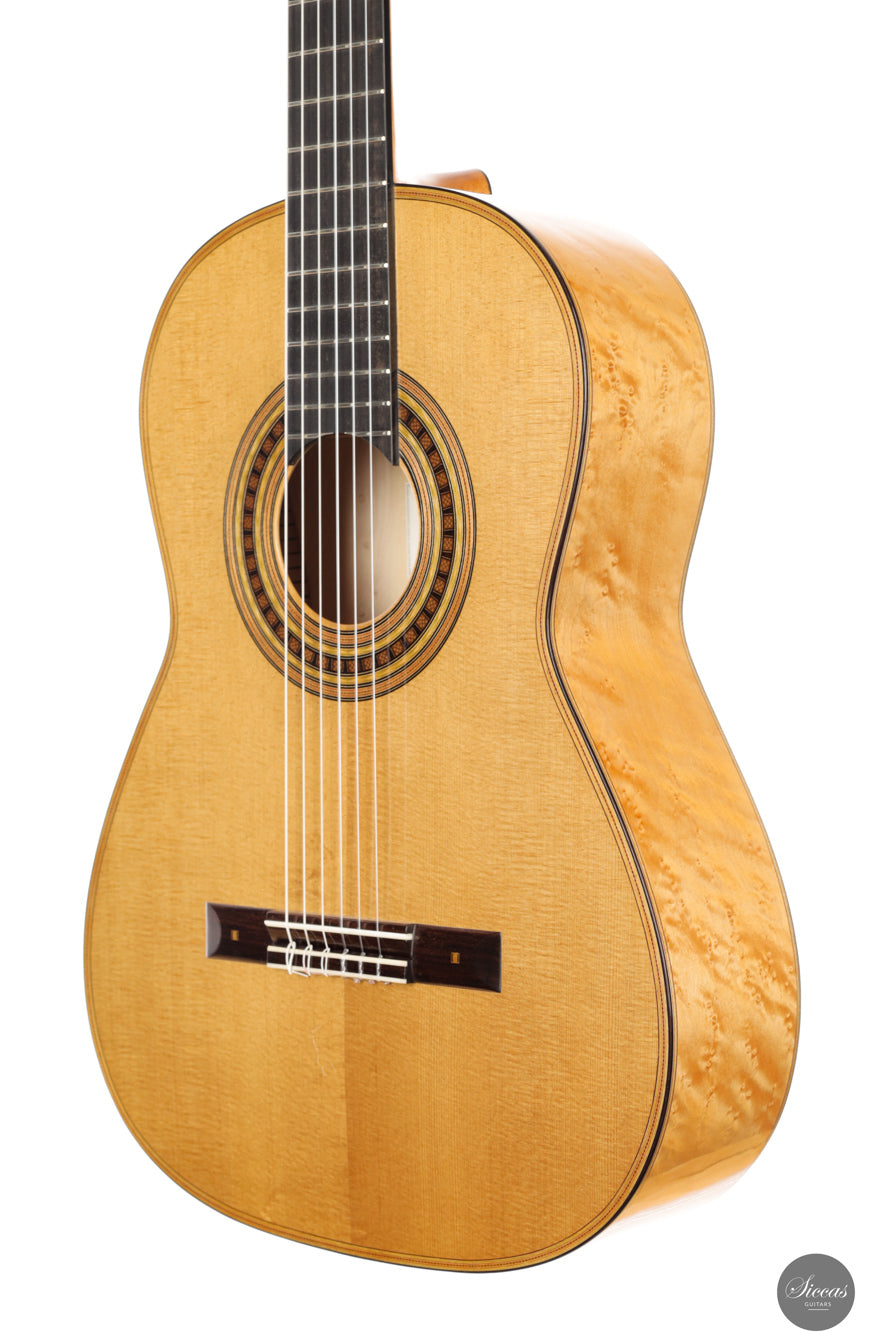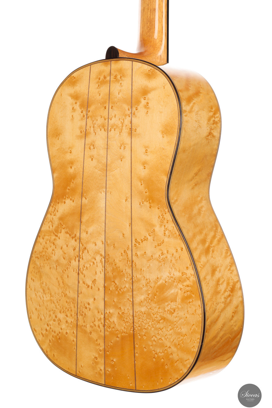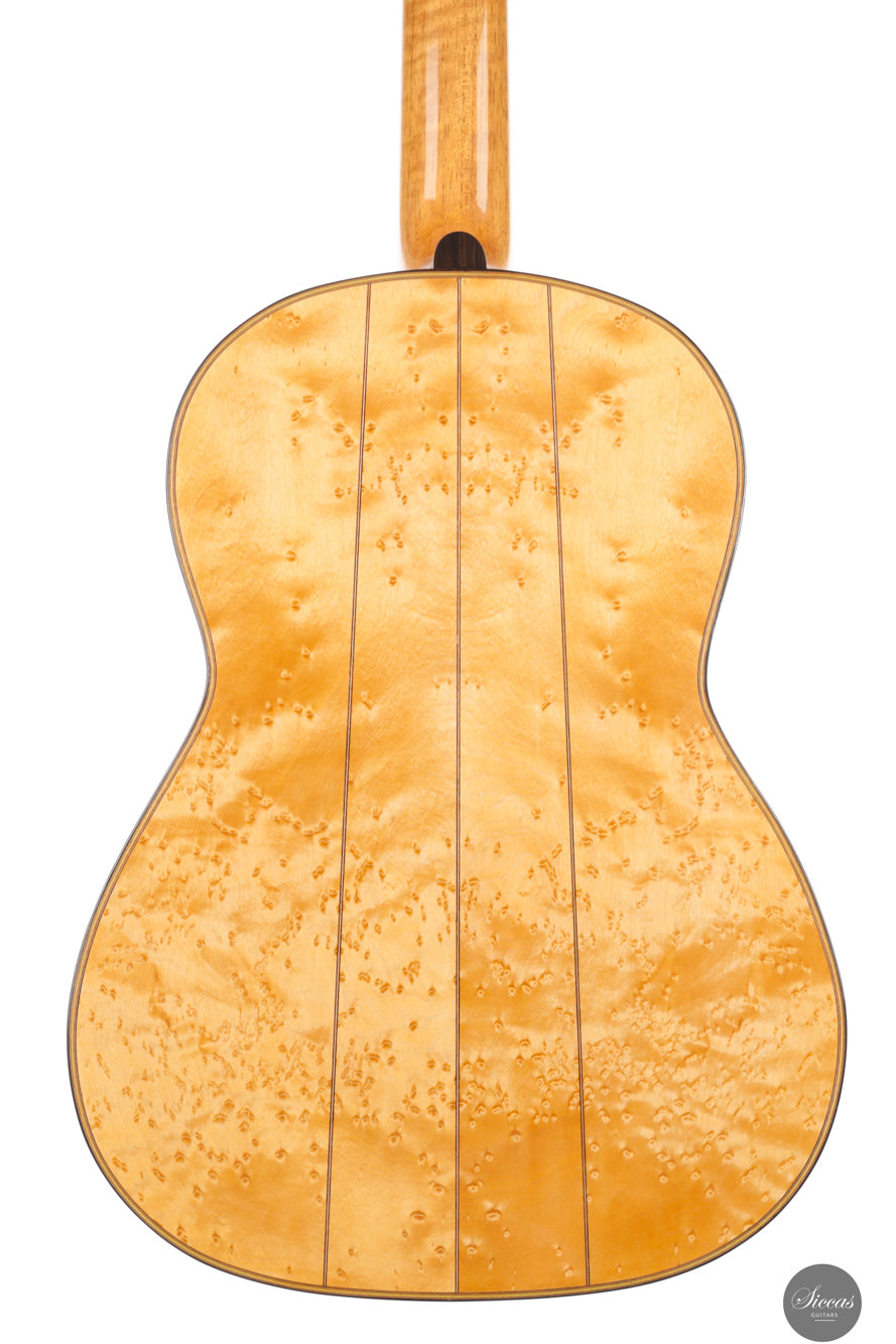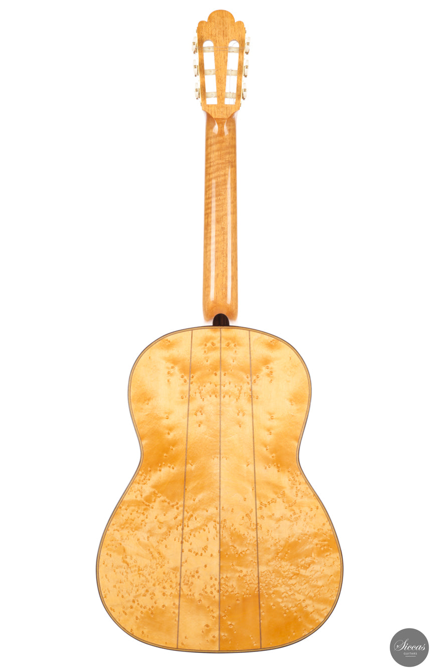 Dieses traditionelle Modell von Luca Santambrogio aus dem Jahr 2025 ist eine Hommage an die Torres-Gitarre FE24 und wurde als leichtgewichtiges, historisch bewusstes Instrument konzipiert. Mit nur 1190 Gramm Gewicht orientiert sich die Konstruktion eng am Original. Die Fichtendecke wird von Boden und Zargen aus Vogelaugenahorn ergänzt – nicht wegen gezielter klanglicher Eigenschaften, sondern in bewusster Anlehnung an das historische Vorbild. Zwar verfügt dieses Instrument nicht über einen Tornavoz wie das Original, erreicht jedoch dennoch eine ähnlich tiefe Eigenresonanz im Bereich Dis bis E. Der Klang ist offen, gesanglich und ausgewogen mit warmer Abklingphase. Es handelt sich nicht um eine Kopie, sondern um eine freie, respektvolle Annäherung: Die Gitarre würdigt die klanglichen und ästhetischen Ideale von Torres und setzt sie mit Santambrogios gestalterischer Handschrift um. Das Ergebnis ist ein feinsinniges Instrument mit historisch geprägtem Charakter und klarem Ausdruck.