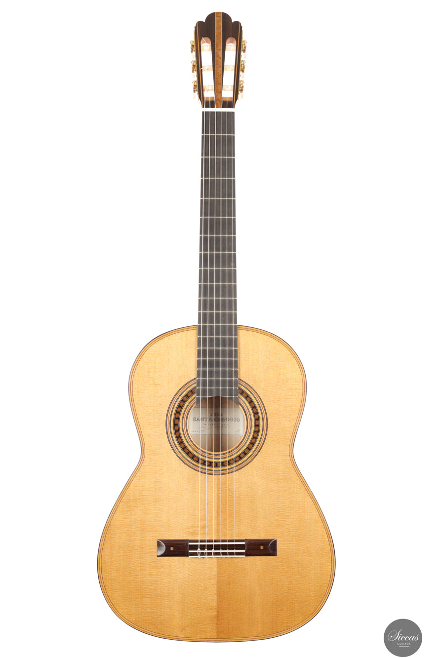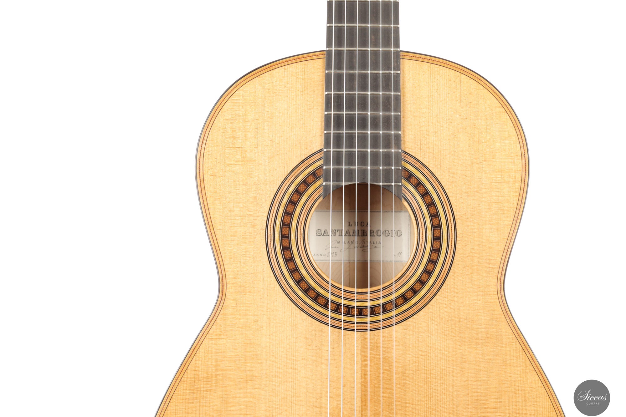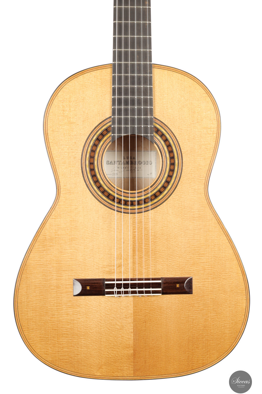 Luca Santambrogio, geboren 1995 in Desio in Norditalien, stammt aus einer Region mit ausgeprägter handwerklicher Tradition. Nach einem Studium des Industriedesigns wandte er sich dem Gitarrenbau zu und schloss 2022 seine Ausbildung an der Civica Scuola di Liuteria di Milano ab. Er lernte zunächst bei Roberto De Miranda und vertiefte seine Ausbildung später unter der Anleitung von Marco Bortolozzo, wobei er besonderes Augenmerk auf klangliche Finesse, strukturelle Leichtigkeit und ästhetische Präzision legte. Heute arbeitet Santambrogio eigenständig in Mailand und orientiert sich an den Vorbildern spanischer Meister wie Antonio de Torres und José Luis Romanillos. Seine Instrumente verbinden traditionelle Baukonzepte mit moderner gestalterischer Disziplin.