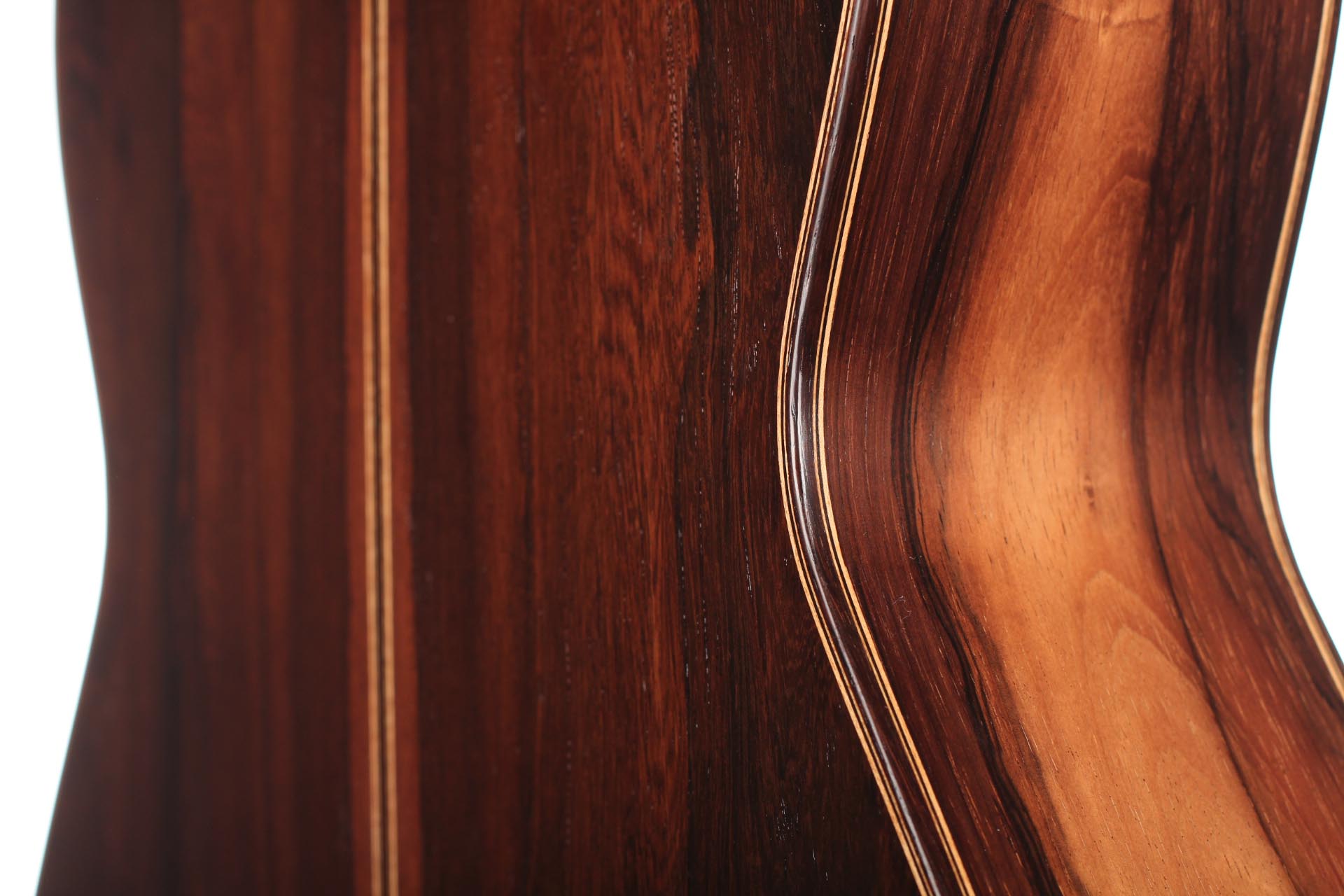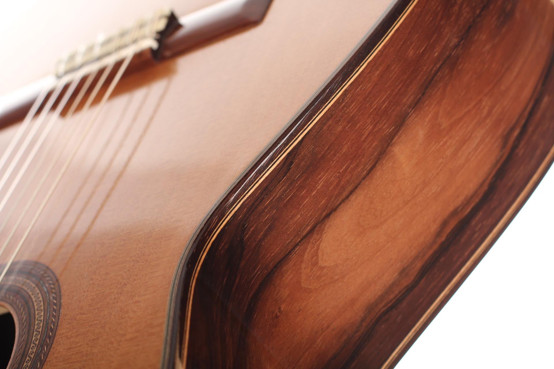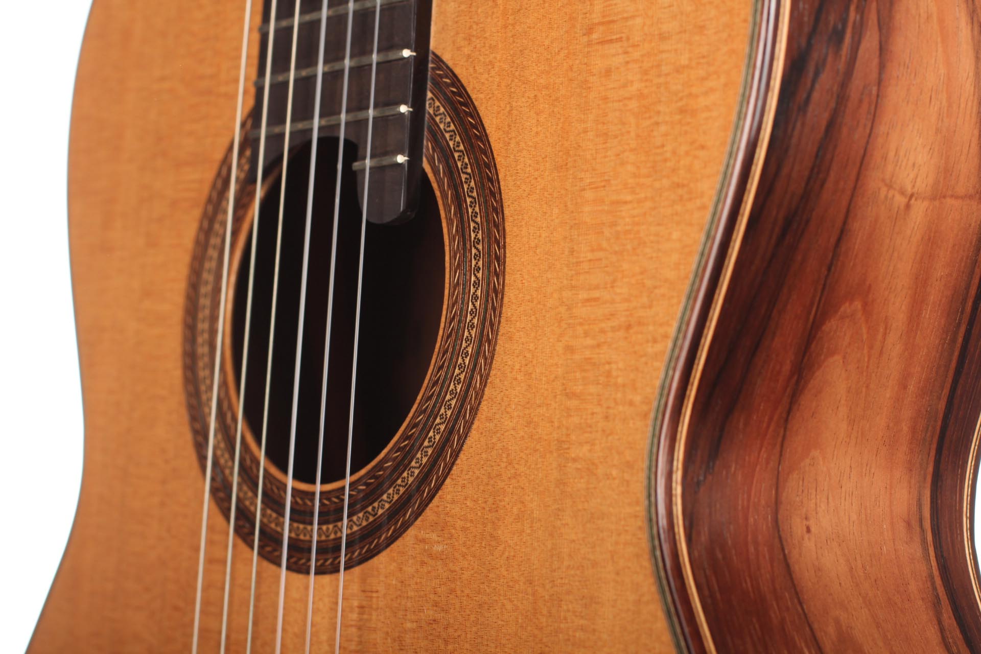 Diese Lucas & Hanson N3 Gitarre wurde im Jahr 2013 auf traditionelle Weise gebaut (sieben Fächerleisten). Die Decke wurde aus feinjähriger Zeder gefertig und der Boden sowie die Zargen sind aus Madagaskar Palisander. Die Gitarre hat ein sehr leichtes Gewicht. Beim Spielen spricht die Gitarre sofort an und ist sehr leicht zu spielen. Der Diskant ist ausgesprochen klar für eine Zederngitarre und erinnert eher an den Klang einer Gitarre mit Fichtenholzdecke. Insgesamt klingt das Instrument sehr kräftig und offen. Die Höhen, Mitten und die Bässe sind sehr gut aufeinander abgestimmt. Der Klang dieser Gitarre wird Ihnen ein Lächeln in Ihr Gesicht zaubern. Die Mechaniken sind von Perona. Ein Hartschalenkoffer ist inklusive.