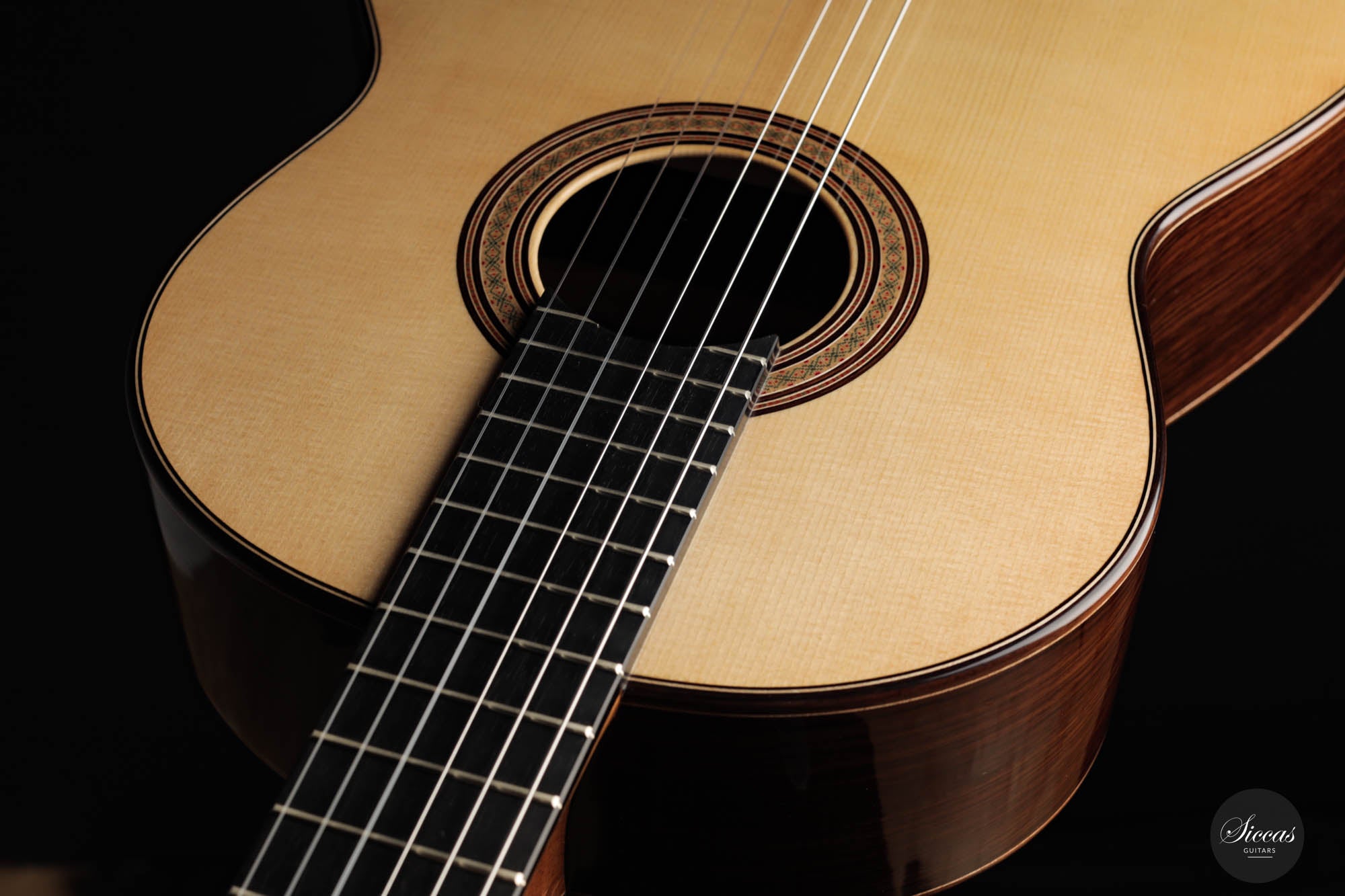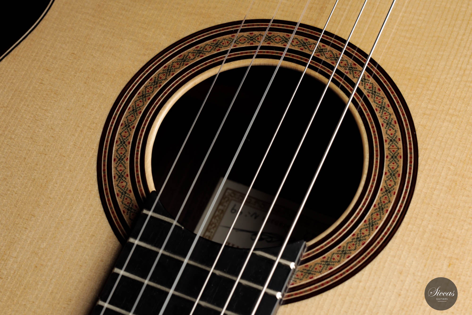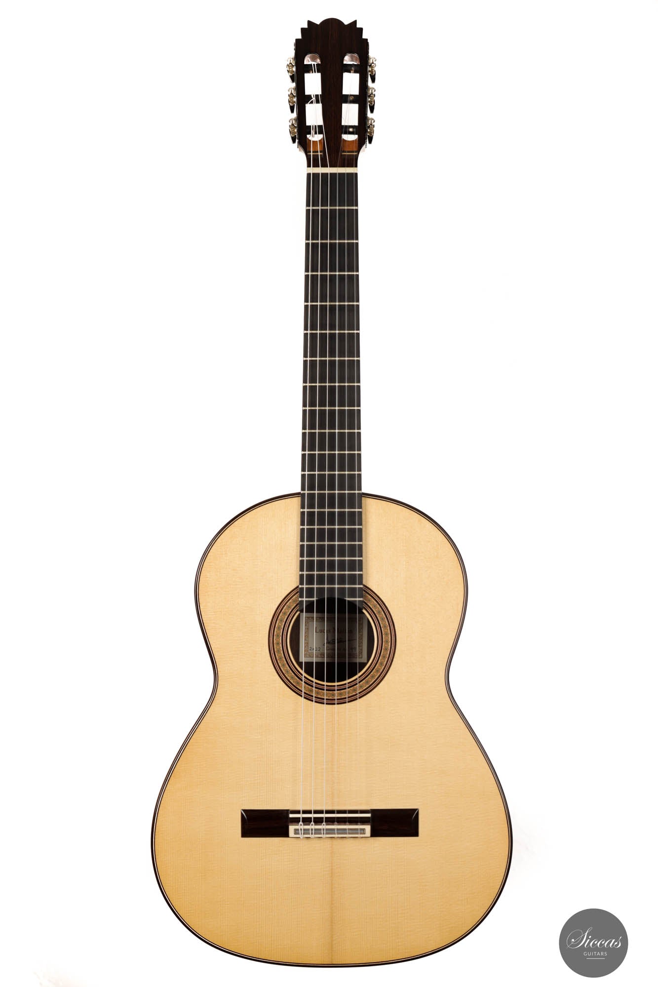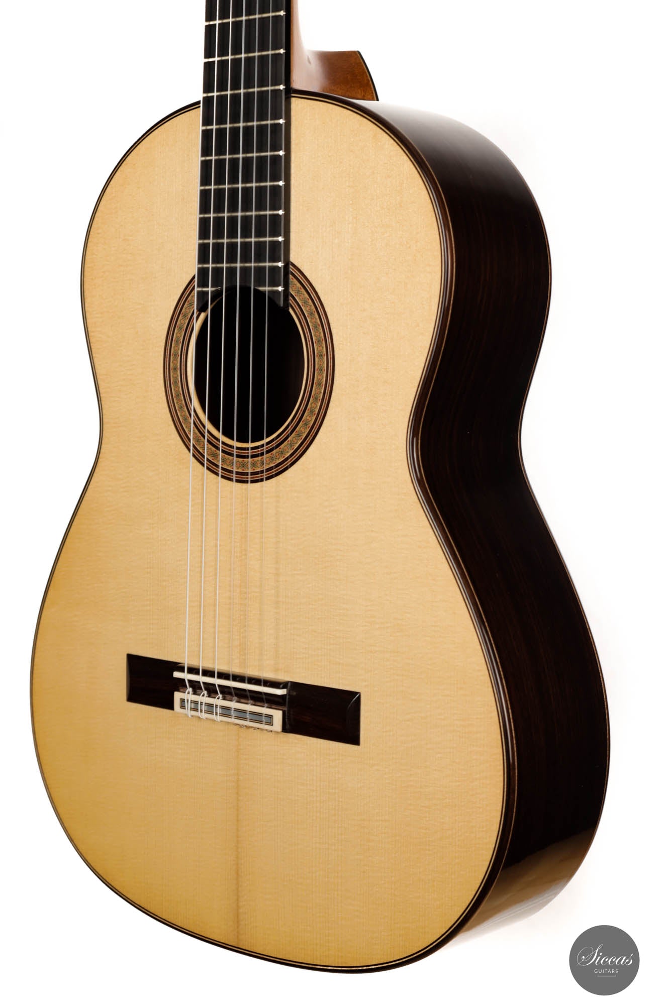 Die 2023 Lucas Martin No. 99 Gitarre, gekennzeichnet durch die "99", hat eine Fichtendecke und Boden und Zargen aus indischem Palisander. Diese traditionelle spanische Gitarre zeigt die zeitlose Handwerkskunst des Gitarrenbauers. Die Fichtendecke dieser Gitarre wurde sorgfältig nach ihren klanglichen Eigenschaften ausgewählt, zu denen knackige und klare Höhen, warme und satte Bässe und ausgewogene Mitten gehören. Der Boden und die Zargen aus indischem Palisander sorgen für eine tiefe, resonante Basswiedergabe, freundliche, üppige Mitten und funkelnde Obertöne in den Höhen. Die Kombination aus Fichte und indischem Palisander erzeugt einen ausgewogenen und nuancierten Klang mit einem dynamischen Bereich, der sensibel auf den Anschlag des Spielers reagiert. Diese Gitarre ist ein wahres Kunstwerk und wird die Spieler mit ihrem traditionellen spanischen Gitarrendesign und ihrer außergewöhnlichen Klangqualität begeistern.