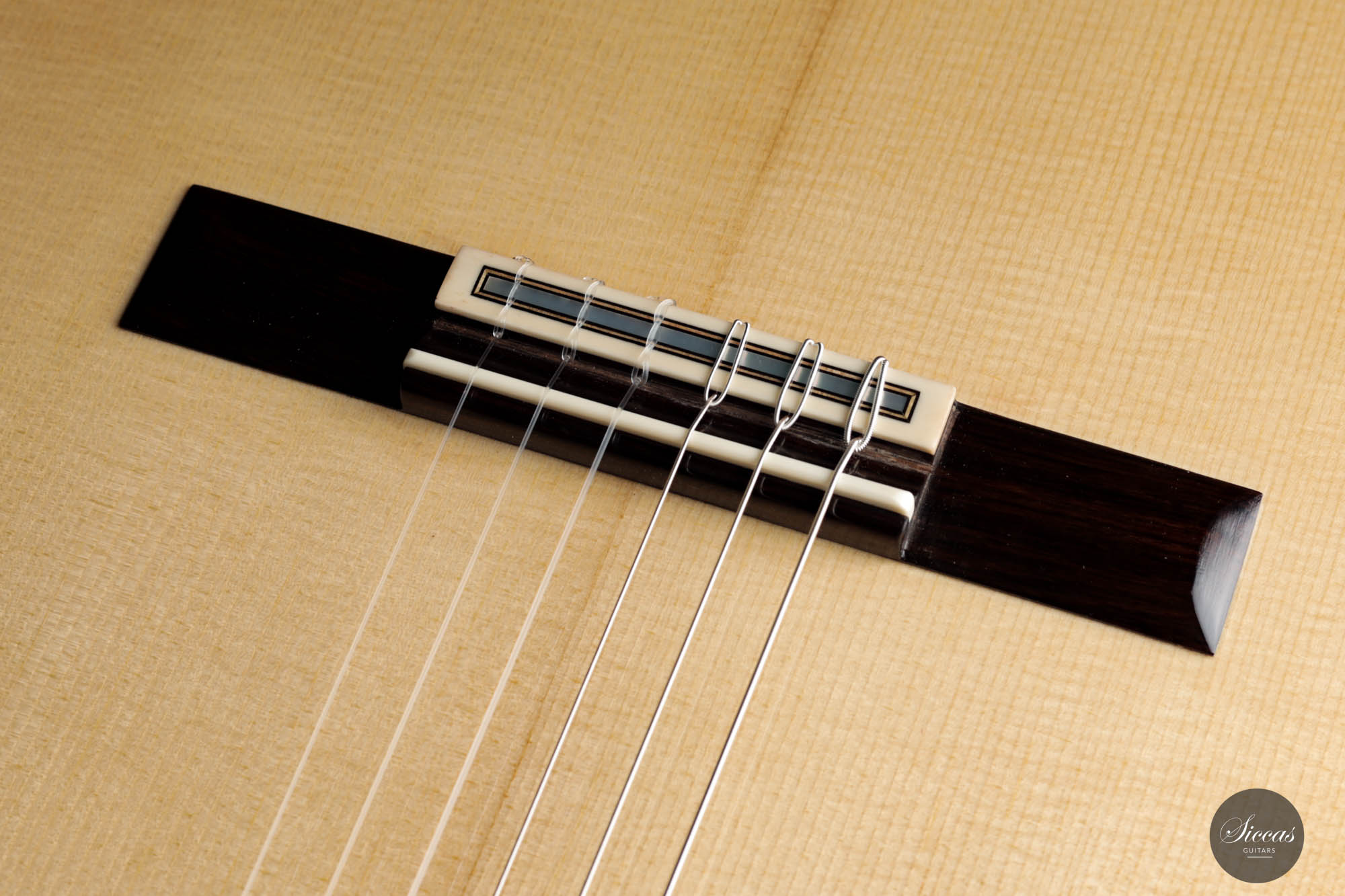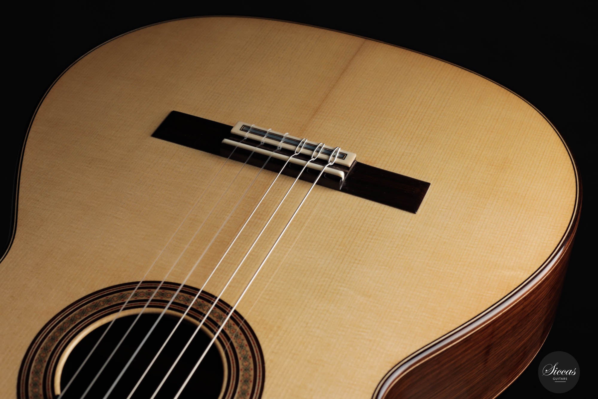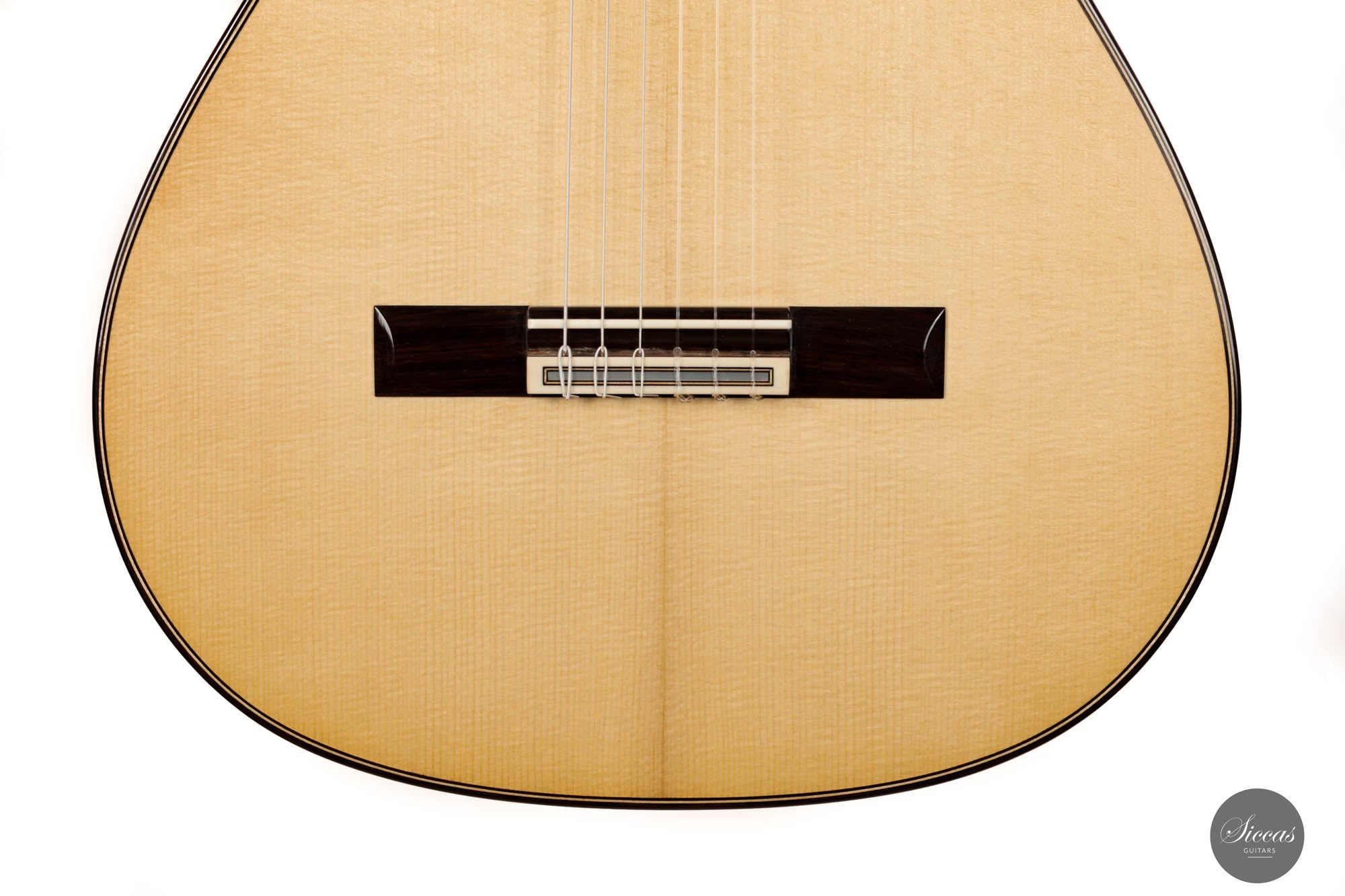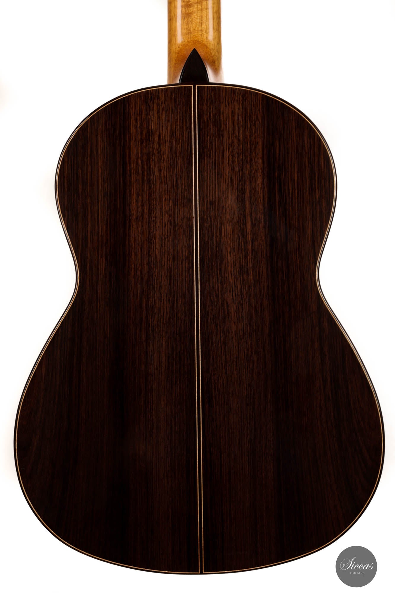 Die 2023 Lucas Martin No. 99 Gitarre, gekennzeichnet durch die "99", hat eine Fichtendecke und Boden und Zargen aus indischem Palisander. Diese traditionelle spanische Gitarre zeigt die zeitlose Handwerkskunst des Gitarrenbauers. Die Fichtendecke dieser Gitarre wurde sorgfältig nach ihren klanglichen Eigenschaften ausgewählt, zu denen knackige und klare Höhen, warme und satte Bässe und ausgewogene Mitten gehören. Der Boden und die Zargen aus indischem Palisander sorgen für eine tiefe, resonante Basswiedergabe, freundliche, üppige Mitten und funkelnde Obertöne in den Höhen. Die Kombination aus Fichte und indischem Palisander erzeugt einen ausgewogenen und nuancierten Klang mit einem dynamischen Bereich, der sensibel auf den Anschlag des Spielers reagiert. Diese Gitarre ist ein wahres Kunstwerk und wird die Spieler mit ihrem traditionellen spanischen Gitarrendesign und ihrer außergewöhnlichen Klangqualität begeistern.