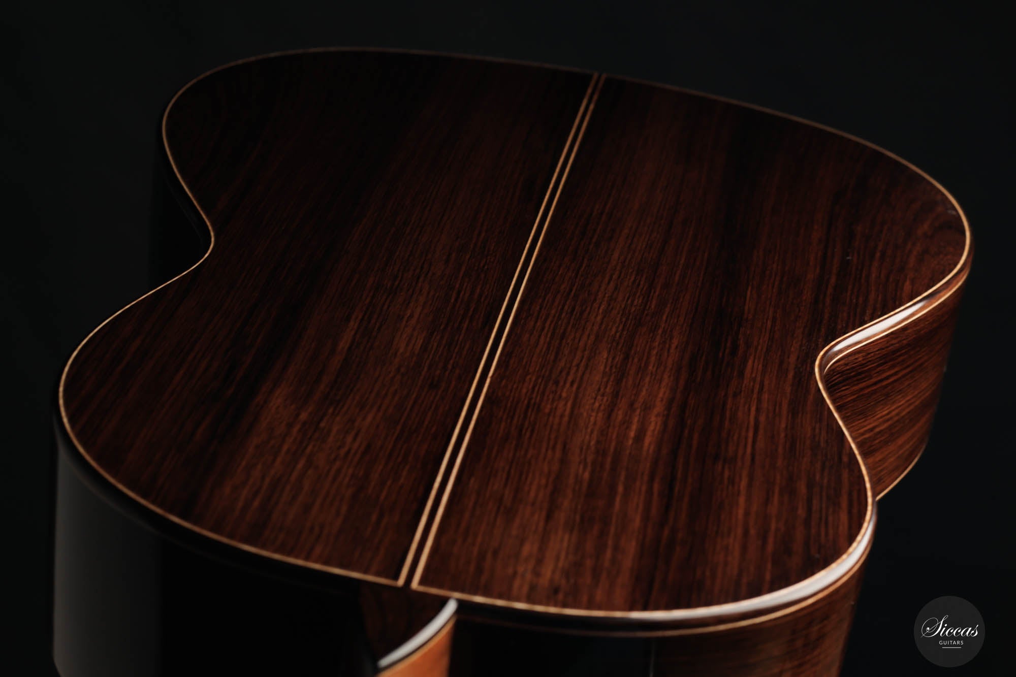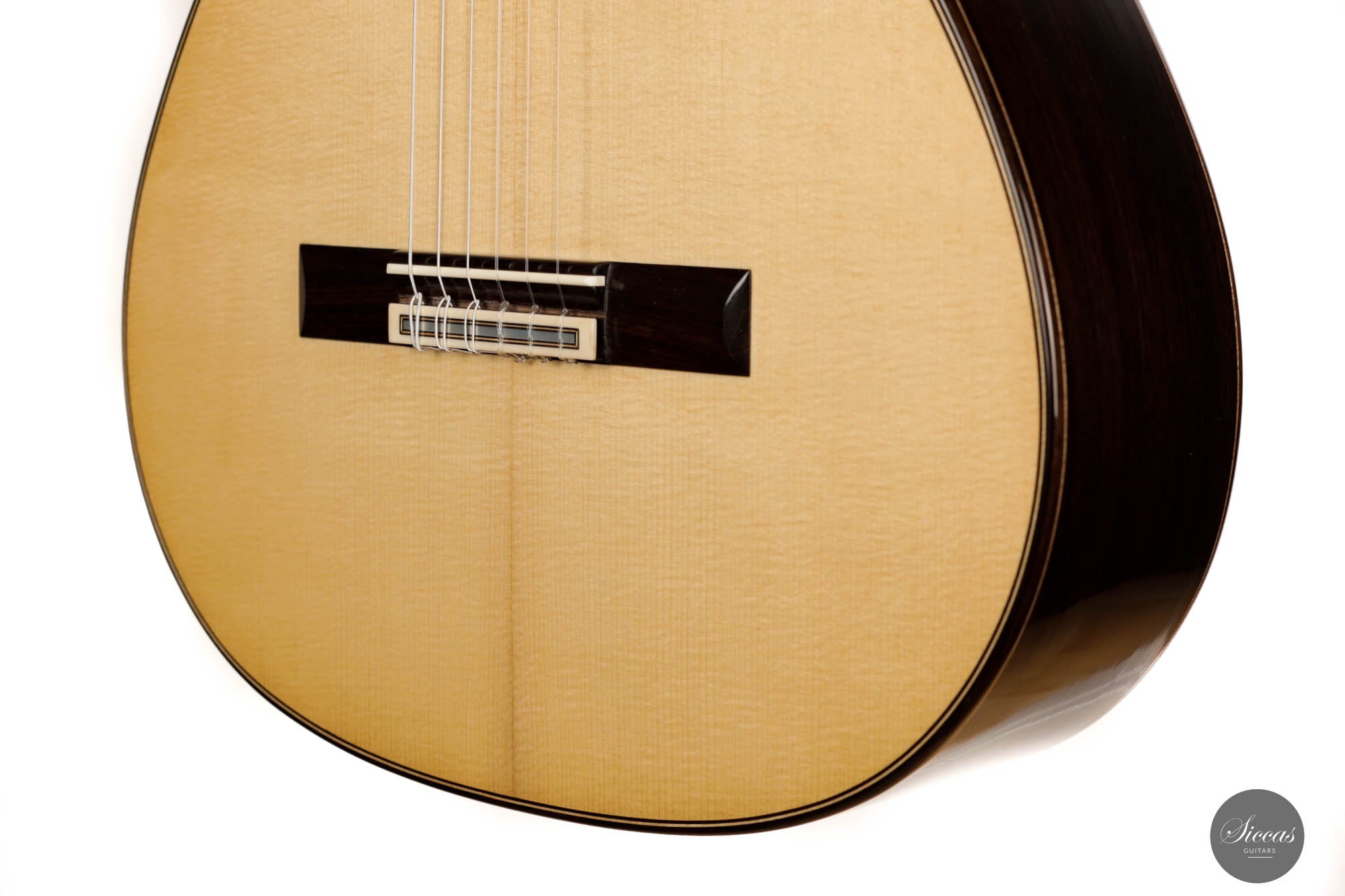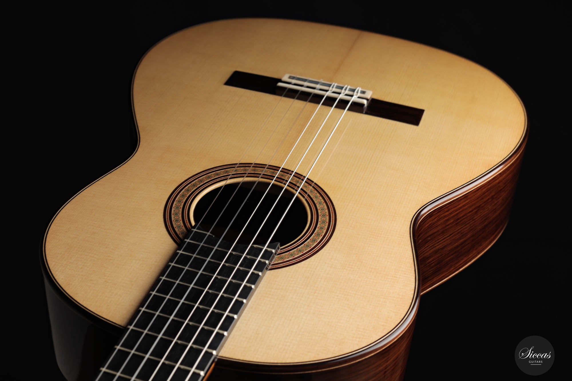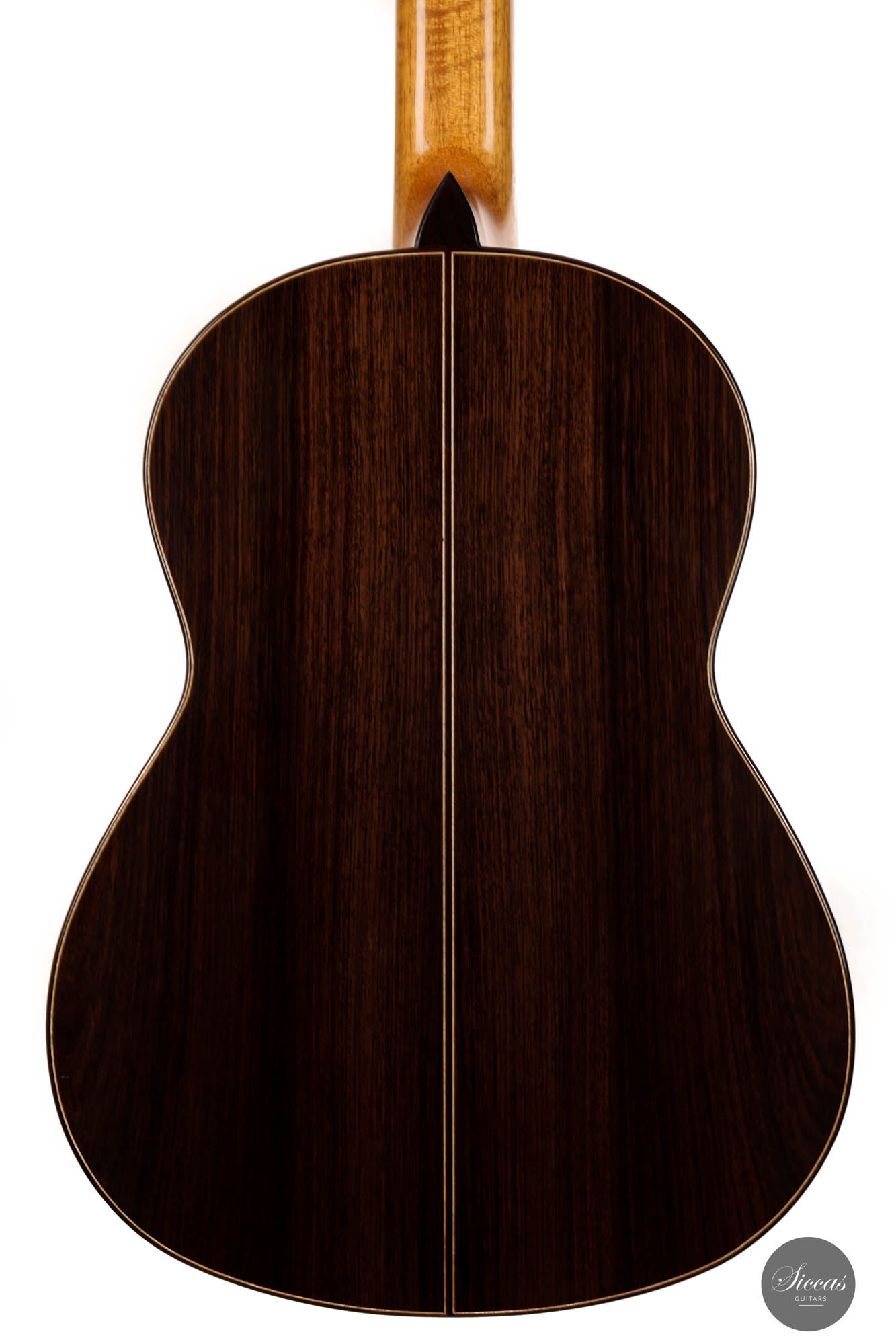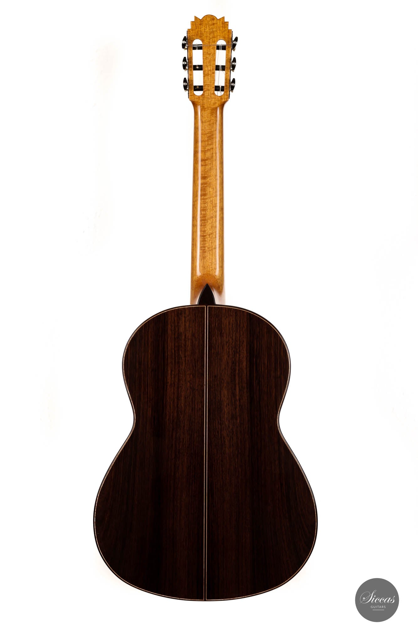 Die 2023 Lucas Martin No. 99 Gitarre, gekennzeichnet durch die "99", hat eine Fichtendecke und Boden und Zargen aus indischem Palisander. Diese traditionelle spanische Gitarre zeigt die zeitlose Handwerkskunst des Gitarrenbauers. Die Fichtendecke dieser Gitarre wurde sorgfältig nach ihren klanglichen Eigenschaften ausgewählt, zu denen knackige und klare Höhen, warme und satte Bässe und ausgewogene Mitten gehören. Der Boden und die Zargen aus indischem Palisander sorgen für eine tiefe, resonante Basswiedergabe, freundliche, üppige Mitten und funkelnde Obertöne in den Höhen. Die Kombination aus Fichte und indischem Palisander erzeugt einen ausgewogenen und nuancierten Klang mit einem dynamischen Bereich, der sensibel auf den Anschlag des Spielers reagiert. Diese Gitarre ist ein wahres Kunstwerk und wird die Spieler mit ihrem traditionellen spanischen Gitarrendesign und ihrer außergewöhnlichen Klangqualität begeistern.