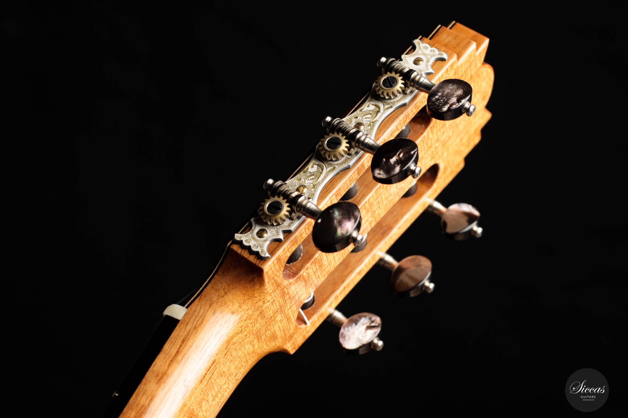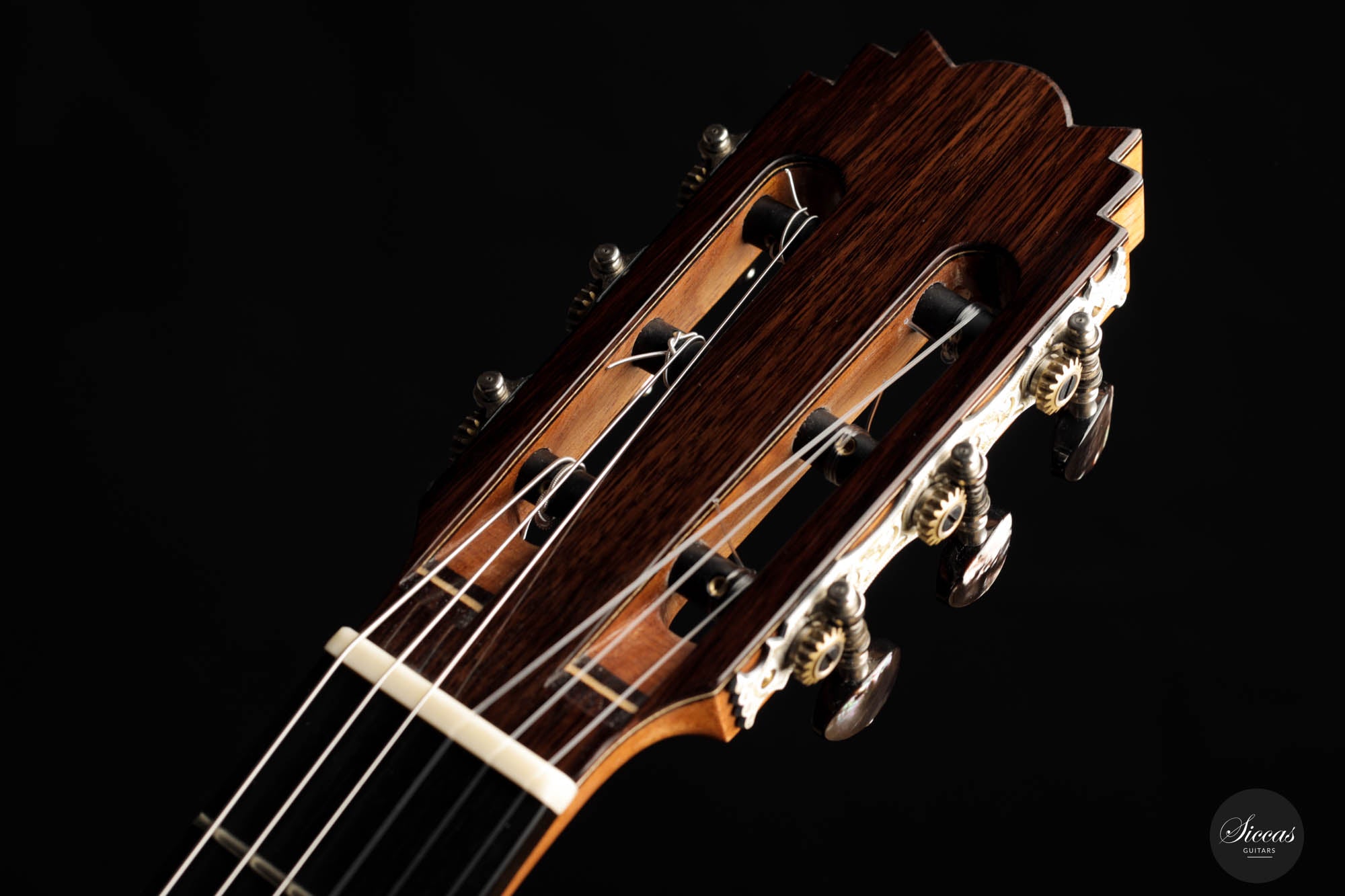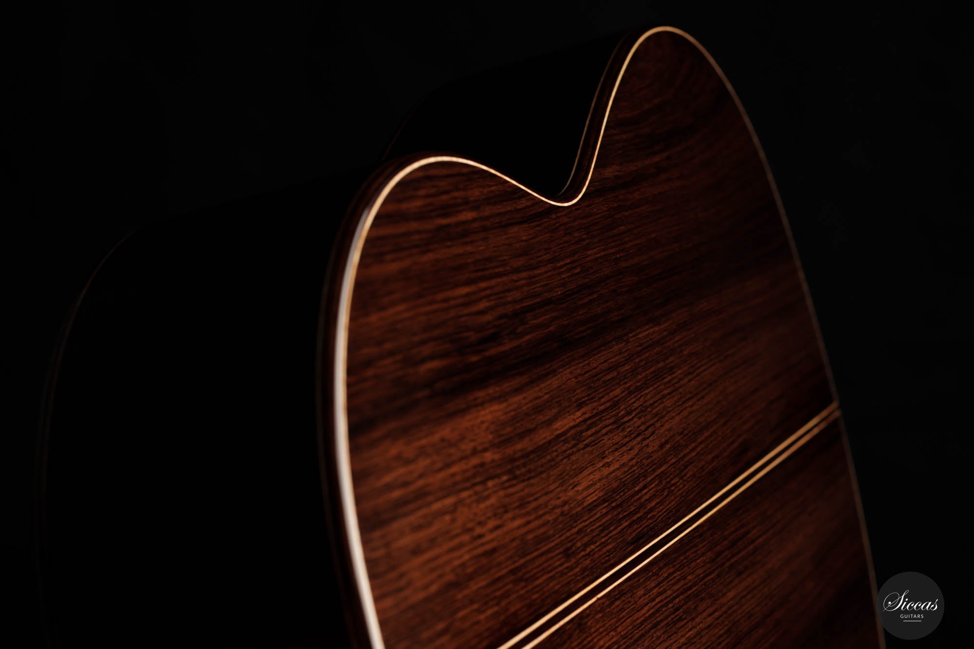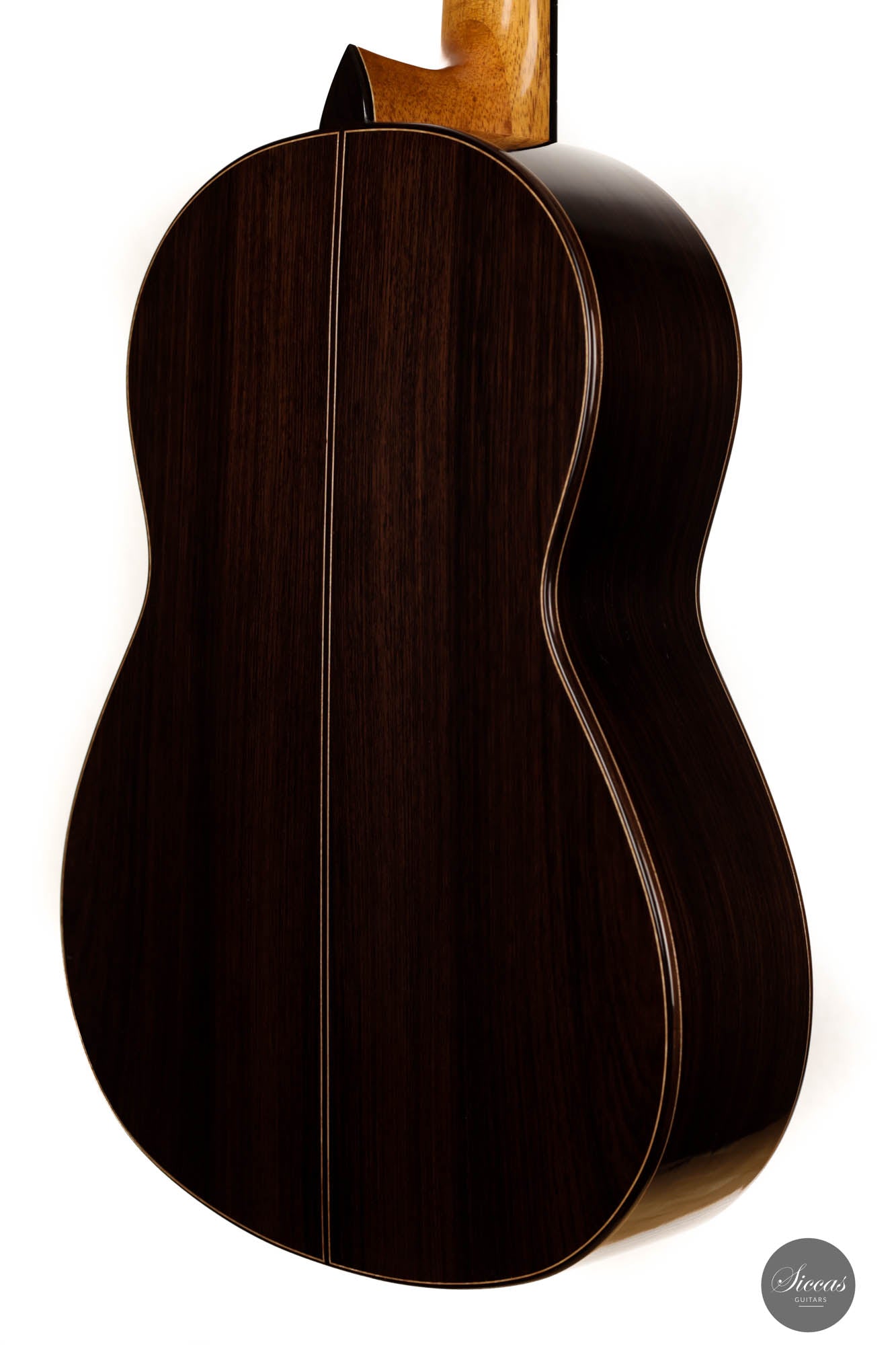 Die 2023 Lucas Martin No. 99 Gitarre, gekennzeichnet durch die "99", hat eine Fichtendecke und Boden und Zargen aus indischem Palisander. Diese traditionelle spanische Gitarre zeigt die zeitlose Handwerkskunst des Gitarrenbauers. Die Fichtendecke dieser Gitarre wurde sorgfältig nach ihren klanglichen Eigenschaften ausgewählt, zu denen knackige und klare Höhen, warme und satte Bässe und ausgewogene Mitten gehören. Der Boden und die Zargen aus indischem Palisander sorgen für eine tiefe, resonante Basswiedergabe, freundliche, üppige Mitten und funkelnde Obertöne in den Höhen. Die Kombination aus Fichte und indischem Palisander erzeugt einen ausgewogenen und nuancierten Klang mit einem dynamischen Bereich, der sensibel auf den Anschlag des Spielers reagiert. Diese Gitarre ist ein wahres Kunstwerk und wird die Spieler mit ihrem traditionellen spanischen Gitarrendesign und ihrer außergewöhnlichen Klangqualität begeistern.