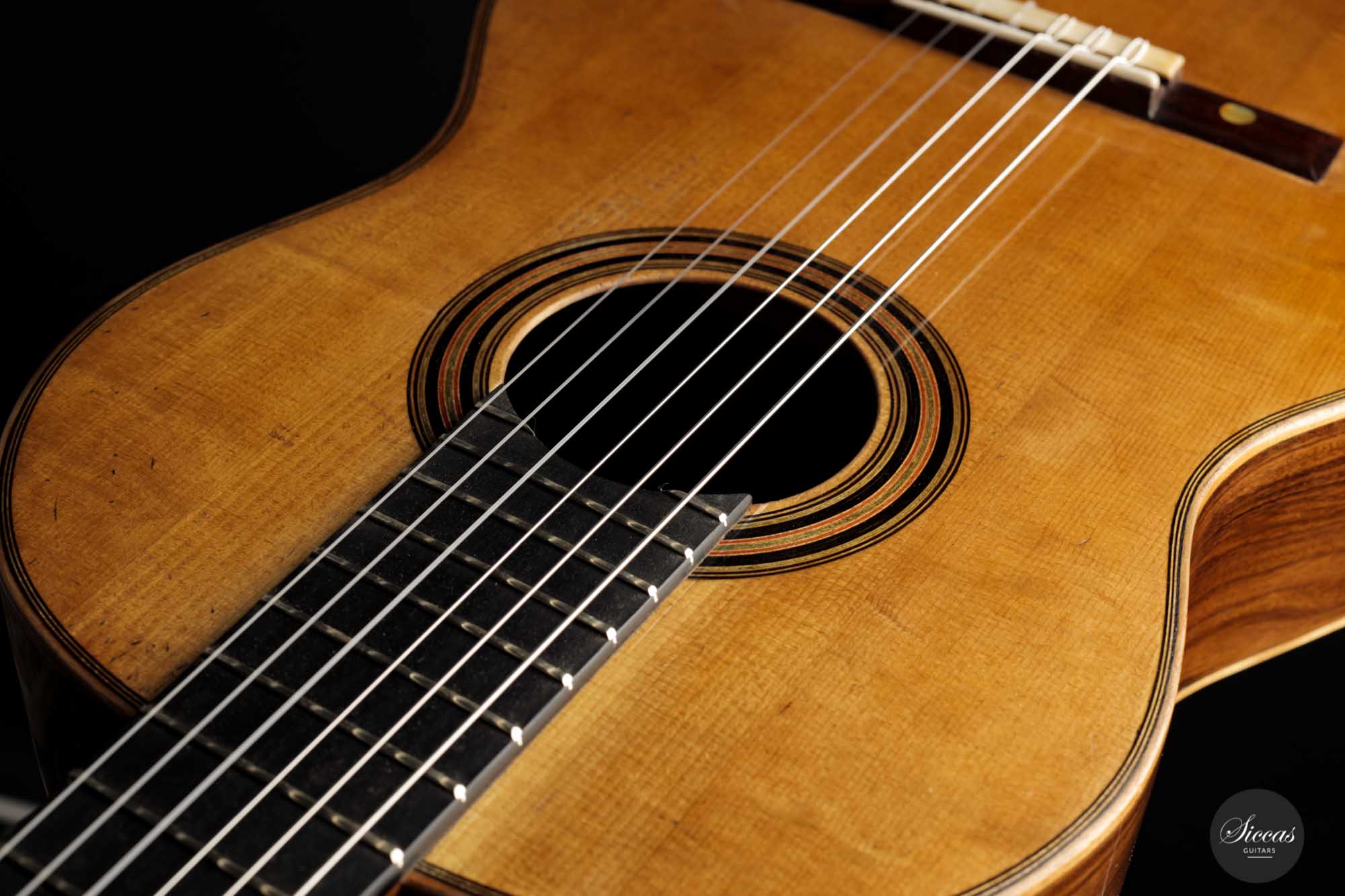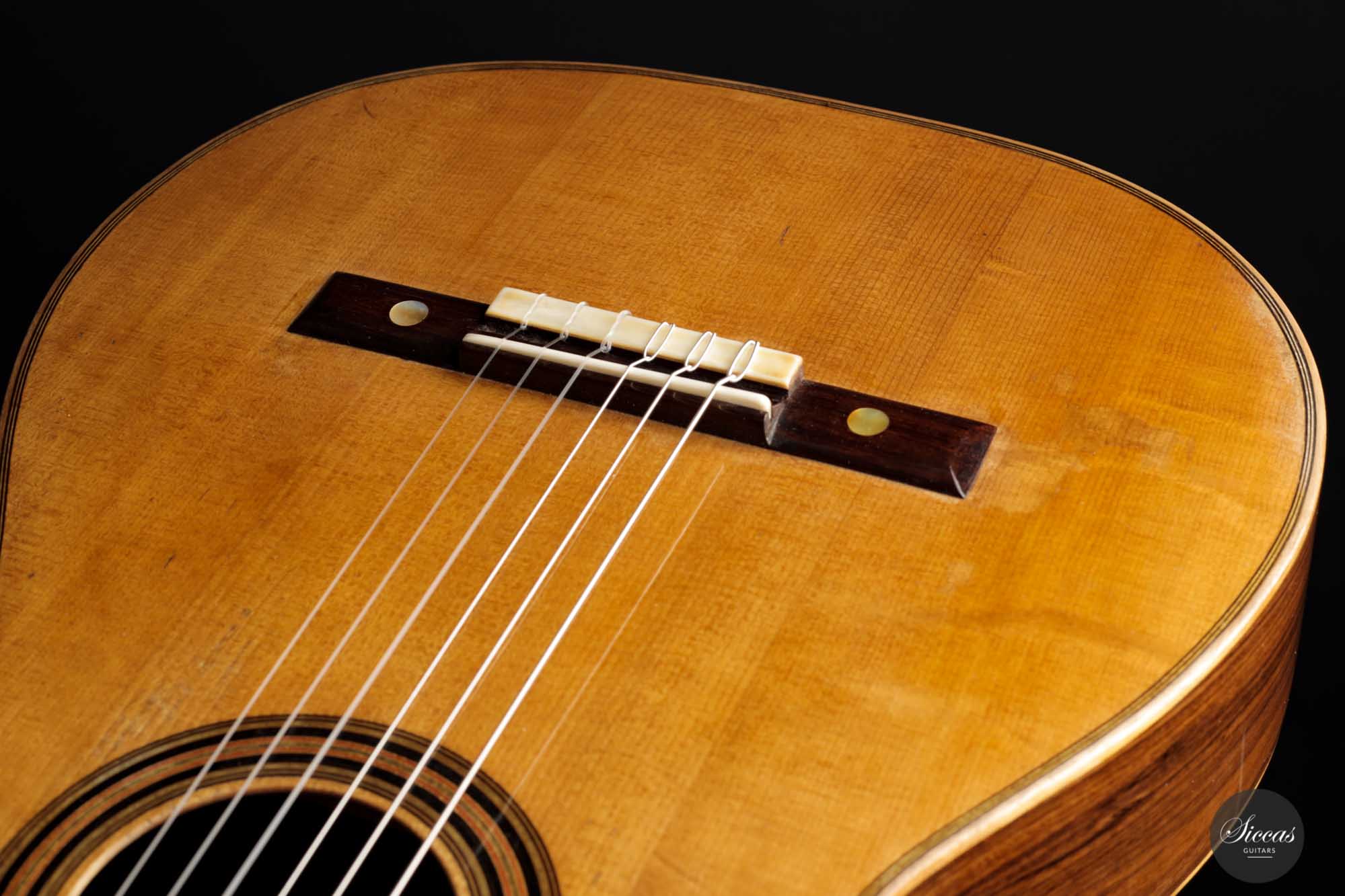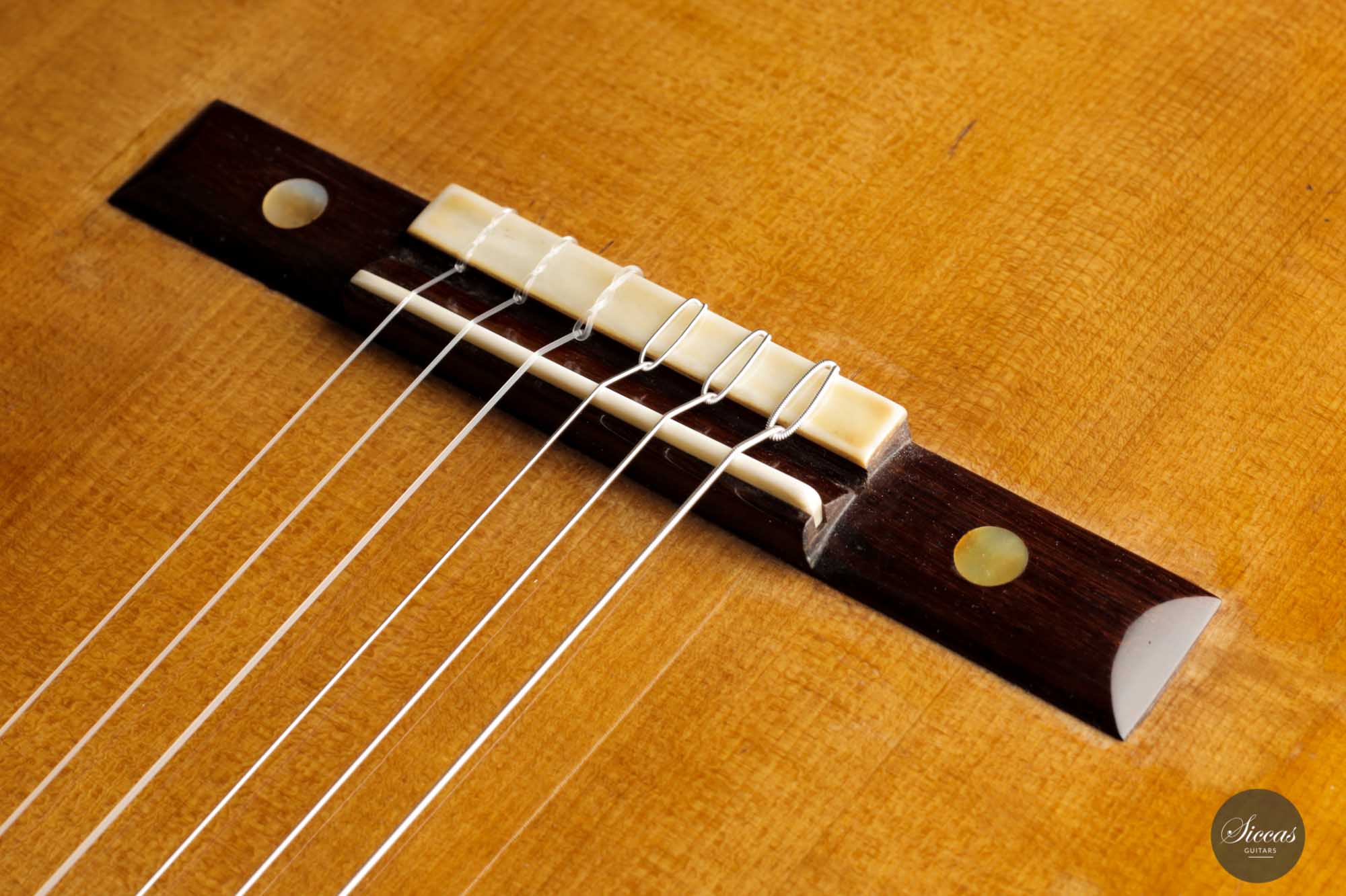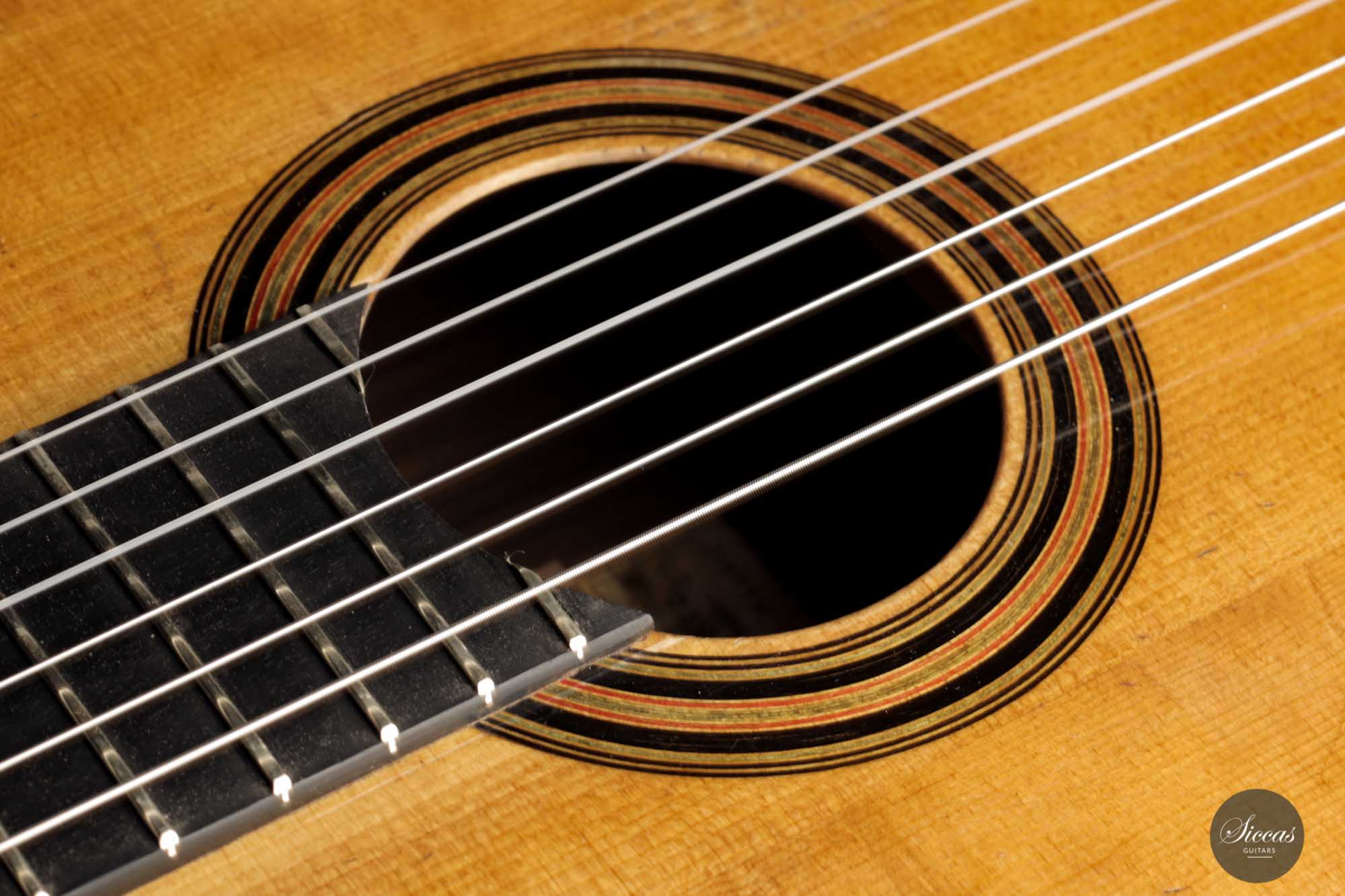 Diese Gitarre ist bemerkenswert. Dass Lucio Carbone ein Meister auf diesem Gebiet ist, war uns bekannt, aber wir hätten nicht mit einem so verblüffenden Ergebnis gerechnet. Die Akkuratesse der Farbgebung, der Textur und der Patina dieser Antonio de Torres-Kopie macht es selbst für ein geübtes Auge schwer, sie als neue Gitarre zu erkennen. Lucio hat sogar "Scheinrisse" auf die Oberfläche von Boden und Zargen übertragen und ein Faksimile der Originaletiketten angefertigt. Erfreulicherweise macht Lucio Carbones Brandstempel, die sich im Inneren der Gitarre und auf der Rückseite des Kopfes befinden, deutlich, dass es sich ume eine Kopie und kein Plagiat handelt. Dieses Instrument war eine Sonderbestellung von Siccas als Herausforderung an Lucio, eine möglichst realistische Torres-Kopie zu bauen, und das Ergebnis ist erstaunlich.