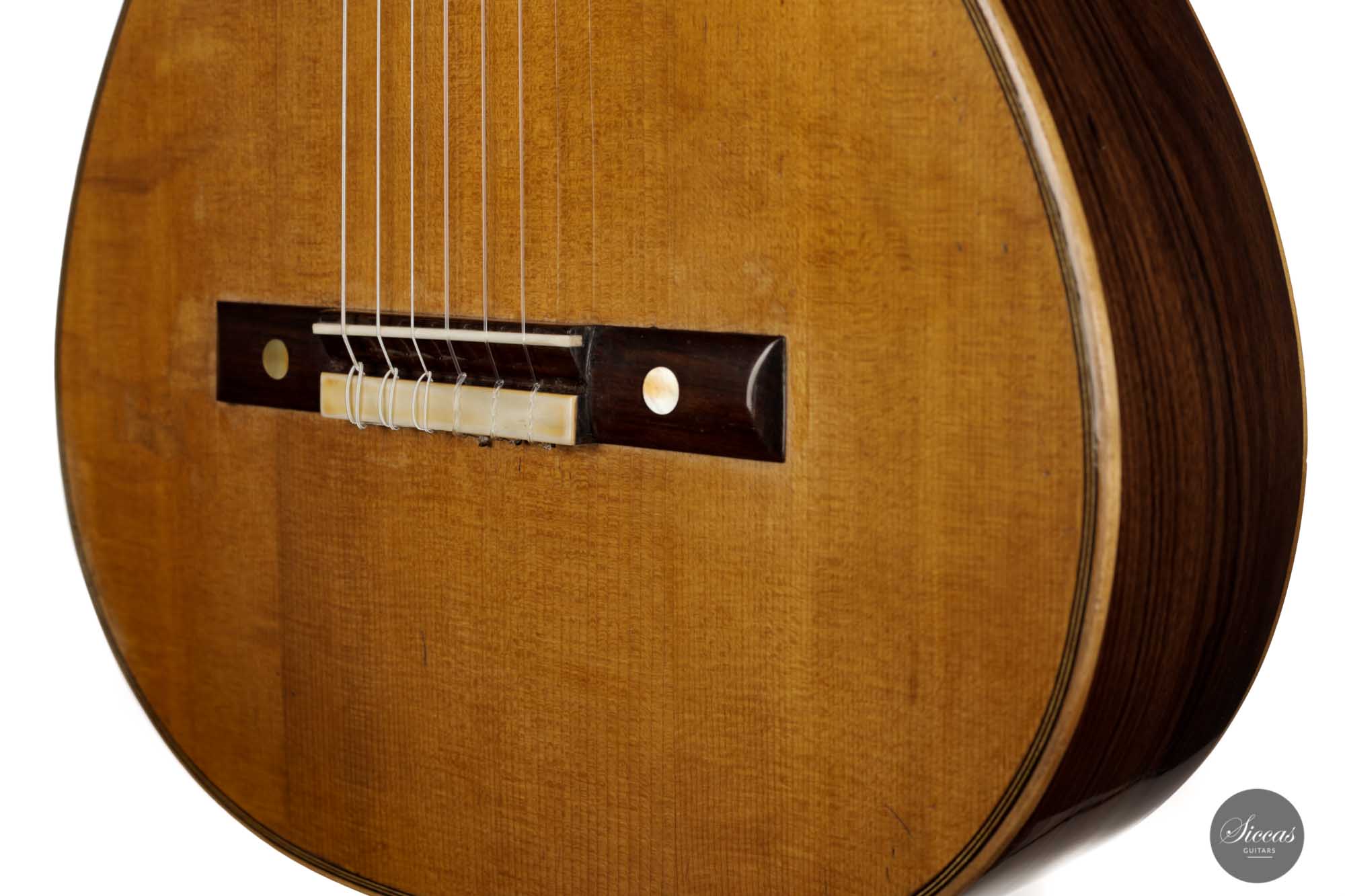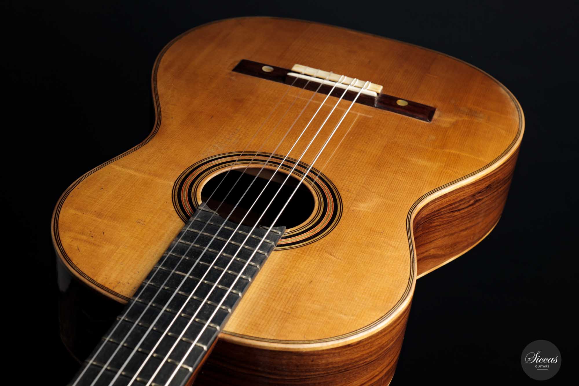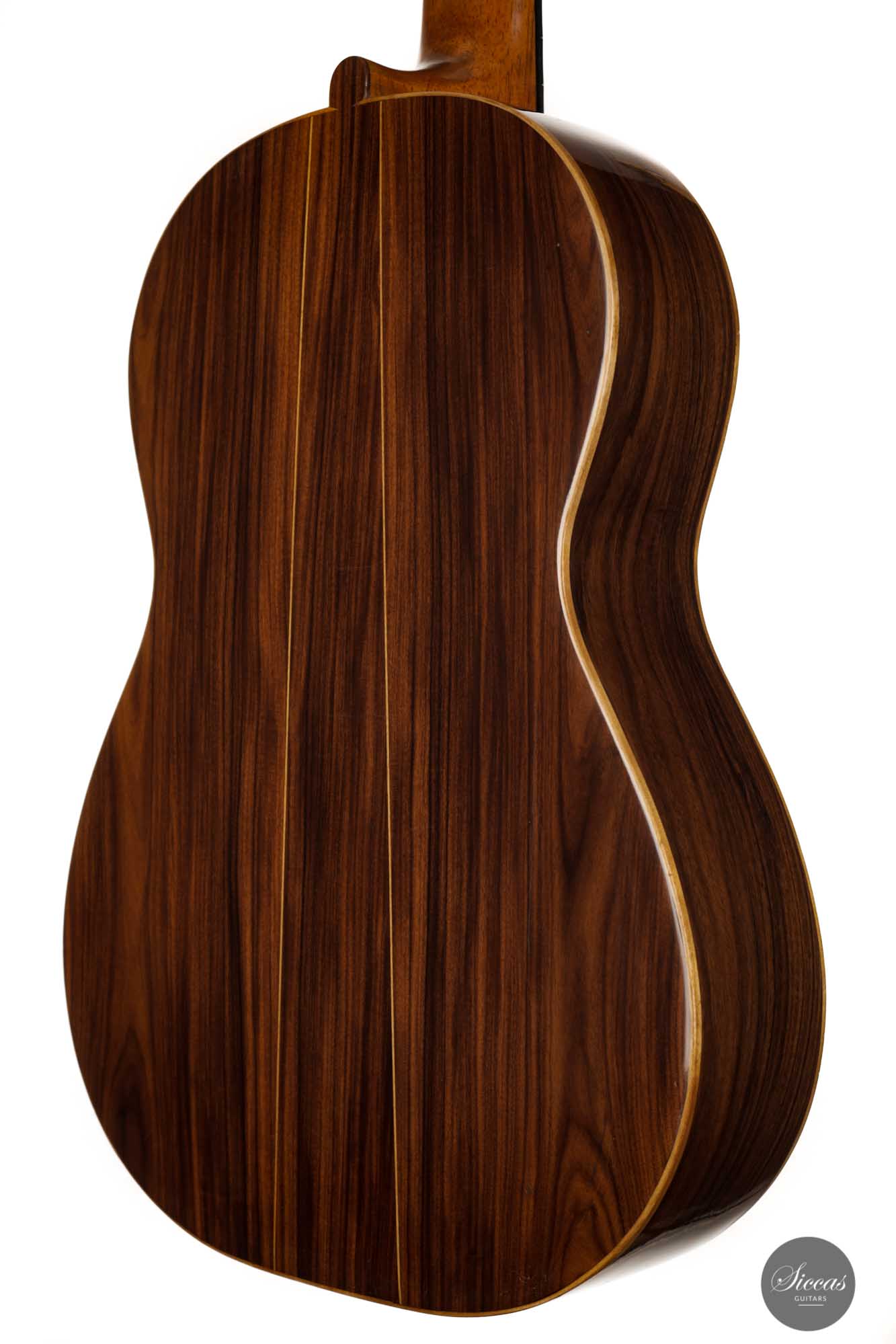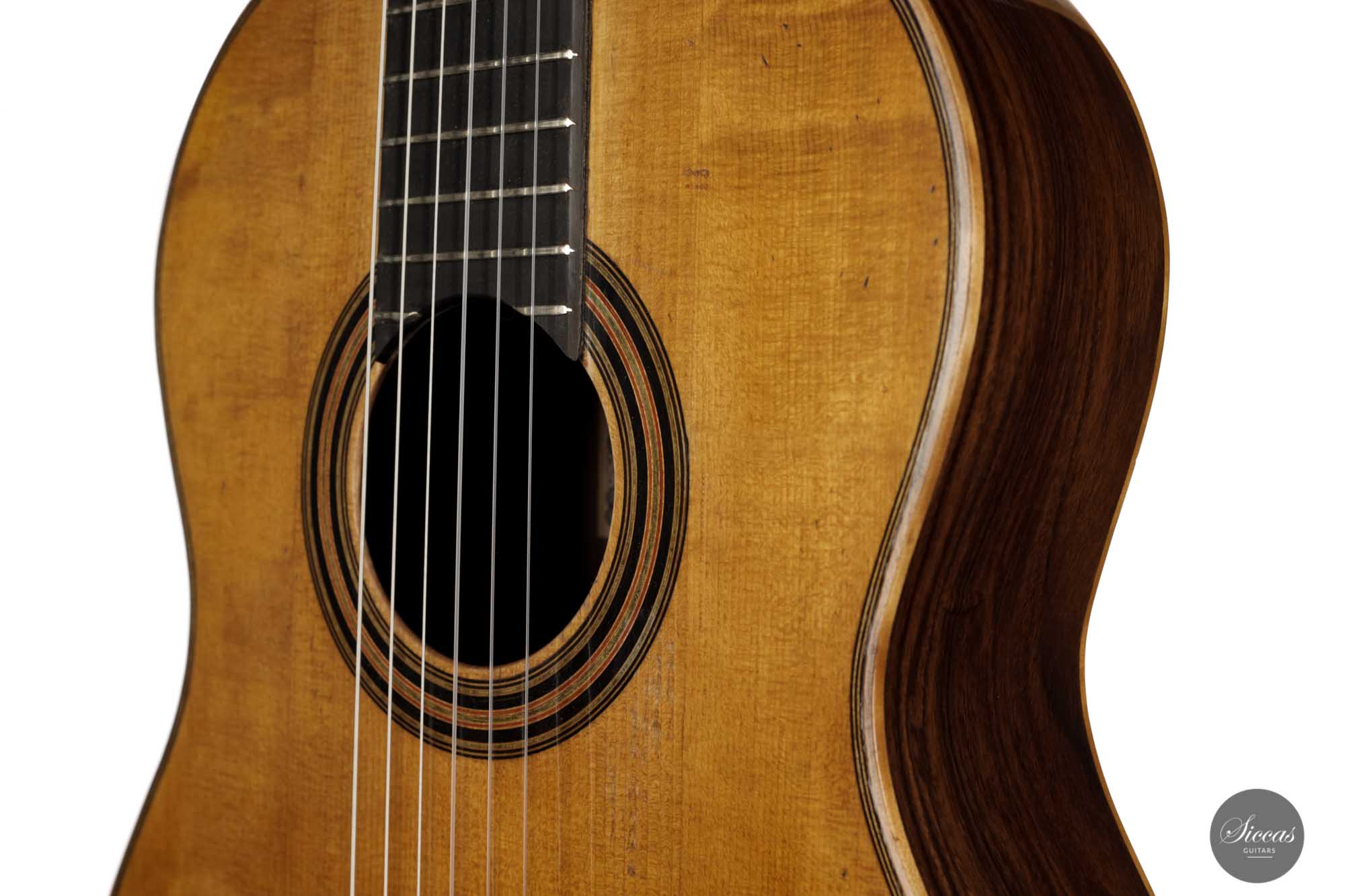 Diese Gitarre ist bemerkenswert. Dass Lucio Carbone ein Meister auf diesem Gebiet ist, war uns bekannt, aber wir hätten nicht mit einem so verblüffenden Ergebnis gerechnet. Die Akkuratesse der Farbgebung, der Textur und der Patina dieser Antonio de Torres-Kopie macht es selbst für ein geübtes Auge schwer, sie als neue Gitarre zu erkennen. Lucio hat sogar "Scheinrisse" auf die Oberfläche von Boden und Zargen übertragen und ein Faksimile der Originaletiketten angefertigt. Erfreulicherweise macht Lucio Carbones Brandstempel, die sich im Inneren der Gitarre und auf der Rückseite des Kopfes befinden, deutlich, dass es sich ume eine Kopie und kein Plagiat handelt. Dieses Instrument war eine Sonderbestellung von Siccas als Herausforderung an Lucio, eine möglichst realistische Torres-Kopie zu bauen, und das Ergebnis ist erstaunlich.