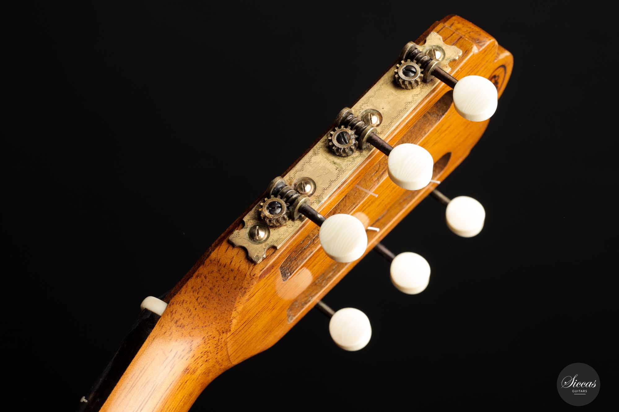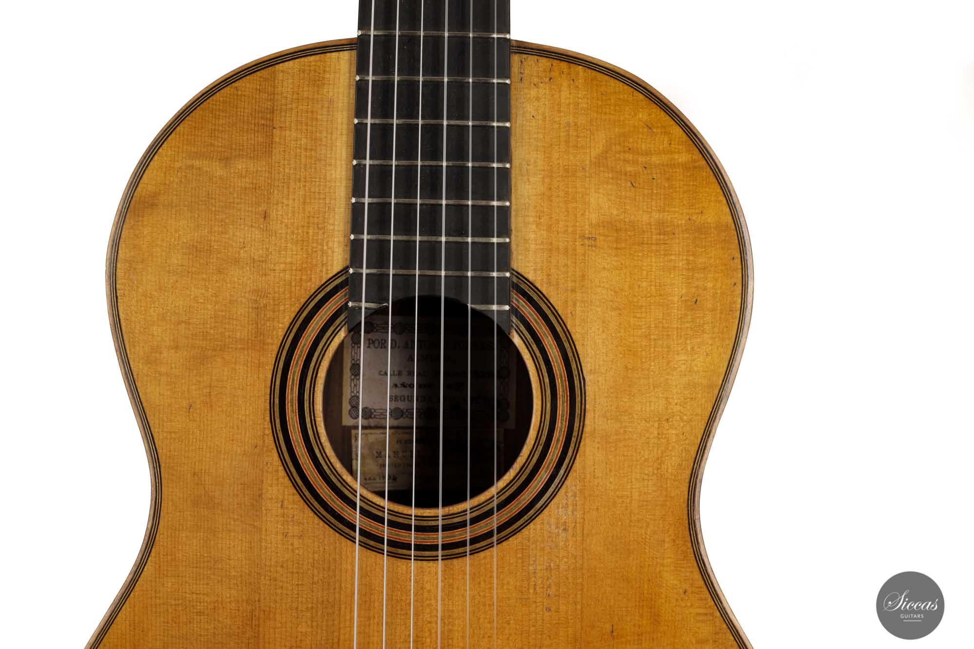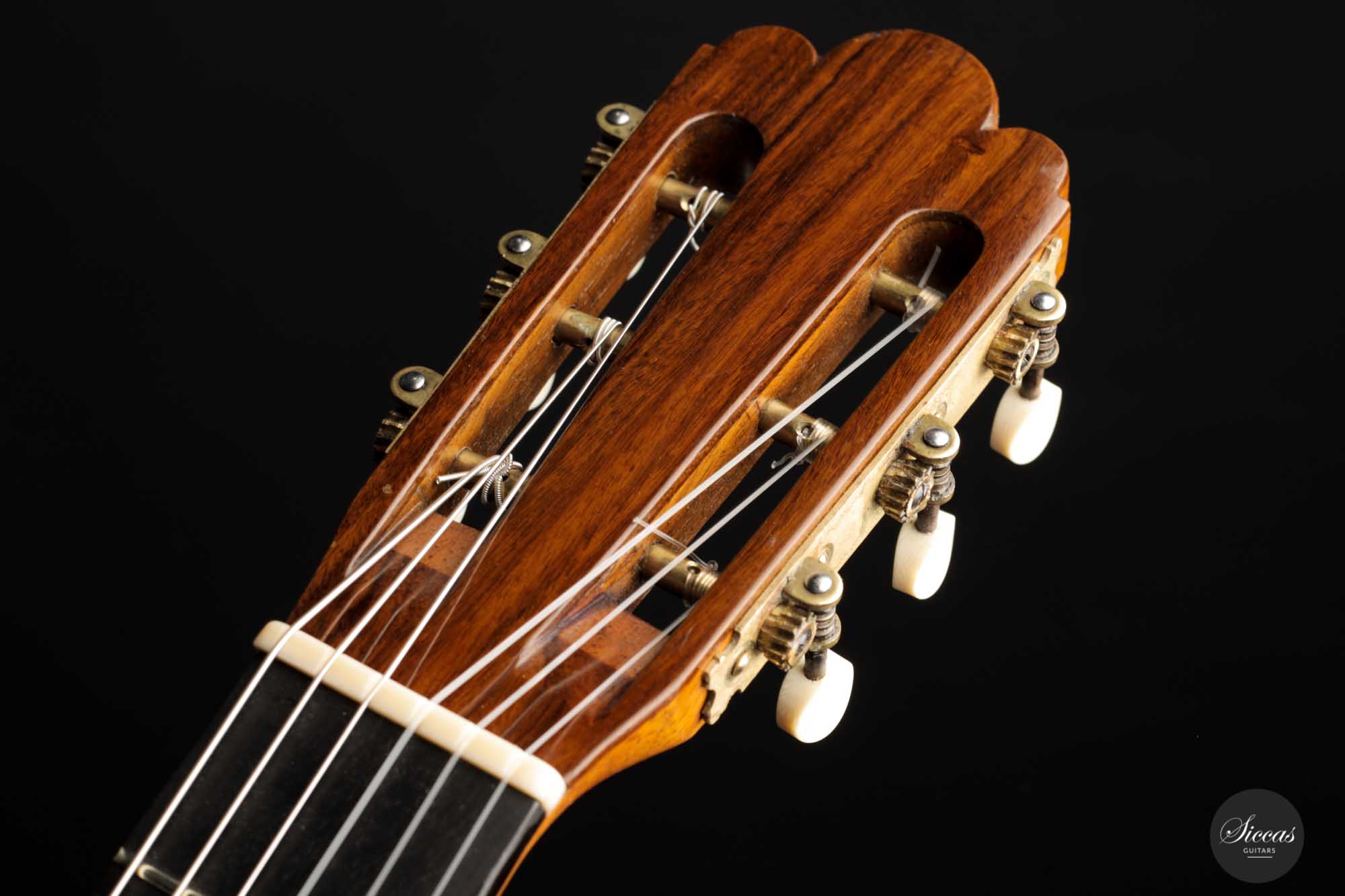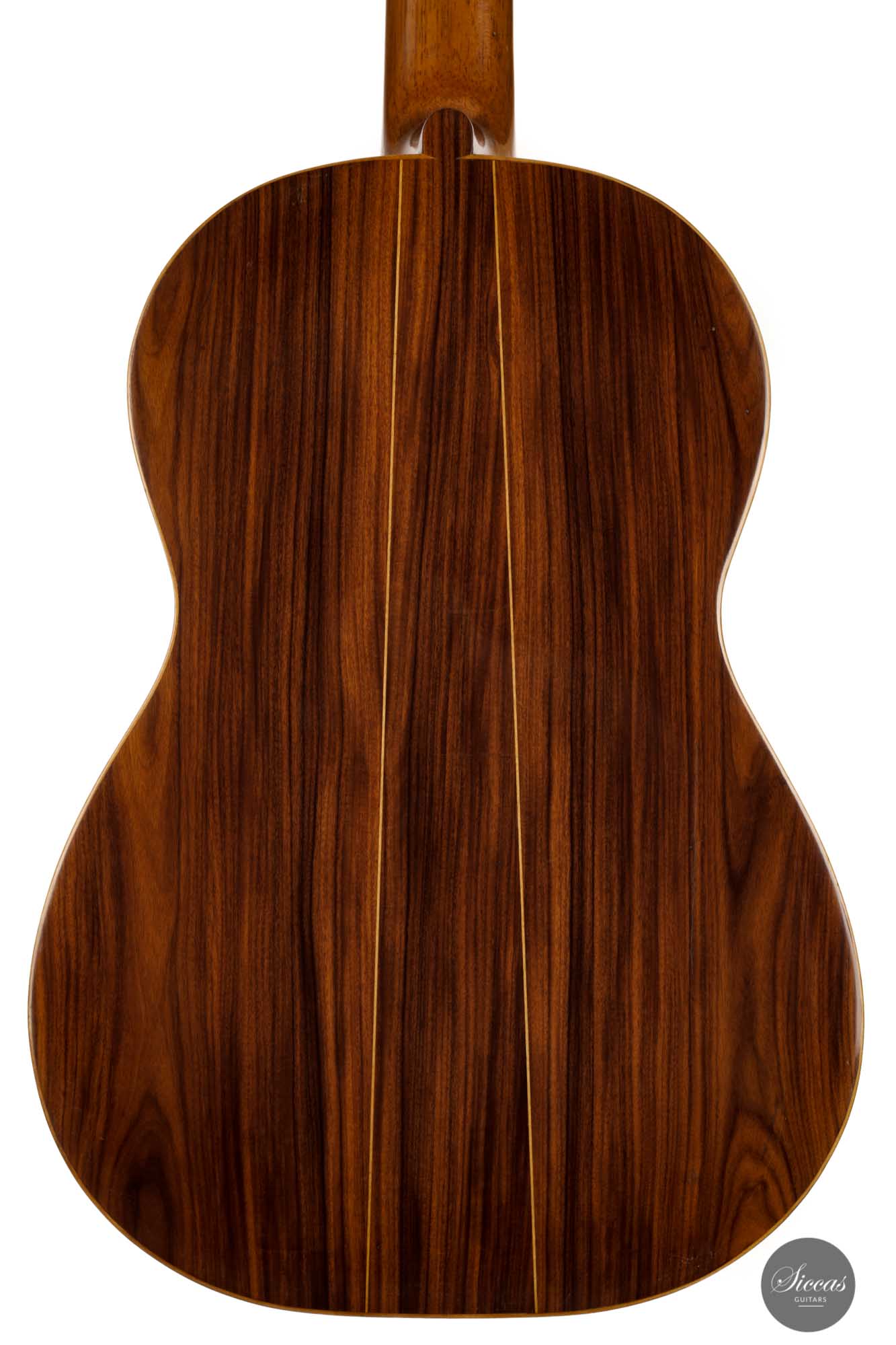 Diese Gitarre ist bemerkenswert. Dass Lucio Carbone ein Meister auf diesem Gebiet ist, war uns bekannt, aber wir hätten nicht mit einem so verblüffenden Ergebnis gerechnet. Die Akkuratesse der Farbgebung, der Textur und der Patina dieser Antonio de Torres-Kopie macht es selbst für ein geübtes Auge schwer, sie als neue Gitarre zu erkennen. Lucio hat sogar "Scheinrisse" auf die Oberfläche von Boden und Zargen übertragen und ein Faksimile der Originaletiketten angefertigt. Erfreulicherweise macht Lucio Carbones Brandstempel, die sich im Inneren der Gitarre und auf der Rückseite des Kopfes befinden, deutlich, dass es sich ume eine Kopie und kein Plagiat handelt. Dieses Instrument war eine Sonderbestellung von Siccas als Herausforderung an Lucio, eine möglichst realistische Torres-Kopie zu bauen, und das Ergebnis ist erstaunlich.